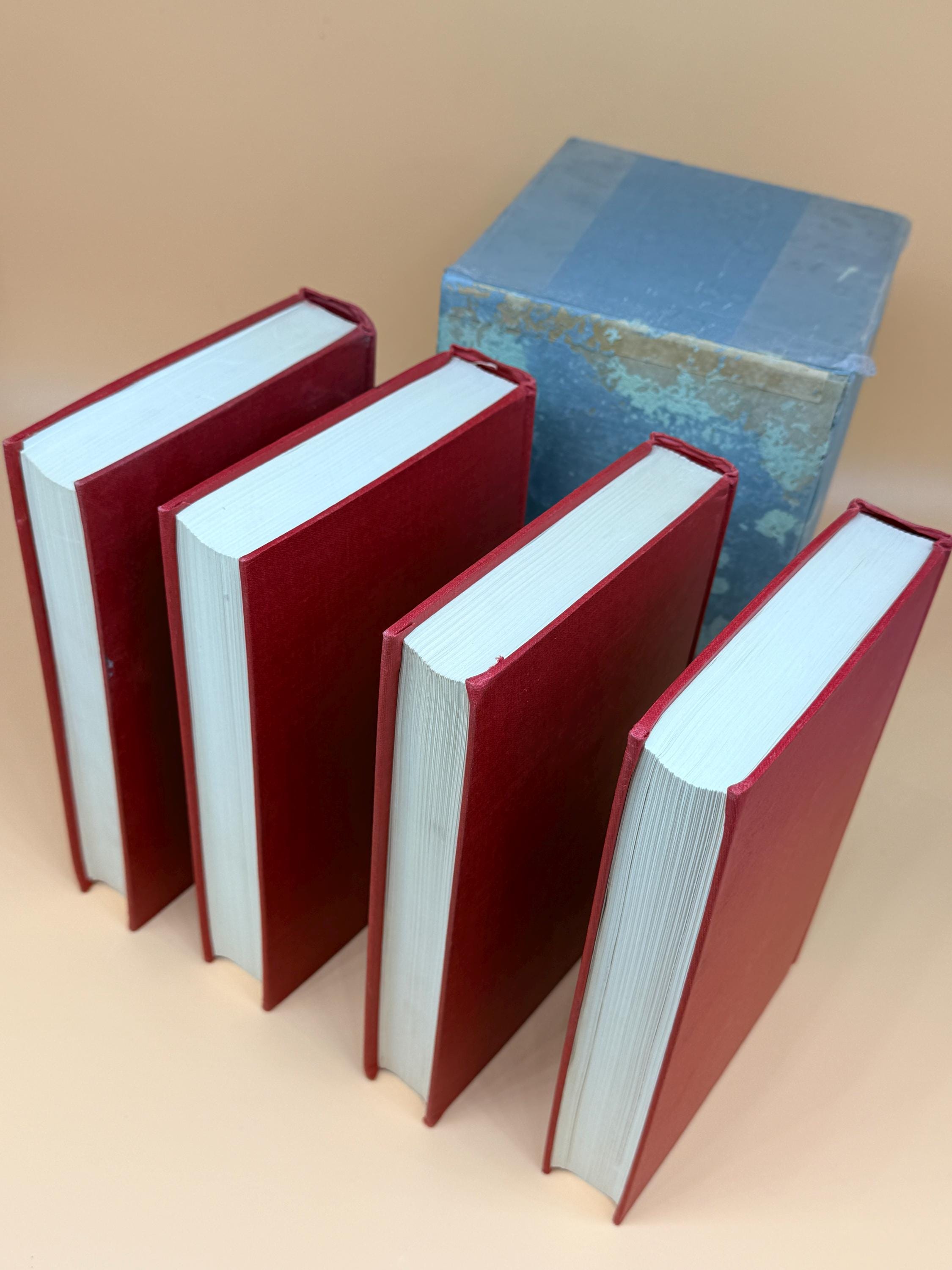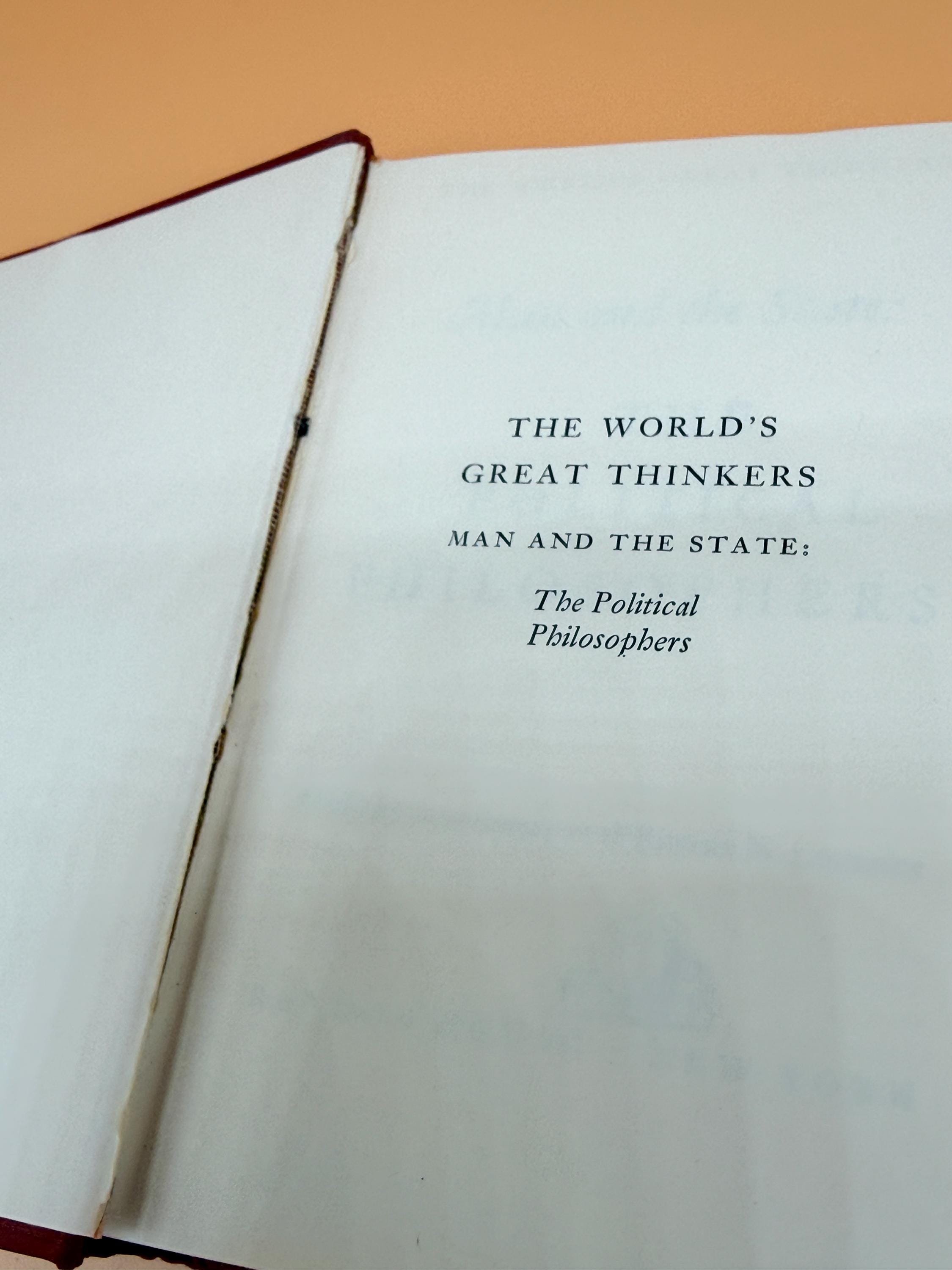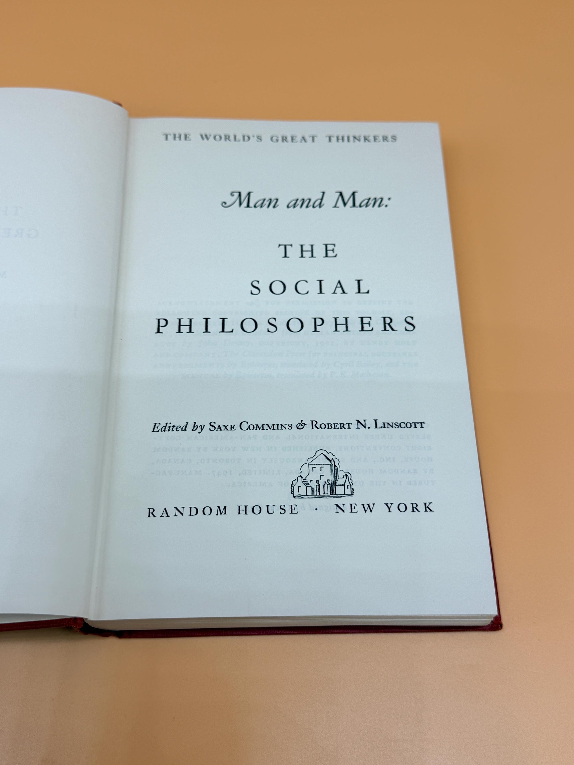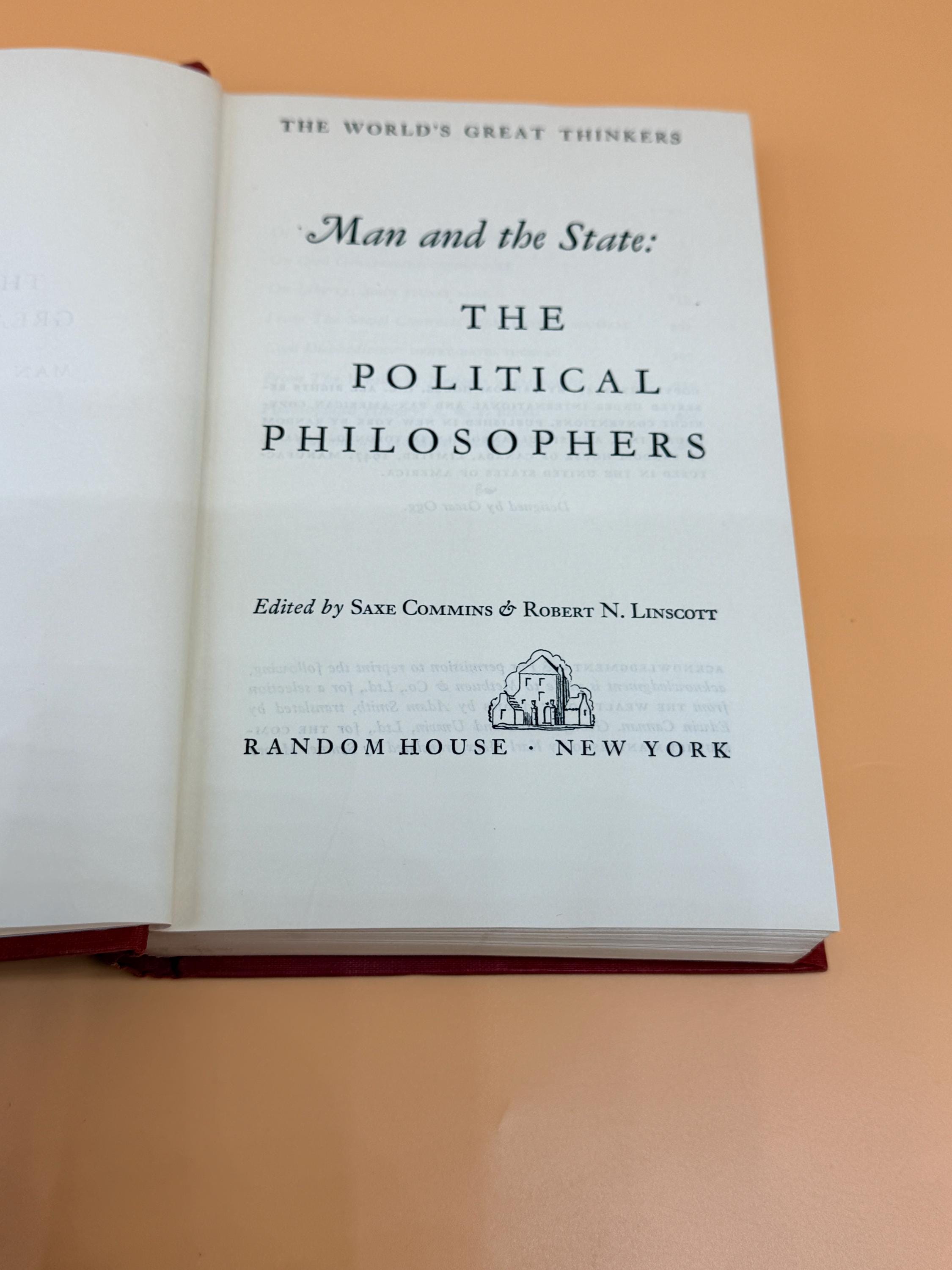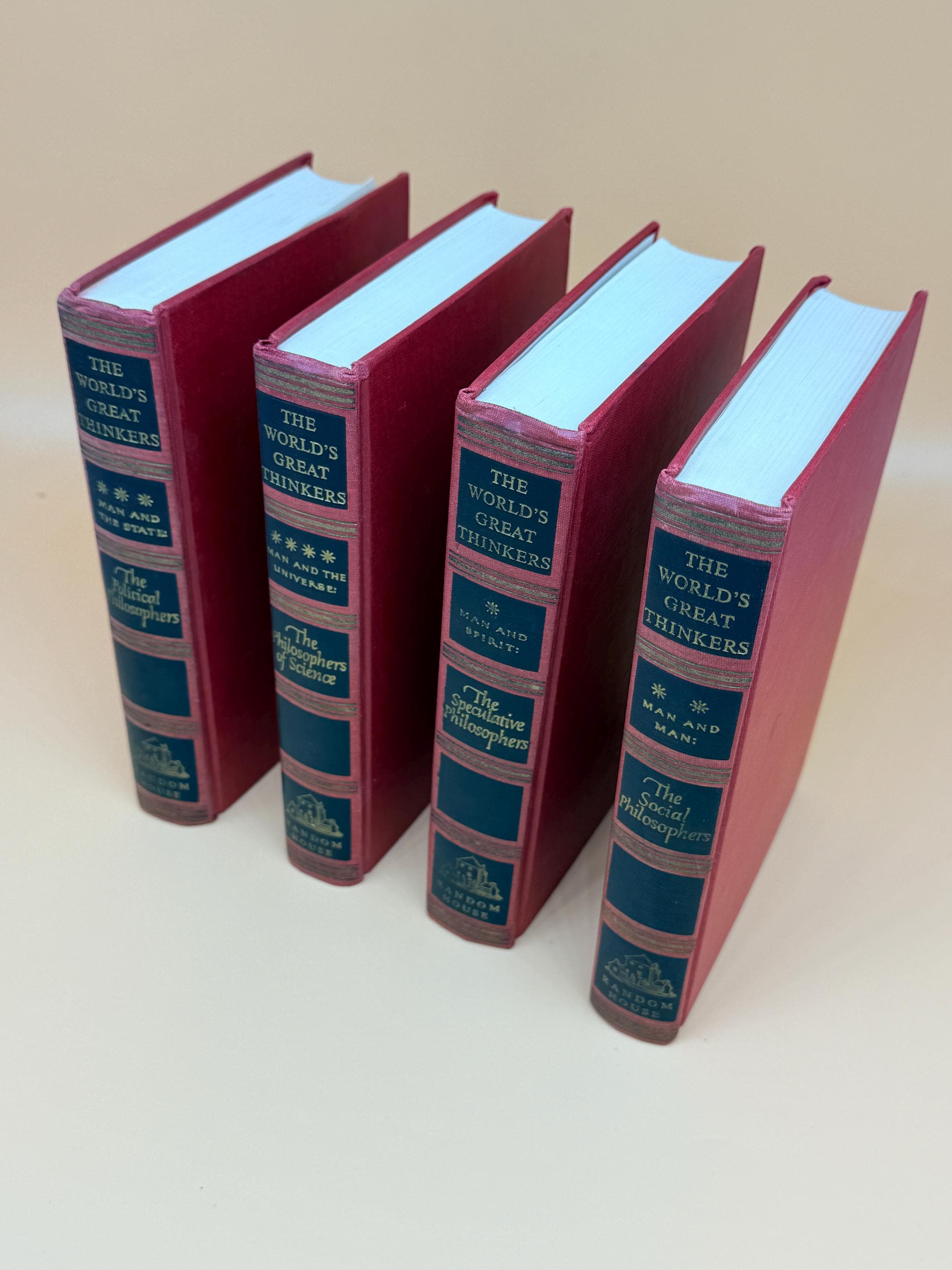 This is a very good set of 4 volume hardcovers in accompanying slipcase. Complete set in original slipcase. 1947 Random House Publishing. All four volumes in this set are very good inside and out. NOTE: Volume Man and the States - The Political Thinkers is very good inside BUT inside front cover binding is showing between the blank and half title pages BUT pages are still tight to binding, see photo. Only spot seen with this caveat. The pages on all 4 volumes inside are clean with only very light natural tanning from age. The red cloth hardcover boards are also very good with only a hint of shelf wear and only light fading is along the spines but the title/publisher lettering along spine clear and legible not faded out. Bindings on all are tight and square with only the aforementioned caveat to one volume. The slipcase is good and solid BUT does have shelf wear and scuffing to back as shown in photo. Each hardcover is 8vo in size, or 5"x8".