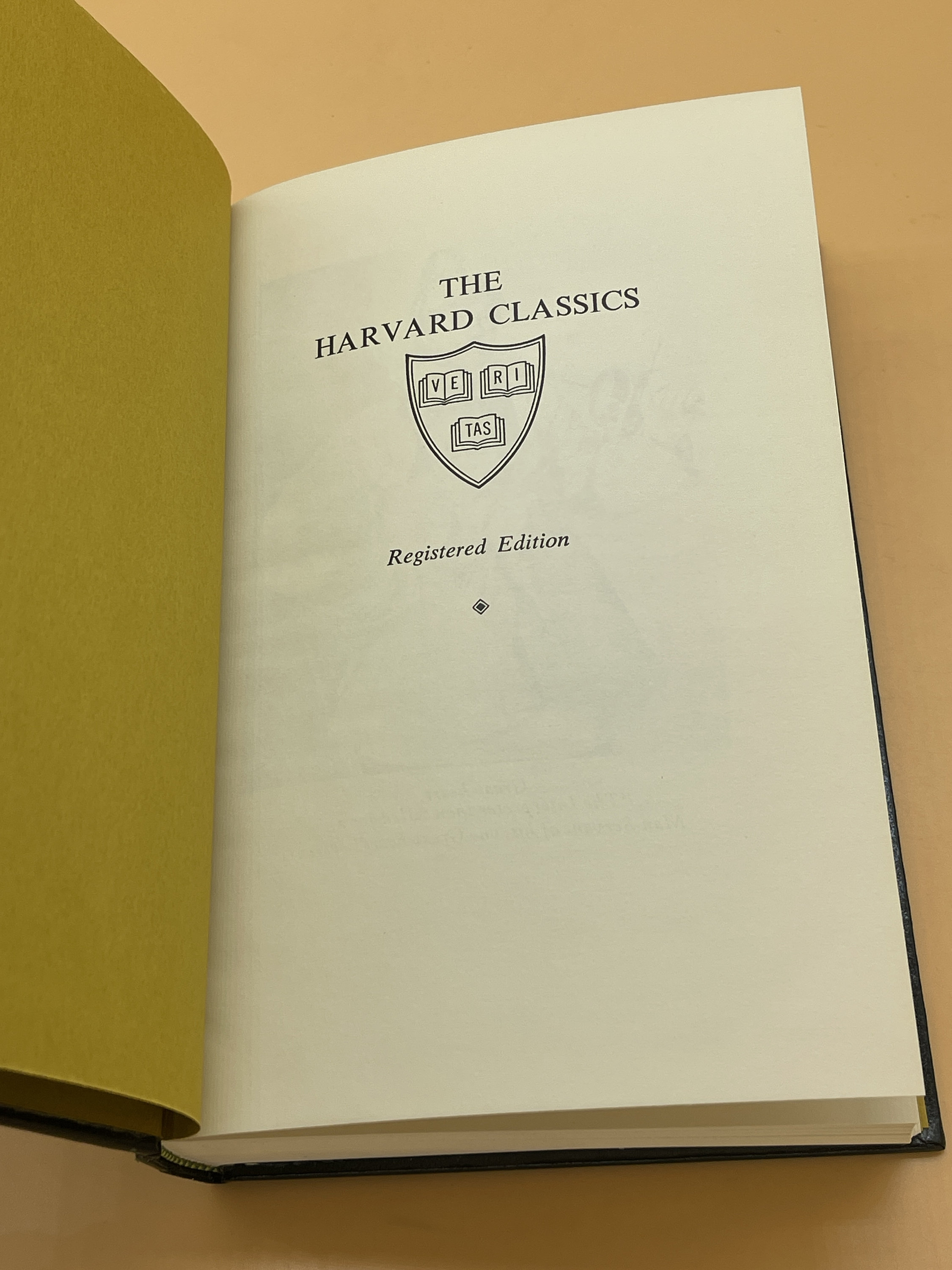 The P.F Collier Editions of The Harvard Classics were published in 1969-70 and were the 62nd printing of the series. The Harvard Classics were all edited by Charles W. Eliot in a 50 volume set originally published in 1909 and 1910. Charles W. Eliot was the President of Harvard at the time and spoke about the Harvard Classics in speeches, making references to a "3 foot shelf of books" that could afford any reader an education were he to read them all. He was pressed to expand on exactly what books would be included in that "3 foot shelf" and he concluded that one would actually need a 5 foot shelf. No titles were defined at that time, but Colliers implored Eliot to chose 50 books for a 5 foot shelf, they would publish if Eliot would define the books. So The Harvard Classics was born. At the time they were often referred to as Dr. Eliot's Five Foot Shelf of Books. Reprinted many times, the final print run from Collier was the 62nd printing.