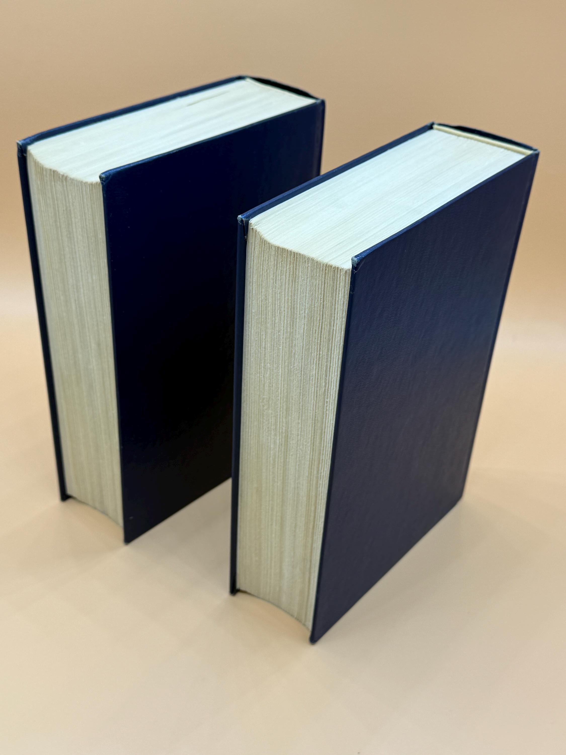 This is a very good set of two hardcovers, NO dust jackets, jackets missing. 1974 Little Brown Book Club Edition. Both volumes are very clean inside and out. The inside pages are very clean. The binding on both are tight and straight. Navy Blue hardcover boards are very clean with only very light shelf wear to both. Octavo book size or 6" x 9" with 1697 pages between both volumes. Chronology printed inside front and back endpapers both.
