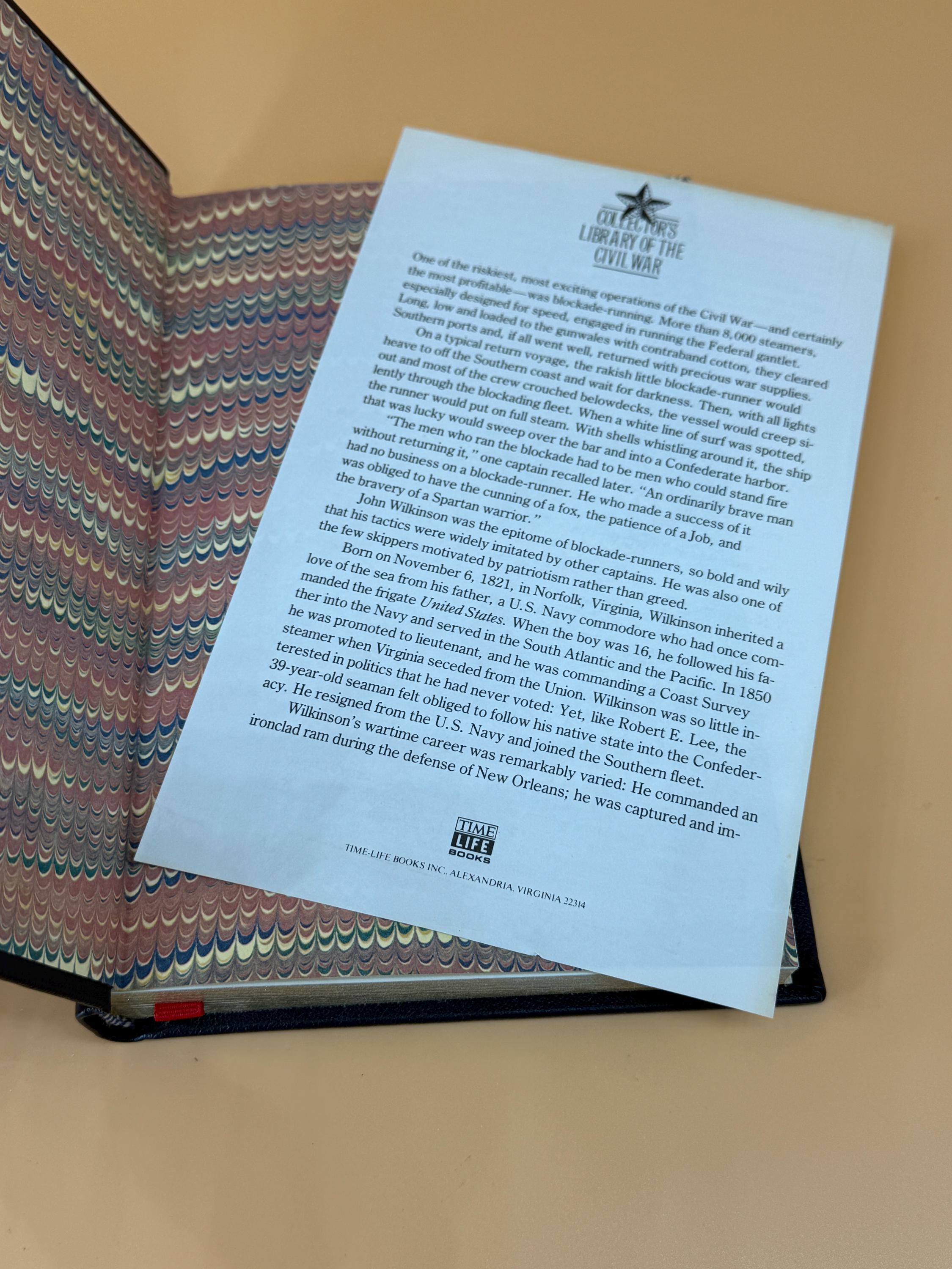 The Narrative of a Blockade Runner by John Wilkinson is one of the titles from the Civil War Collectors Library published by Time Life Books. One of the riskiest, most exciting operations of the Civil War - and certainly one of the most profitable - was blockade running. On a typical voyage, the runner would shove off the Southern coast and wait for darkness. They then would creep silently through the blockade fleet and once the white line of surf was spotted they would put on full steam. With shells whistling, the ship that was lucky would sweep over the bar into a Confederate harbor.