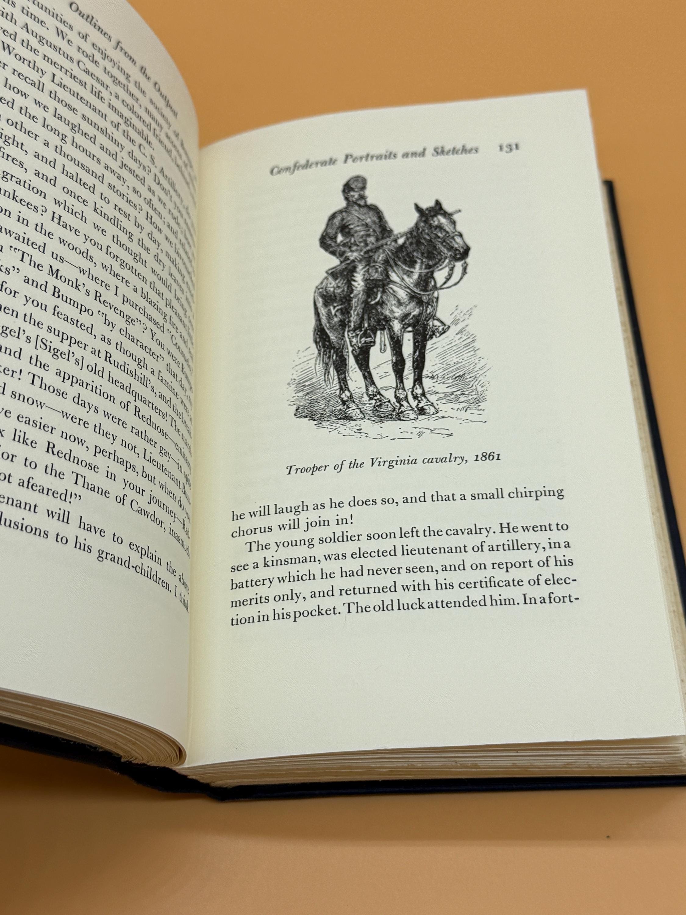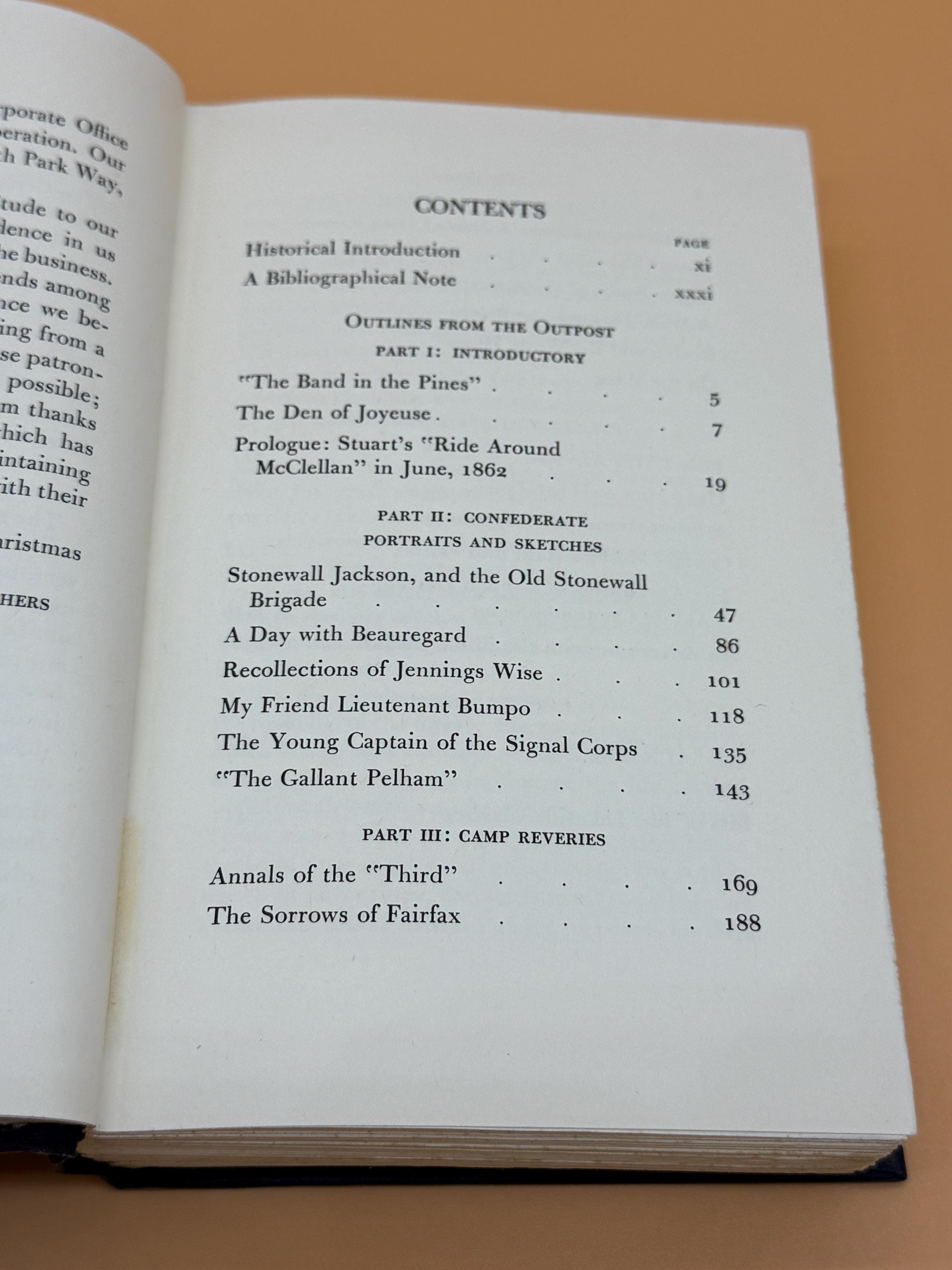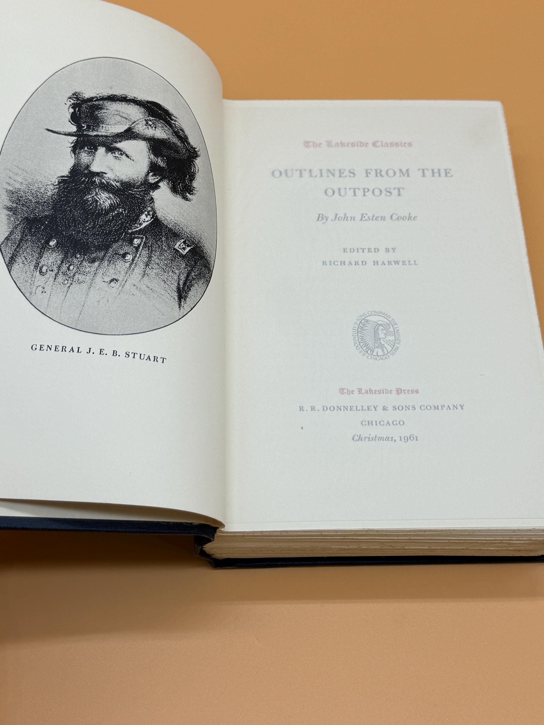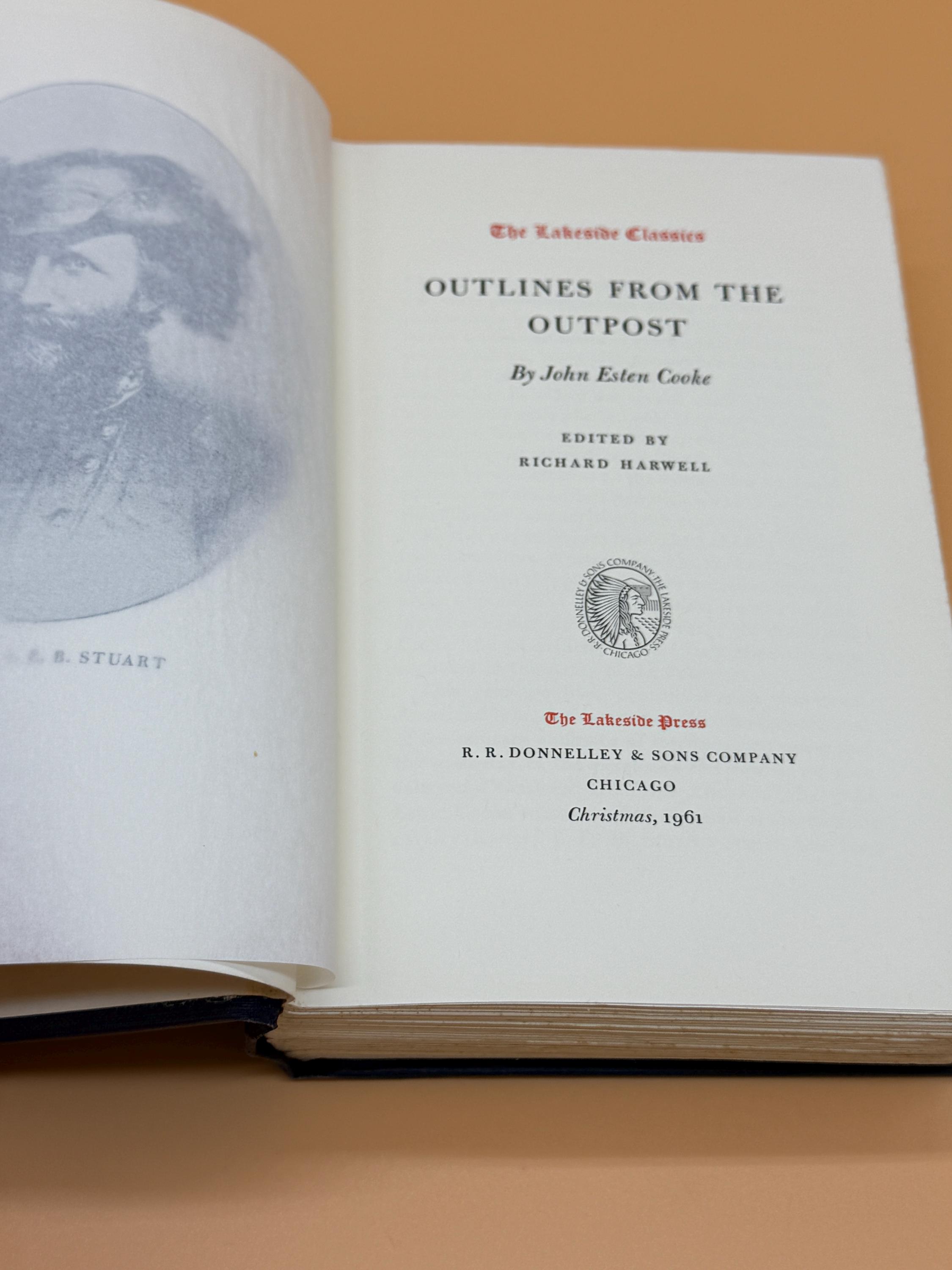 Outlines from The Outpost by John Estes Cooke is a history of the authors time with calvary leader J.E.B. Stuart. Cooke served on Stuart's staff. From the preface; "This story of the Confederate Army of Northern Virginia is a drama os great adventure". In the Civil War, cavalry was of great importance. They were the eyes and ears of the commanders. From Stuart's ride around McClellan in June 1862 to the tragic end of a great army, the book provides a vivid and fascinating portrait. This edition features a frontispiece of Stuart and still contains the original tissue guard opposite frontispiece.
