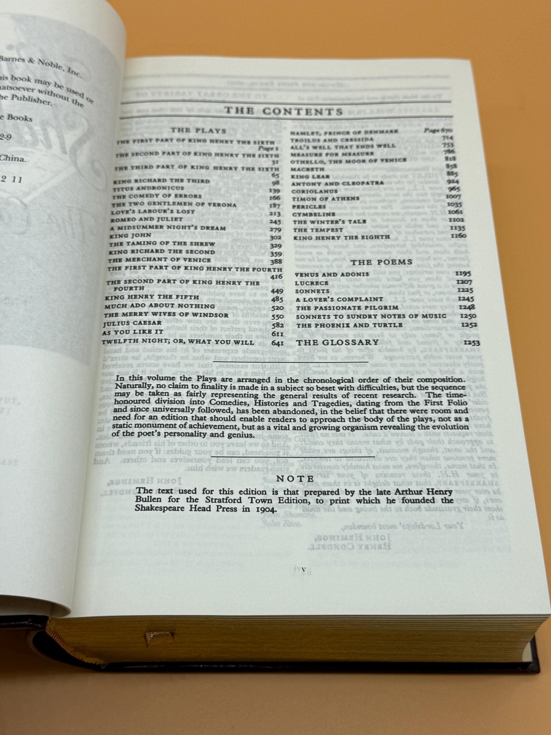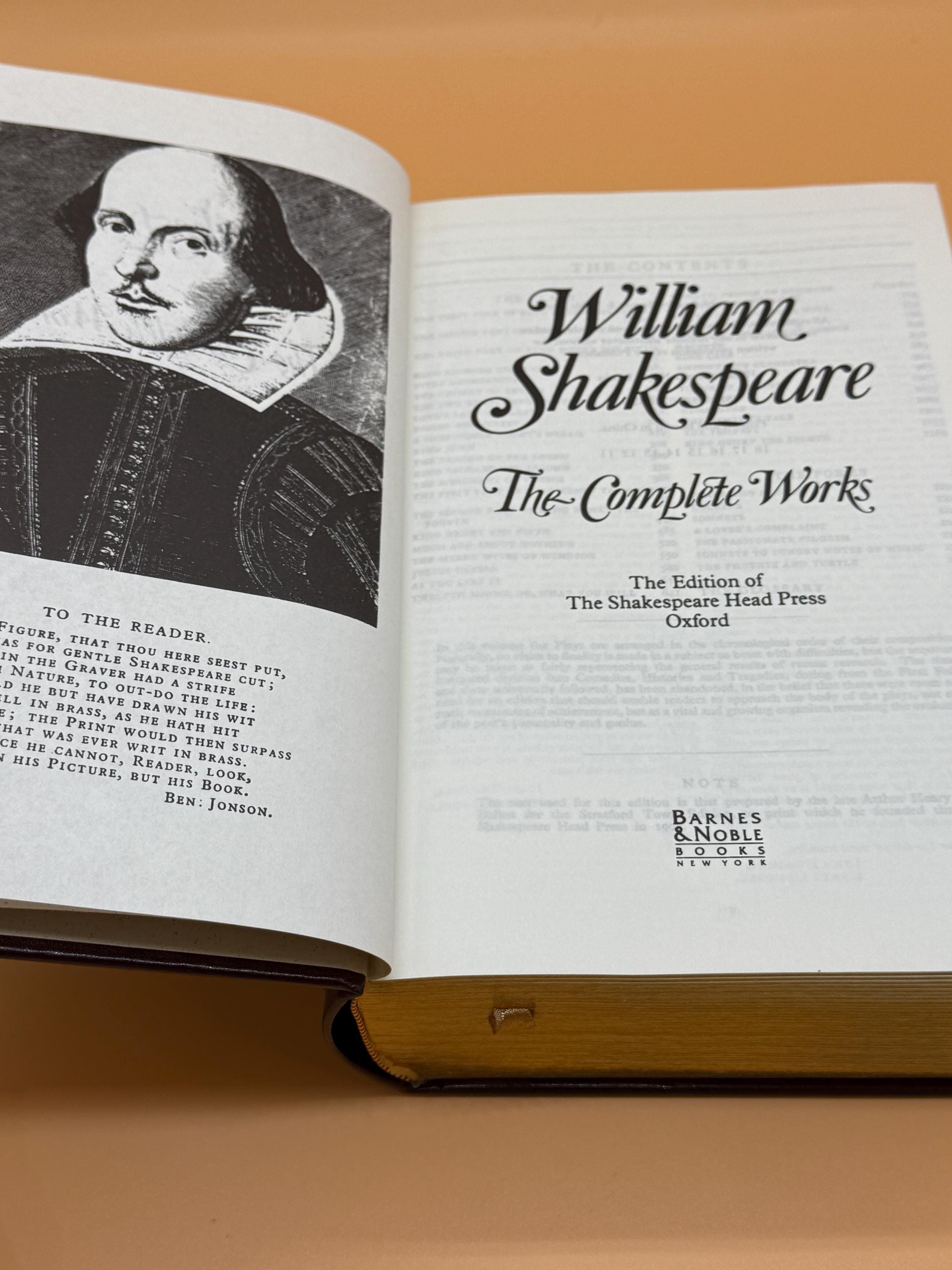 William Shakespeare The Complete Works includes all the plays, poems, sonnets etc. It is a facsimile copy of The Edition of The Shakespeare Head Press Oxford. Illustrated frontispiece of Shakespeare.