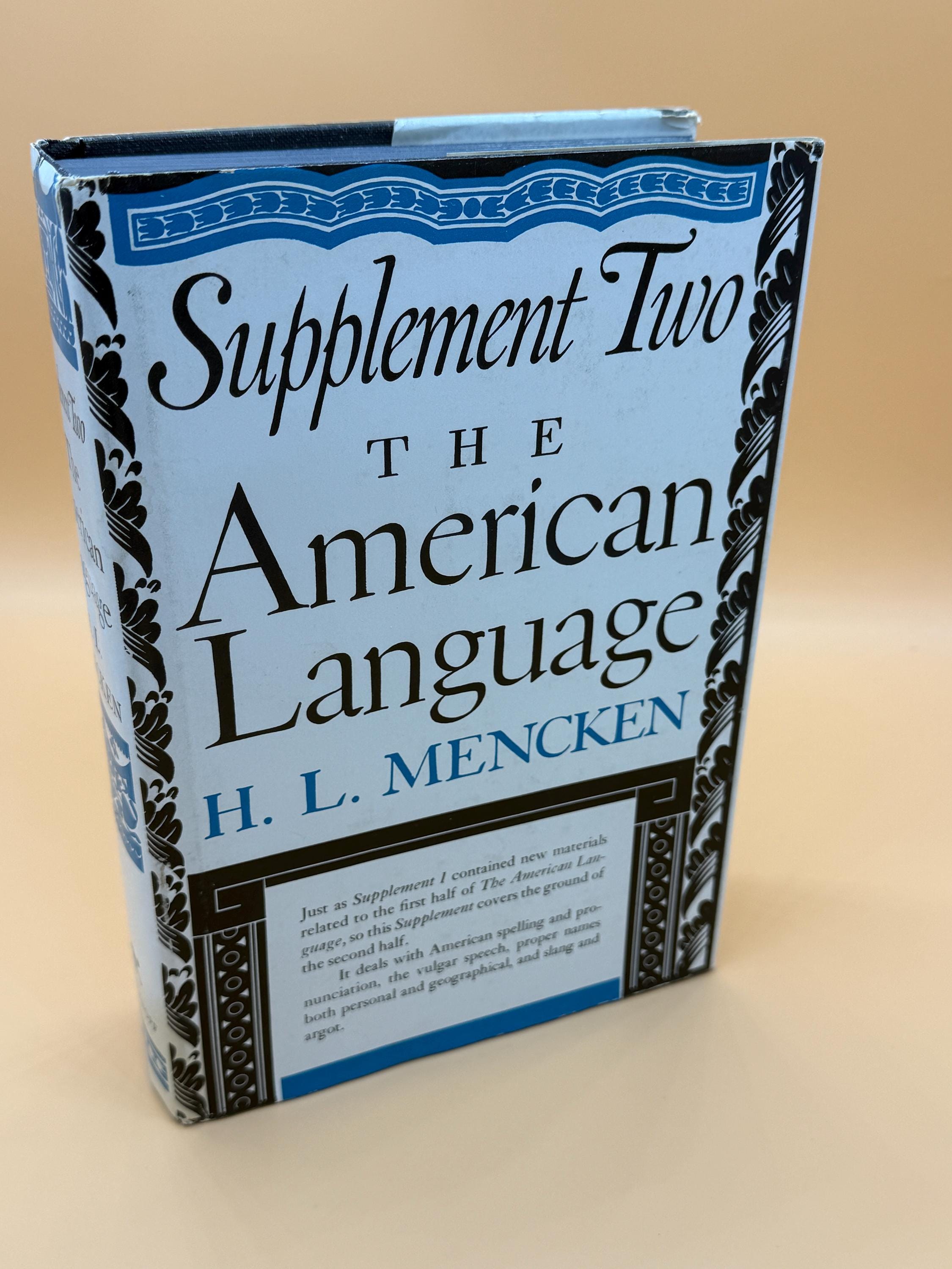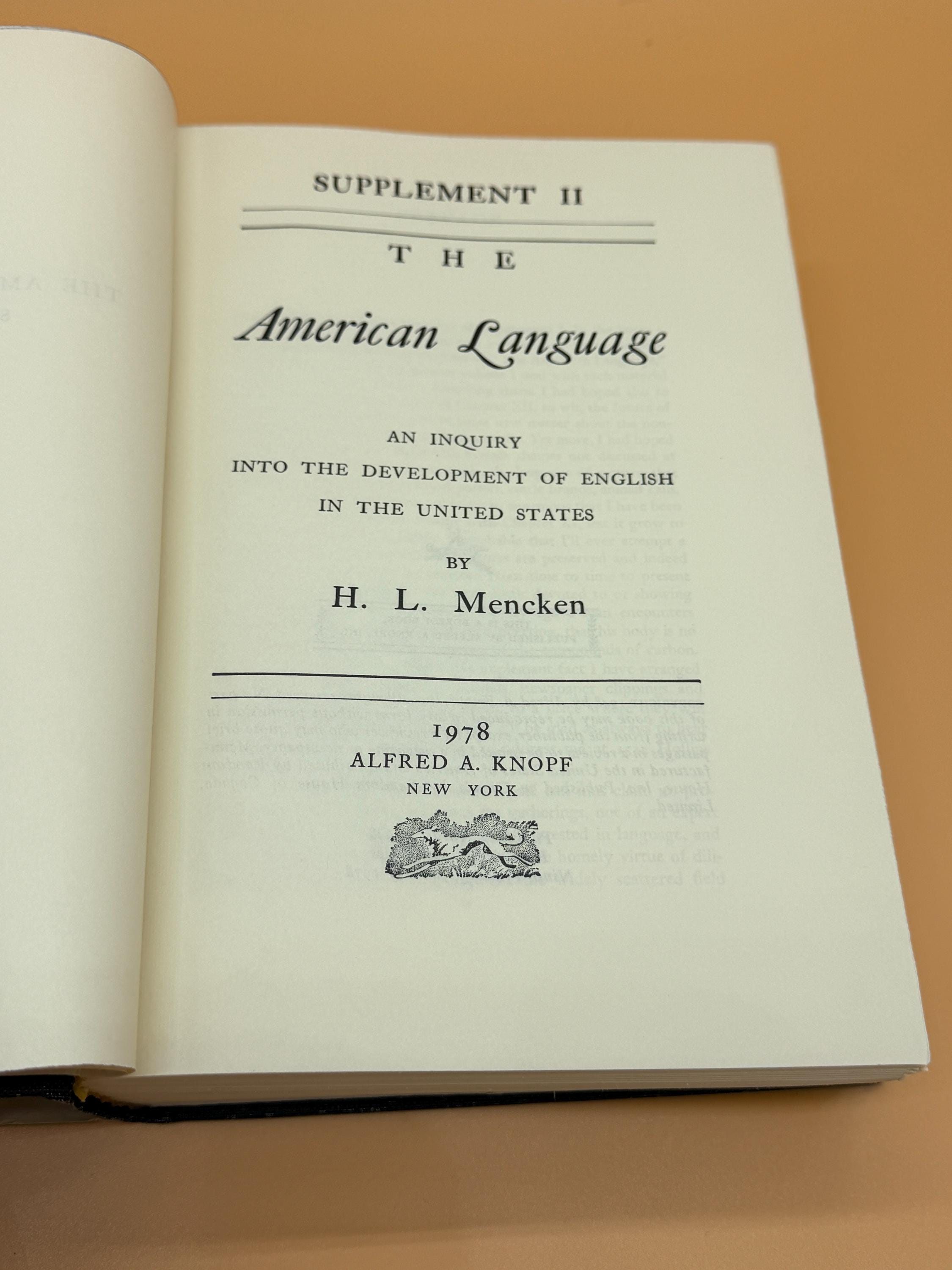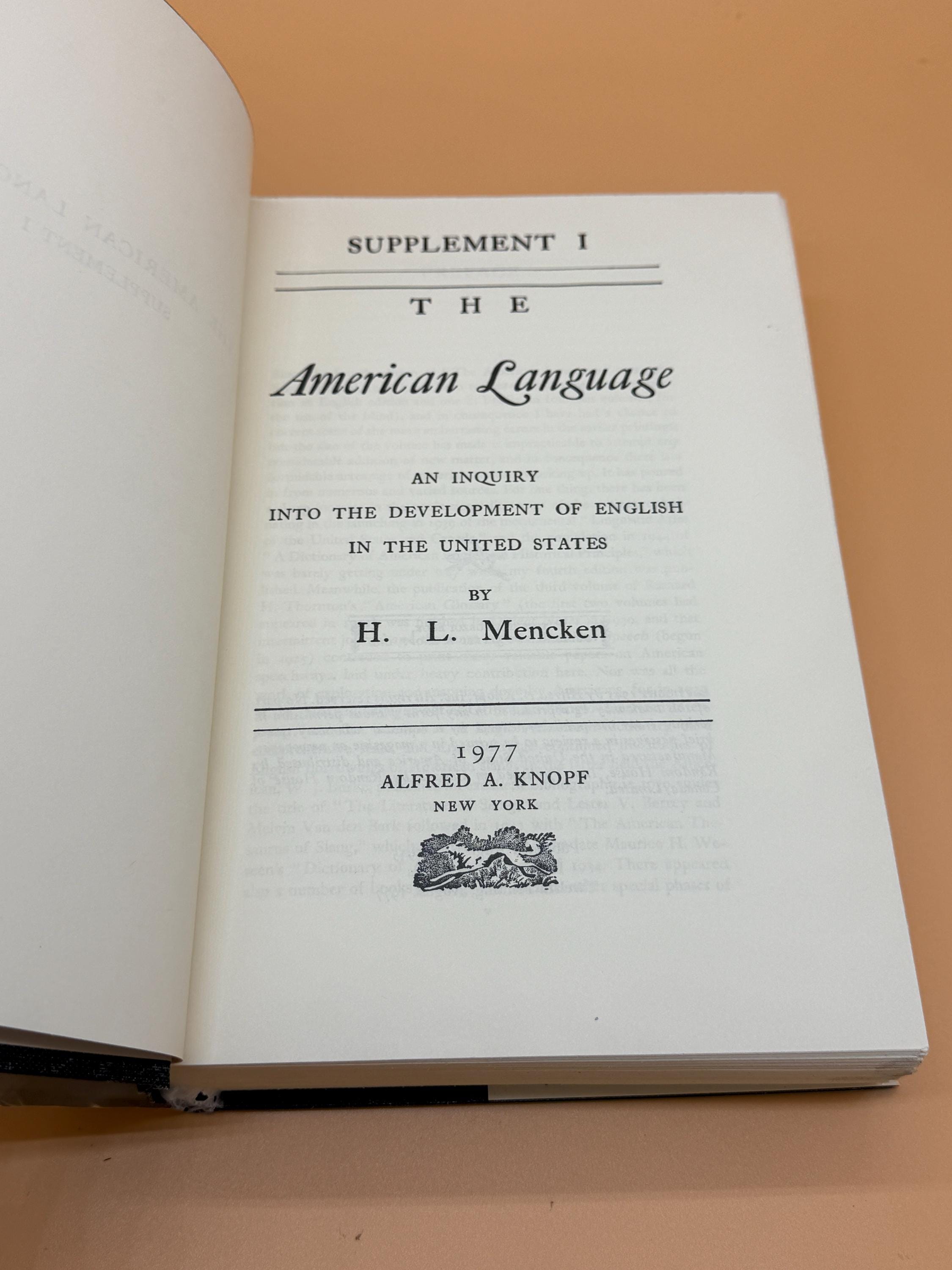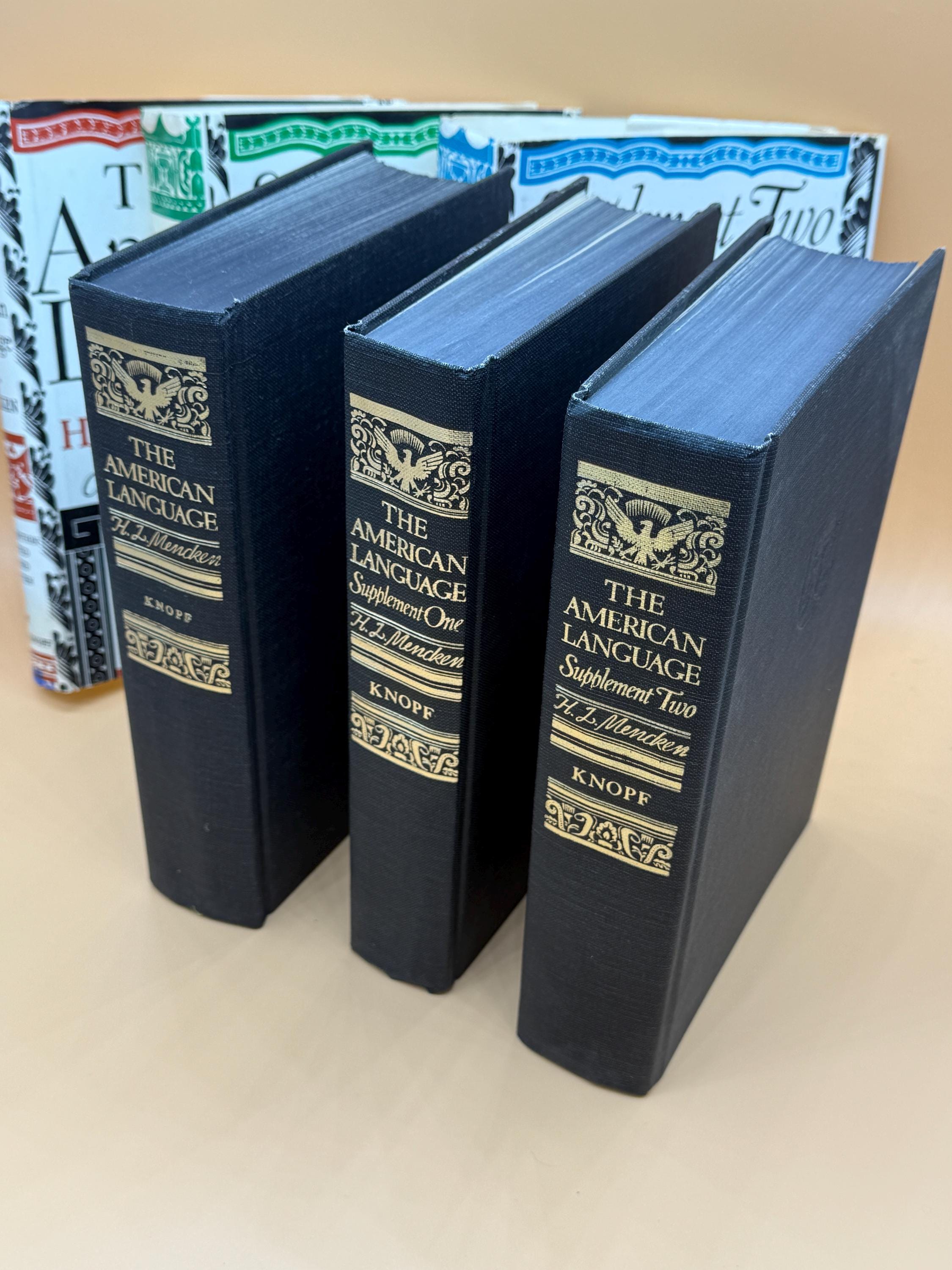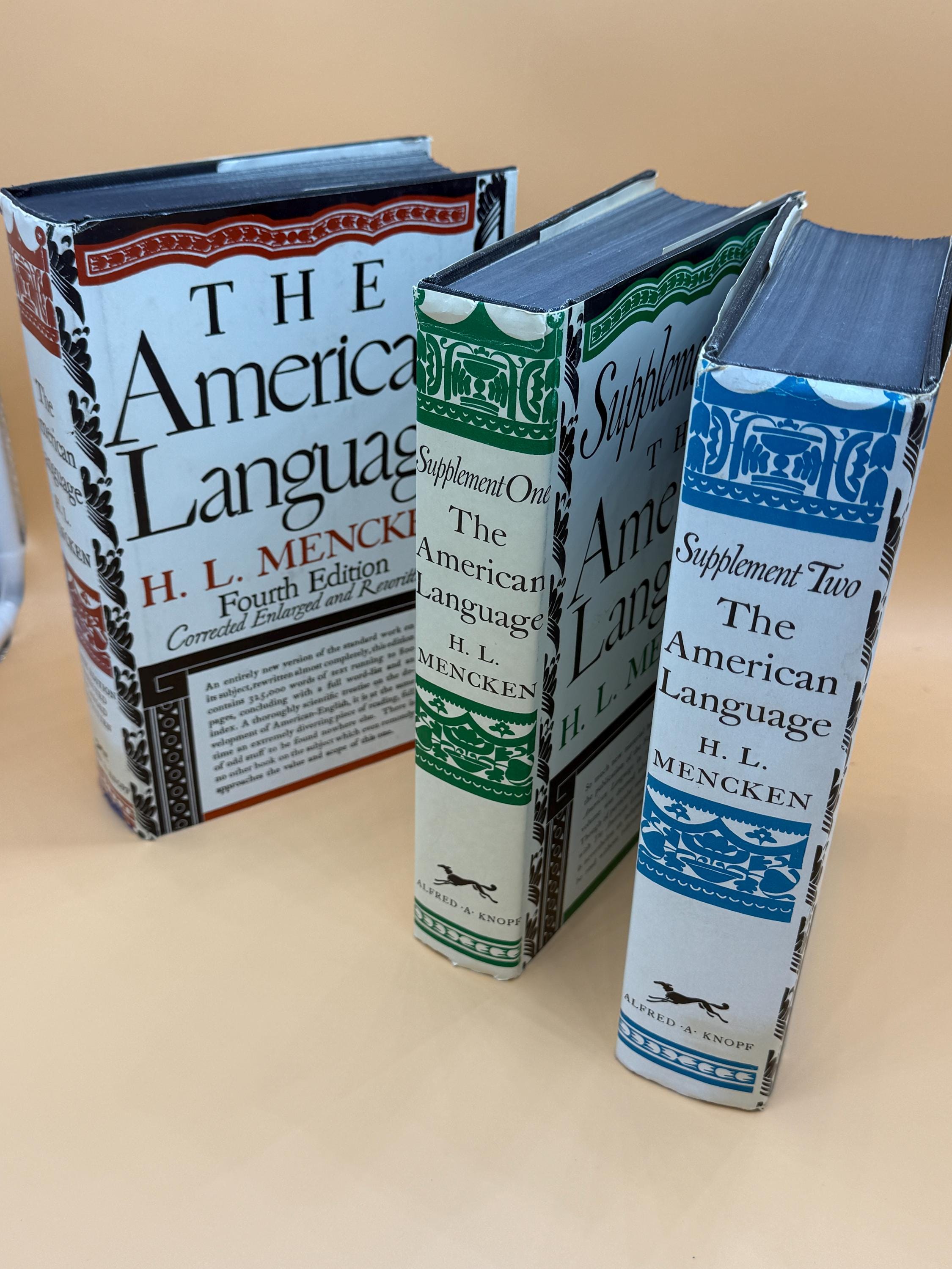 This is a very good 3 volume set of hardcovers. 1980 Knopf Publishing. Each volume is very good inside and out. NOTE: the bindings are tight and straight on each BUT Volume One-The American Language has a mild binding crack between pages 276-277. Pages are still tight to binding but notable binding crack needs disclosed. The pages in each are very clean and actually crisp. Black hardcover boards under each dust jacket are very good with only very light shelf wear. The accompanying dust jacket are graded very good given age, they are clean and still holding shine but do have light shelf wear corners/edges. Each volume is medium octavo book size or 6.5" x 9.5" with 767, 738, and 890 pages respectively.