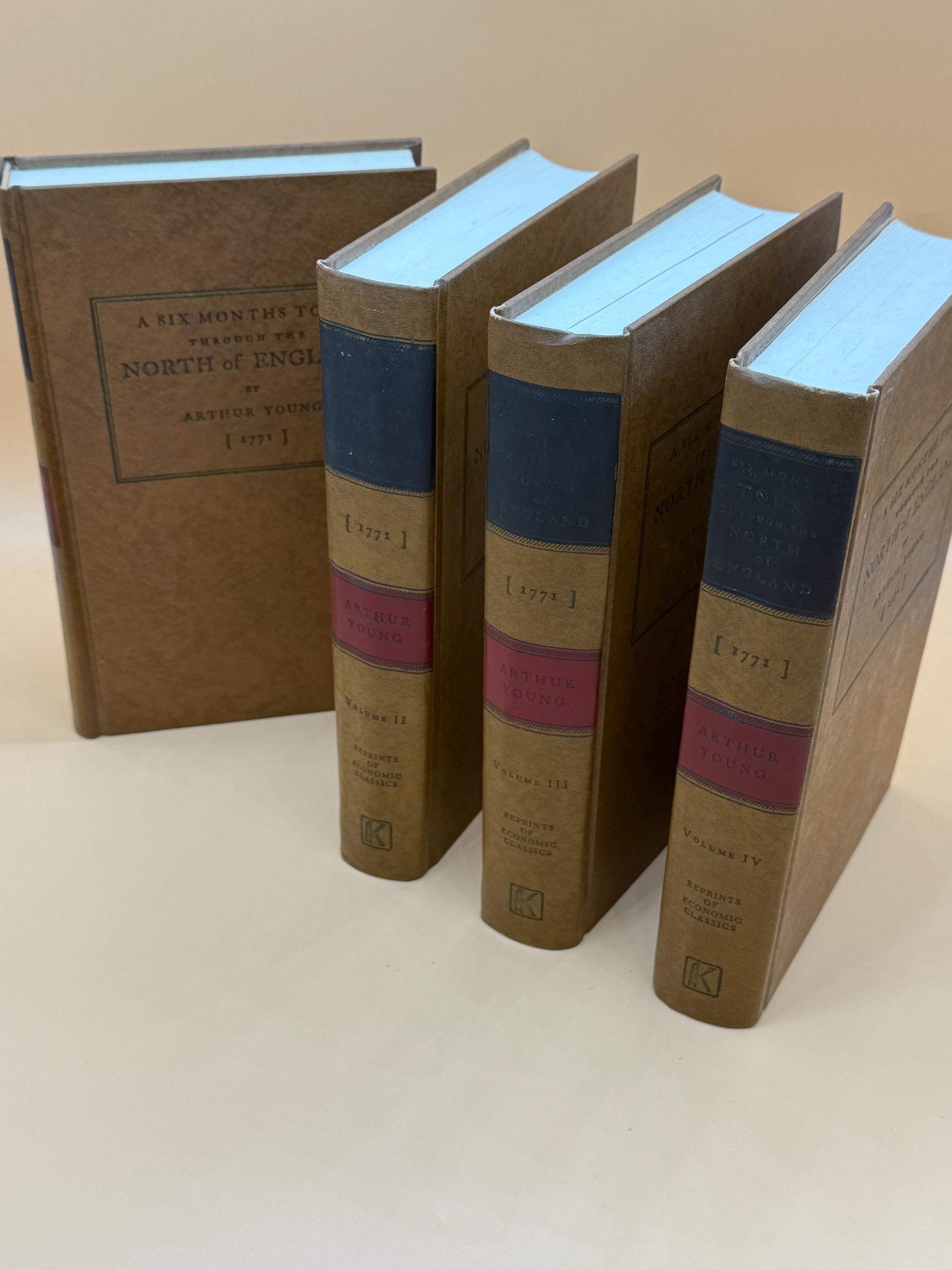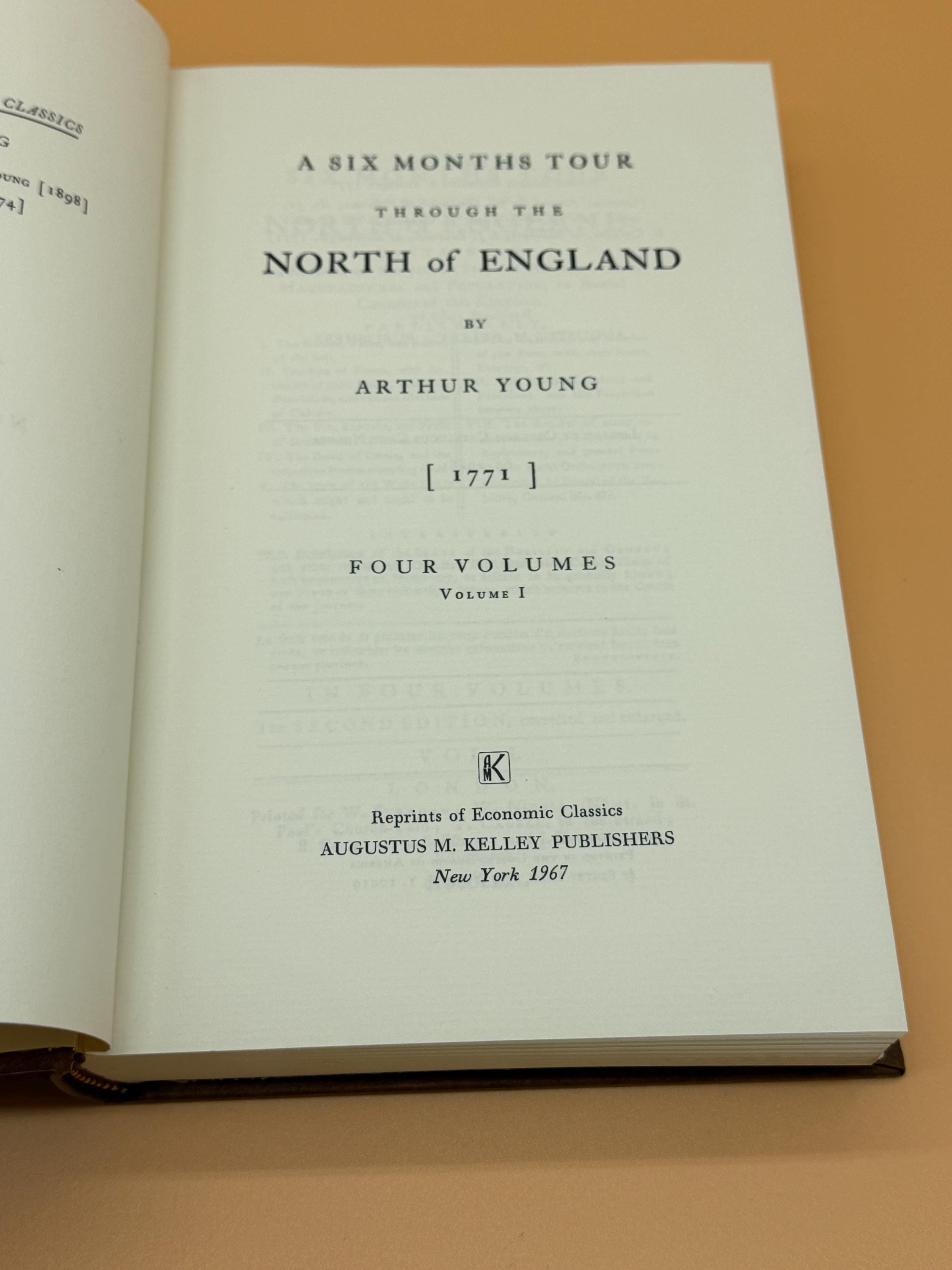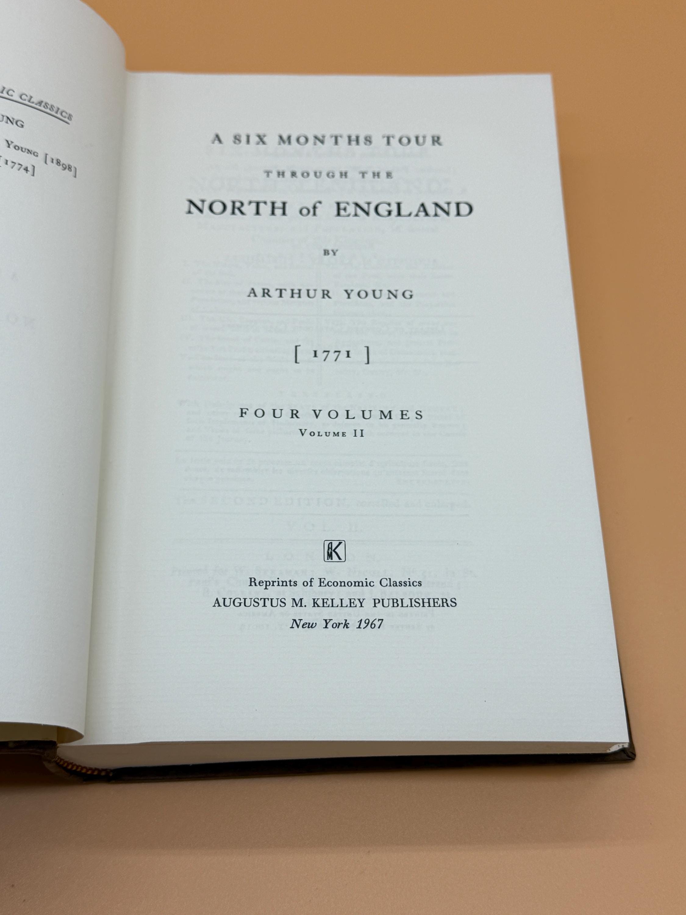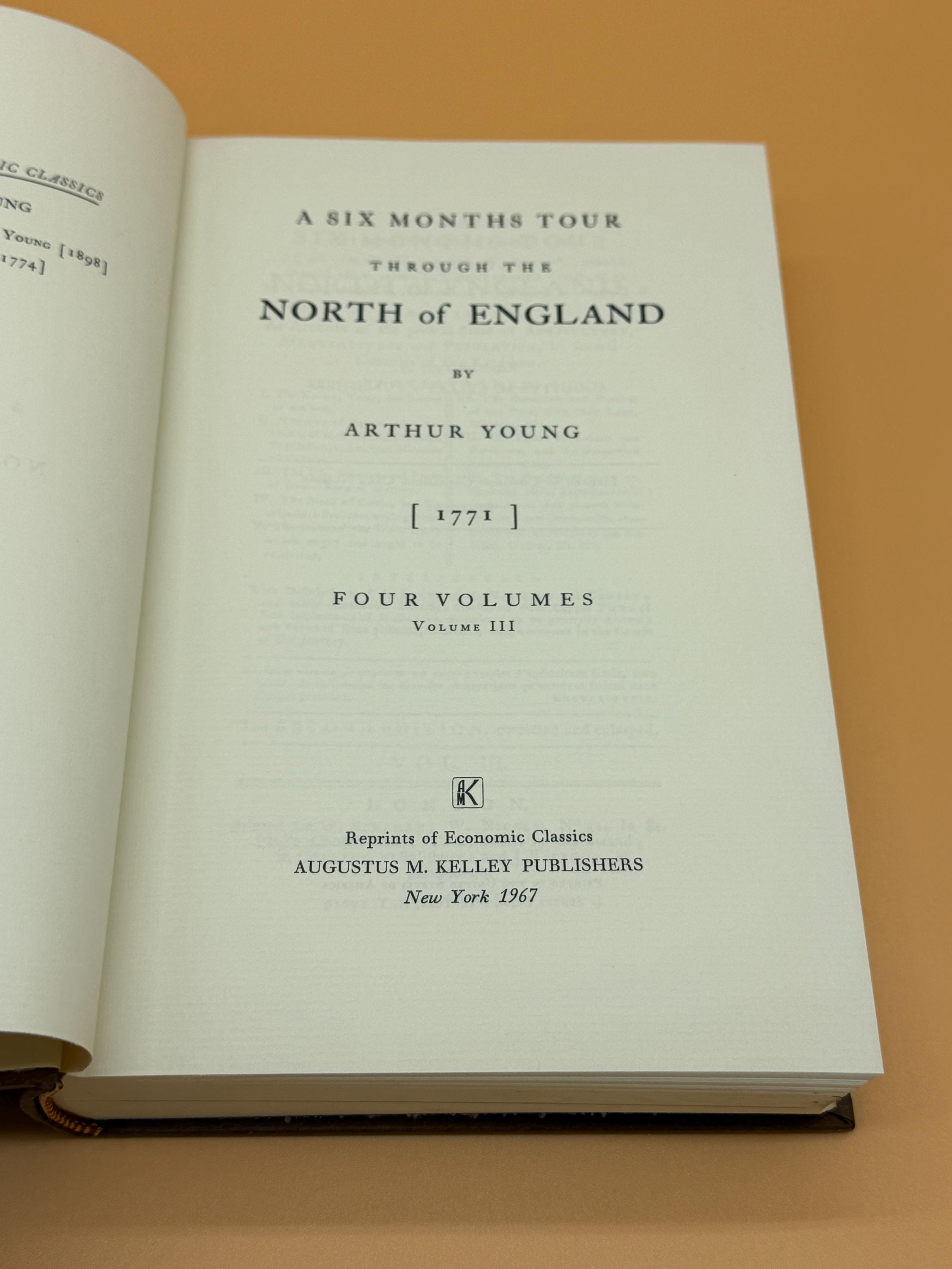 A Six Months Tour Through the North of England by Arthur Young was first published in 1771. This edition is a facsimile reprint of the original first edition. The author was a renowned agriculturalist and traveler. This is a seminal work detailing his journeys across Northern England to document the state of agriculture, manufacture, society and more during the late 18th century. His detailed observations were collected from hundreds of farms, farming implements, and the lives of laborers. As such the books are a significant cultural and historical text on 18th-century English life.