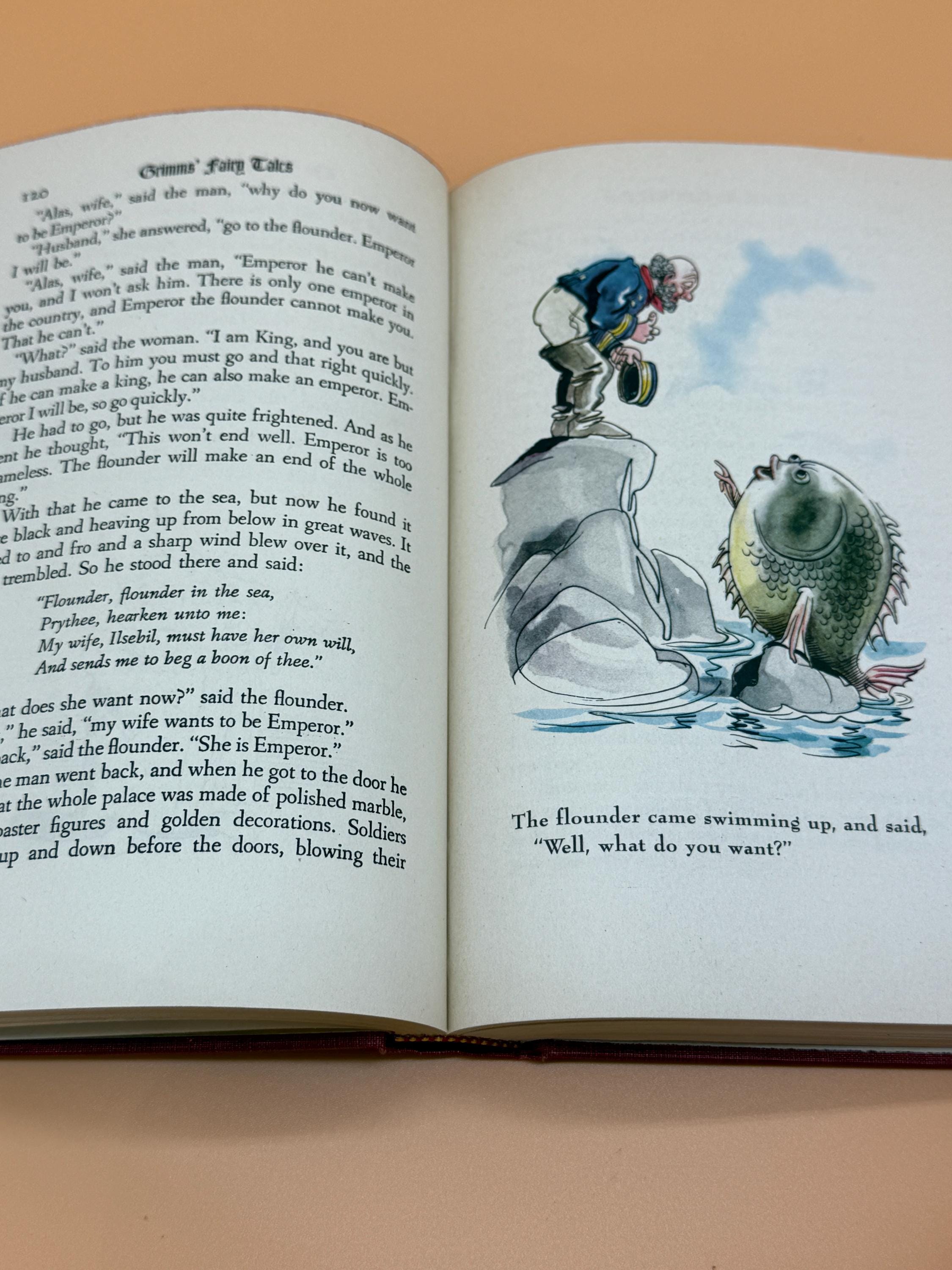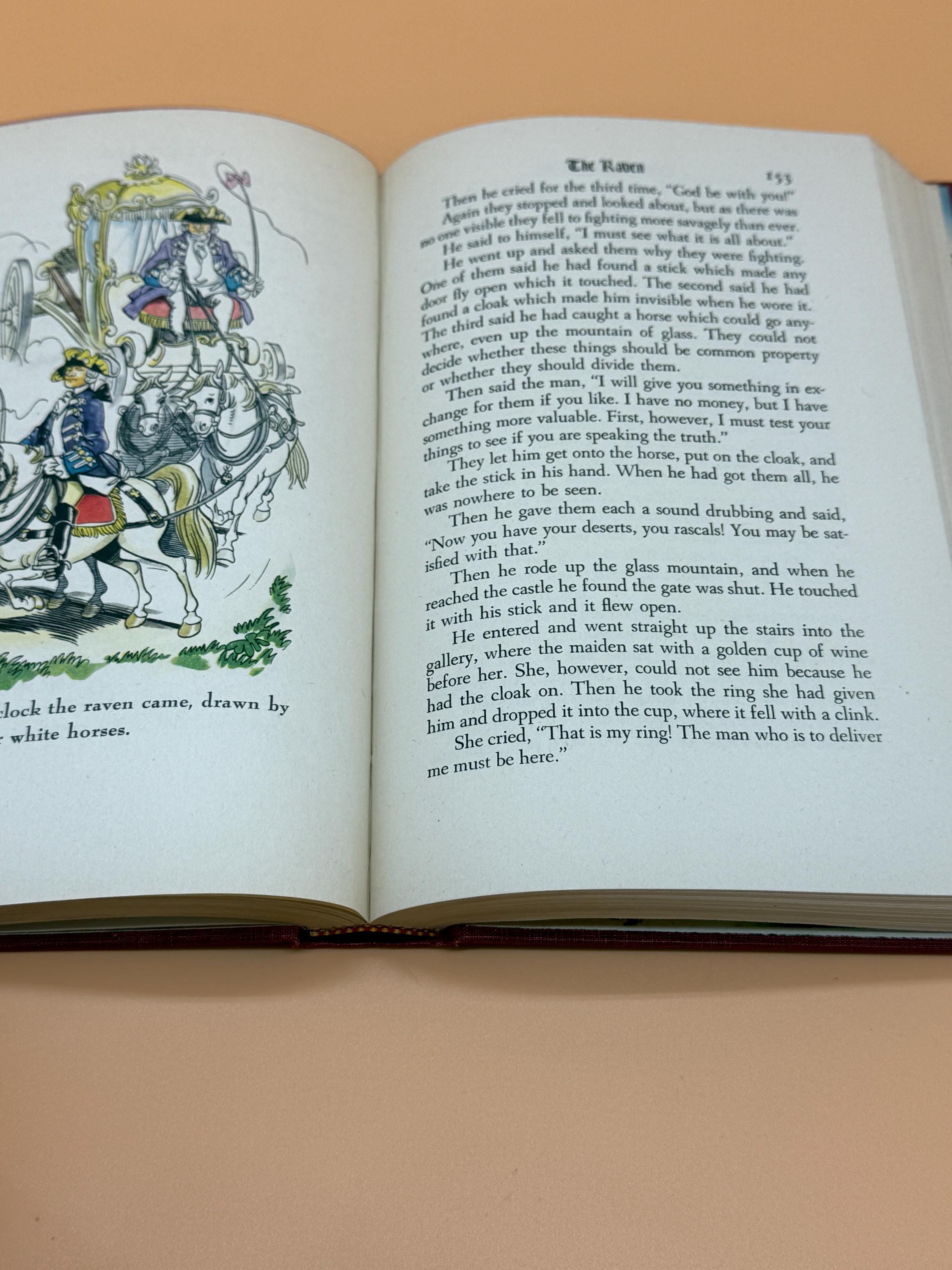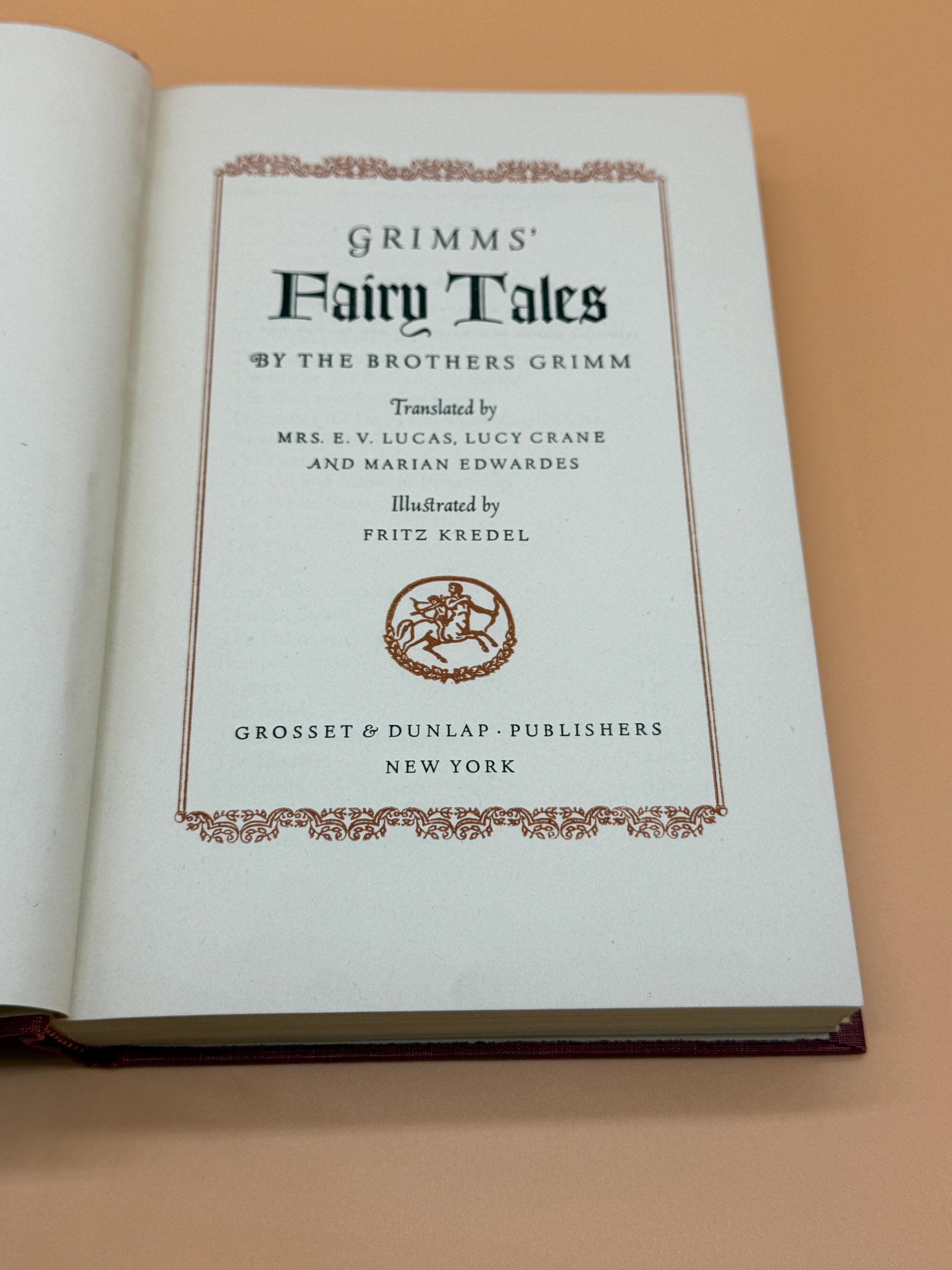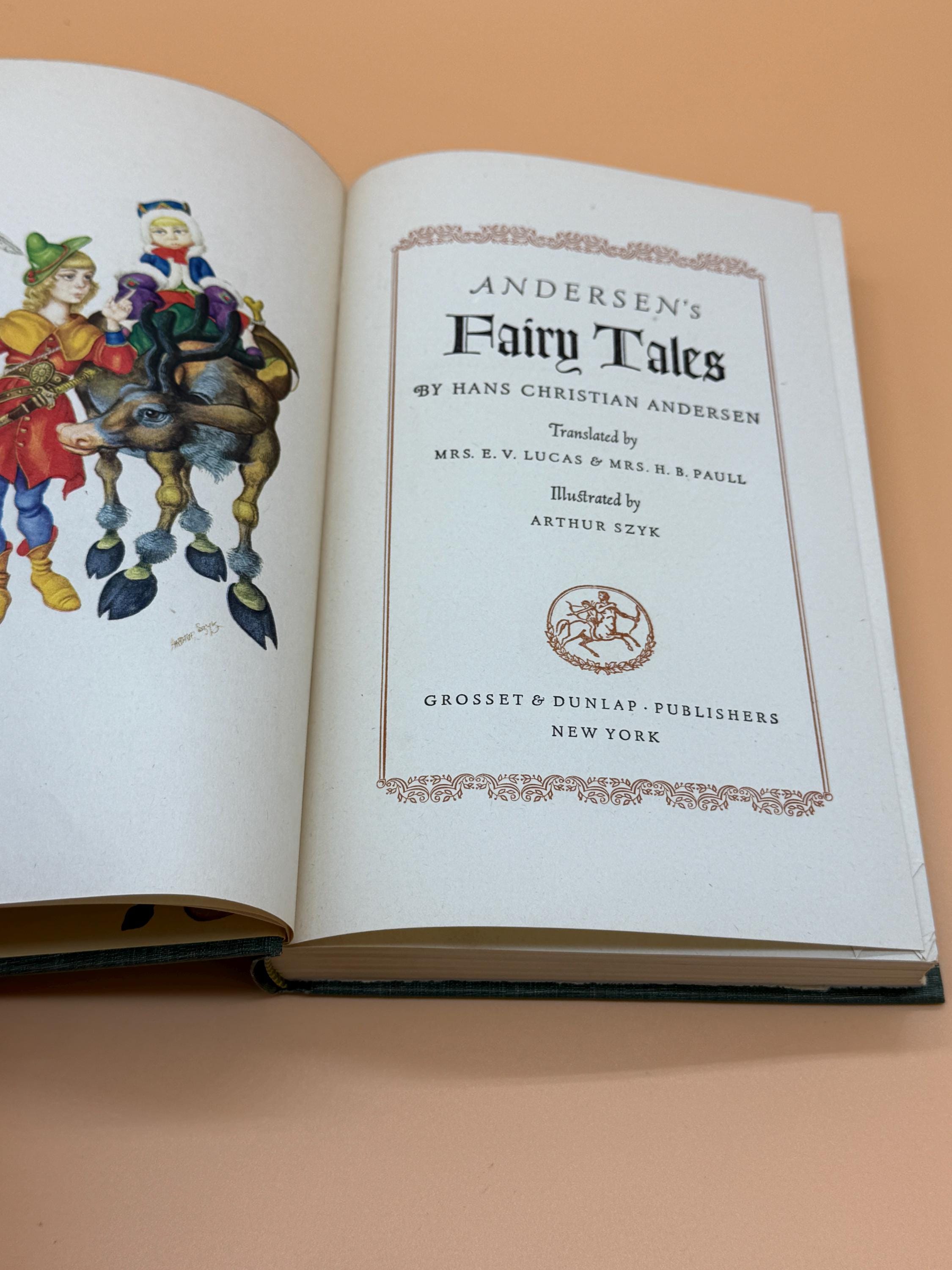 This set of fairy tale books include Andersen's Fairy Tales and Grimm's Fairy Tales. The set was published in 1945 by Grosset and Dunlap. Fritz Kredel illustrated Grimm's Fairy Tales and Arthur Szyk illustrated Andersen's Fairy Tales. Favorites like The Fir Tree, The Ugly Duckling, The Wild Swans, The Princess and The Pea, and many more are found in Andersen's Fairy Tales. Grimm's Fairy Tales include The Golden Bird, The Goose Girl, The Frog Prince, The Queen Bee, Rumpelstiltskin, Rapunzel, The Raven and many more.