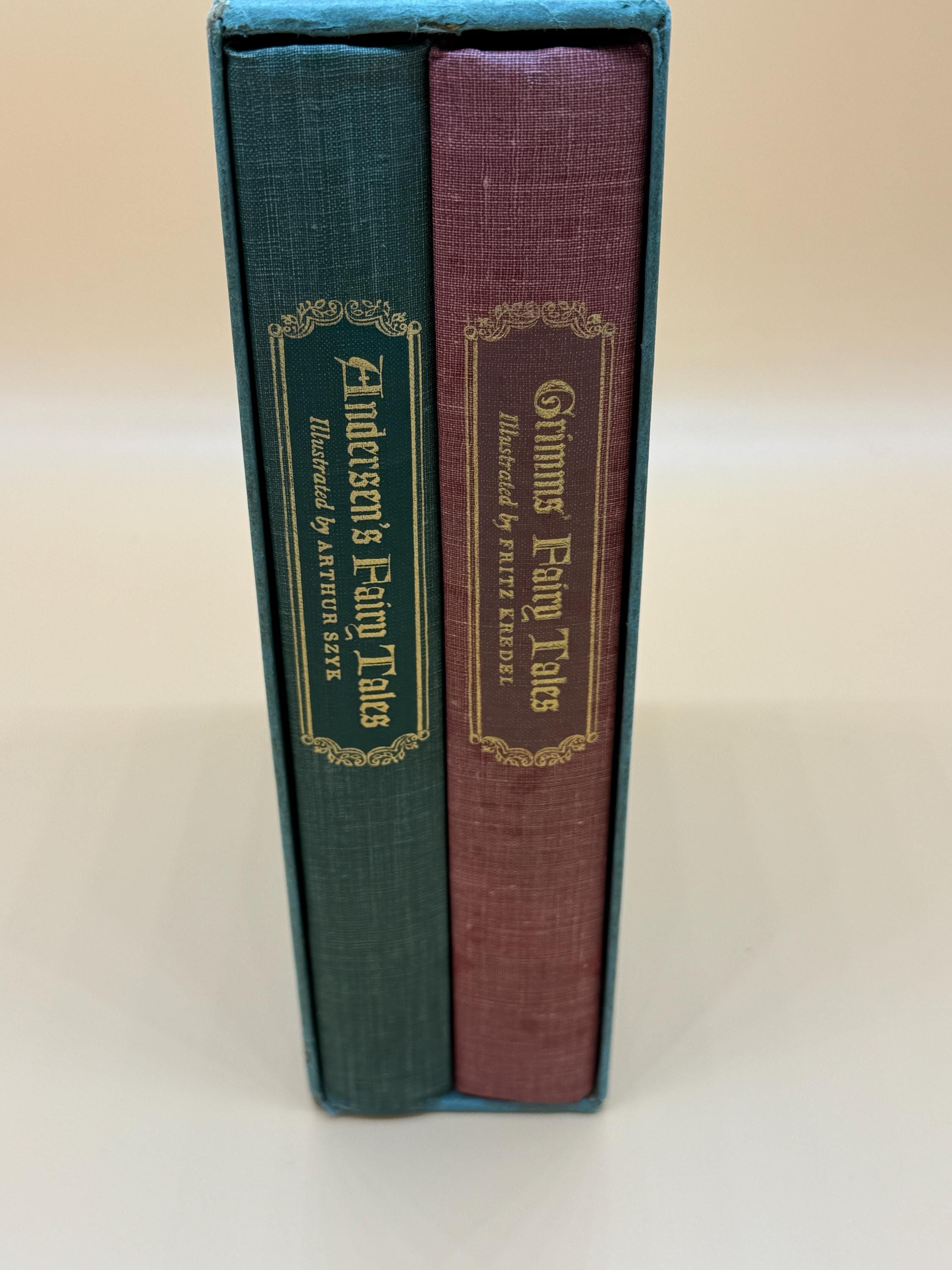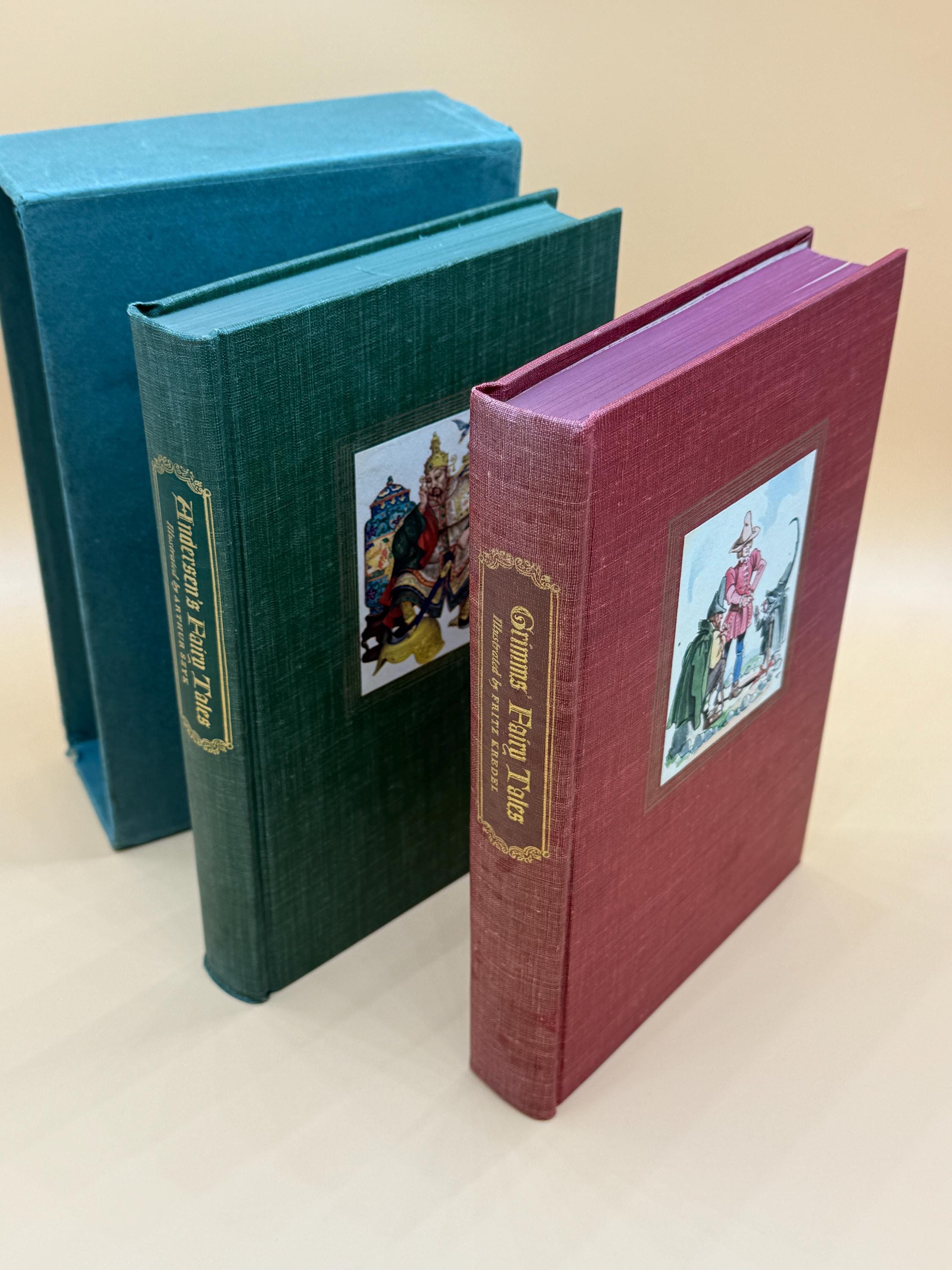 This is a very good set of two hardcovers with accompanying slipcase. 1945 Grosset & Dunlap Publishing. Both volumes in the set are very good inside and out. NOTE: inside both volumes on first blank page there is previous owners bookplate affixed AND inside front cover of Grimm's Fairy Tales there is a scuff where assumed bookplate removed. Otherwise both volumes are very clean inside and out. The pages on both are very good and clean. the bindings on both are tight and straight. Both have full color illustrated endpapers. Andersen's Fairy Tales is bound in green hardcover boards and Grimm's Fairy Tales bound in red, each with color illustrated pastedown front. Both hardcover boards are very good and clean with only very light shelf wear. Each volume is illustrated with illustrator details below. Each volume is octavo book size or 6" x 9". The accompanying green slipcase is very good with light shelf wear but solid all around.