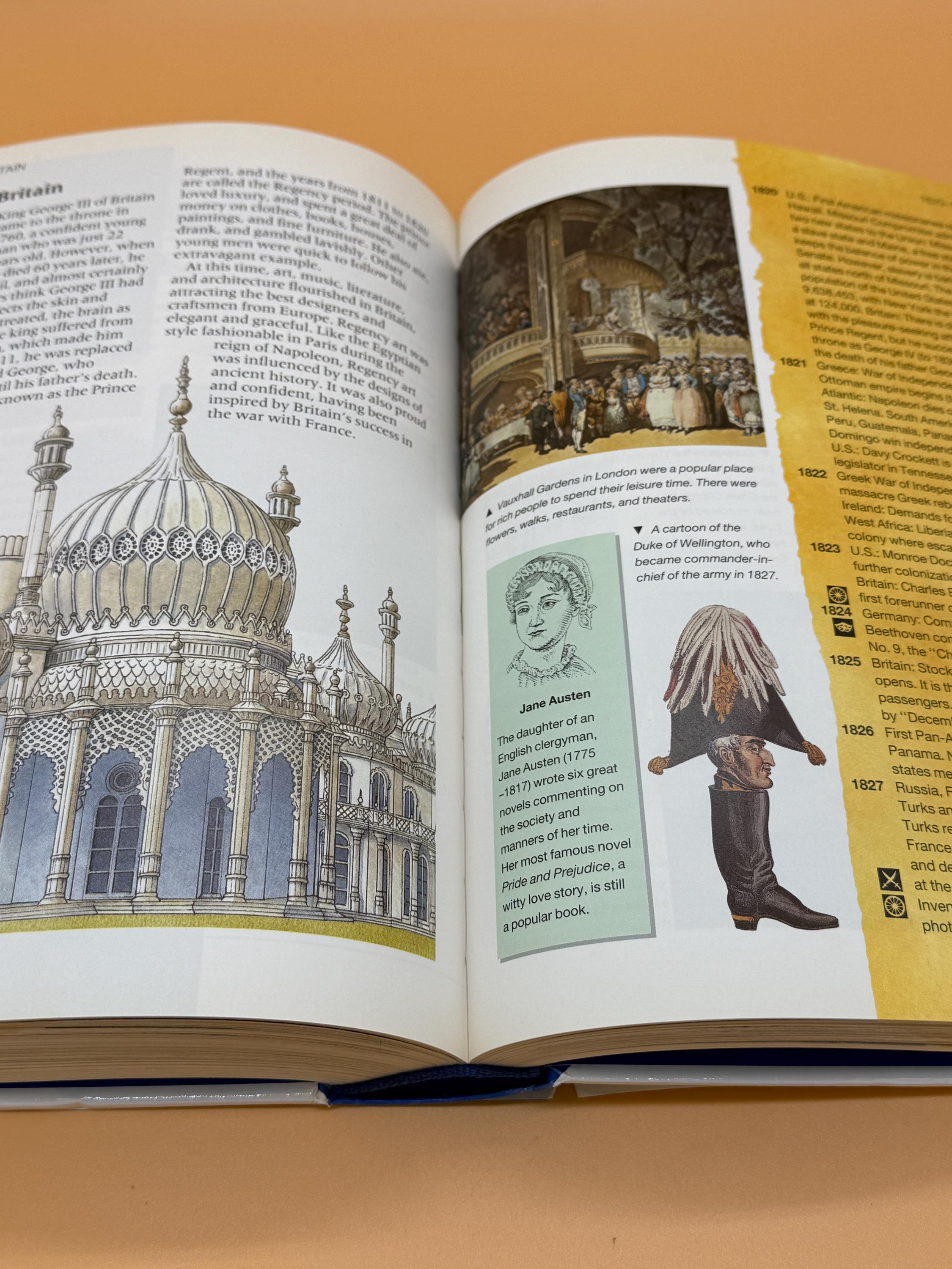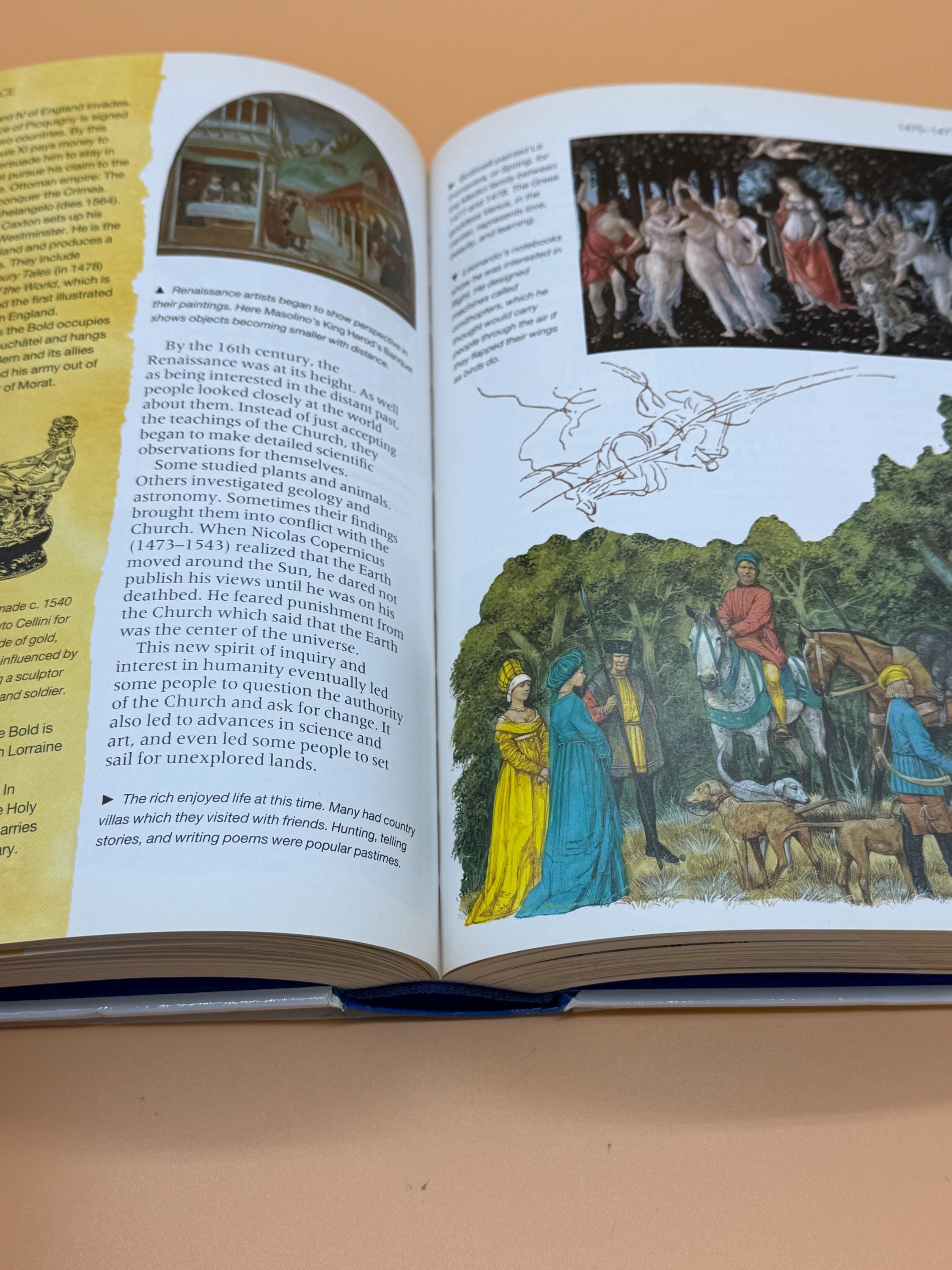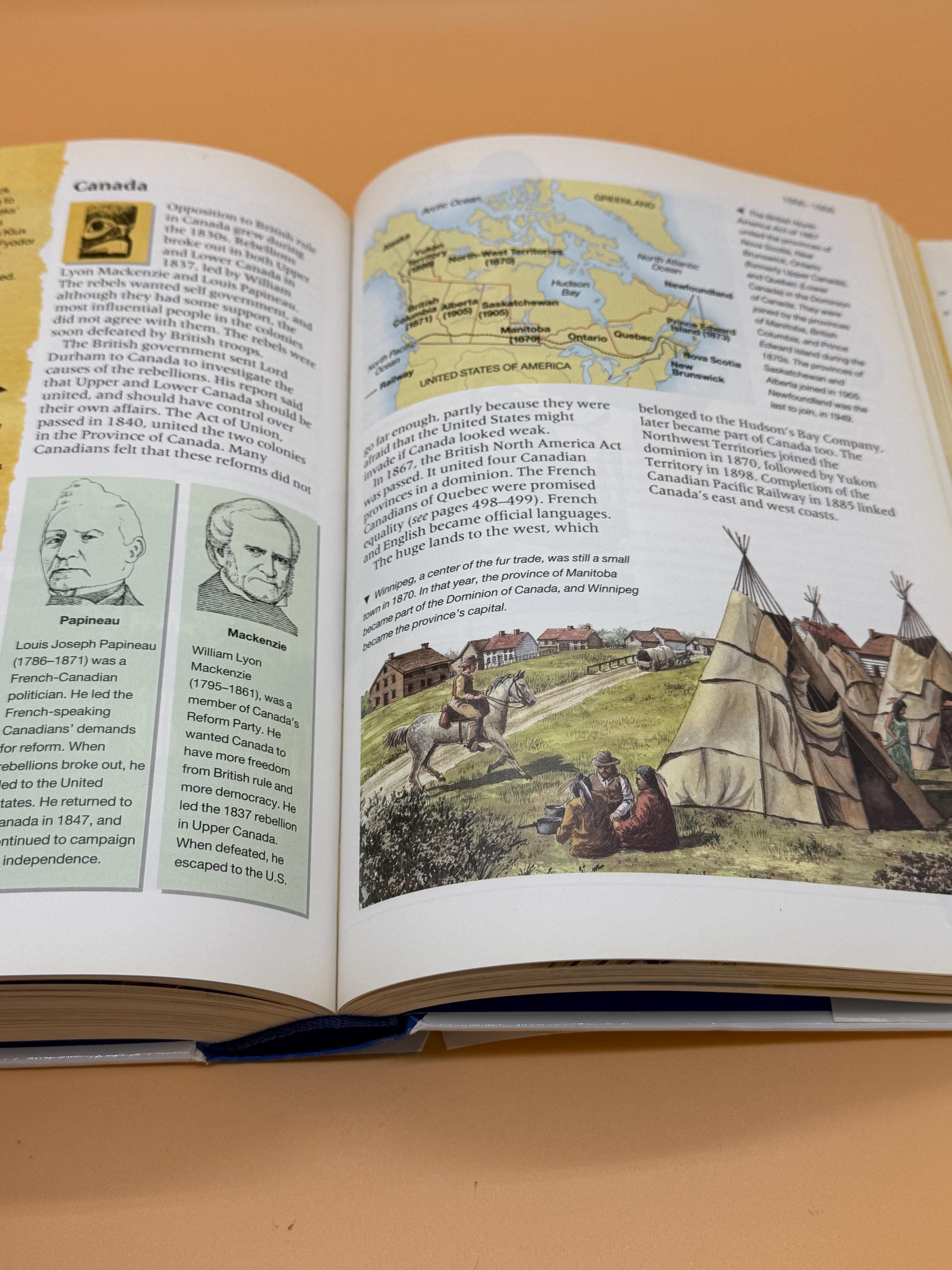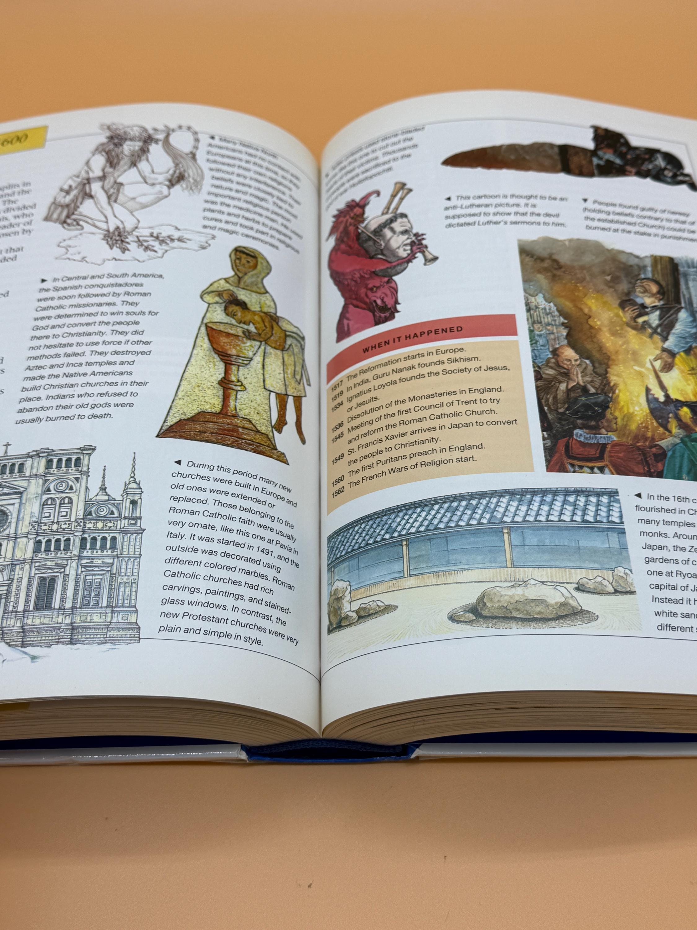 The Kingfisher Illustrated History of the World is a monumental volume that tells the history of the world from 40,000 B.C. through the time when people settled and developed the first civilizations up to present day. Informative essays are linked by a chronological timeline of significant dates and events. Includes 250 essays covering major historical events, over 1600 color and black and white illustrations and photos, over 100 maps, and nearly 100 bio's of important historical figures.