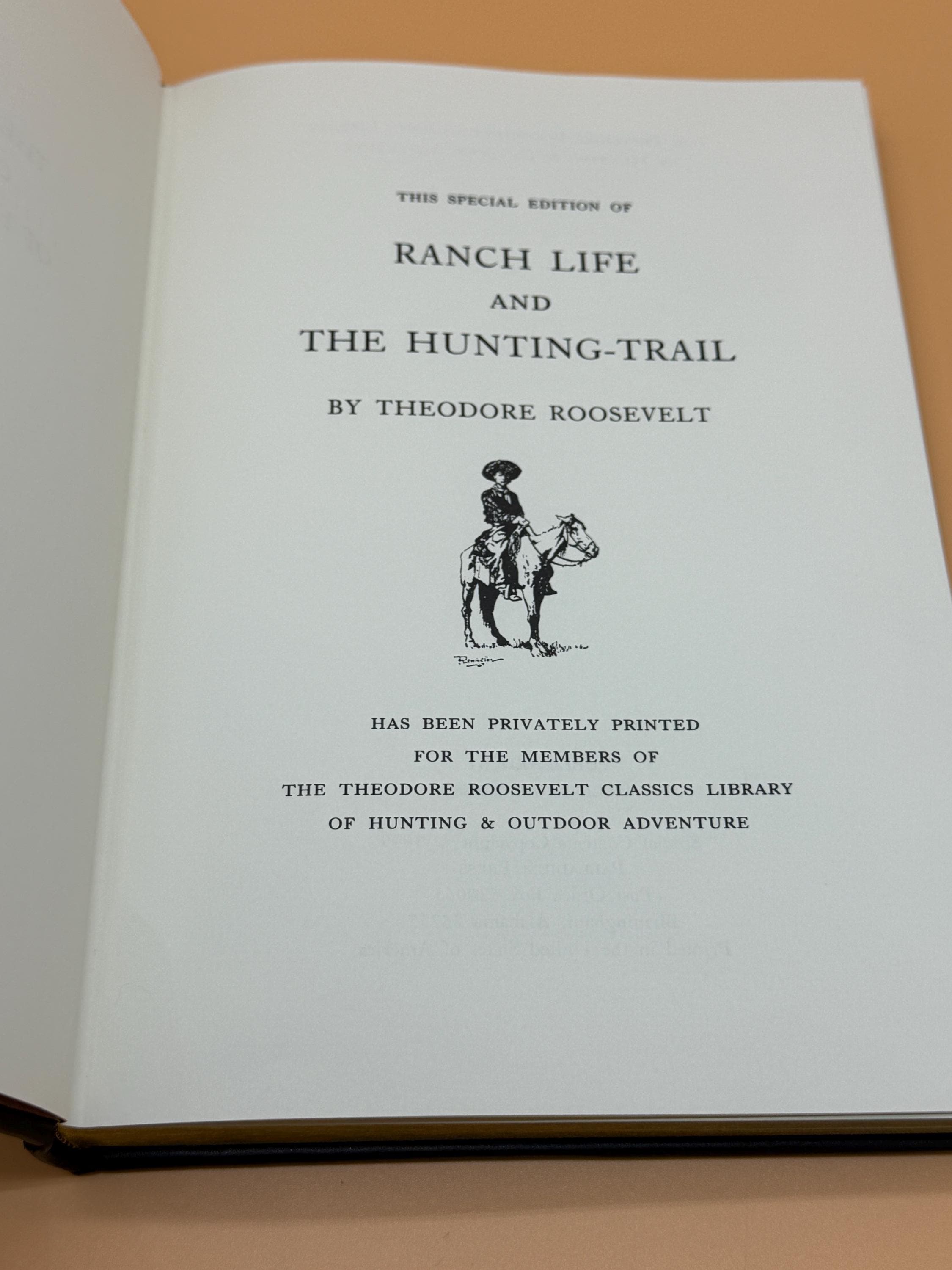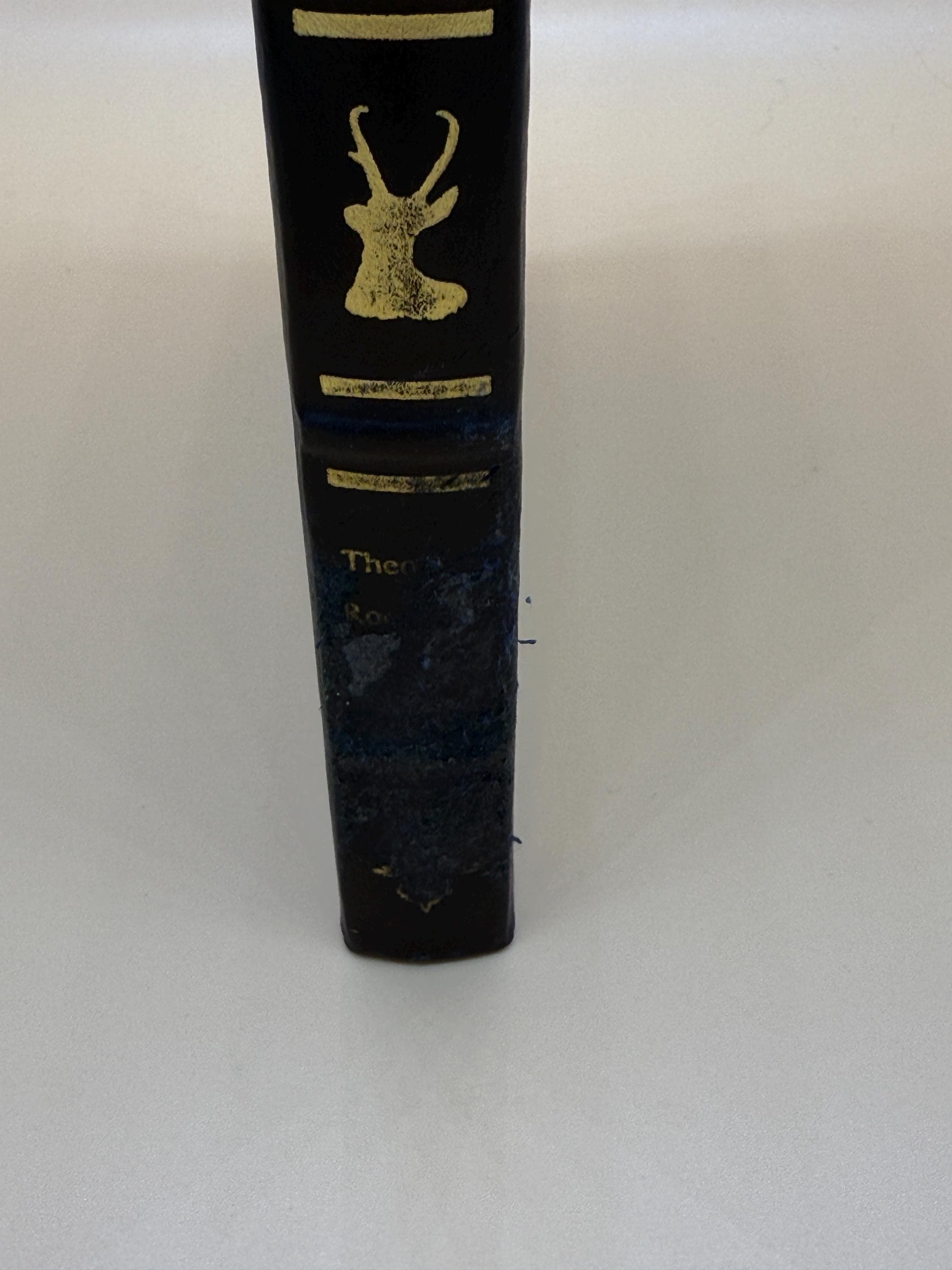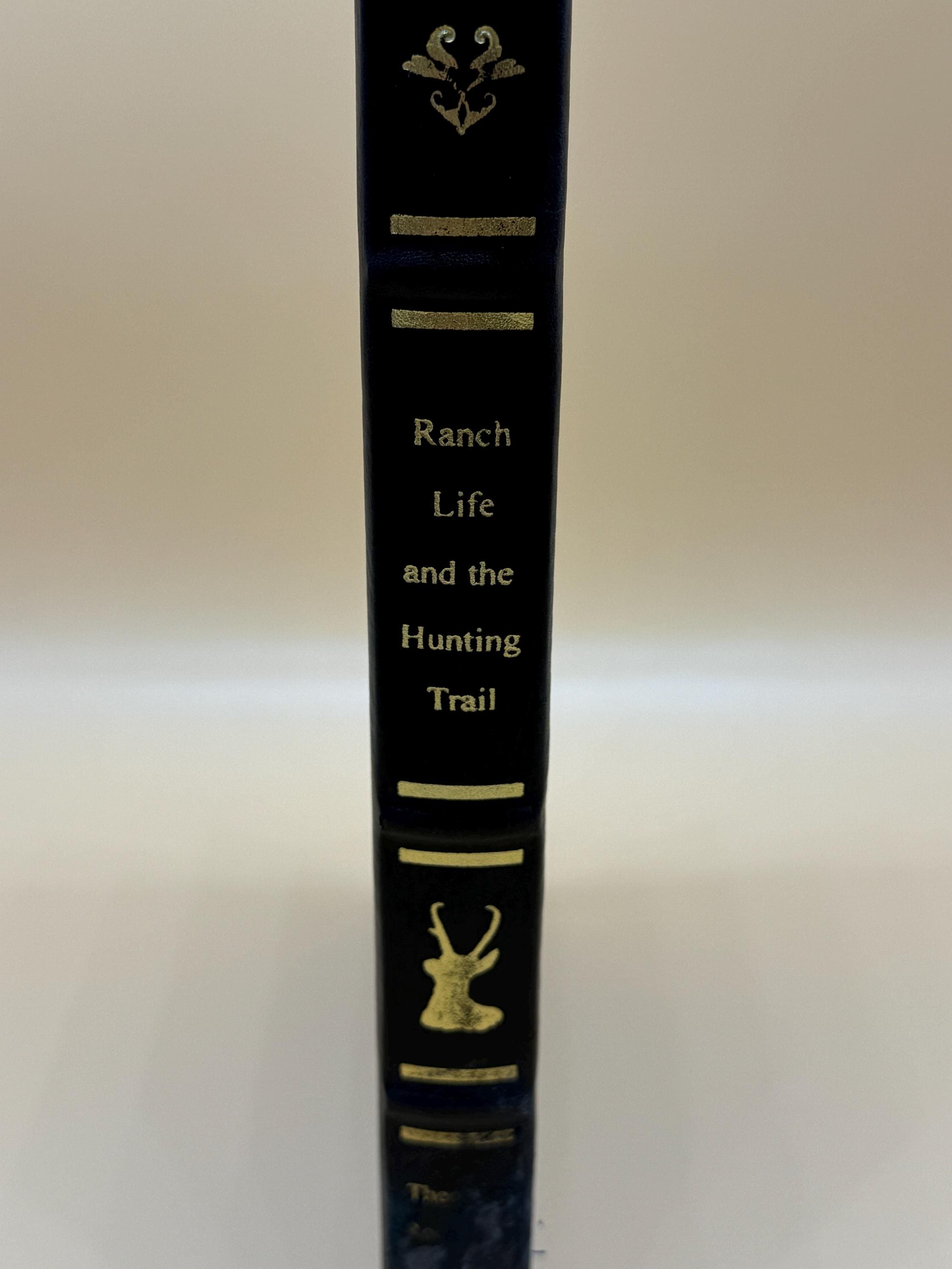 This is a very good leather-bound hardcover. 1999 Palladium Press Special Edition for the Theodore Roosevelt Classics Library of Hunting and Outdoor Adventure. This copy is still crisp and clean inside, BUT PLEASE NOTE: the leather binding along the bottom of the spine is worn, taking off some of the gold design along the bottom of the spine (see photo). The deer design and gold lettering on the spine is unaffected. The rest of the brown leather binding is very good front and back and features gold deer design and lettering front. The inside pages are still crisp and clean. The binding is tight and straight. All three pages edges tipped in gold gilt. Super octavo book size or 7" x 10.5" with 186 pages.