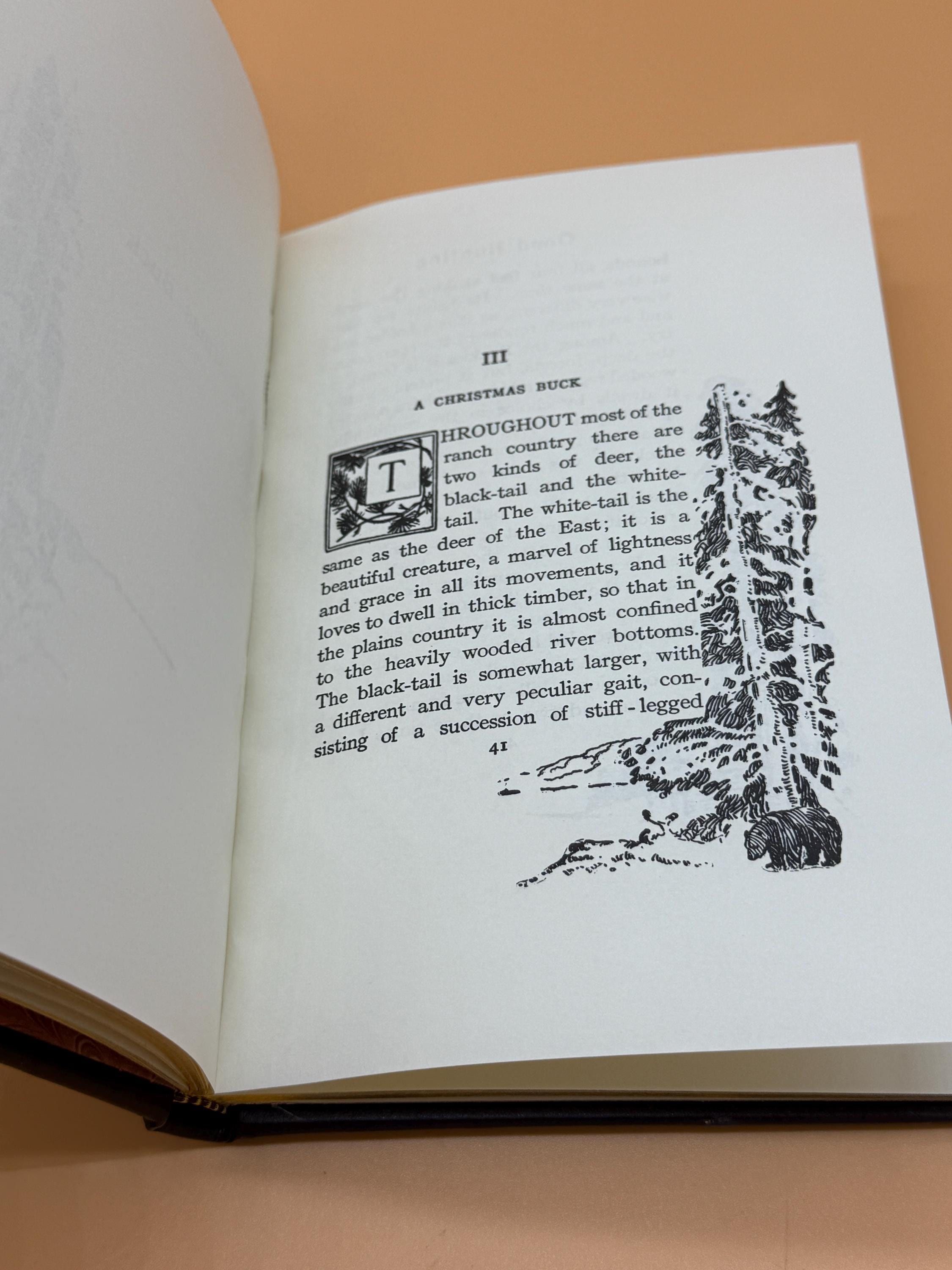 This is a near fine (almost like new) leather-bound hardcover. 2000 Palladium Press Special Edition for The Theodore Roosevelt Classics Library. This copy is still crisp and clean inside and out. The pages are crisp and clean. The brown leather binding features gold bear paw design front and gold lettering along spine. The brown leather binding is also near fine with barely a hint of shelf wear. All three pages edges tipped in gold gilt. Marbled endpapers front and back. Slightly smaller book size, crown octavo book size or 5" x 8" with 106 pages.