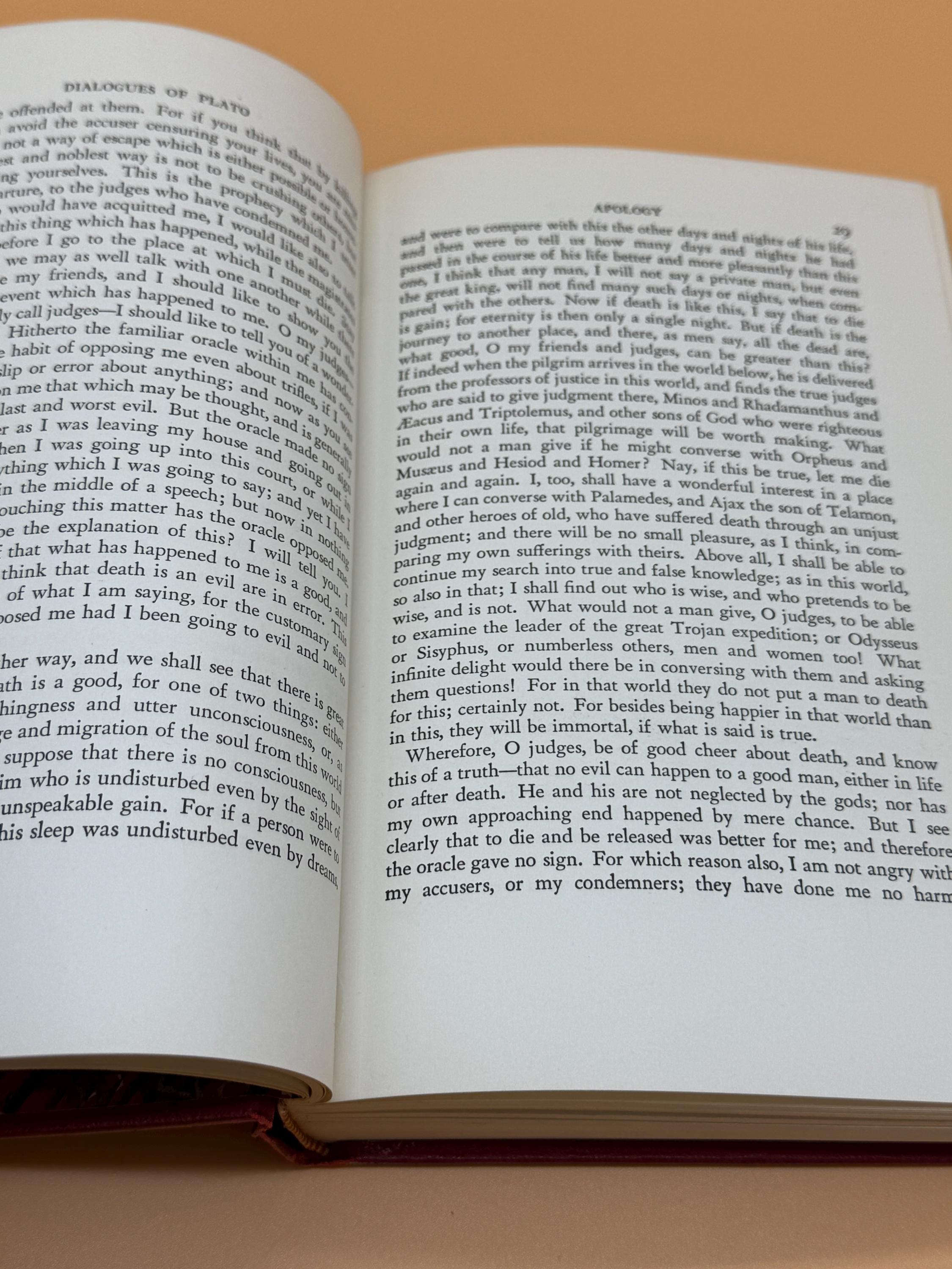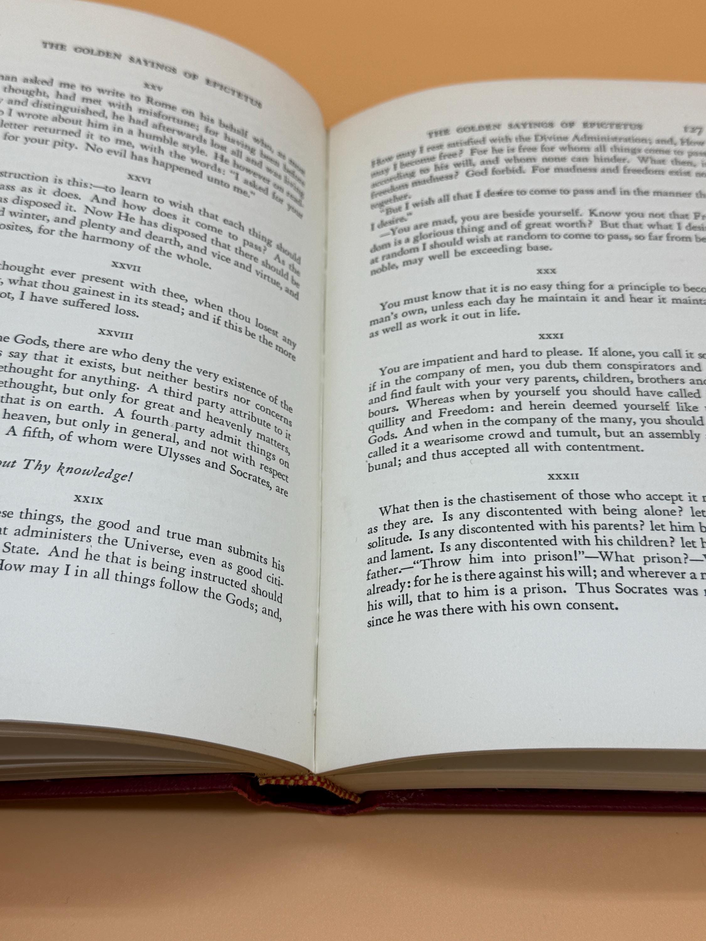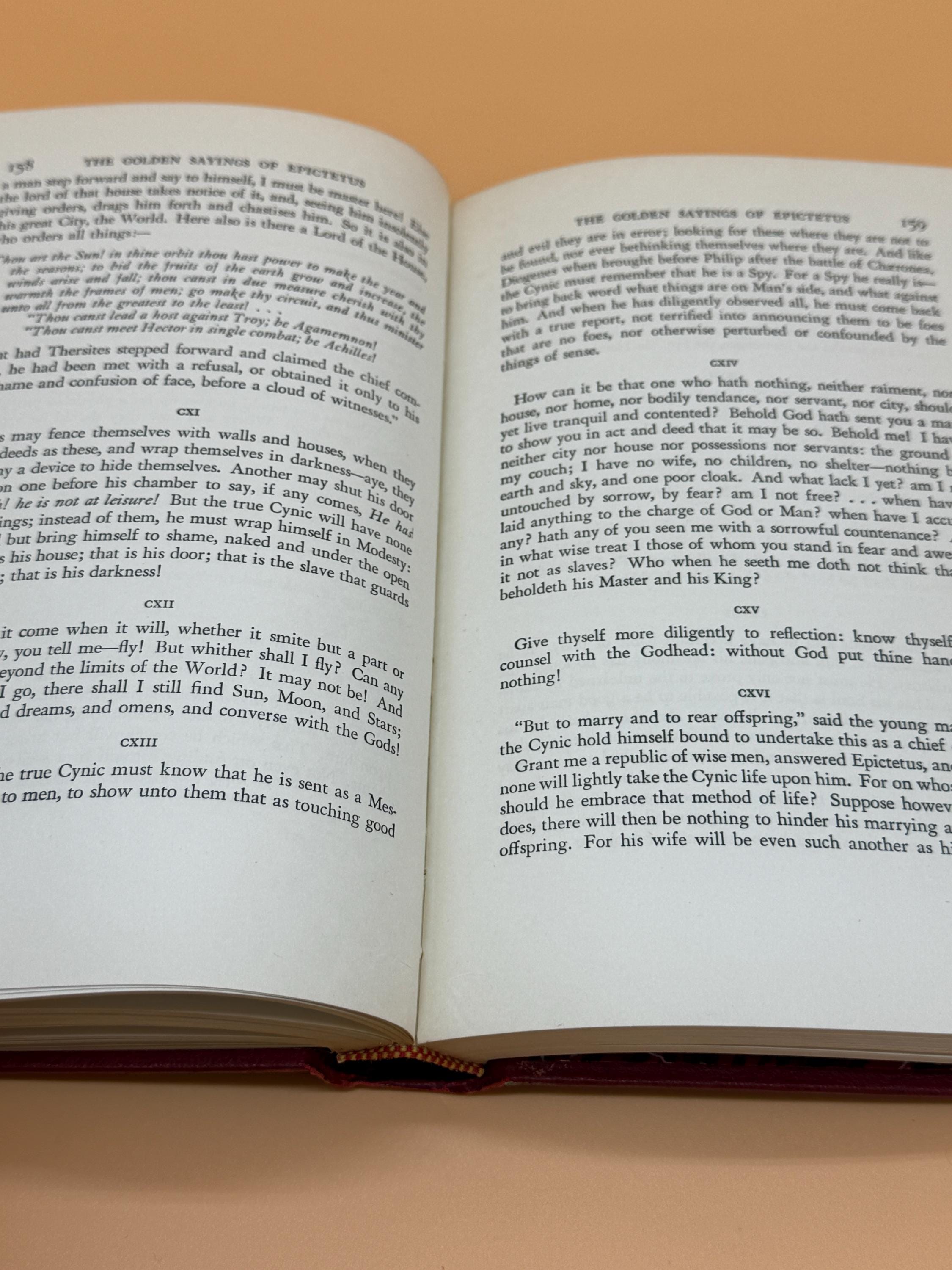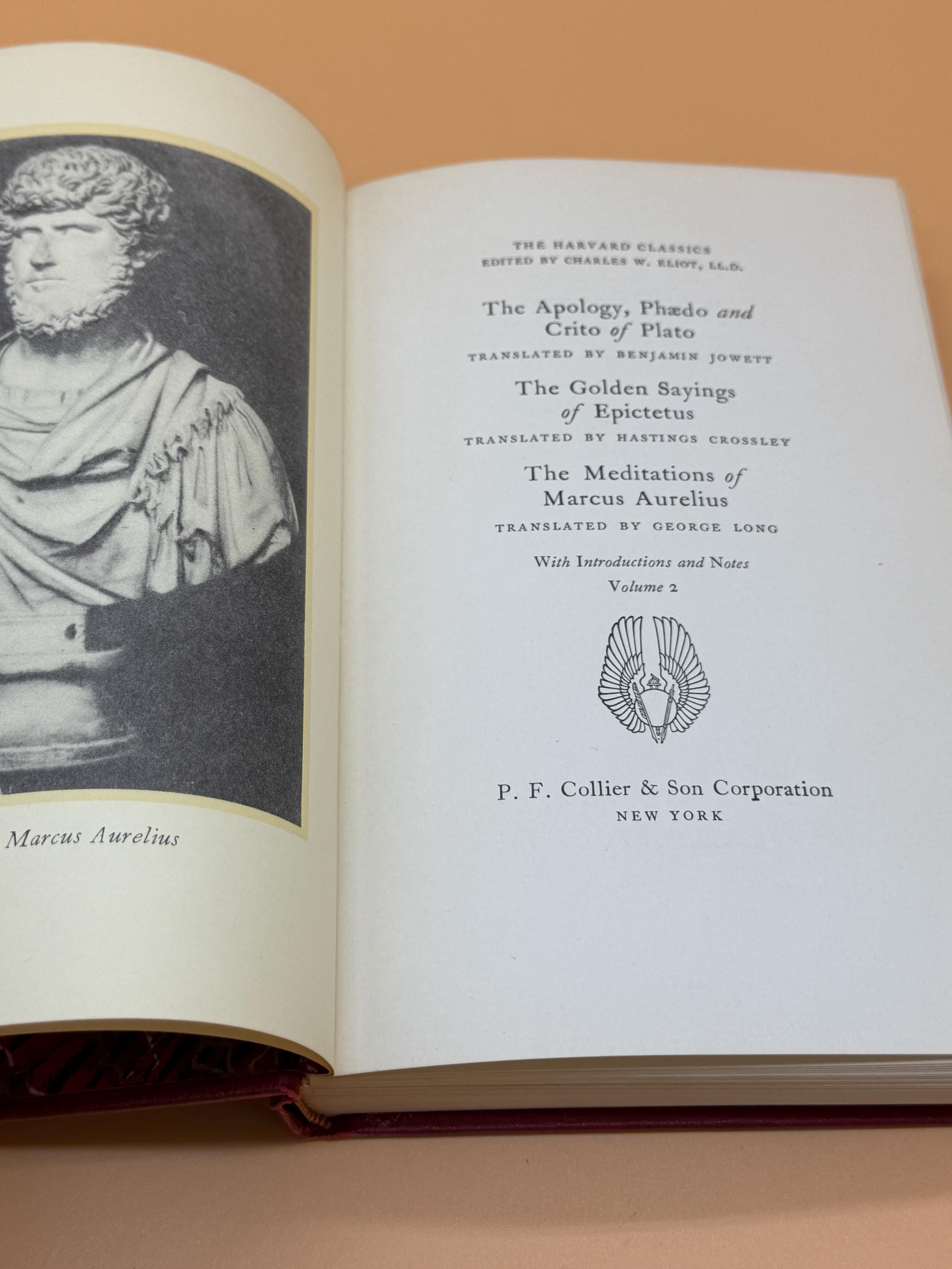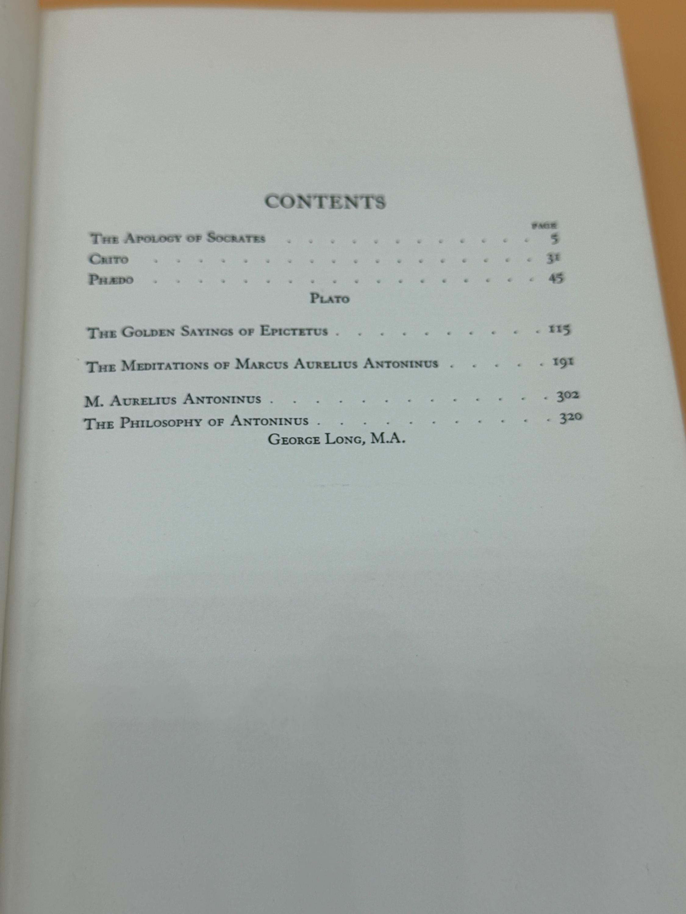 The copy contains: The Apology, Phaedo, and Crito of Plato as translated by Benjamin Jewett, The Golden Sayings of Epictetus translated by Hastings Crossley and The Meditations of Marcus Aurelius as translated by George Long.