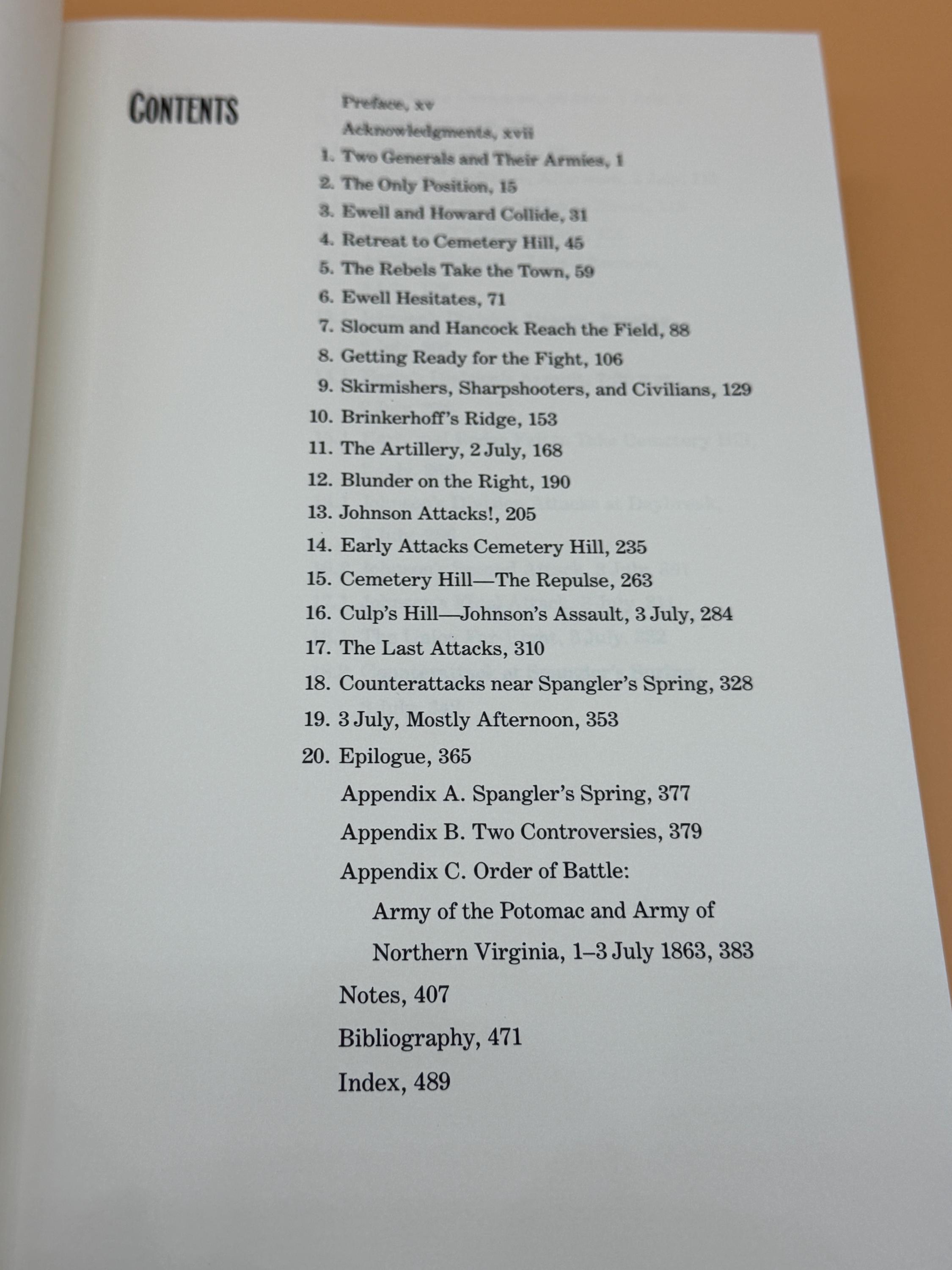 Gettysburg Culp's Hill and Cemetery Hill by Harry W. Pfanz is the companion book to the author's previous book, Gettysburg the Second Day. Gettysburg Culp's Hill and Cemetery Hill provides a definitive account of the battle between The Army of The Potomac and Lee's Army of Northern Virginia at two of the most critical engagements at Gettysburg on July 2nd and 3rd, 1863. There are tactical account of the fighting and the author explores decisions made by both sides. The book also examines including Confederate occupation of Gettysburg, skirmishes at the ends of the town, and the small battle between Union Cavalry and the Stonewall Brigade.