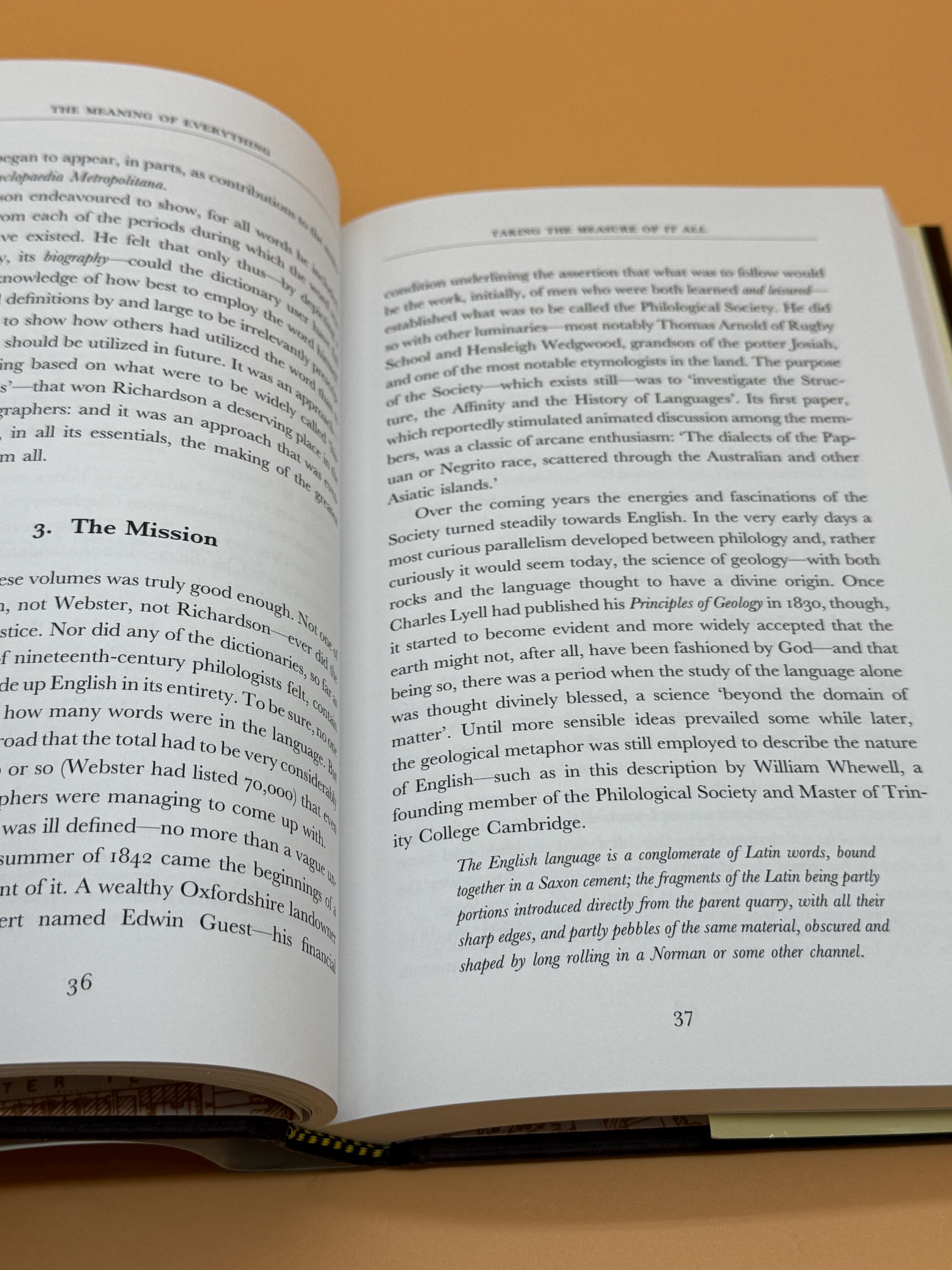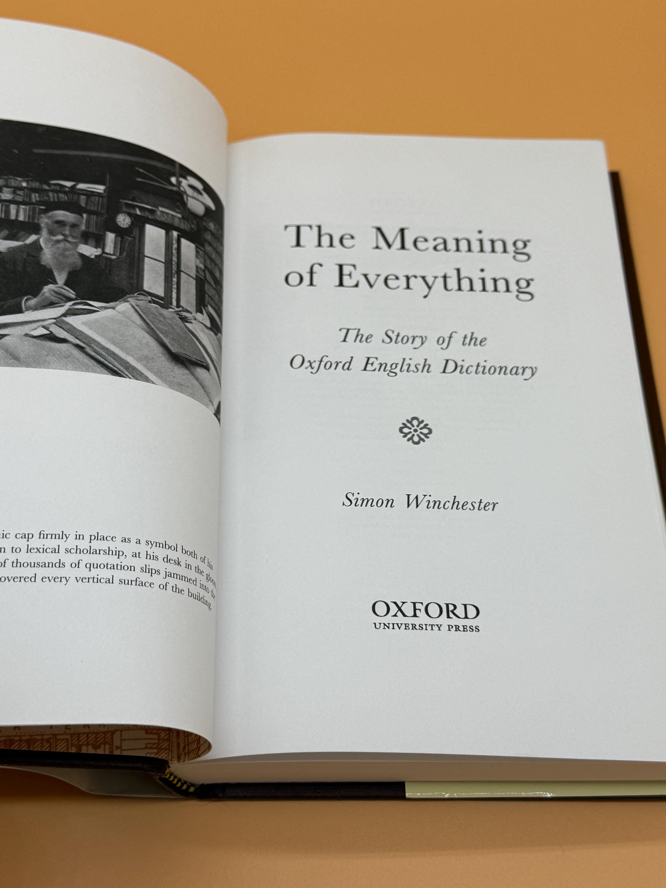 The Meaning of Everything by Simon Winchester is subtitle The Story of the Oxford English Dictionary. The book is an enlightening history of the English language and language history. It pays homage to the great dictionary makers from Samual Johnson to Noah Webster. It is a fascinating narrative of of key figures and the nuts-and-bolts of dictionary making.