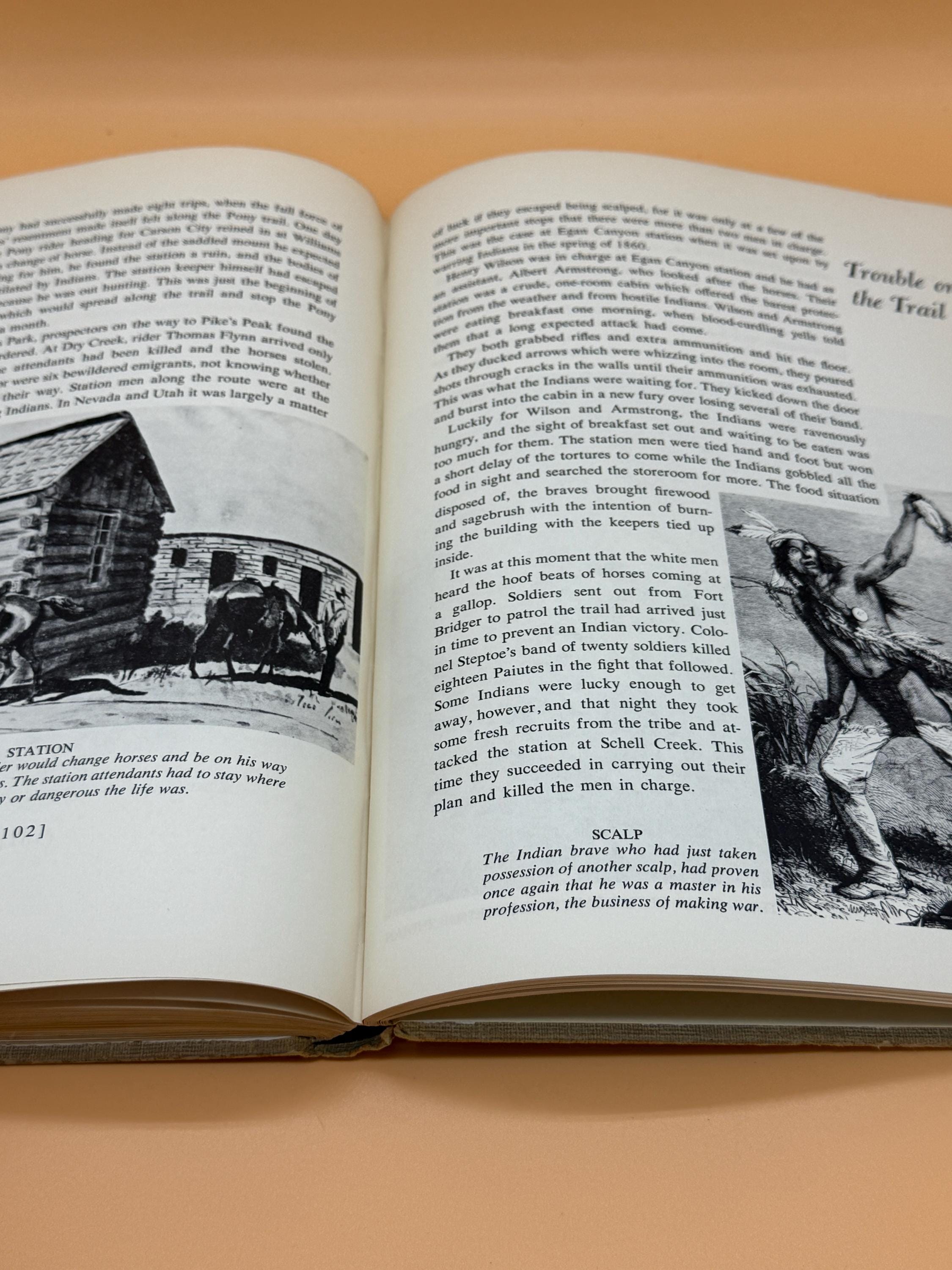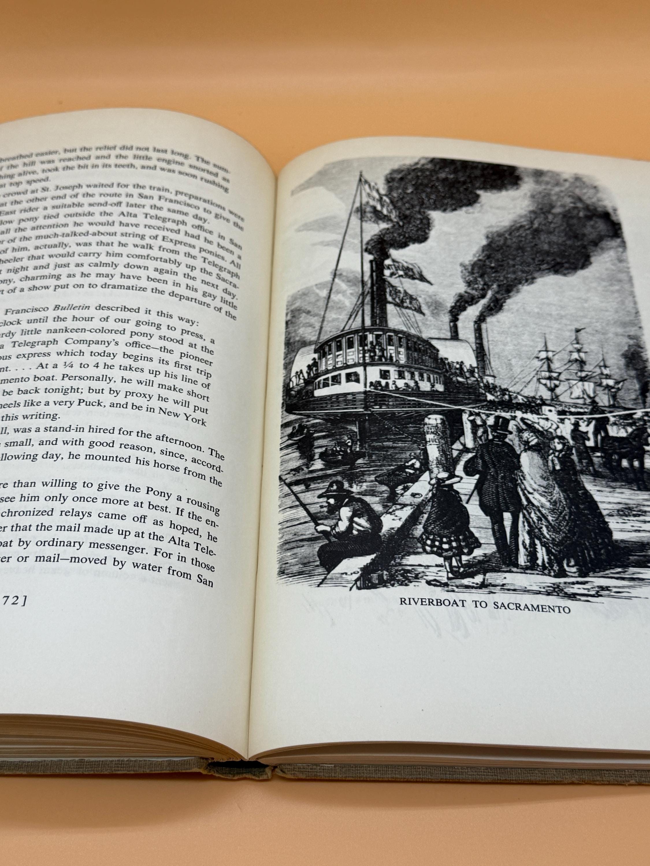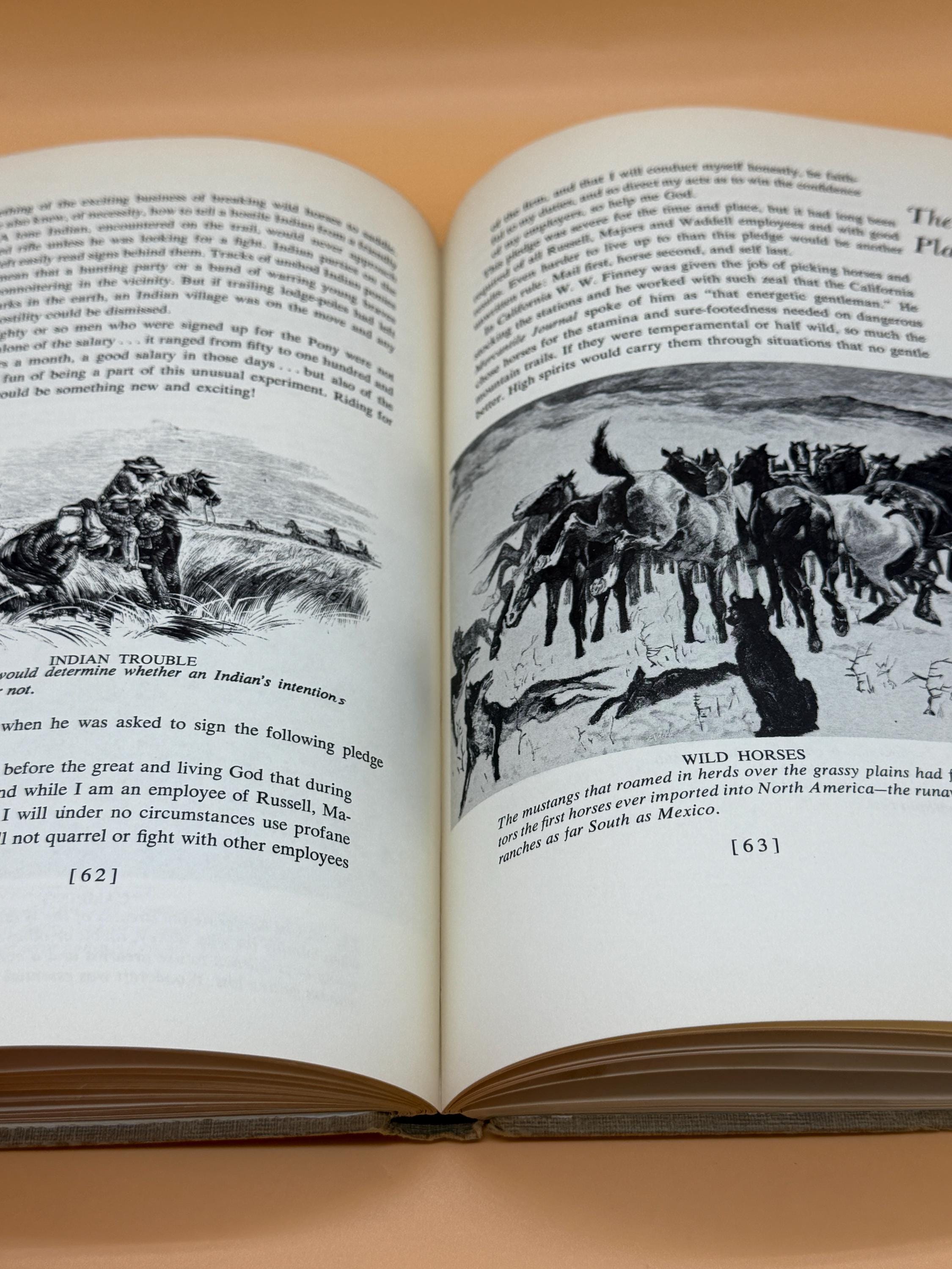 This is a very good hardcover, NO dust jacket jacket missing. 1955 Grosset & Dunlap Publishing. This copy is very good inside and out. The inside pages are very clean and very good. The binding is tight and straight. Tan hardcover boards feature illustration of express rider front with brown title lettering along spine. The hardcover boards are very good BUT there is light fading and light shelf wear mostly to corners/edges. Imperial octavo book size or 8.5" x 11" with 154 pages.
