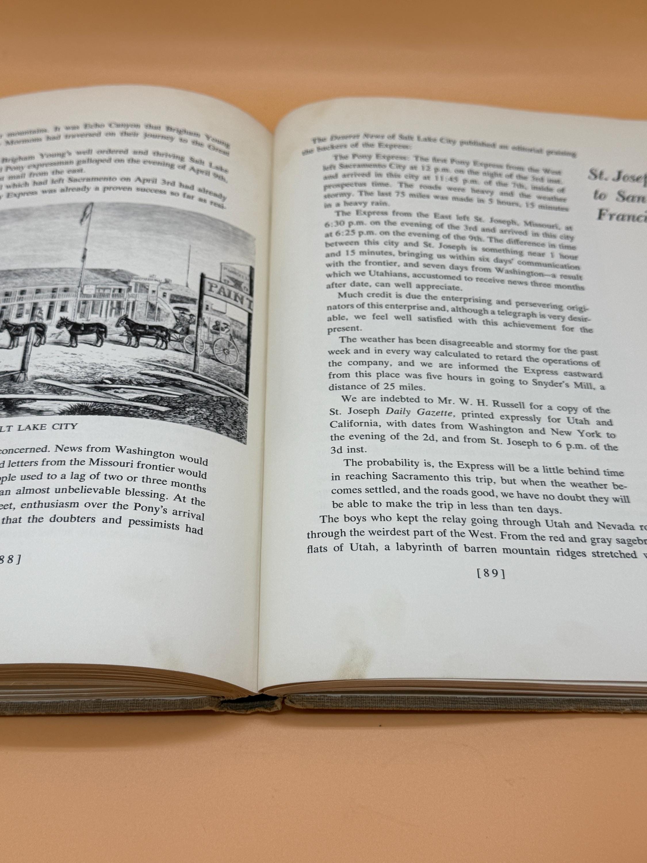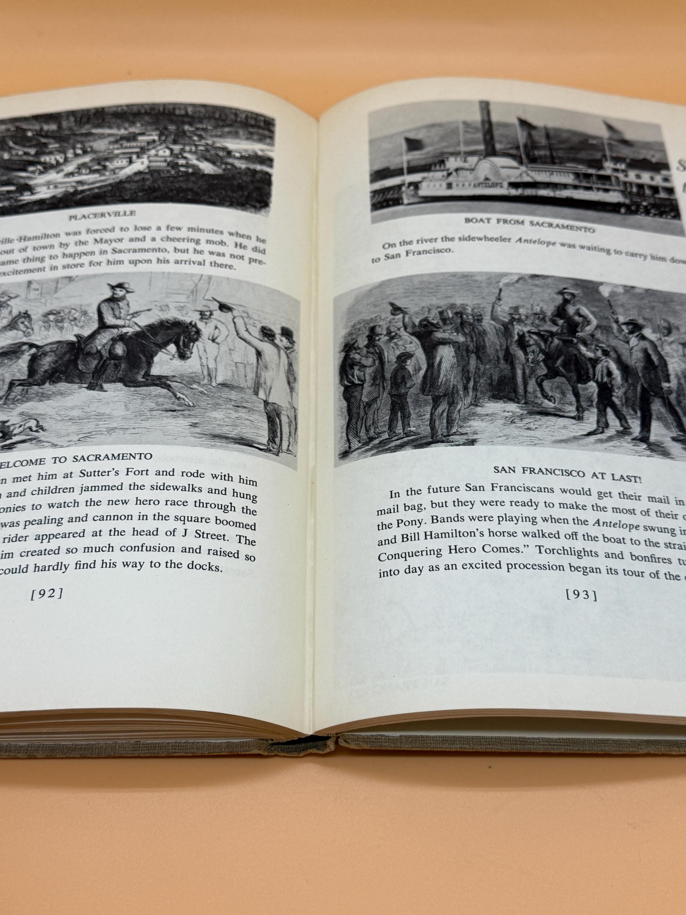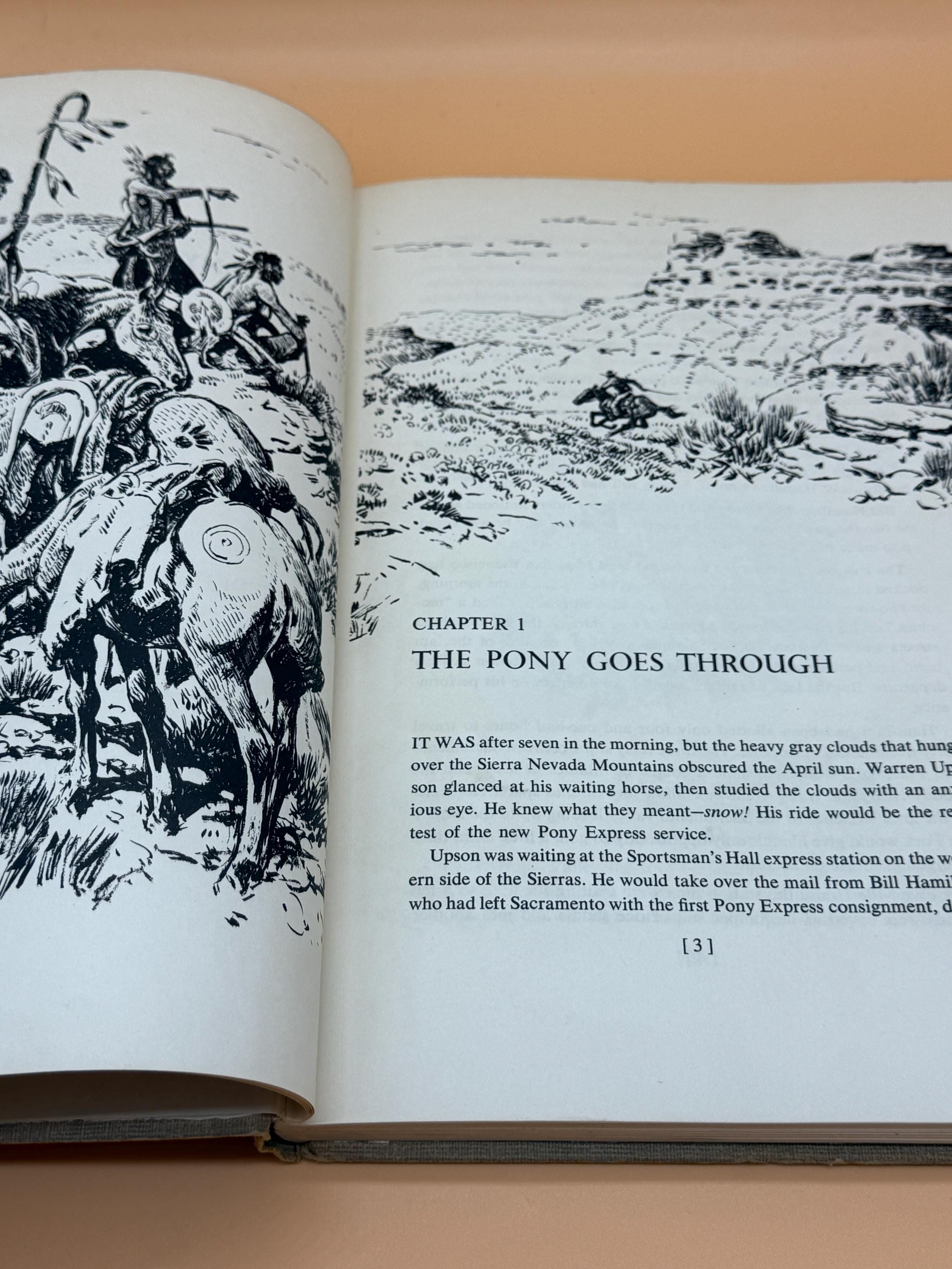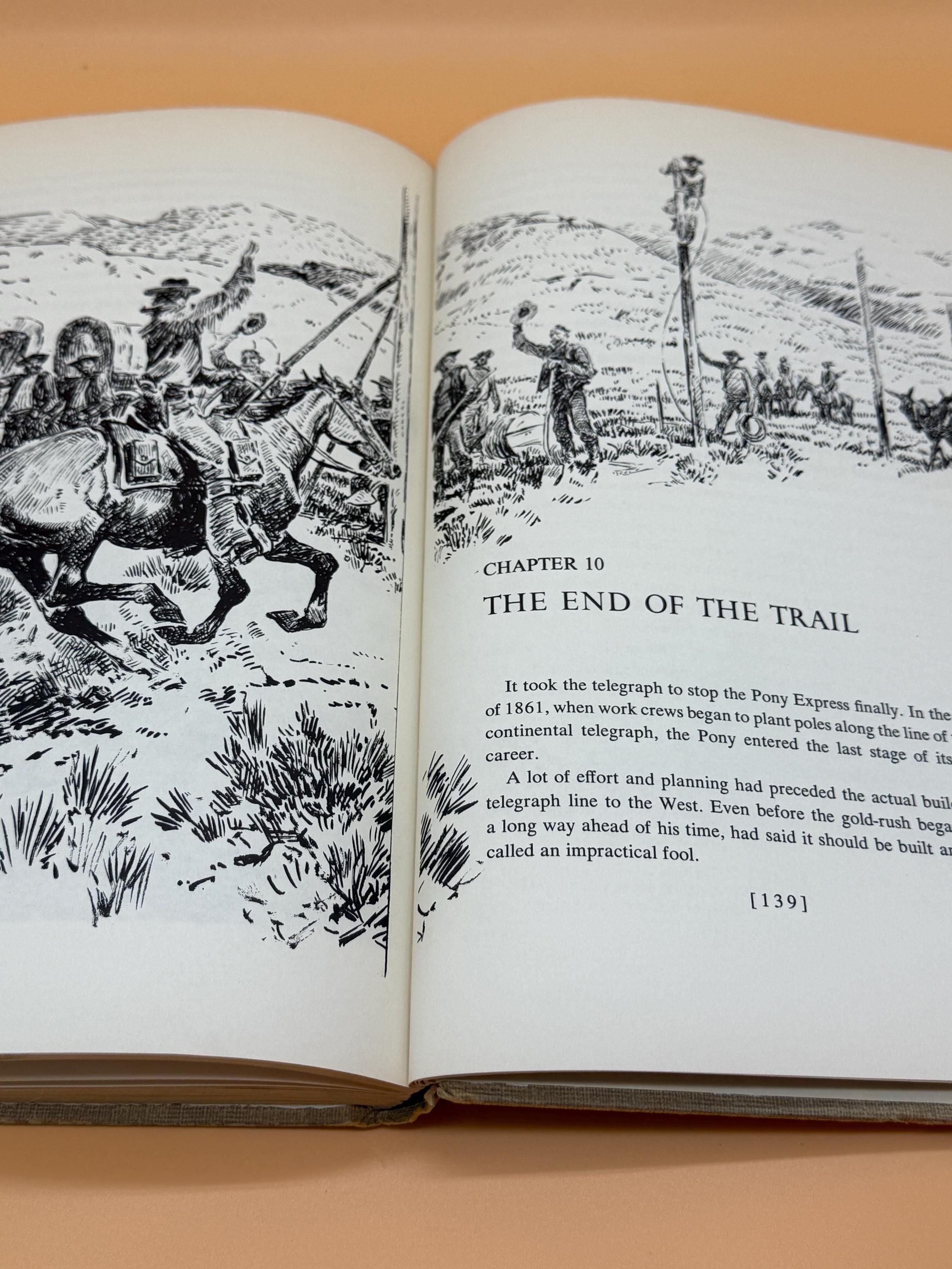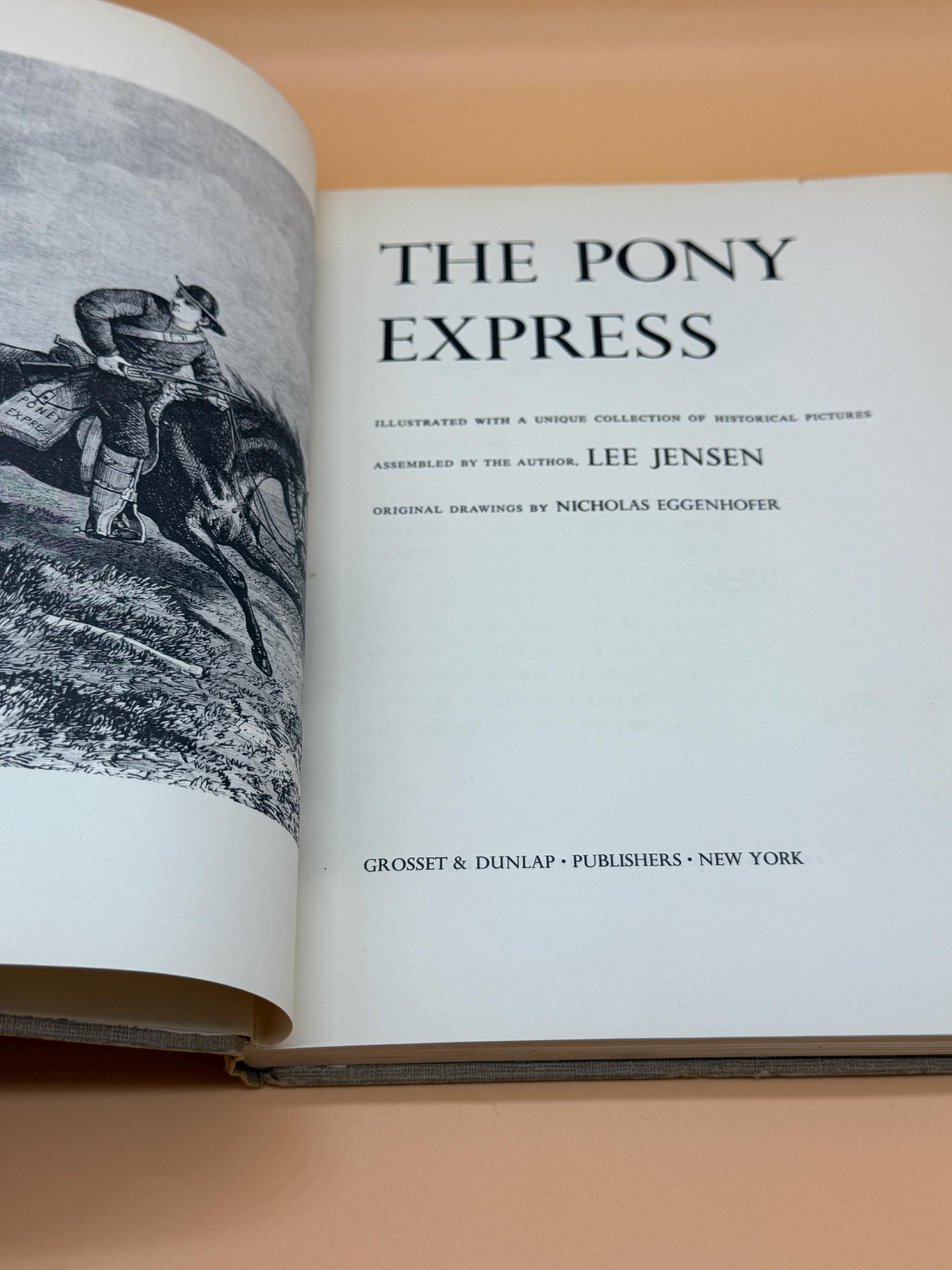 The Pony Express, 1955 Grosset & Dunlap Edition has been assembled by Lee Jensen with a collection of historical illustrations by Nicholas Eggenhofer. The book chronicles the history of the pony express from the beginnings to the end of the trail. It is extensively illustrated with historical pictures to bring the history and story to life.