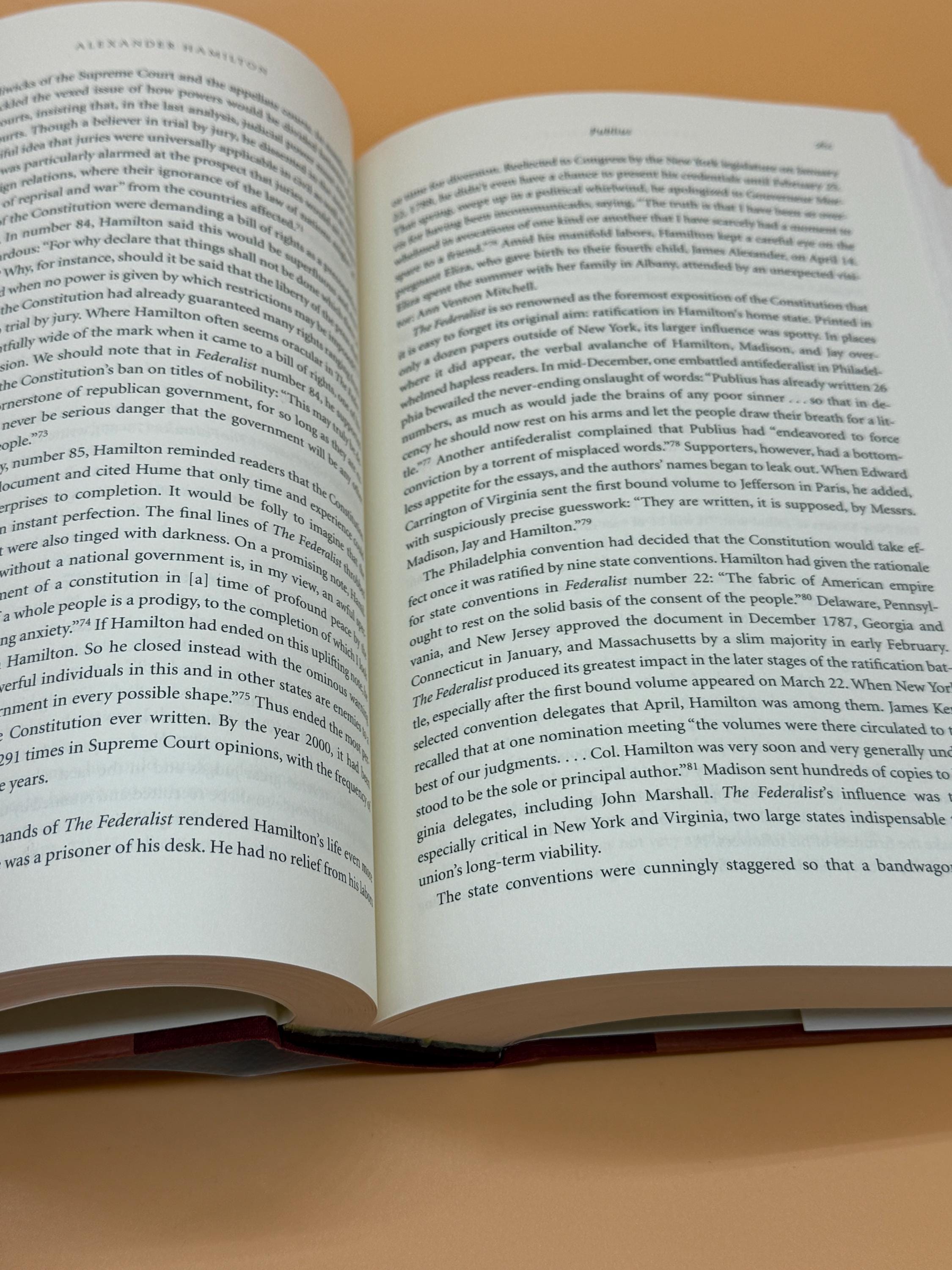 Alexander Hamilton by Ron Chernow is a towering biography that presents a fully rounded portrait of Hamilton. Rich portraits of Hamilton's peers are included such as Washington, Adams, Madison, Monroe and Burr. The biography tells how Hamilton rose with stunning speed to become Washington's aide-de-camp, battlefield hero, member of the Constitutional Convention, and head of the Federalist Party. The book blends Hamilton's private and public life in a complete portrait.