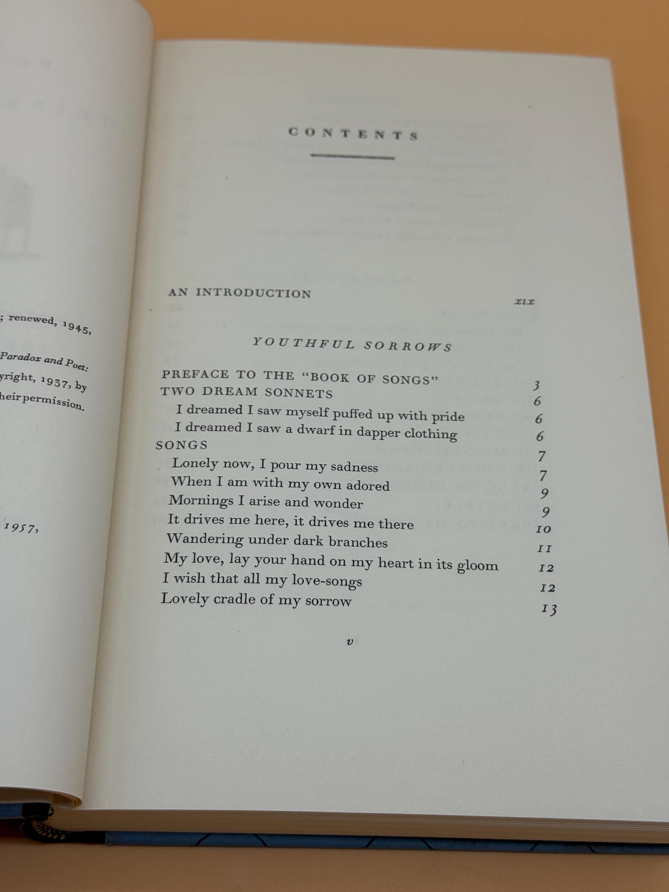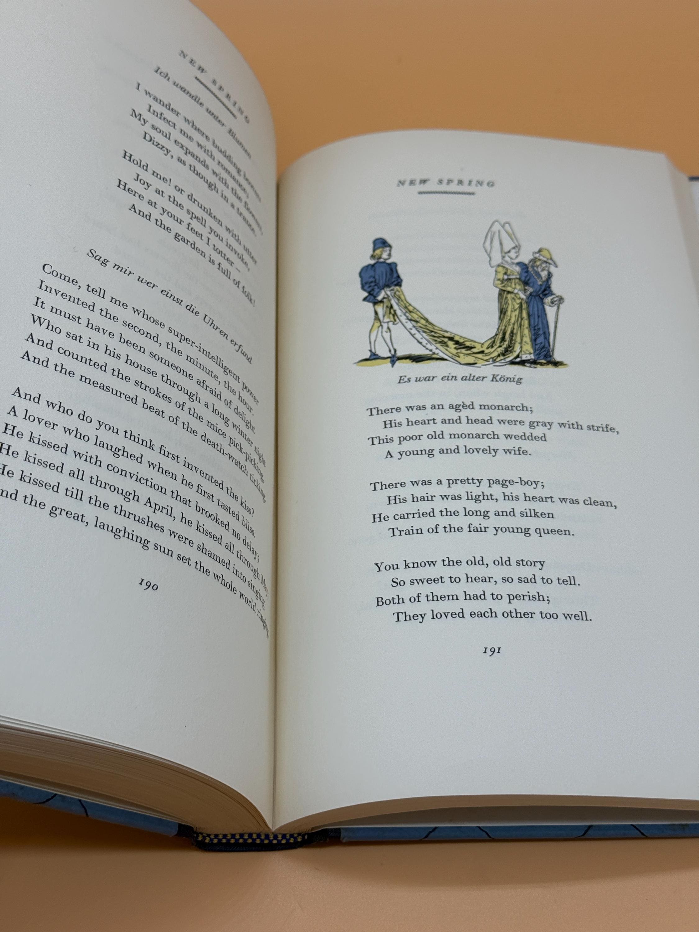 This is a very good hardcover with accompanying slipcase. 1957 Heritage Press. This copy is very good inside and out. The pages inside are very good and clean. The binding is tight and straight. Blue hardcover boards feature author initials design front with gold lettering along spine and are very good with only very light shelf wear. The accompanying blue slipcase is very good with light fading along top edges and light shelf wear but overall clean and solid. Medium octavo book size or 6.5" x 9.5" with 297 pages including index of first lines.