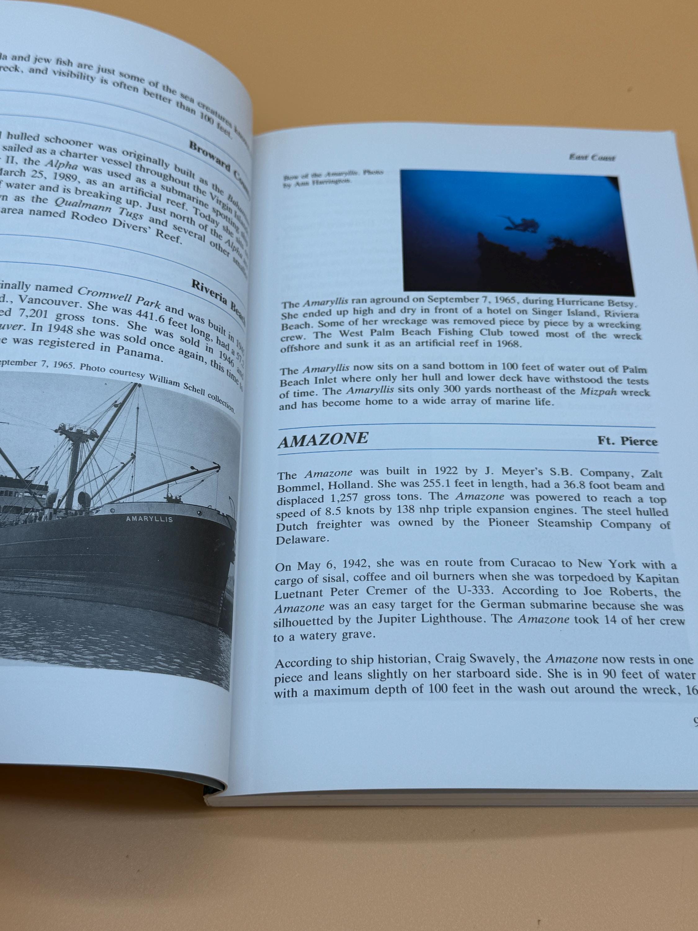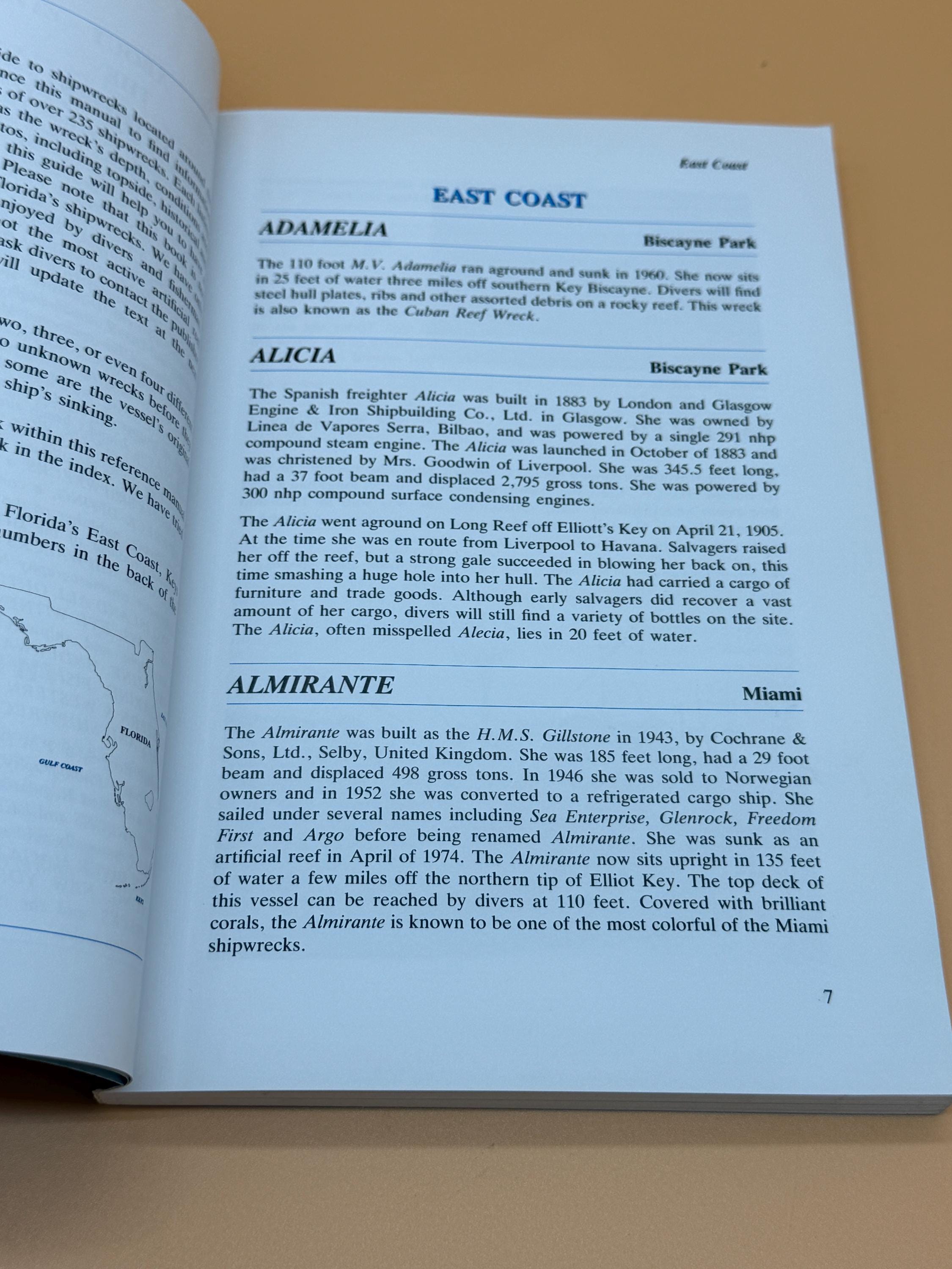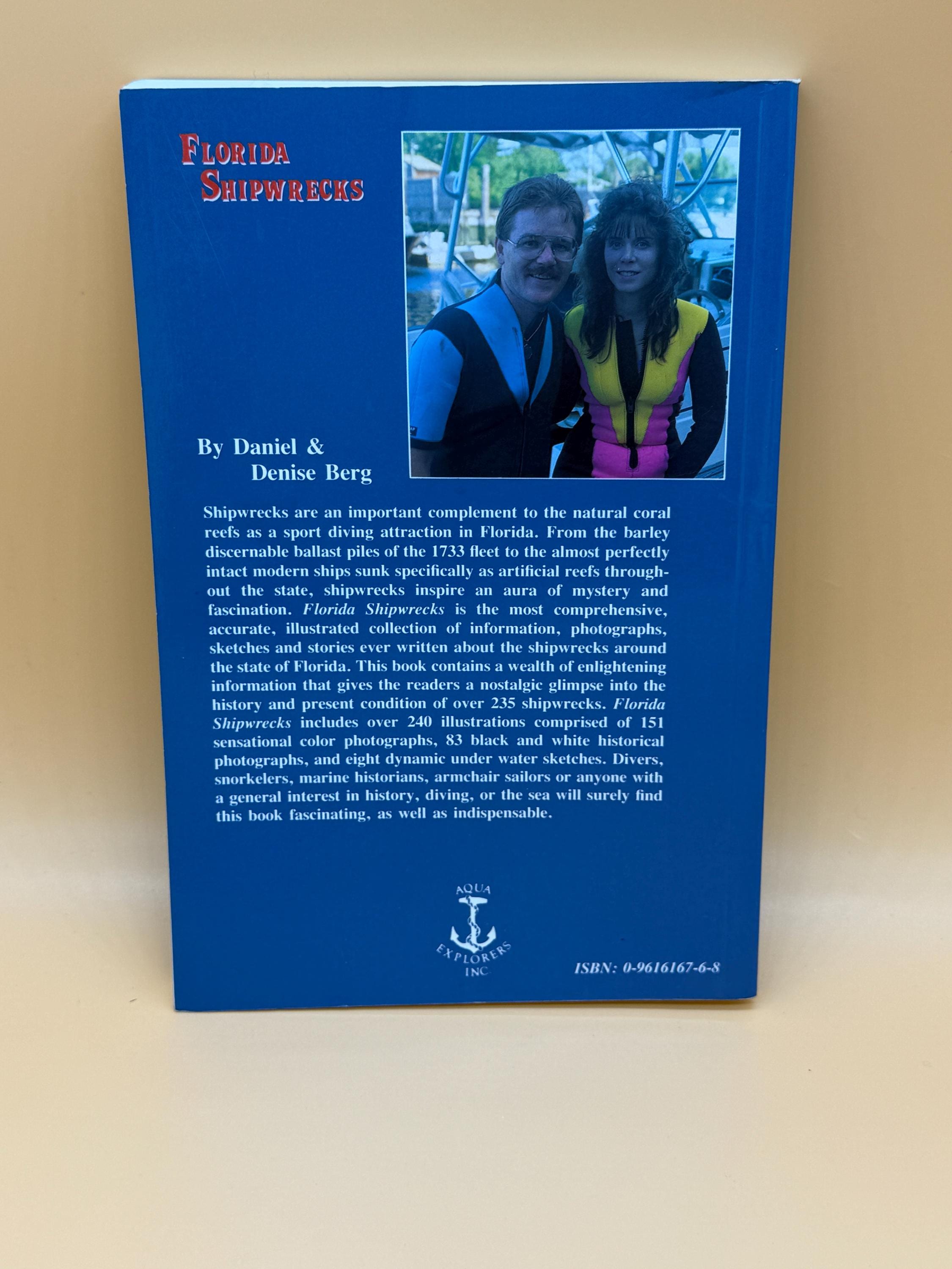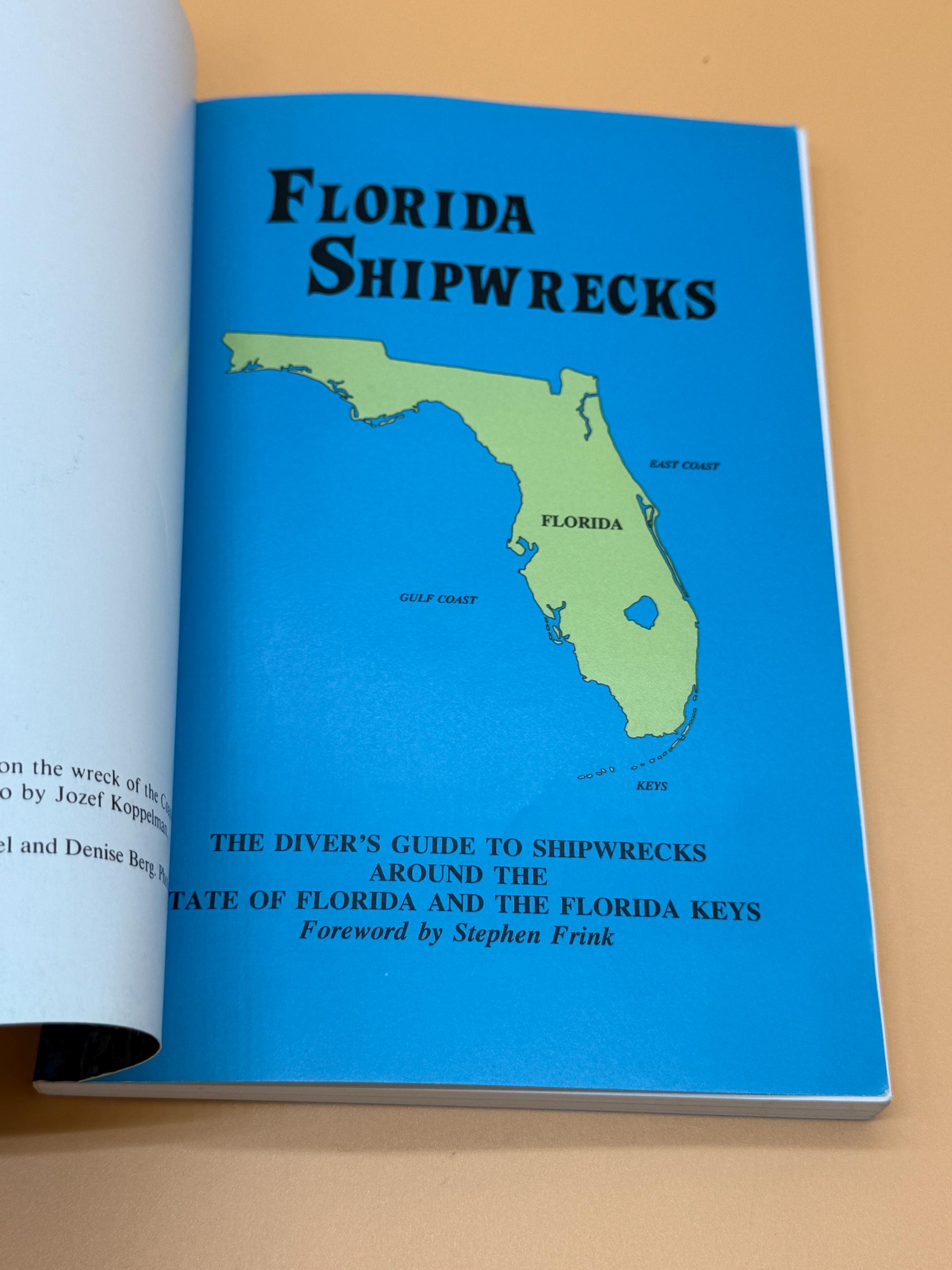 Florida Shipwrecks by Daniel & Denise Berg is subtitled The Diver's Guide to Shipwrecks Around the State of Florida and The Florida Keys. It includes a foreword by Stephen Frink. The book is an illustrated guide with photos, sketches and detailed text in the history and condition of over 235 shipwrecks. There are over 240 illustrations which include 151 color photos and 83 historical vintage black and white photos.