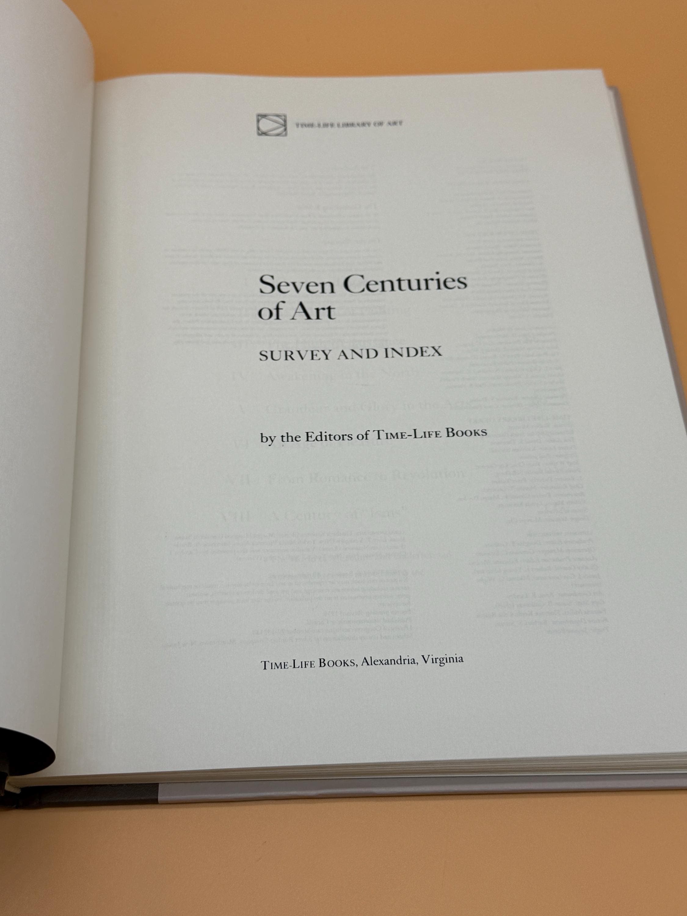 Seven Centuries of Art Survey and Index from the Time Life Library of Art is a history of art over the centuries. Chapters include; Of Style and Styles, The Rebirth of Painting, The High Renaissance, Awakening in the North, Grandeur and Glory in the Arts, An Age of Pleasure, From Romance to Revolution, and A Century of "Isms".