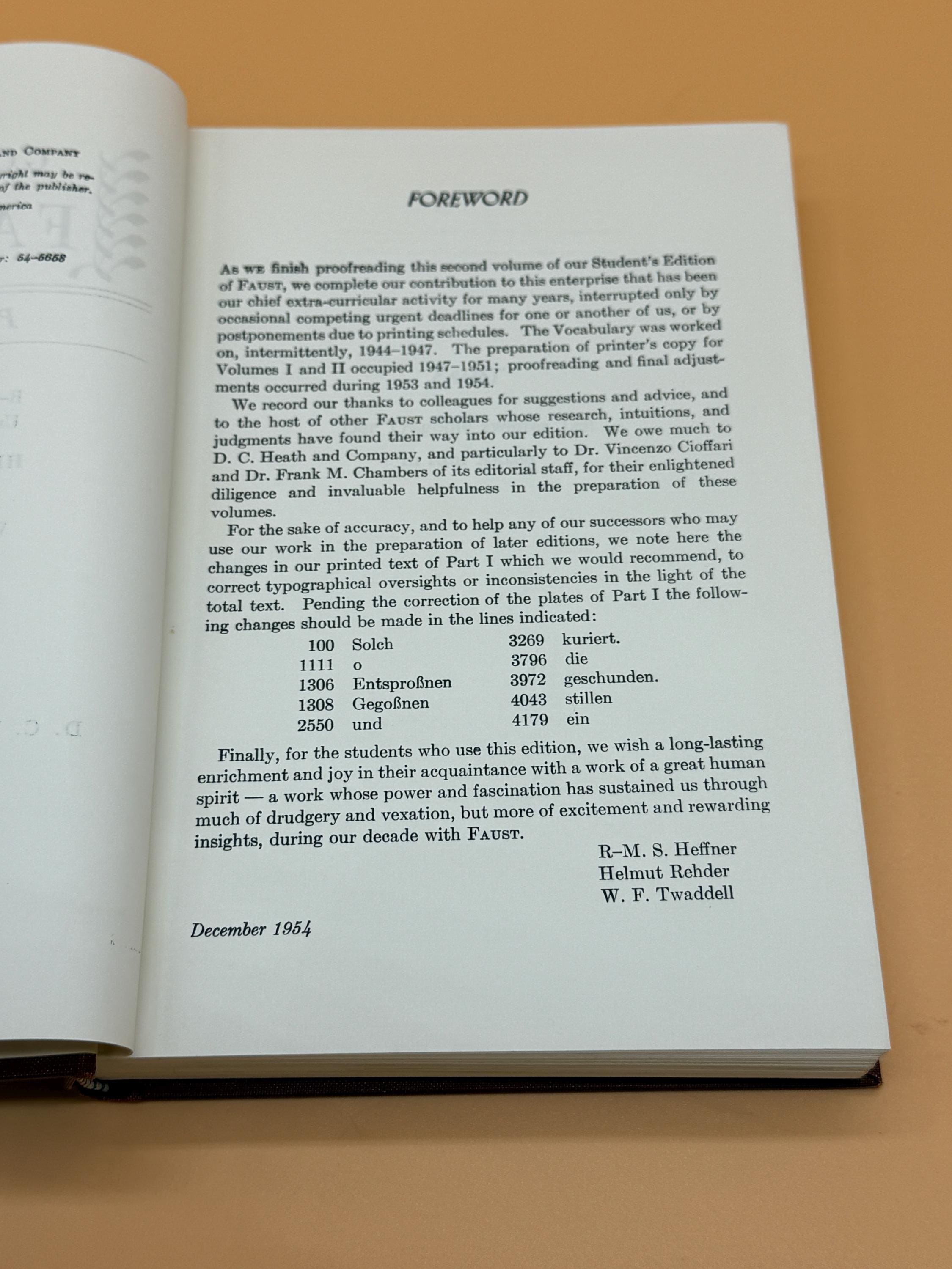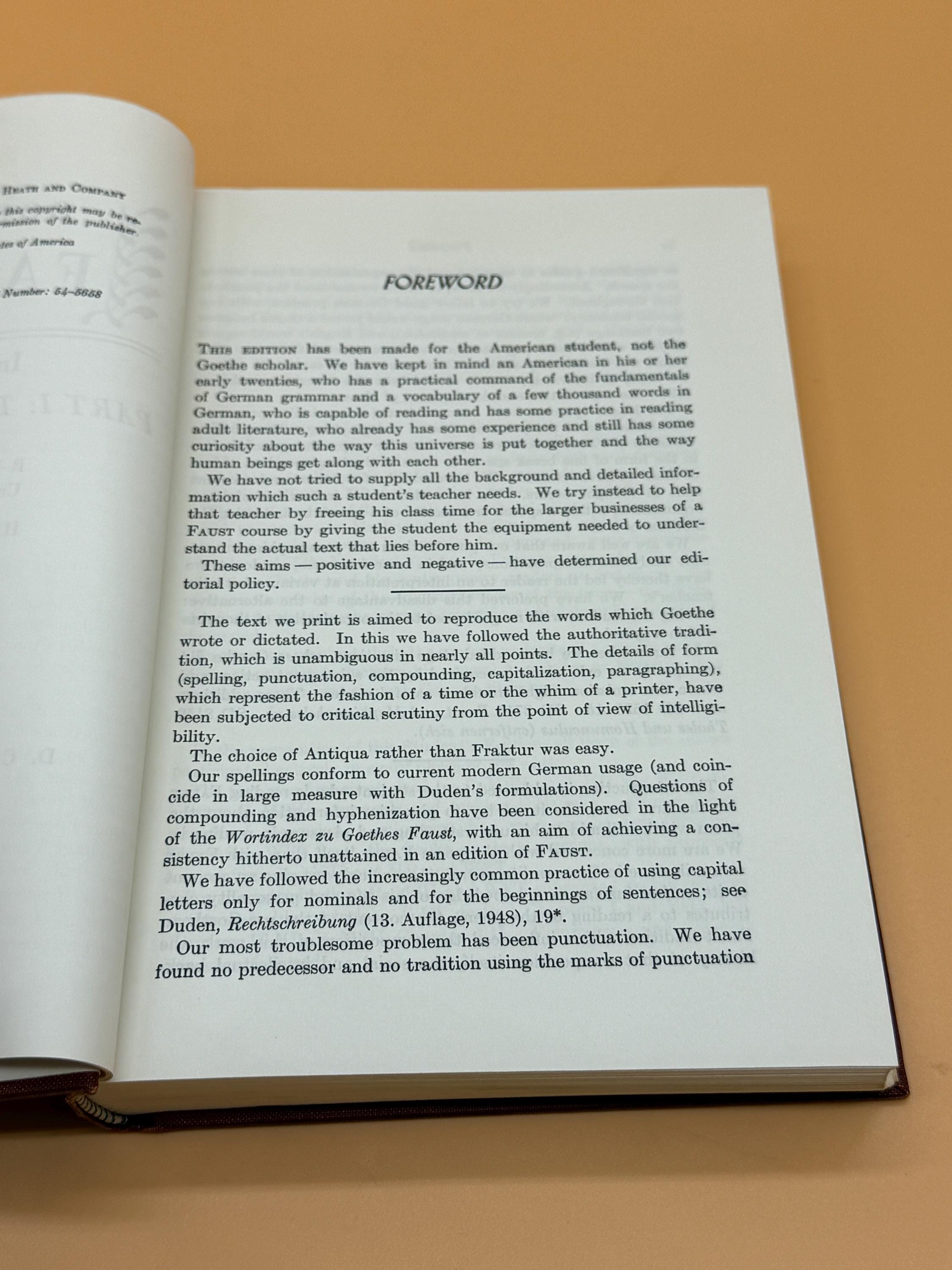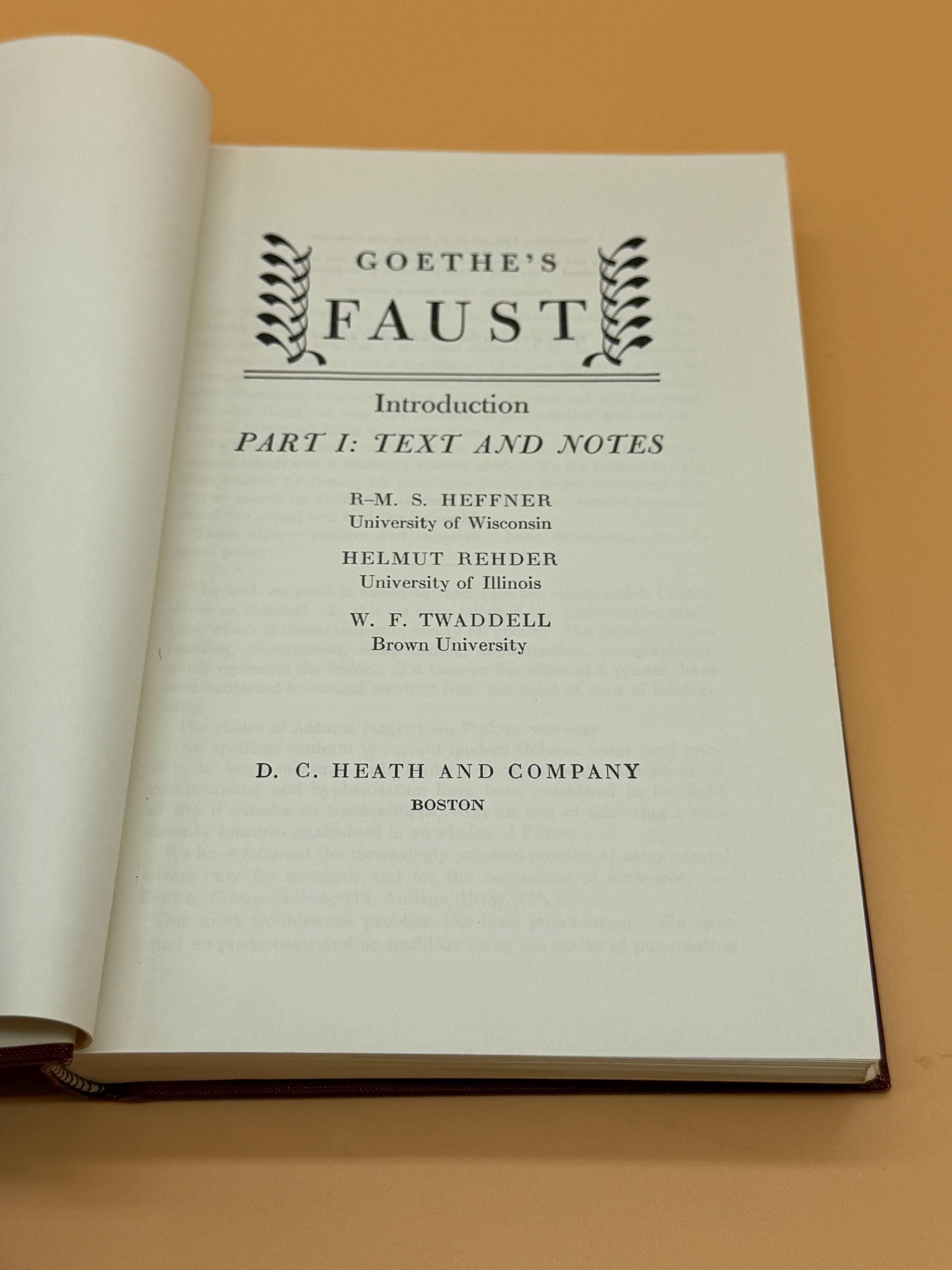 This is a very good 2 volume set of hardcovers. 1954 D.C. Heath Publishing. GERMAN text edition, with Intro Text and Notes in English as designed for students with basic German language skills. Each volume in this set is very good inside and out. The pages are very good and clean inside. The binding on both is tight and straight. Brick red hardcover boards are also very good with only light shelf wear. Each value is crown octavo book size or 5" x 8"