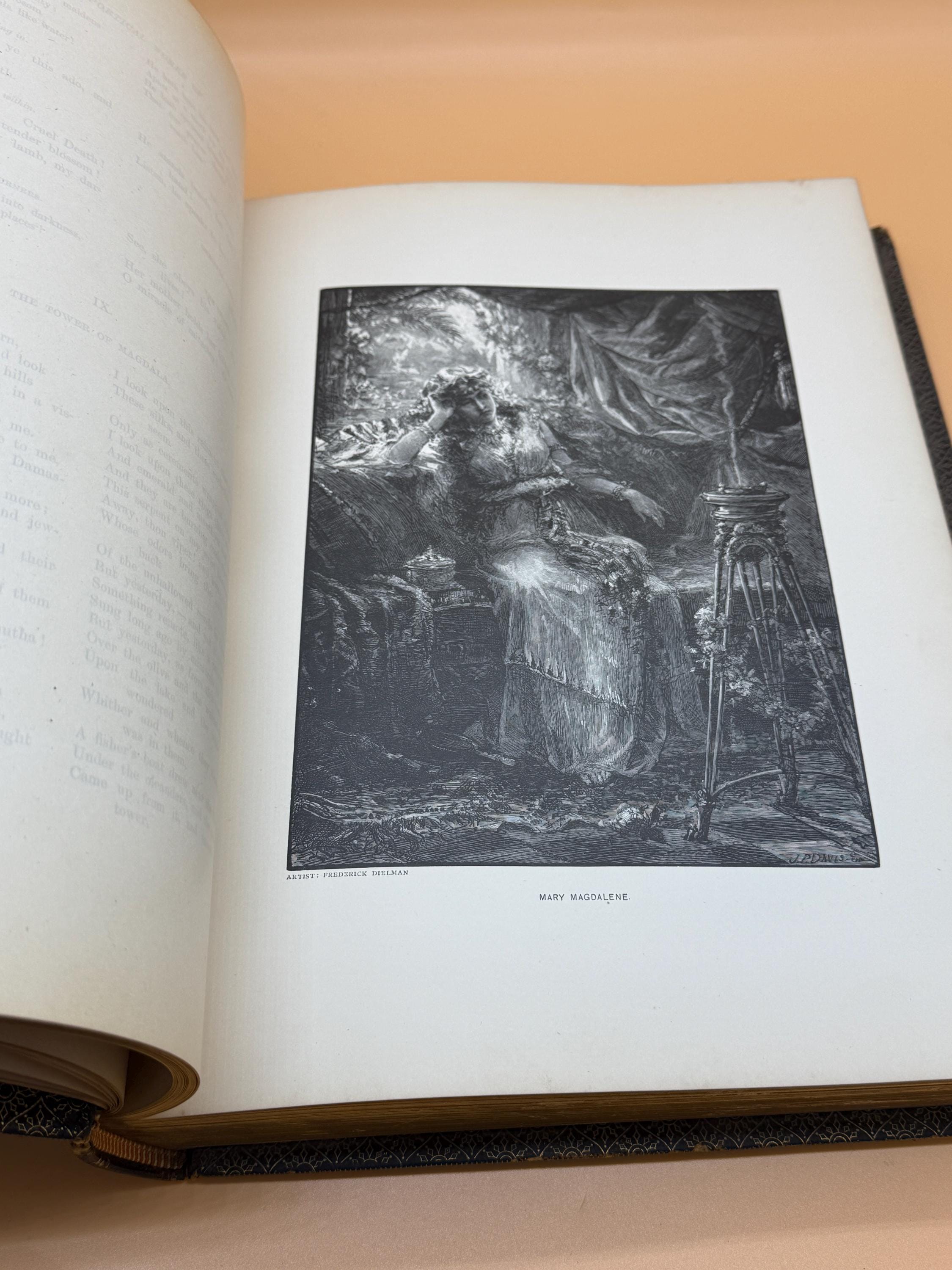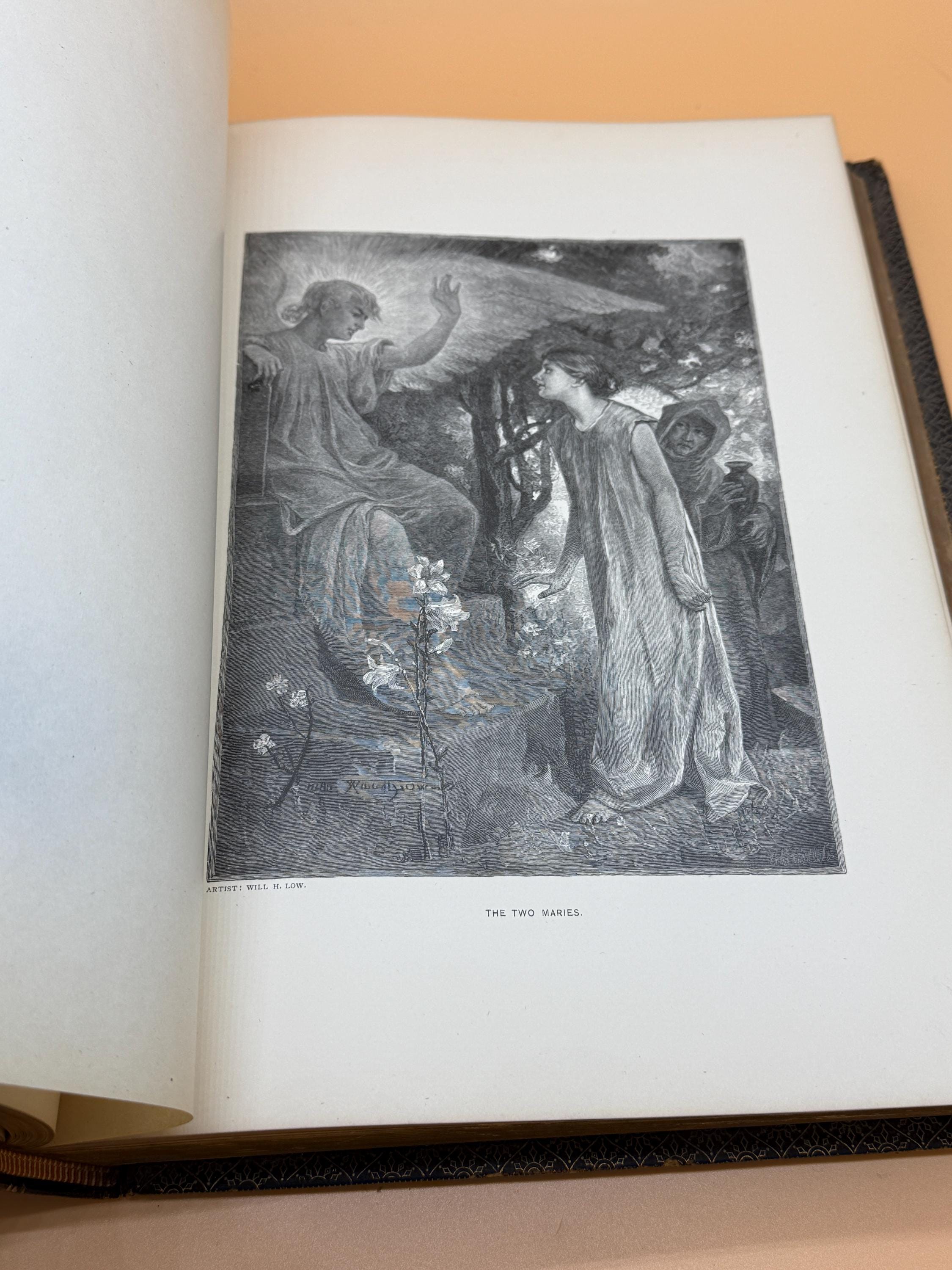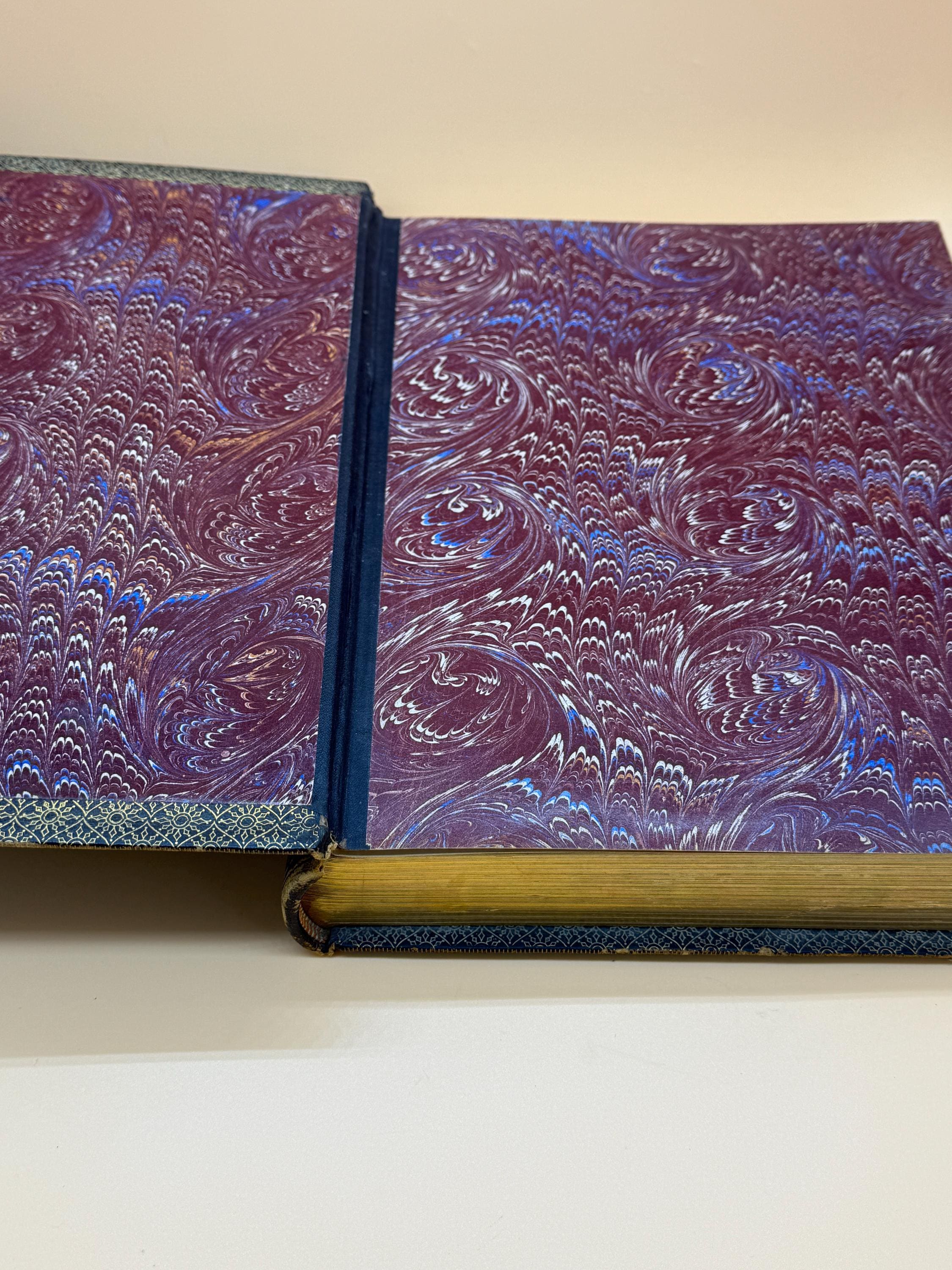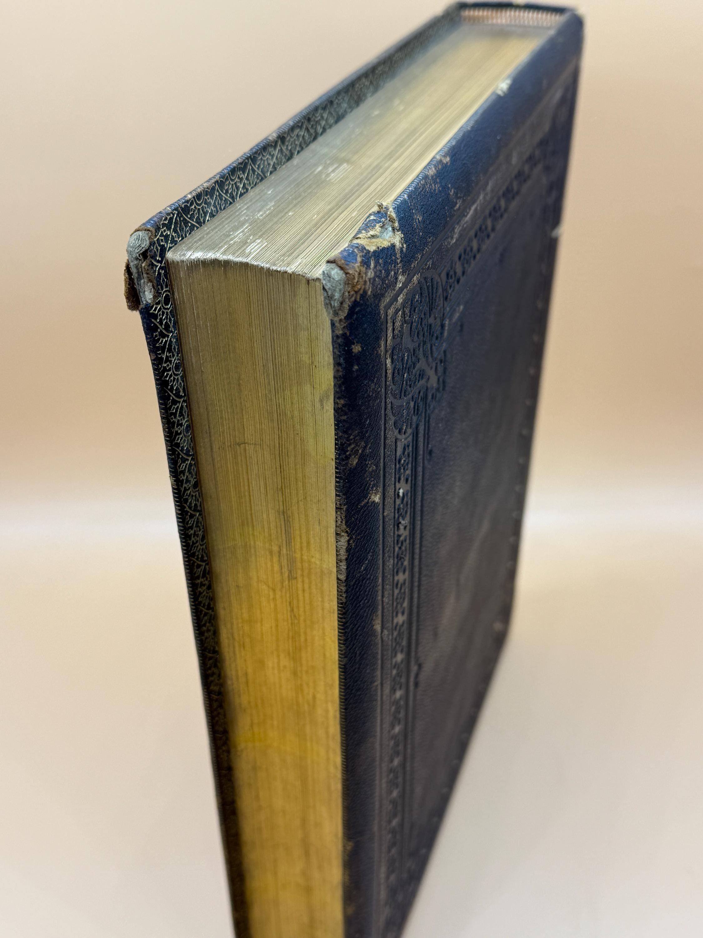This is a good, large hardcover bound in leather. 1882 Riverside Press, Houghton Mifflin Publishing. VOLUME TWO ONLY. This copy is good and solid inside and out. On first blank page, previous owners name neatly written in script, "F.B. Wiley New York City No 130". There is light natural tanning to pages from age but they are very good and clean. Bound in leather, there is wearing to the cover as shown in photos. Most wearing is along corners/edges. Embossed design front and back with gold title lettering front which is very good, intact and clear. Hubbed spine accents the fine binding. All three page edges tipped in gold gilt. This is a large coffee table style book, quarto book size or 9" x 13" with 439 pages.