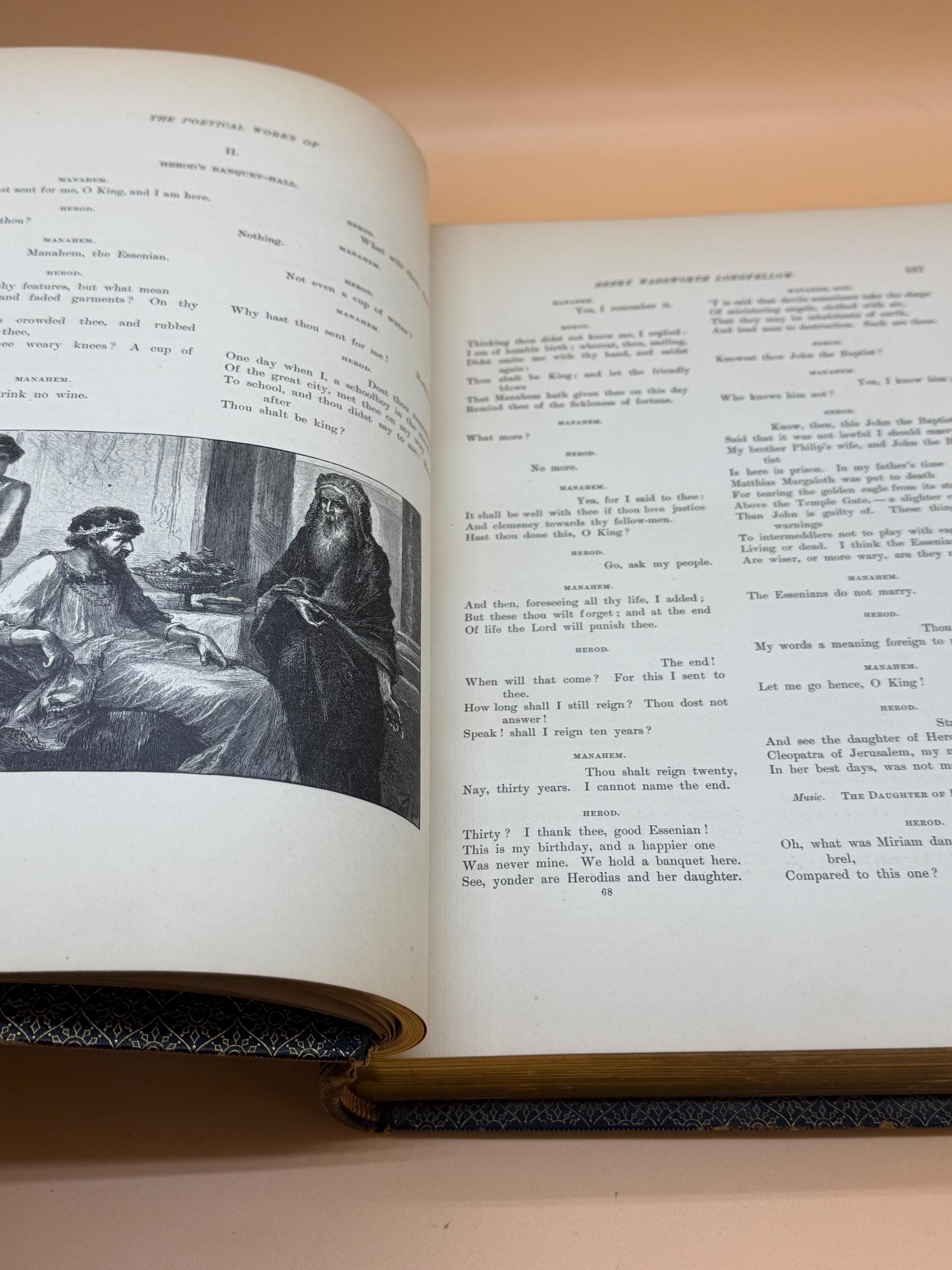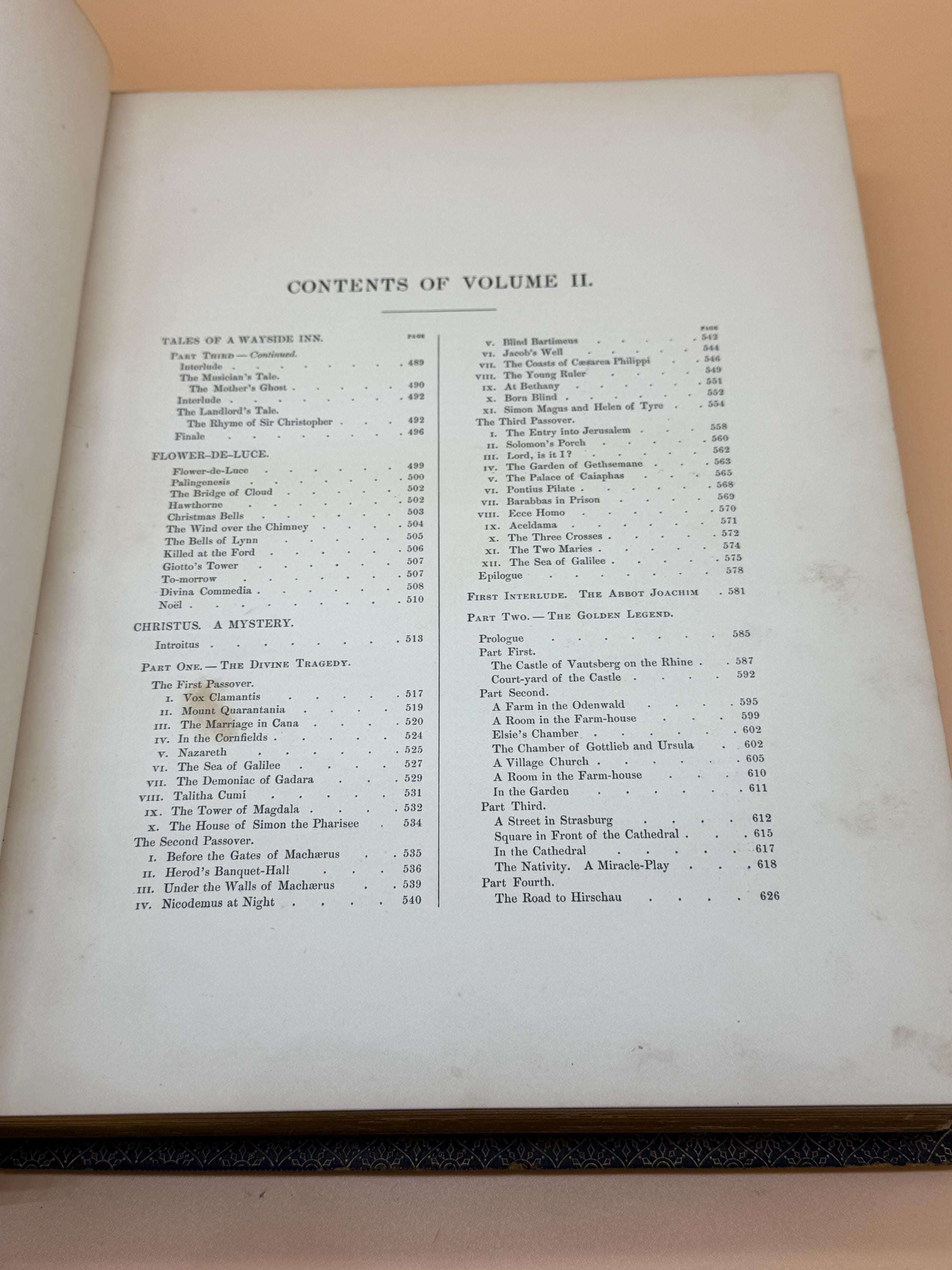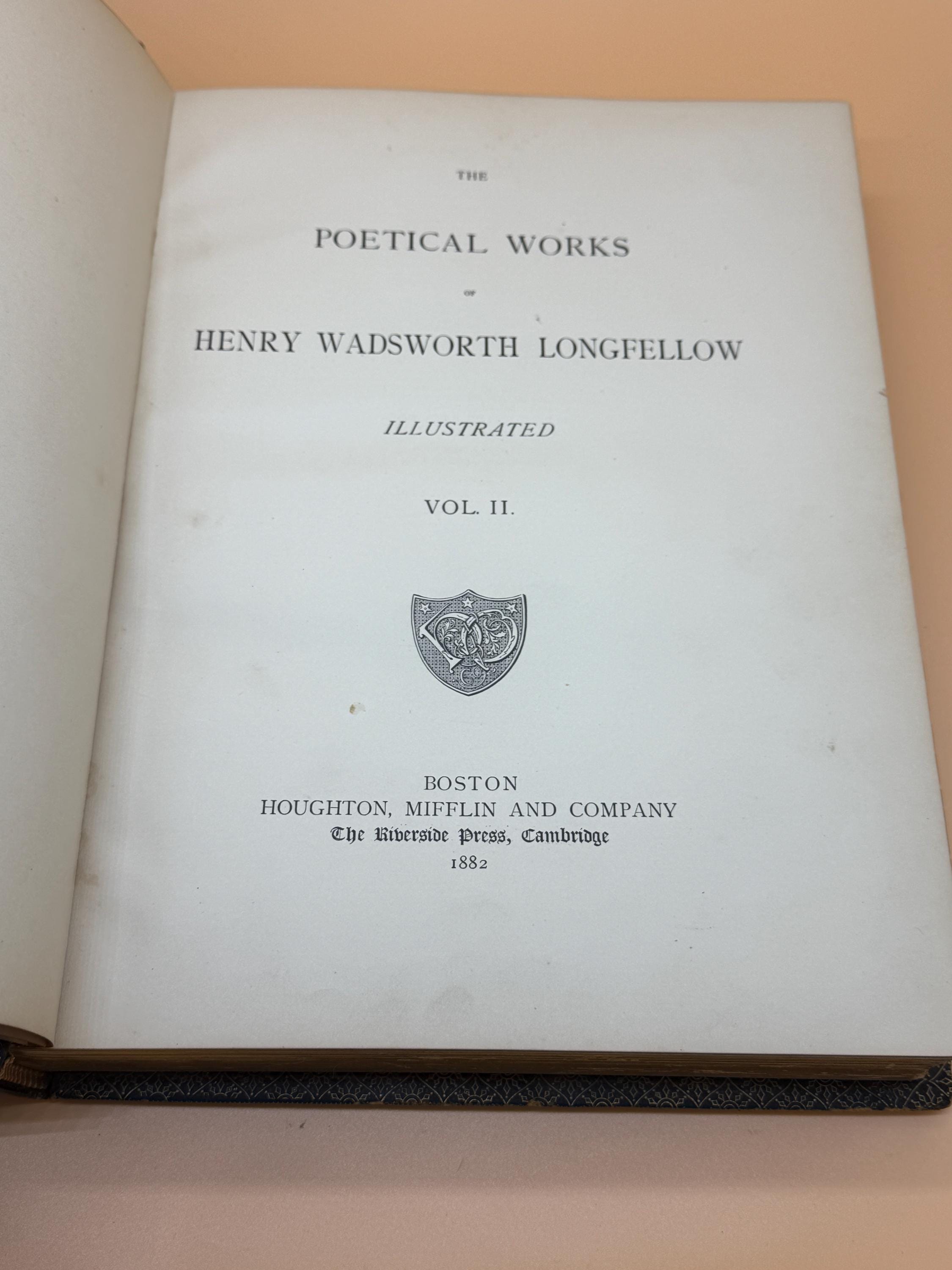 Originally published in 1882 as a two volume set, this is VOLUME TWO ONLY from Houghton Mifflin Riverside Press. The book is finely and extensively illustrated throughout by various artists. Volume Two picks up where Volume One left off with Tales of a Wayside Inn Concluded. The volume includes notes and index. It features marbled endpapers and reenforced binding.