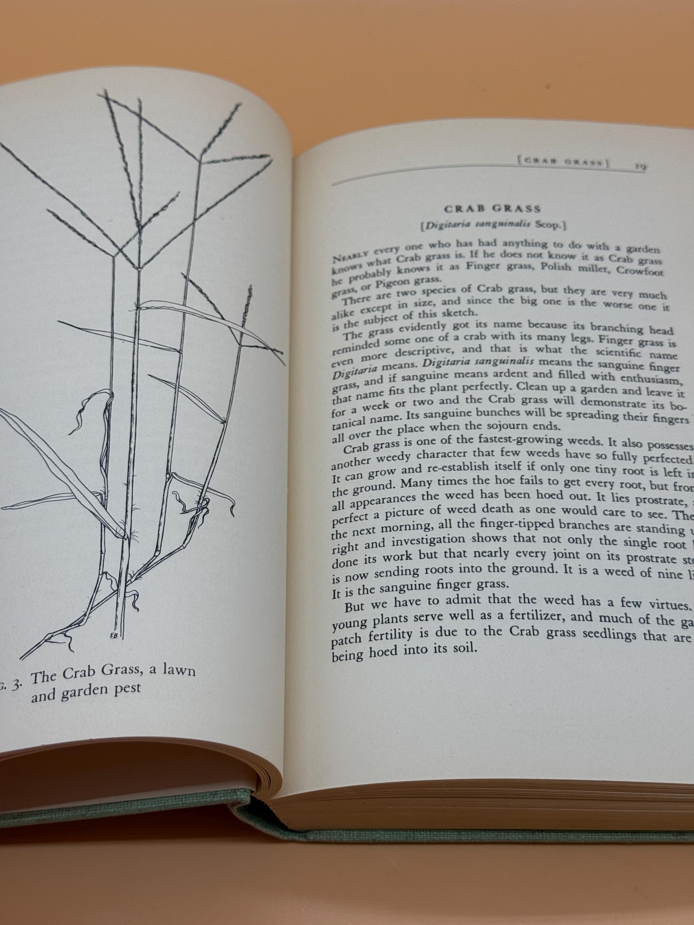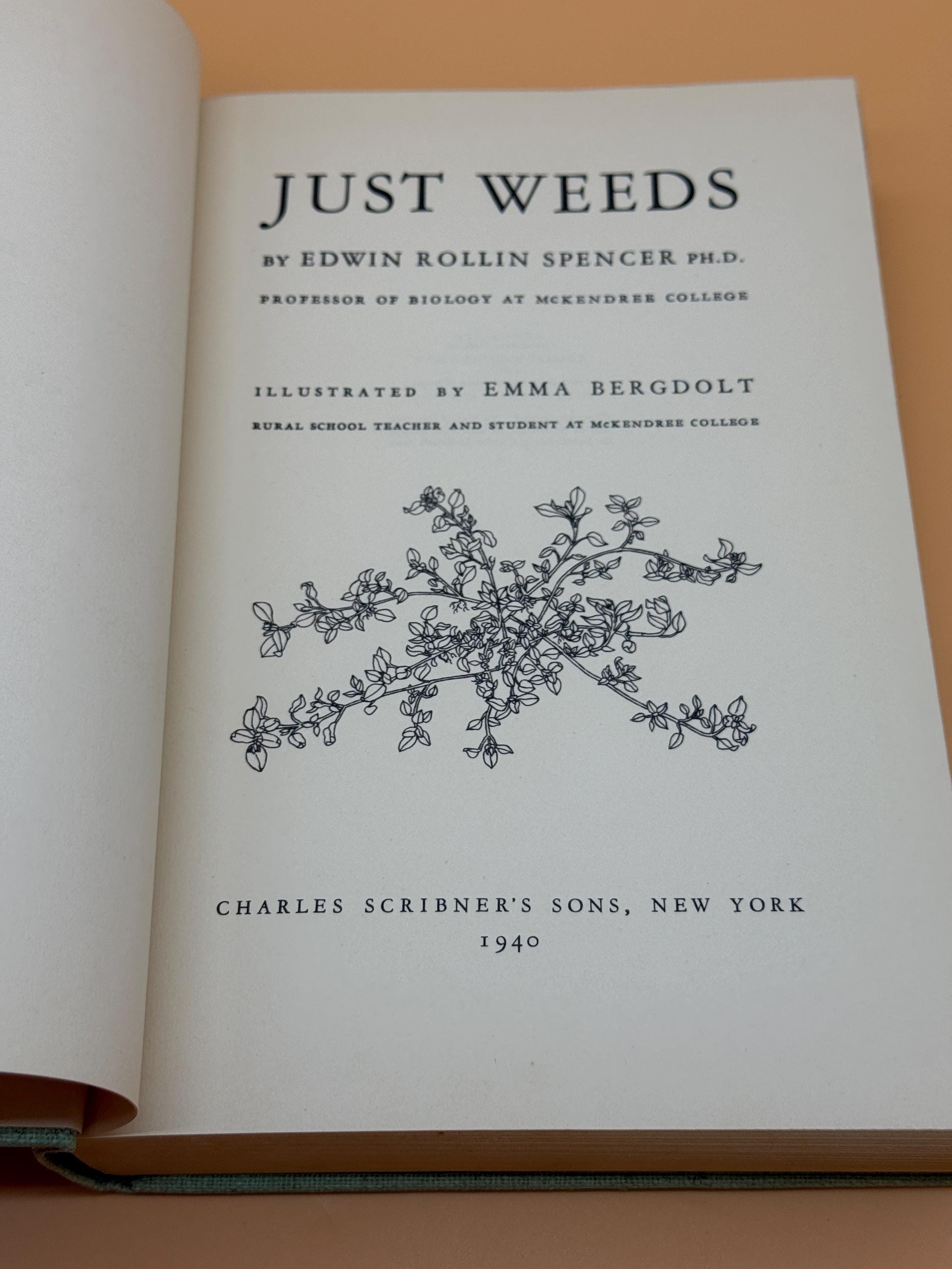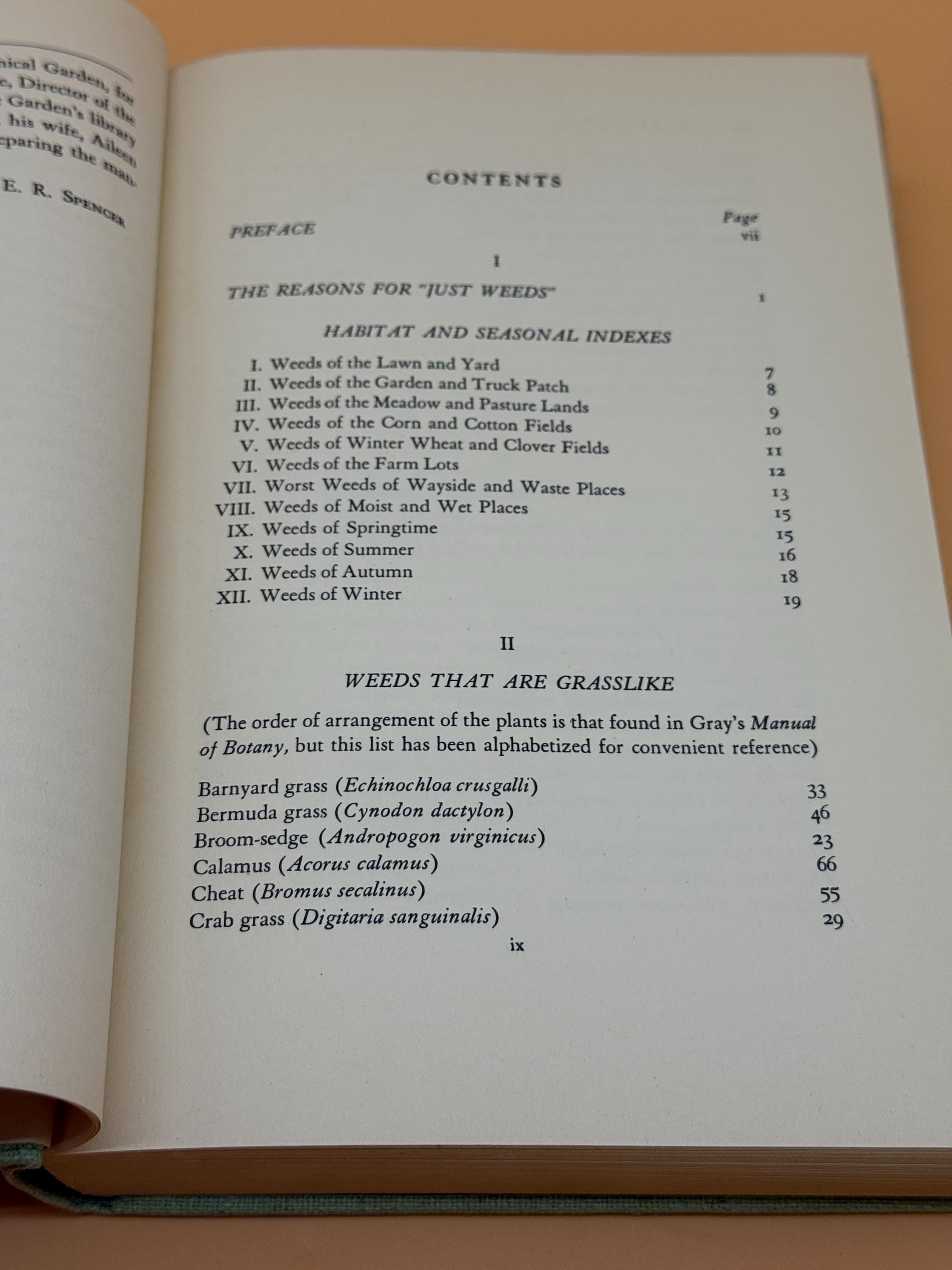 Just Weeds by Edwin Rollin Spencer has been finely illustrated by Emma Bergdolt. The book is designed for the botanist, naturalist, or novice who sees a weed in garden or roadside to be able to identify the weed and learn something about it. Chapters include Habitat and Seasonal Indexes, Weeds That Are Grasslike, and Weeds That Are Not Grasslike. The extensive line drawings of weeds highlight the informative text throughout.