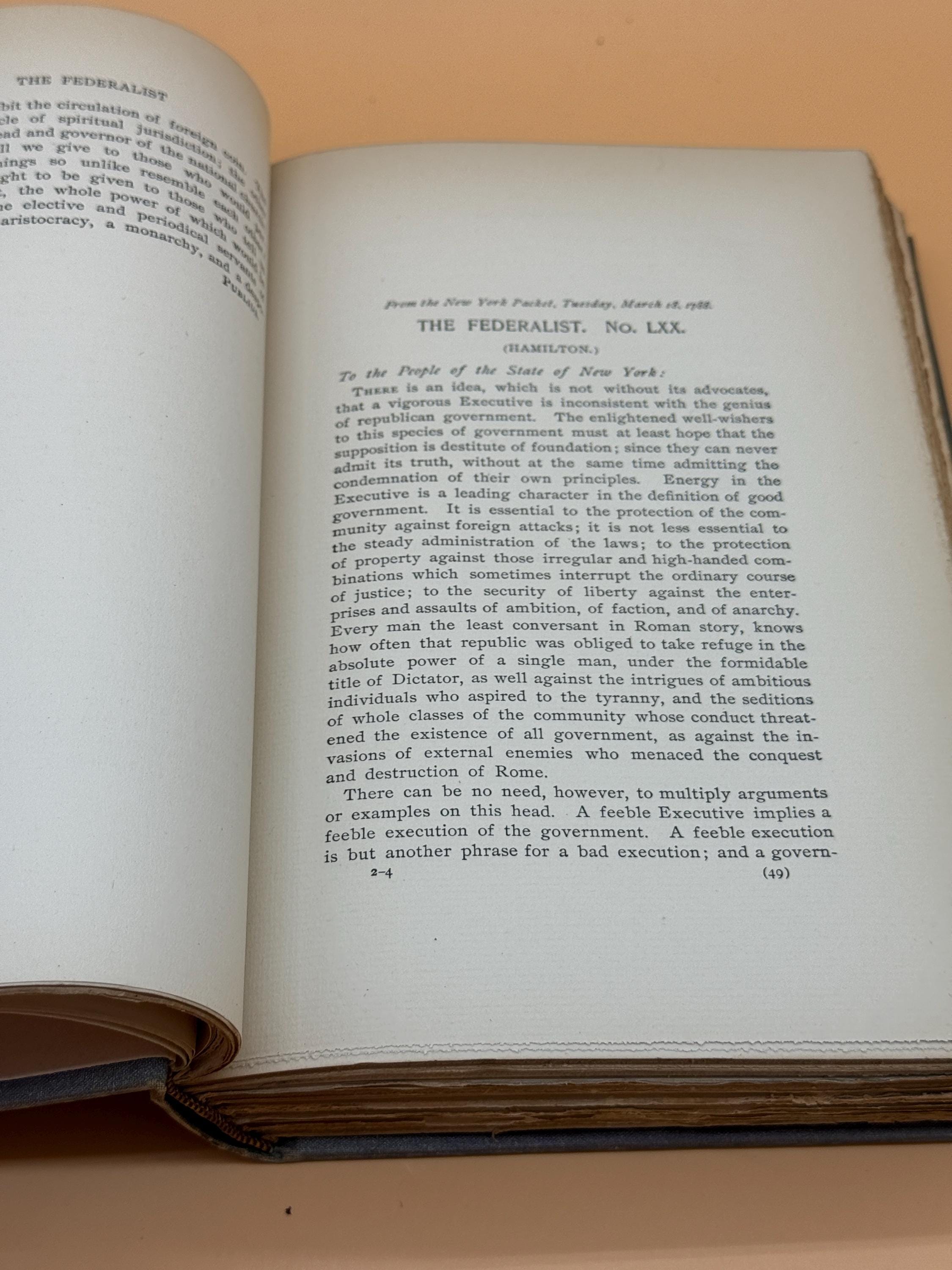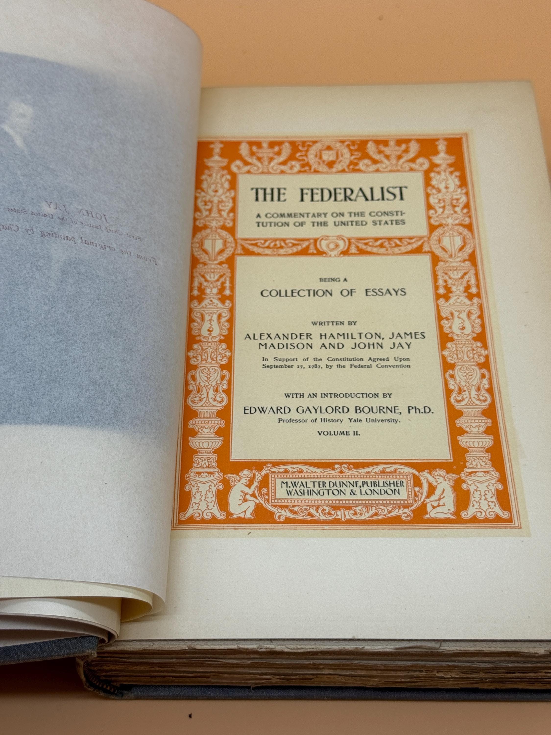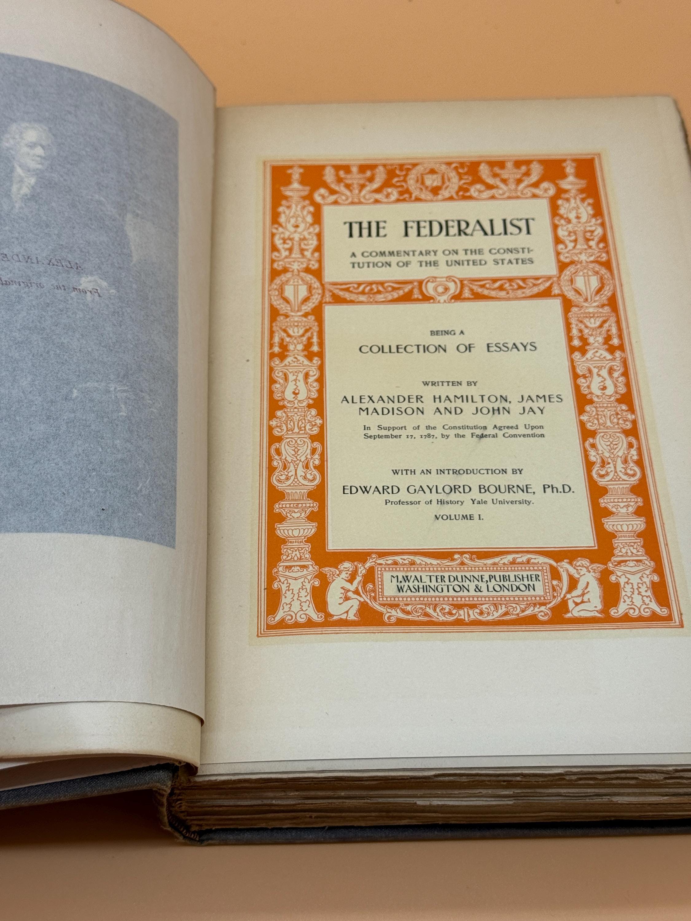 Originally published by Walter Dunne as a 20 volume set featuring history and philosophy essays, this listing is for the 2 Volume Set, The Federalist and includes The English Constitution as Part 2 of Volume 2. The full title is The Federalist A Commentary On The Constitution of The United States Being a Collection of Essays by Alexander Hamilton, James Madison and John Jay. Includes Intro by Edward Gaylord Bourne. Part Two of Volume Two is The English Constitution by Walter Bagehot. Intro by Edwin Erle Sparks.