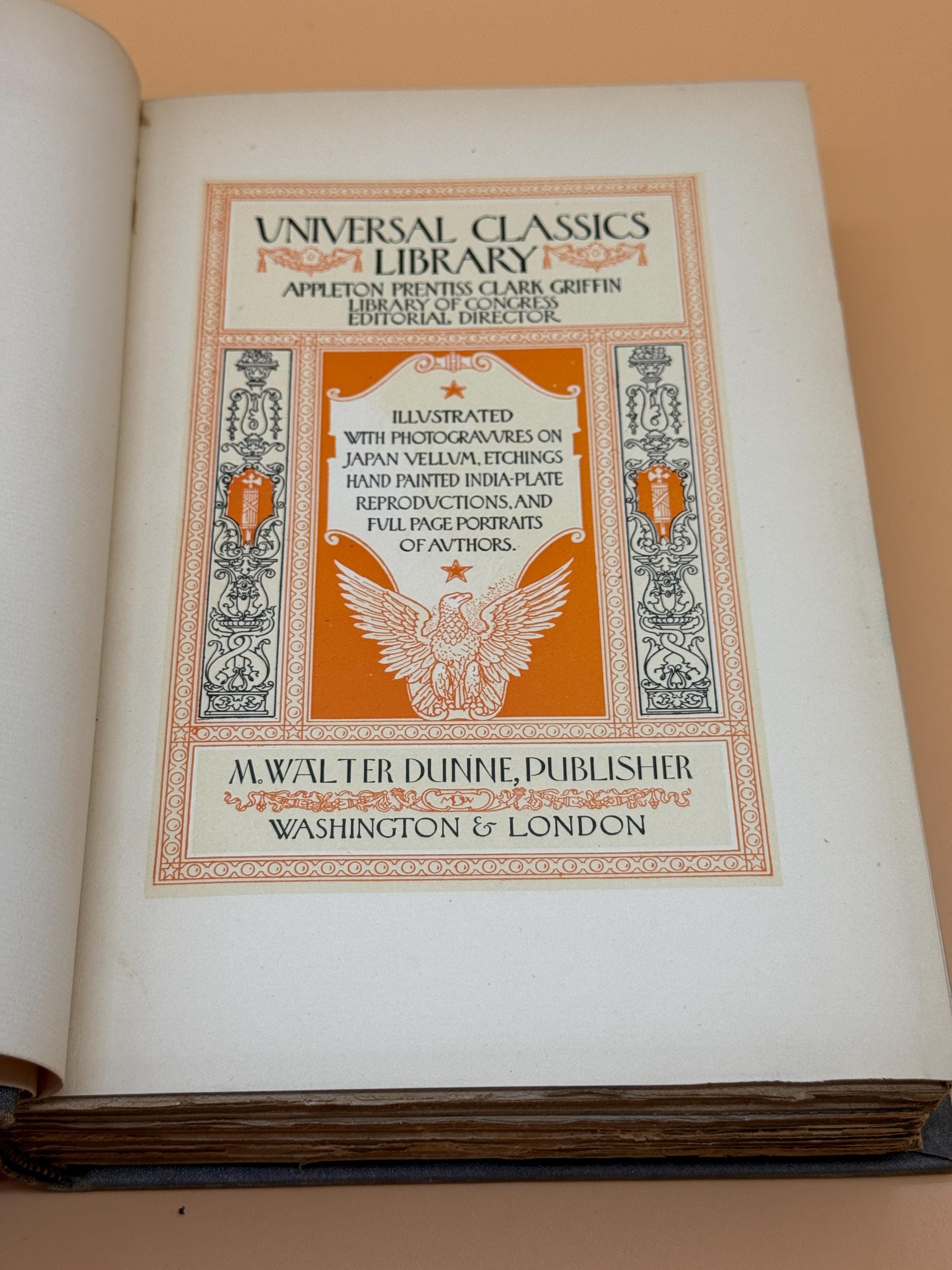 This is a good 2 volume set, 1901 Walter Dunne Publishing. Each volume is good and solid inside and out. CONDITION NOTES: The inside pages have light natural tanning from age but are overall very good. We did notice a few pages with some sentences underlined in pencil and included a photo as example. The majority of pages are unmarked. There is no serious foxing and the bindings are tight and straight. We did notice inside front cover Vol. 1 there is mild beginnings of compromised binding top edge, about 1" noticed separation, but pages are tight to binding and this is to be expected given age. Bound in grey hardcover boards, each volume has a paste-down on spine of title/Edition de Luxe. The hardcover boards on both are very good with mild shelf wear. The pages are rough cut edge, and feature gold gilt top edge only. The original tissue guards over frontispiece is still in place on both volumes including the second part of Volume 2, The English Constitution. Each volume is standard medium octavo book size or 6.5" x 9.5".