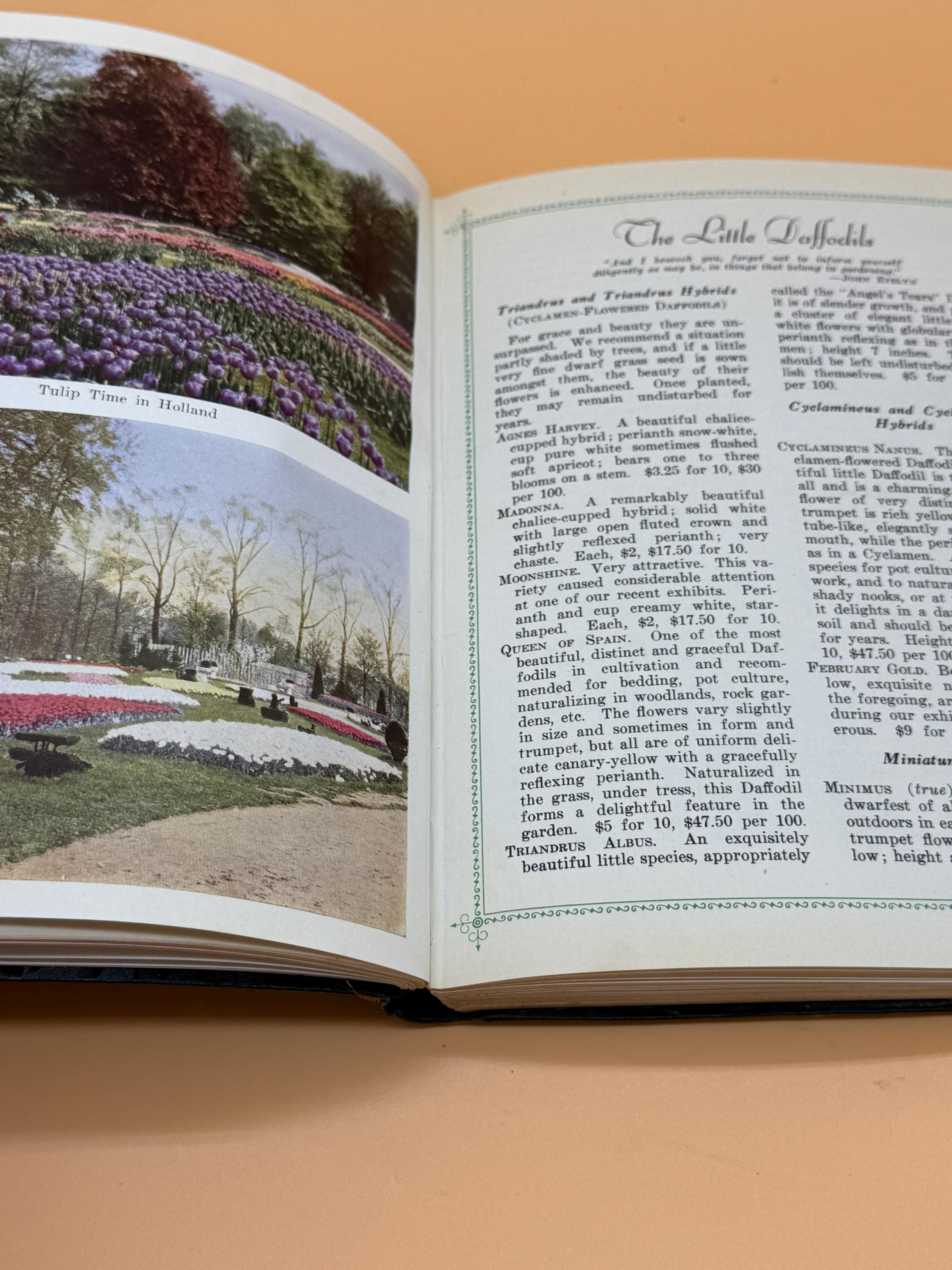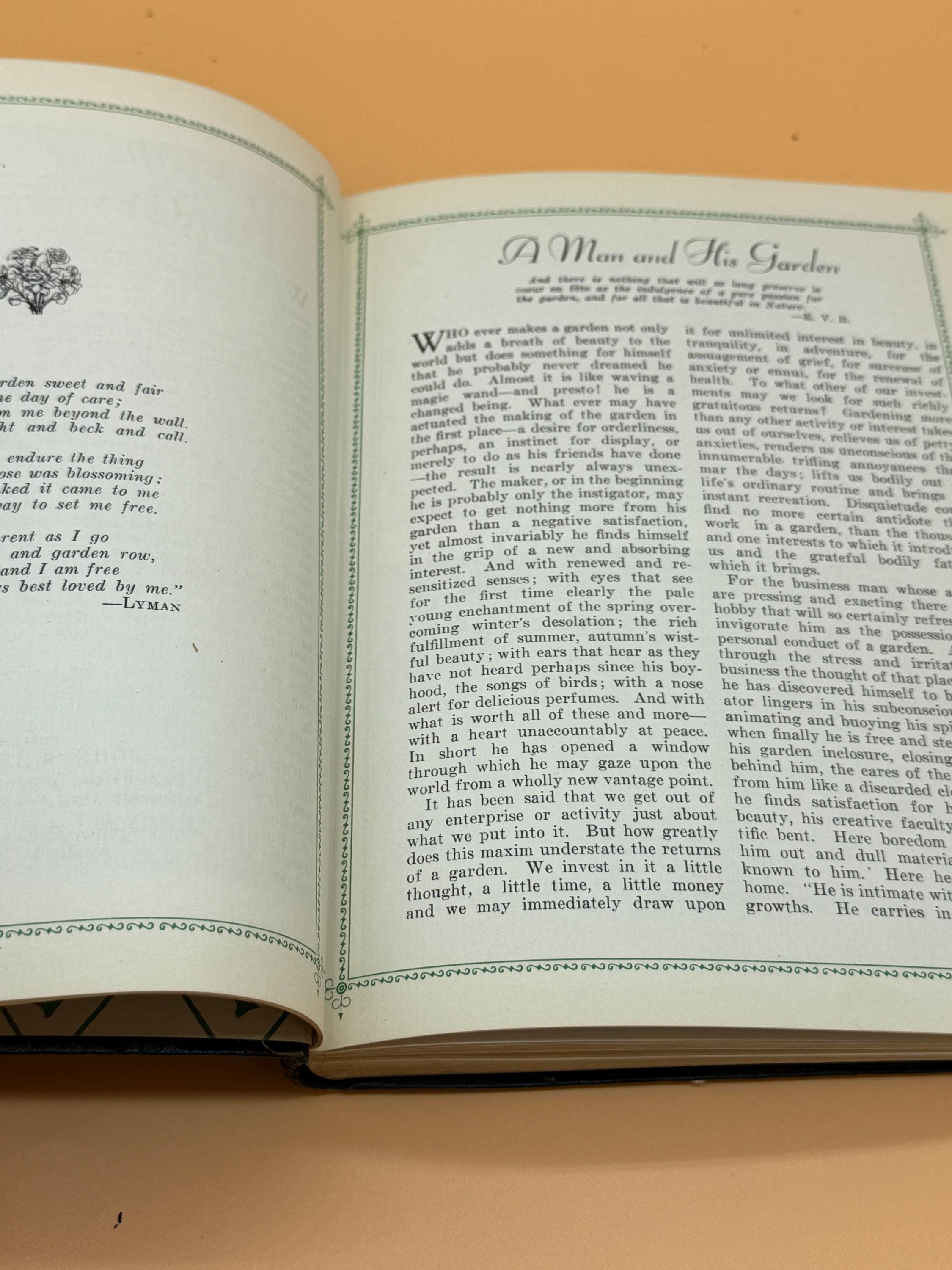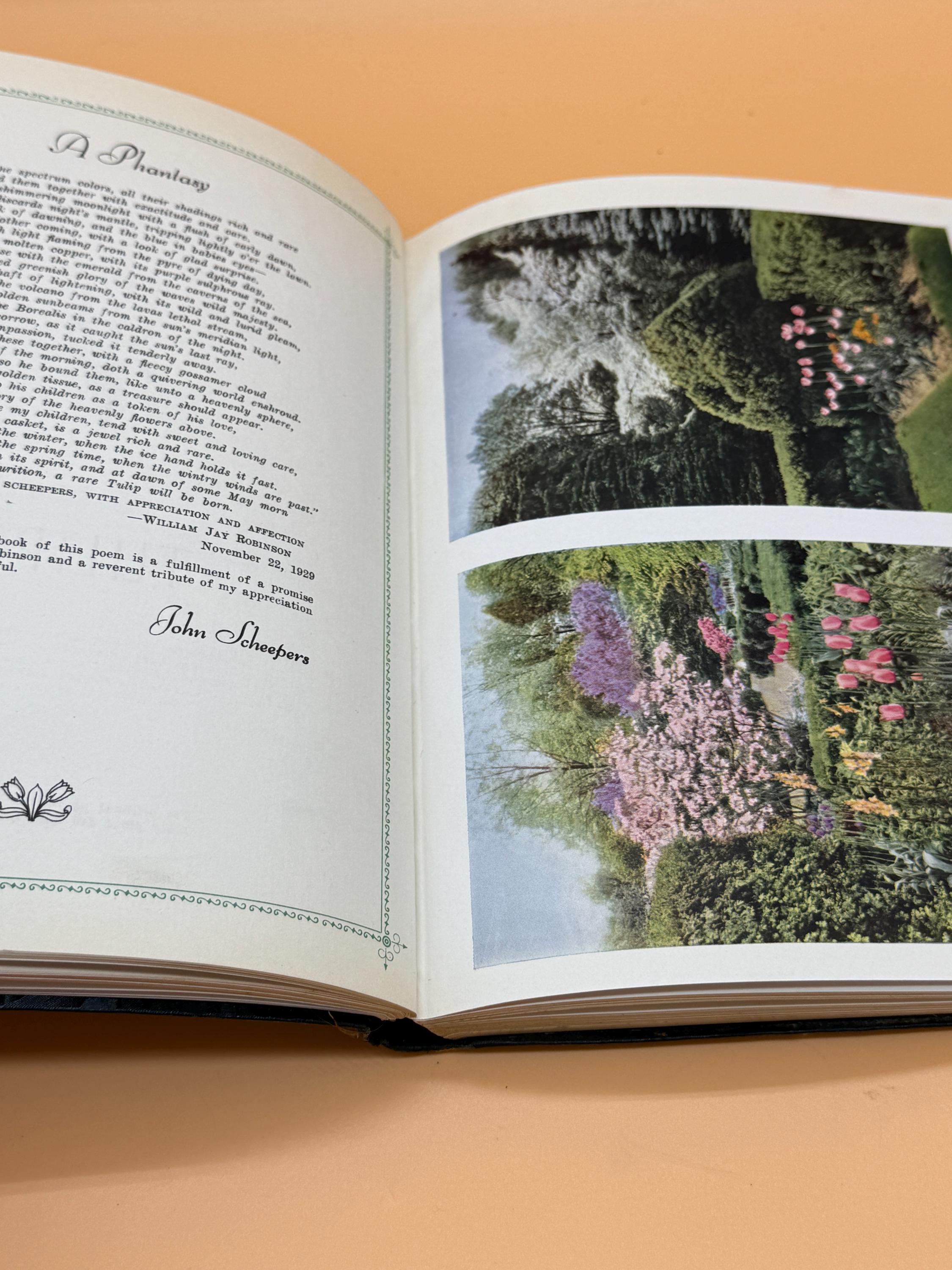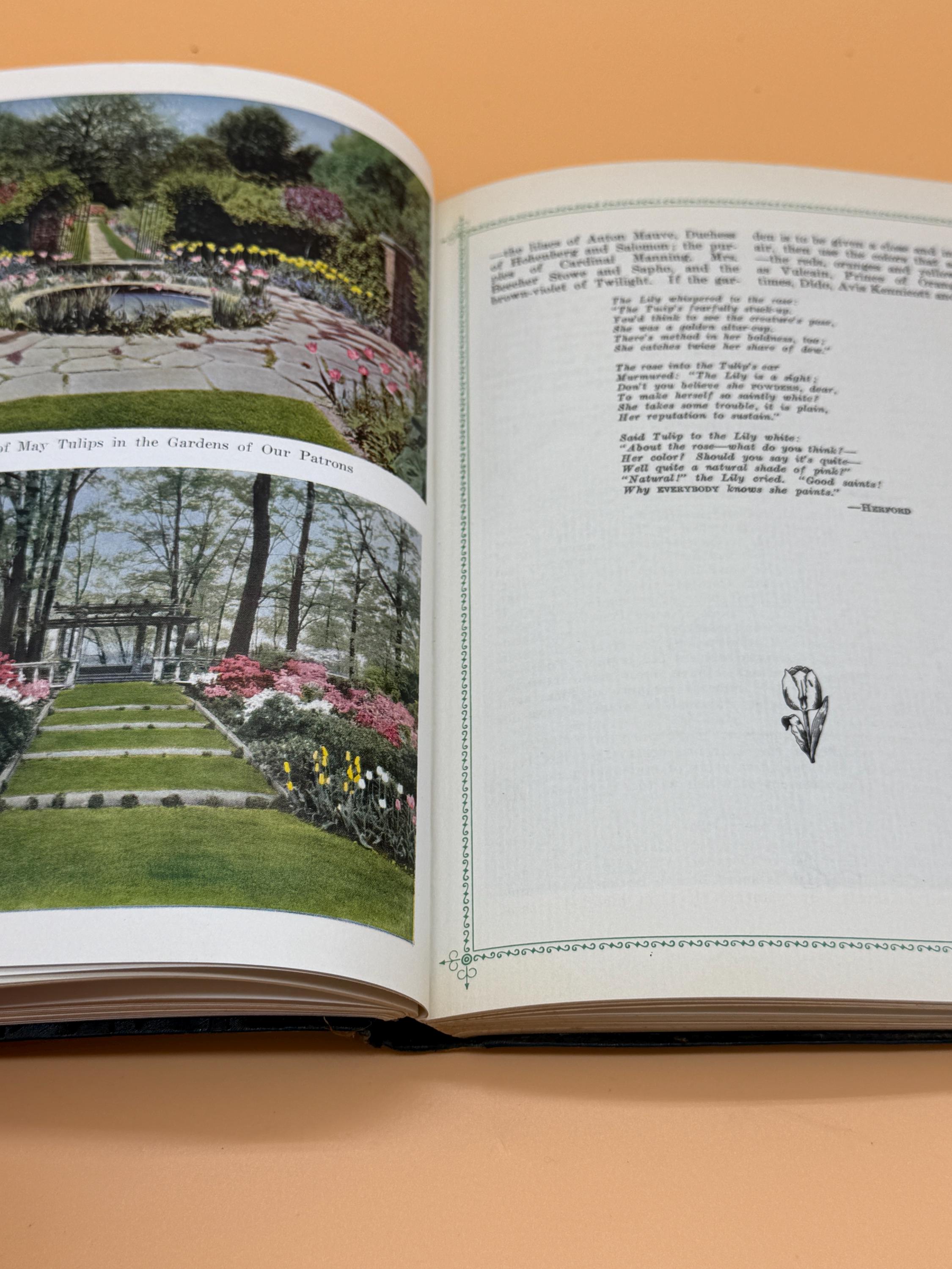 This is a very good rare book, 1929 Scheepers Publishing. this copy is very good inside and out. The inside pages are still very clean. Partial address label can be seen inside front cover from previous owner. The binding is tight and straight and features a faux silk brocade floral design front and back. Flex cloth brocade style cover is in a bluish-green and is very good front and back with only a hint of shelf wear. Standard octavo book size or 6" x 9" with 171 pages. No author given, it is a collection of information from informed experts with color photos believed taken from the display gardens at Brookville, Long Island.