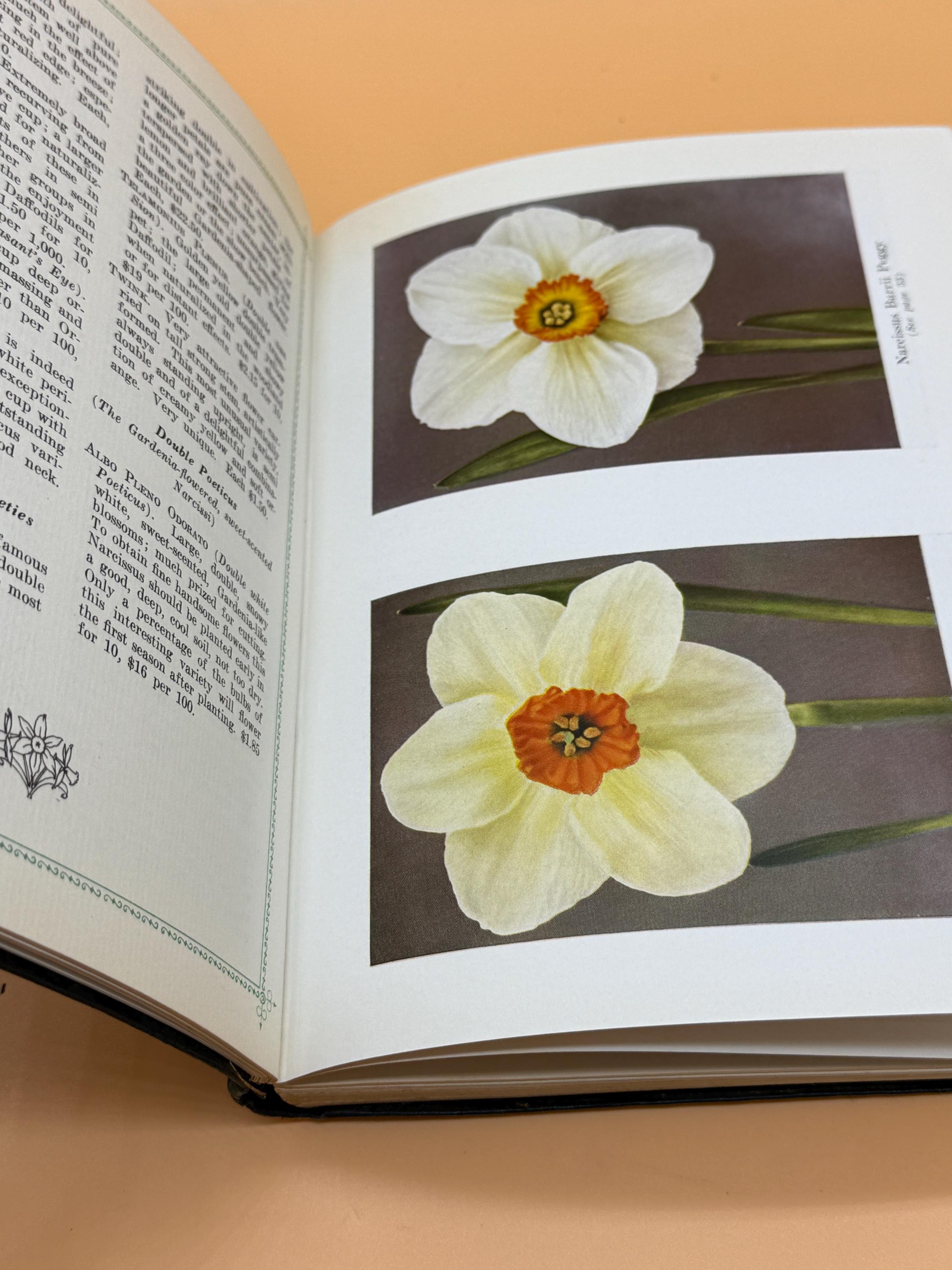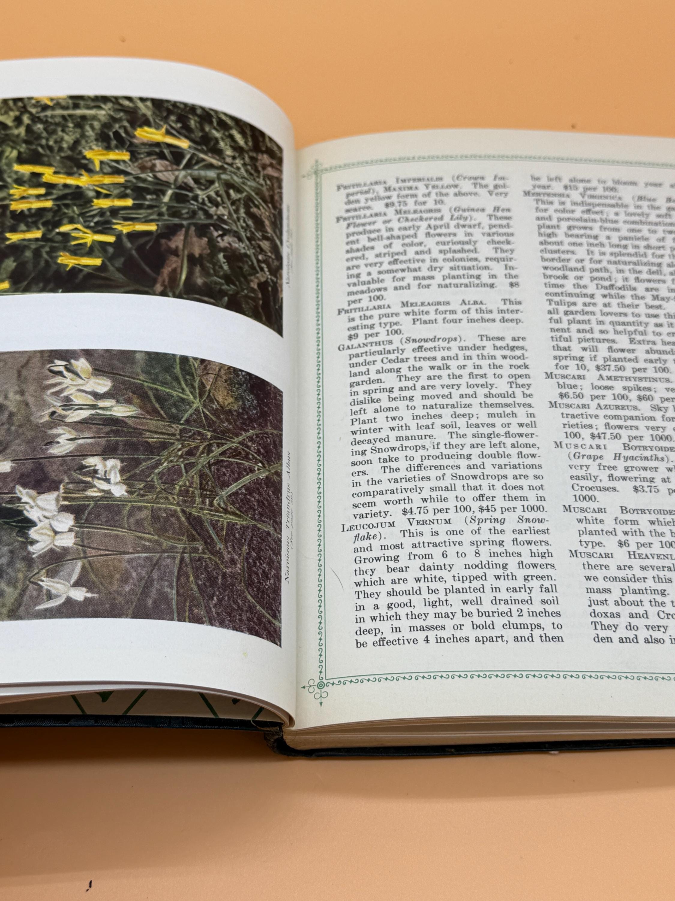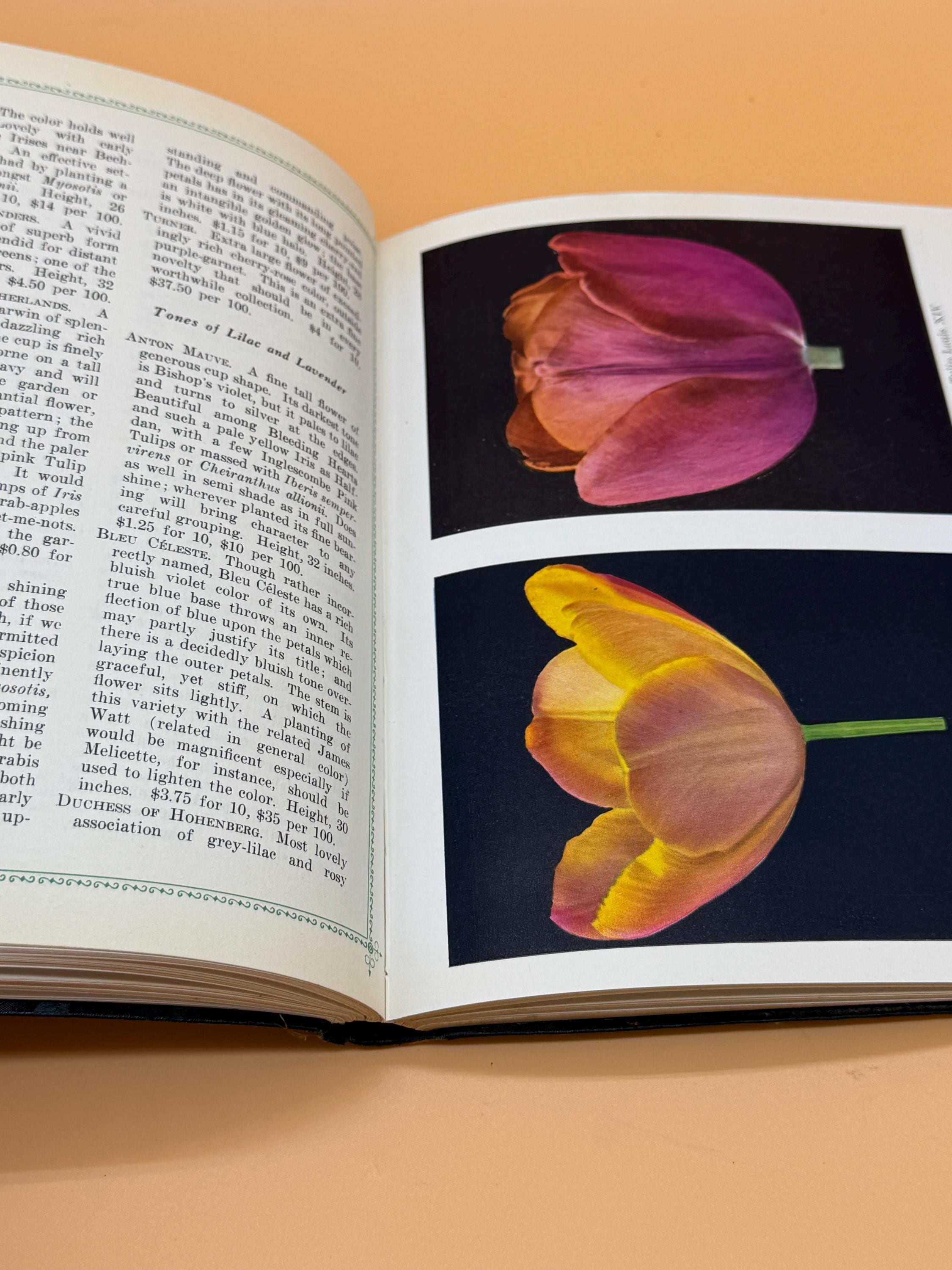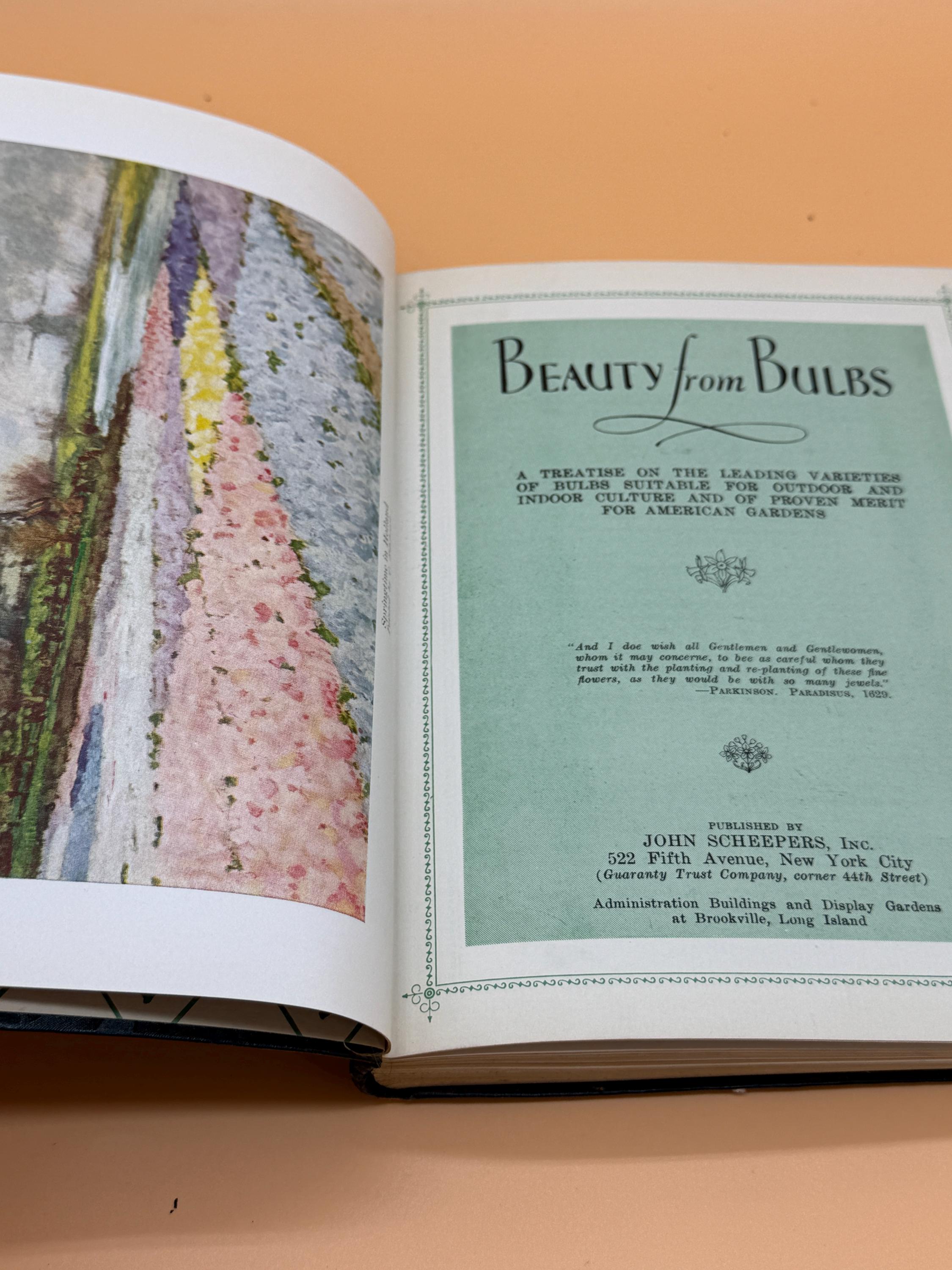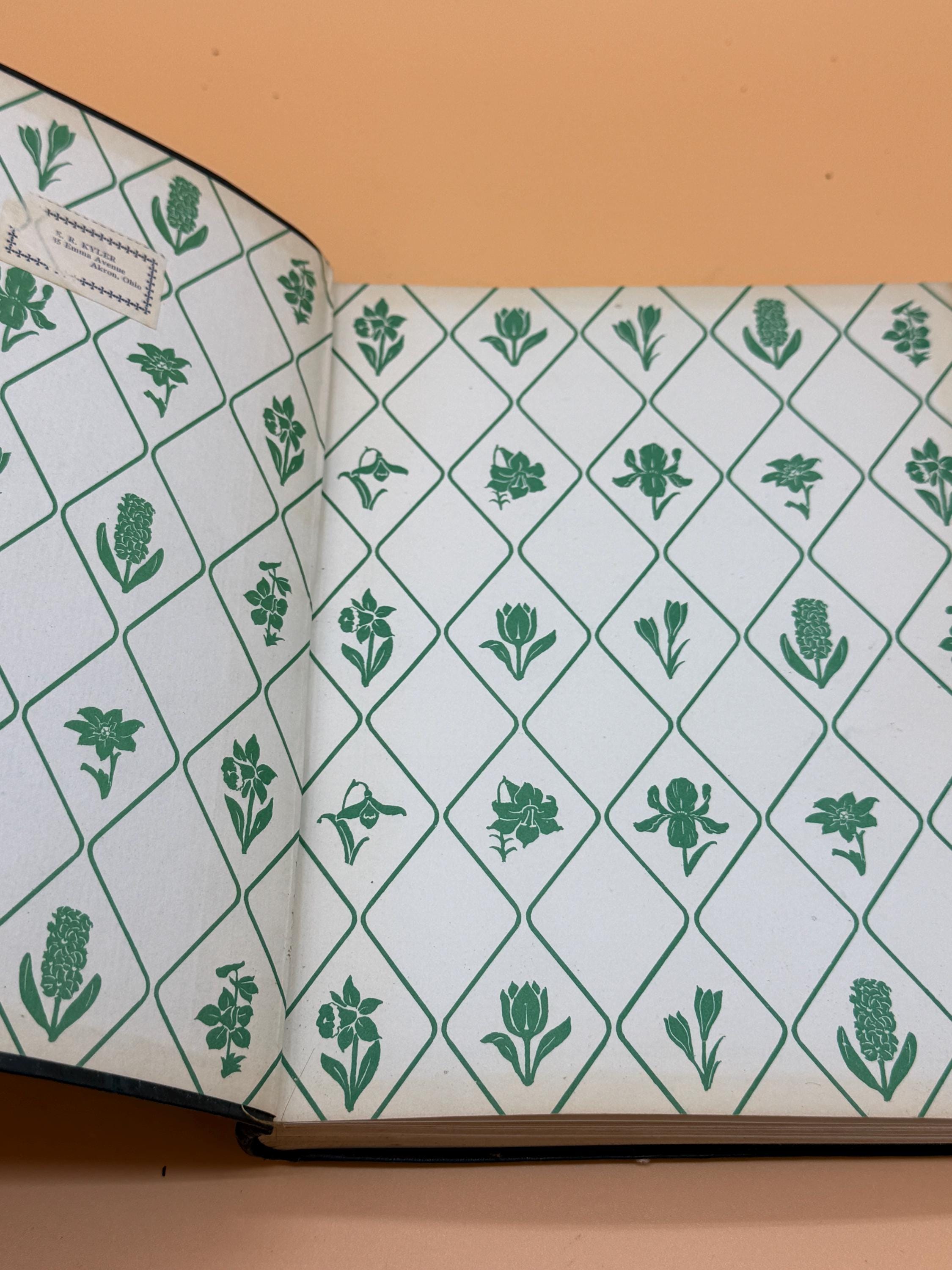 Beauty from Bulbs was published by John Scheepers, Inc, 1929, this is a First Edition. 1st Edition. The book is subtitled A Treatise On The Leading Varieties of Bulbs Suitable For Outdoor and Indoor Culture and Of Proven Merit for American Gardens. Featuring floral patterned, dark green/bluish, faux brocaded silk covers. Front and back decorated endpapers. It is extensively illustrated throughout with color photos. It is designed for both the experienced and novice gardener.