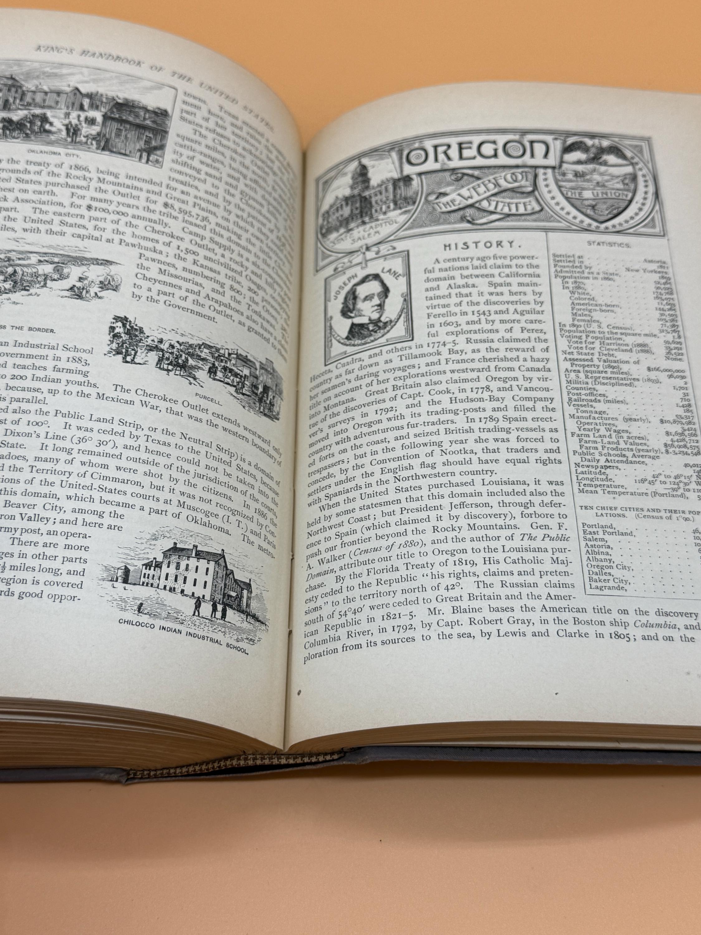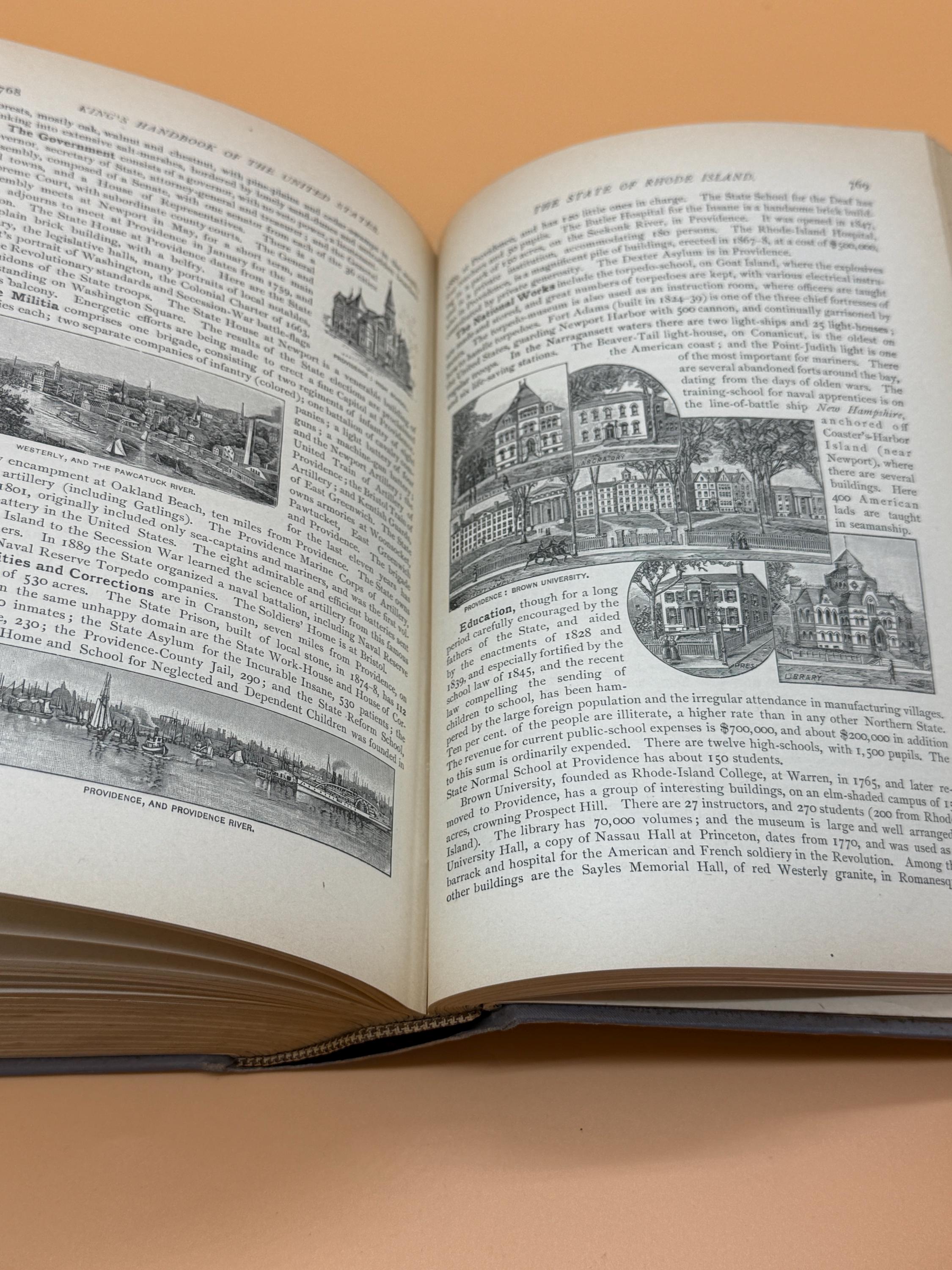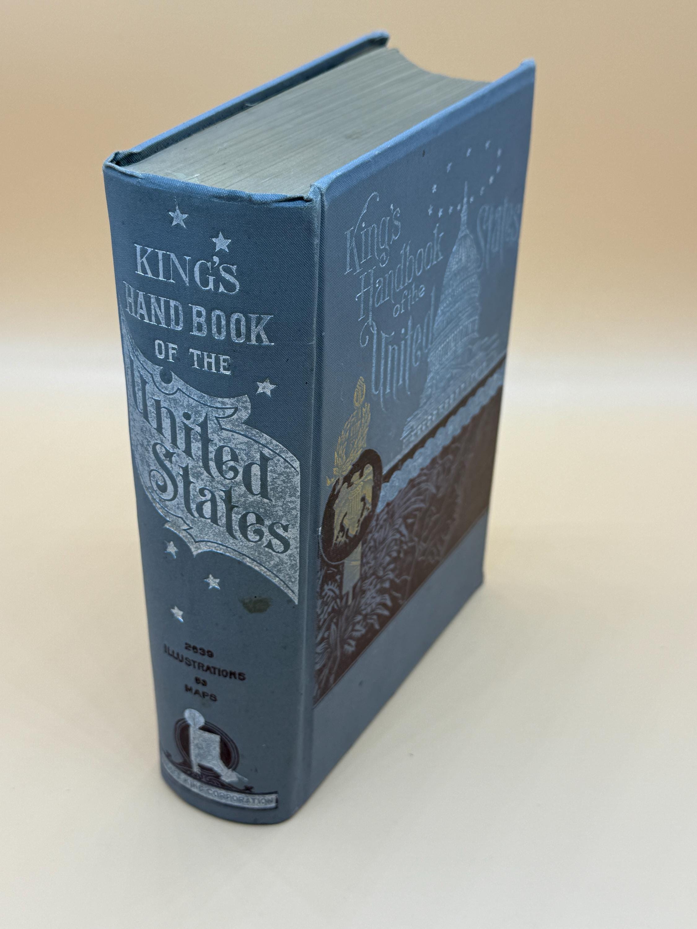 King's Handbook of The United States by Moses King is a historical travel book and history of The United States. The edition features over 2600 illustrations and 53 colored maps. The maps of the states form an atlas arranged in their alphabetical order and over 48 pages from 461-508. The illustrated heading of each state chapter contains the state arms and motto, the State Capital, and a portrait of some person prominently connected with its history.