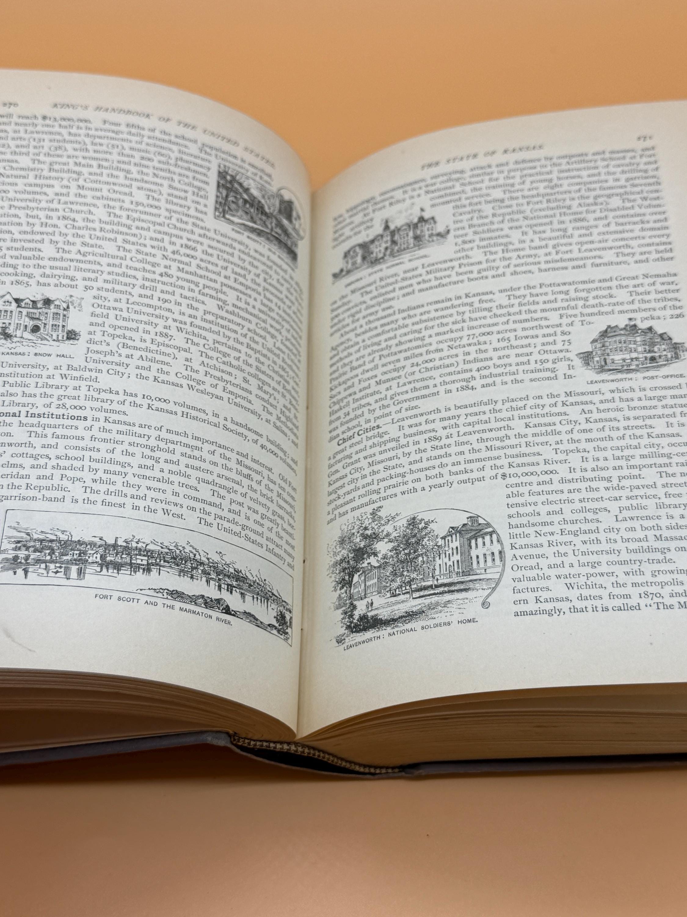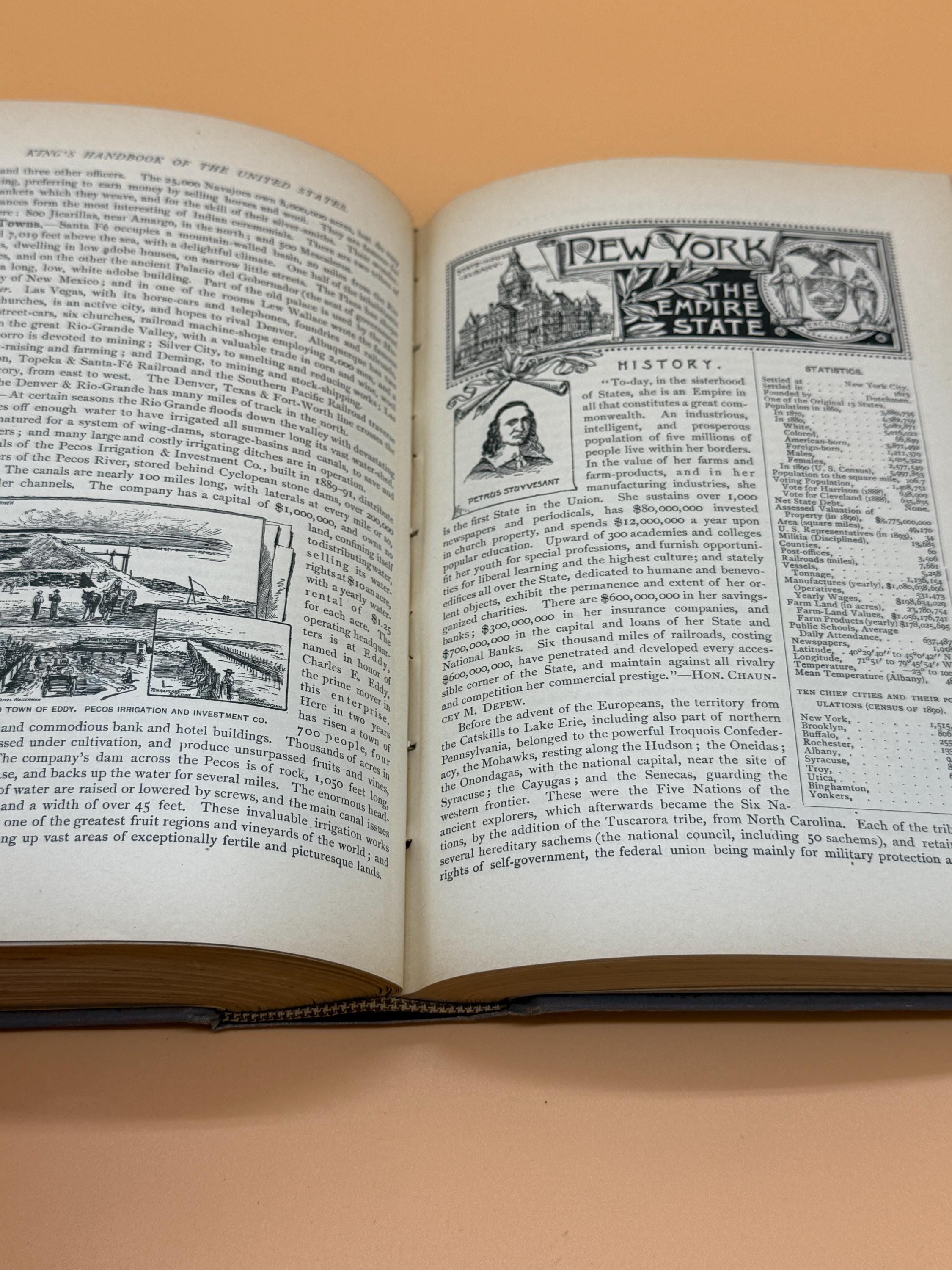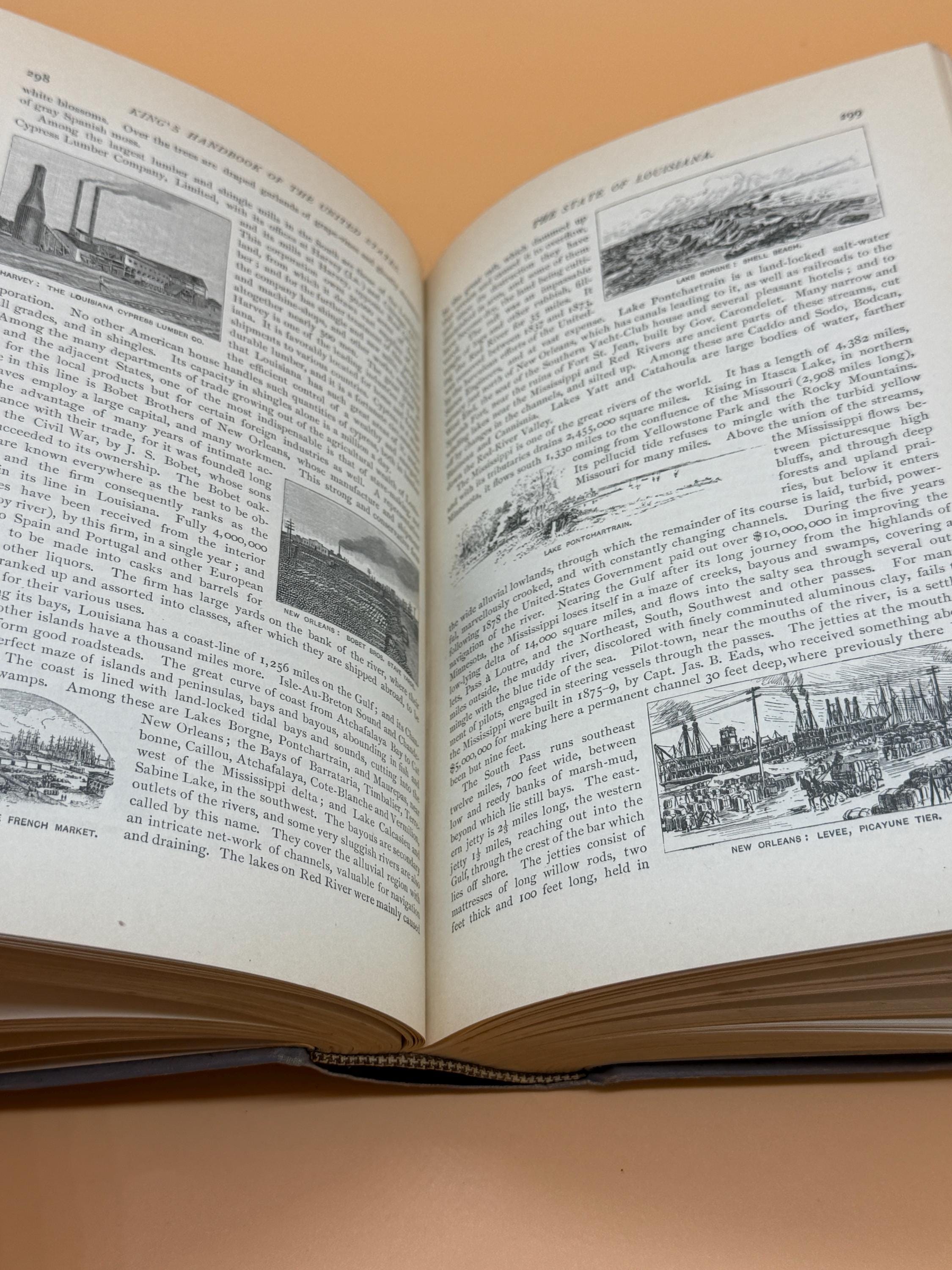 King's Handbook of The United States by Moses King is a historical travel book and history of The United States. The edition features over 2600 illustrations and 53 colored maps. The maps of the states form an atlas arranged in their alphabetical order and over 48 pages from 461-508. The illustrated heading of each state chapter contains the state arms and motto, the State Capital, and a portrait of some person prominently connected with its history.