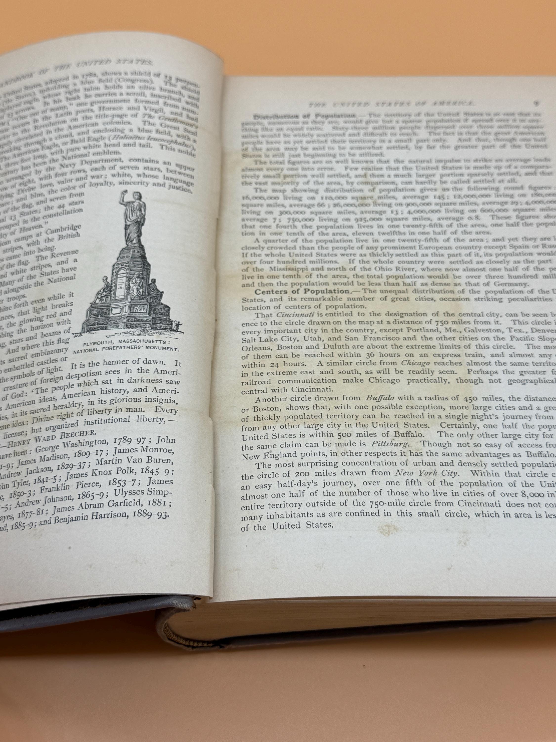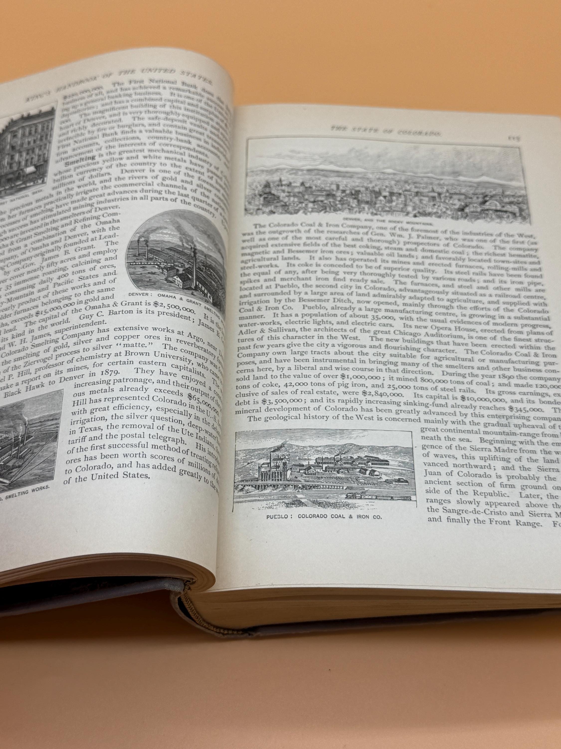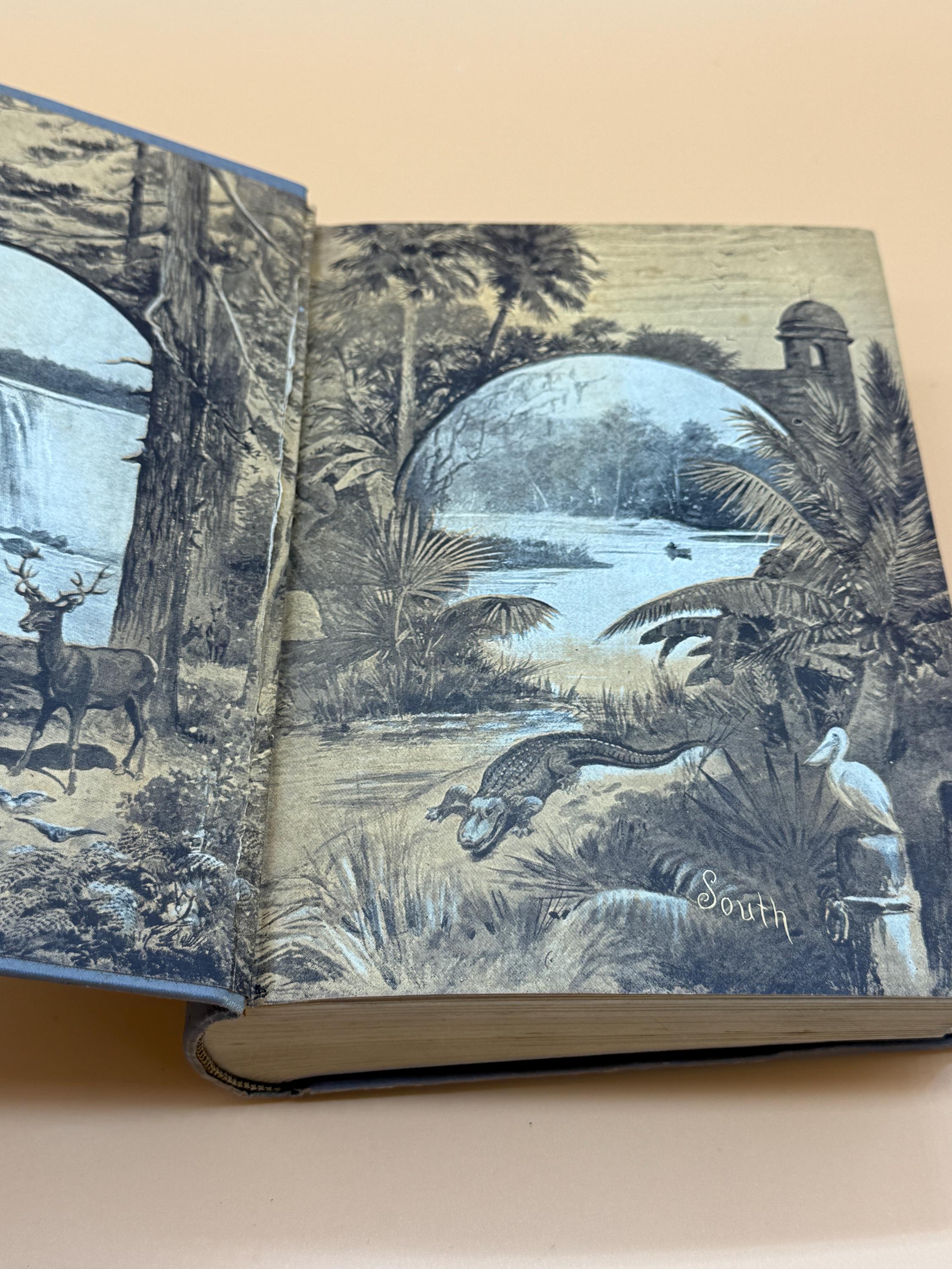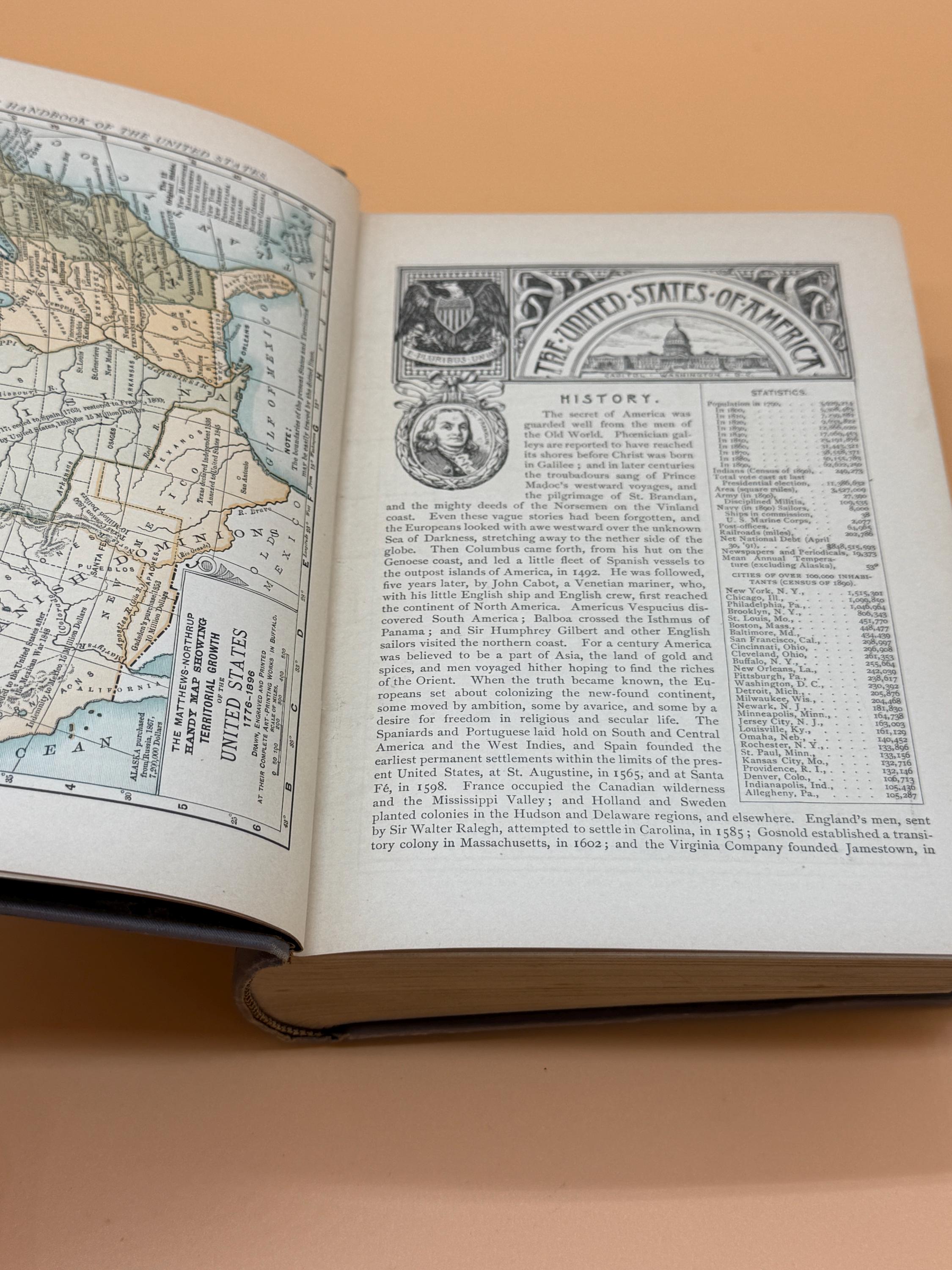 This is a very good given age hardcover. 1896 Matthews Northrup Publishing, Buffalo New York. This copy is very good inside and out. The inside pages are clean with only very light natural tanning from age. There is dust spotting along outside page edges but does not carry over to inside pages. The binding is tight and straight, bound in fine sewn binding, NOT glued, for durability. The hardcover boards are in grey with silver Capital Building design front along with silver lettering and additional design work. There is silver lettering along spine and little fading to cover only very light shelf wear. Crown octavo book size or 5.5" x 8.5" with 951 pages including index and addition stats. Illustrated endpapers front and back. The back of the hardcover features embossed various state capitals.