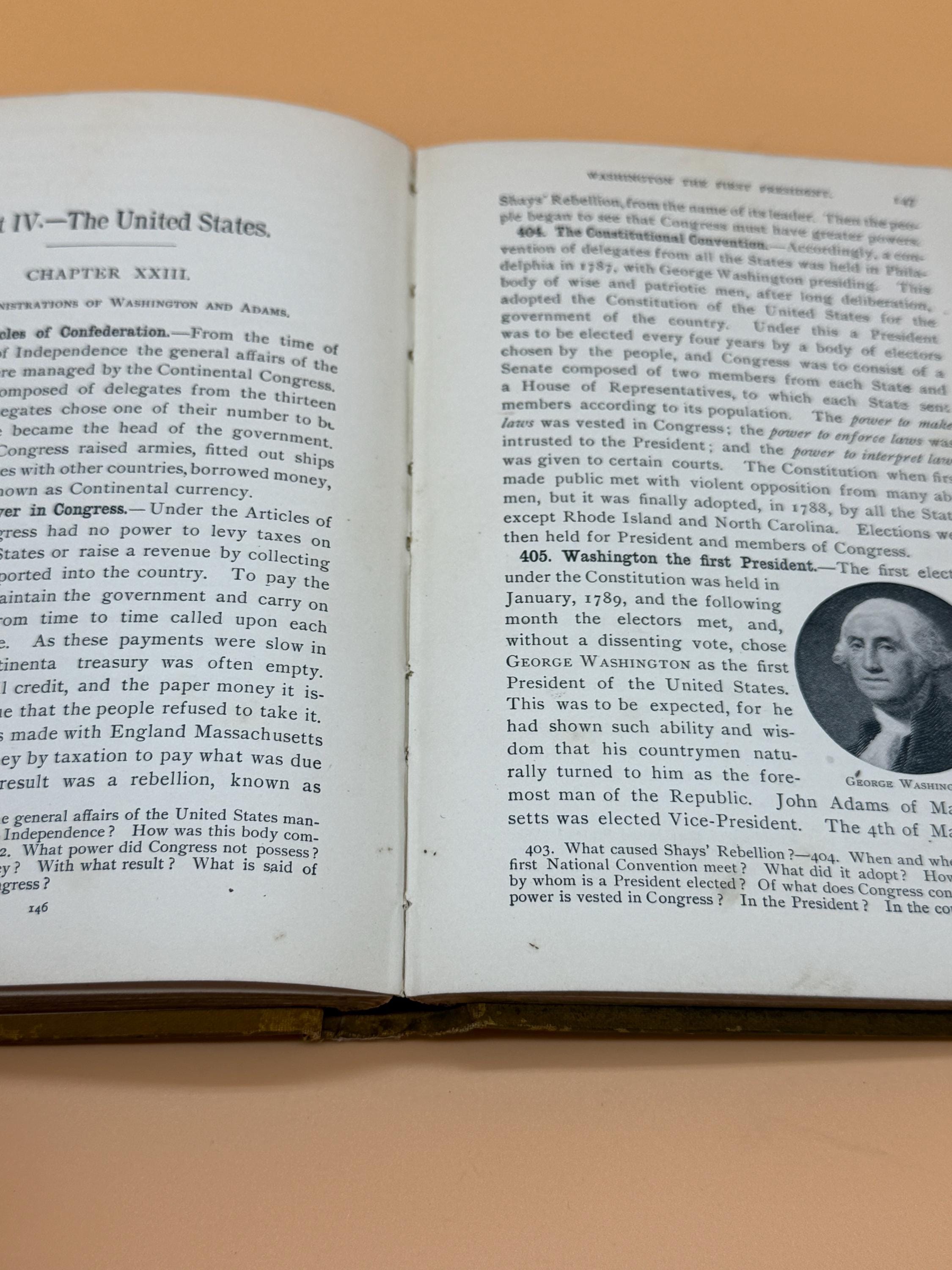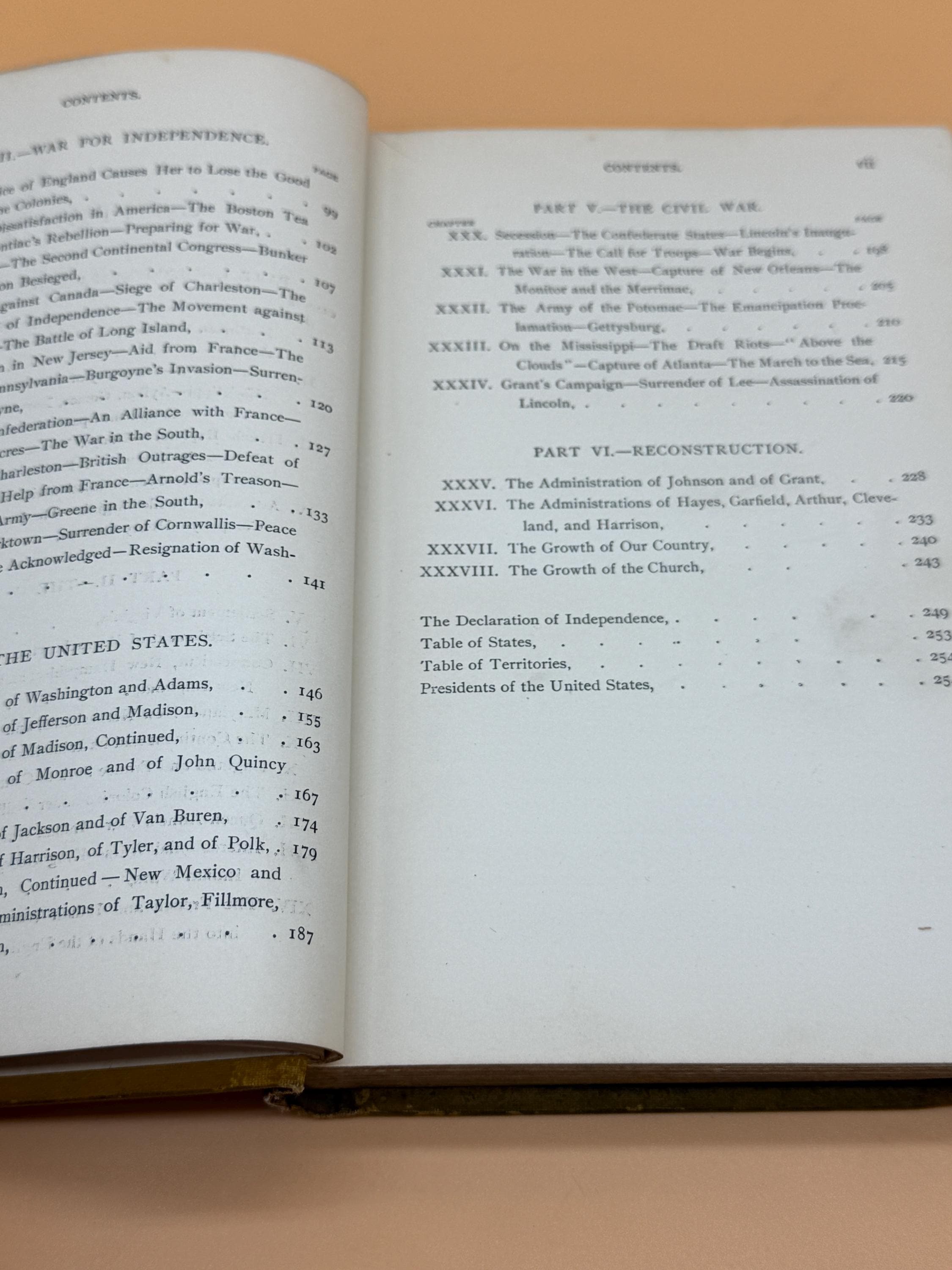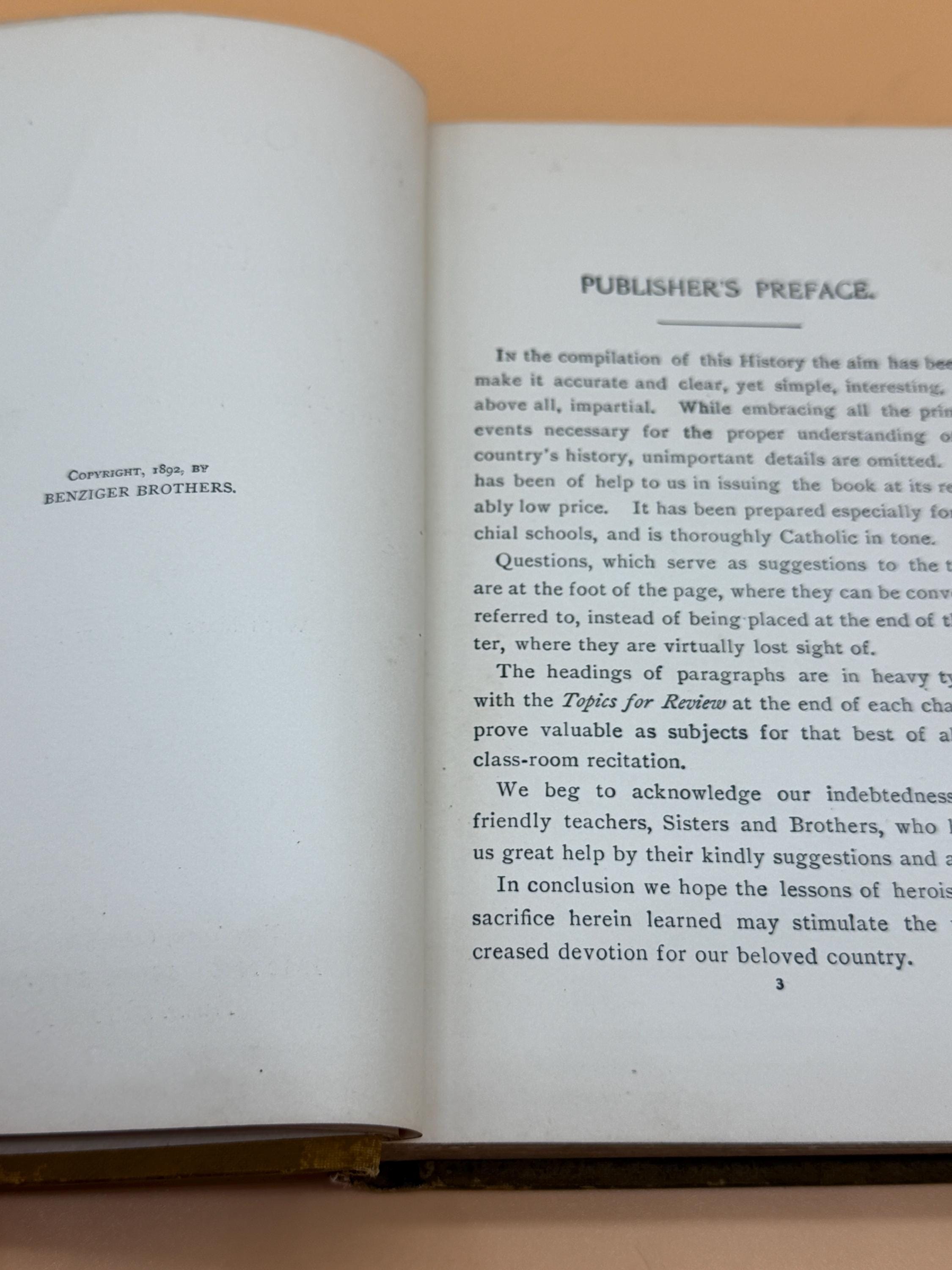 A School History of The United States is "abridged and compiled from the most reliable sources" and includes maps and illustrations. In the publishers preface they acknowledge "indebtedness to many friendly teachers, Sisters and Brothers, who have given us great help by their kindly suggestions and advice". Also noted is the fact from the publishers that "it has been prepared for parochial schools, and is thoroughly Catholic in tone".
