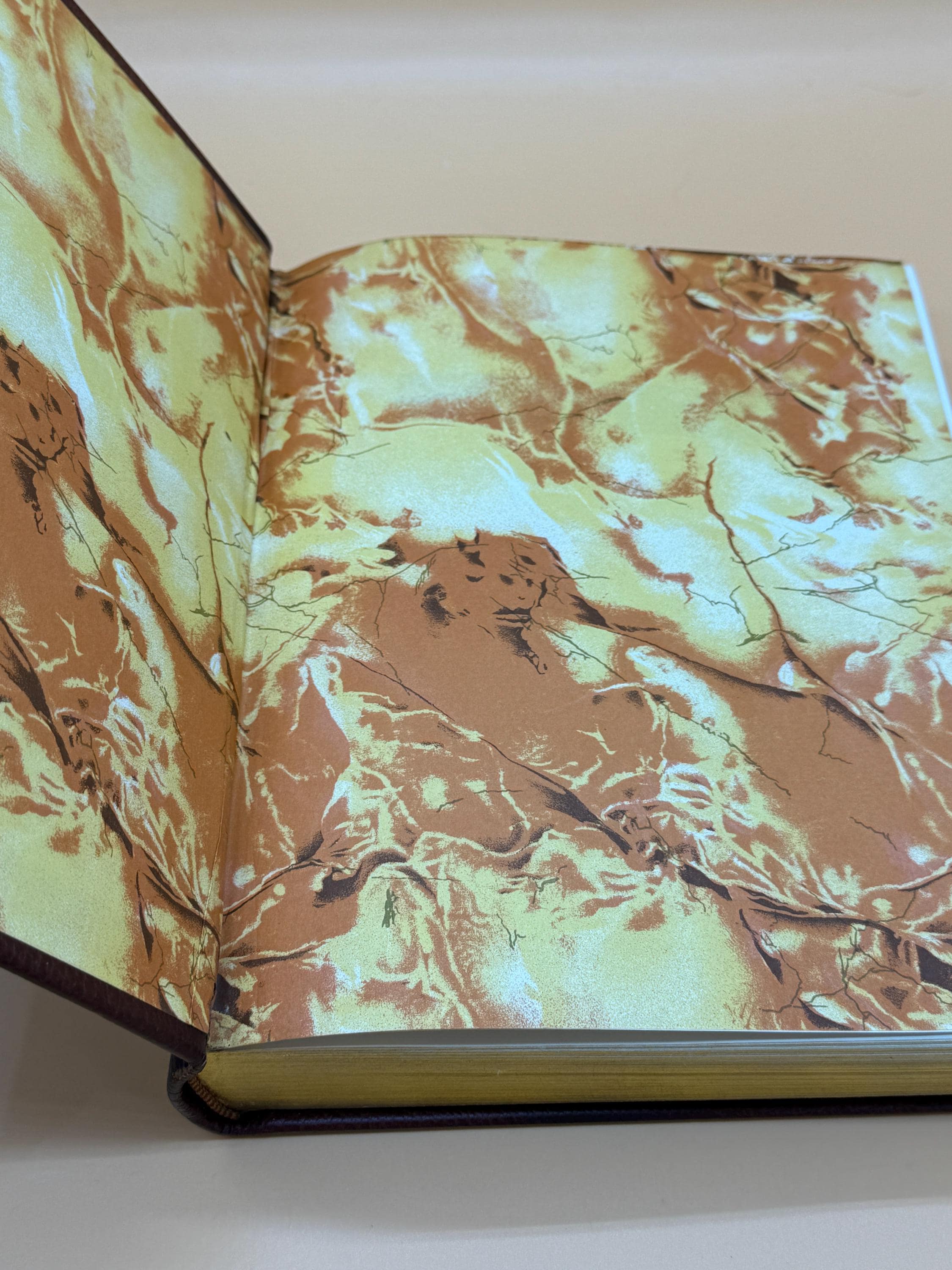 This is a very good leather-bound hardcover with gold gilt trimmings. 1960 Scribners Publishing. This copy is still crisp and clean inside and out. The inside pages only have a hint of light natural tanning from age and are still very crisp and clean. The binding is tight and straight and features a fine sewn binding (not glued) for durability and aesthetics. Bound in brown leather, the cover is also very good with only a hint of shelf wear and features gold gilt design from with AMSCO logo (American Mineral and Spirits Co). and gold lettering along spine. All three pages edges tipped in gold gilt. Illustrated endpapers front and back.