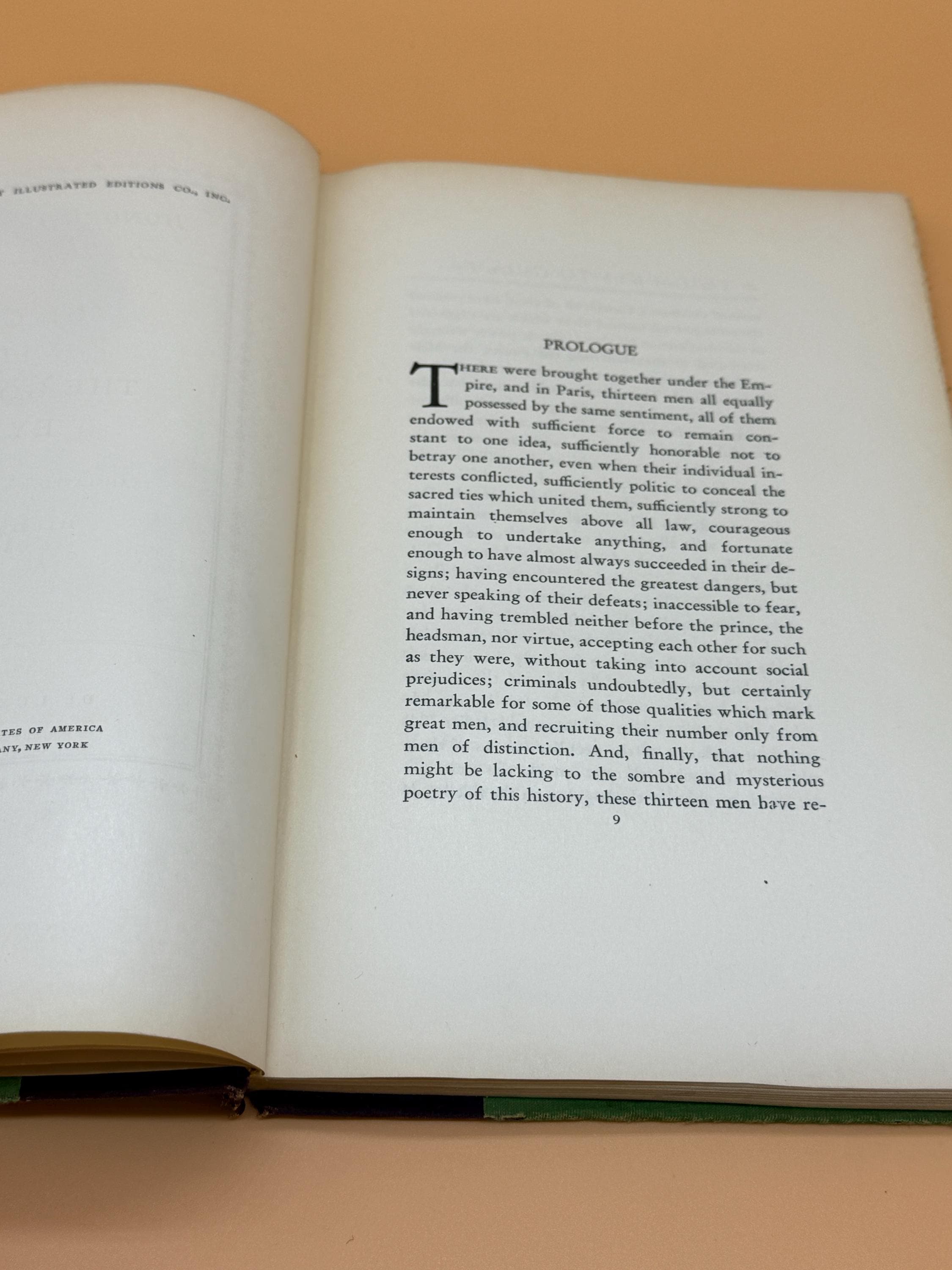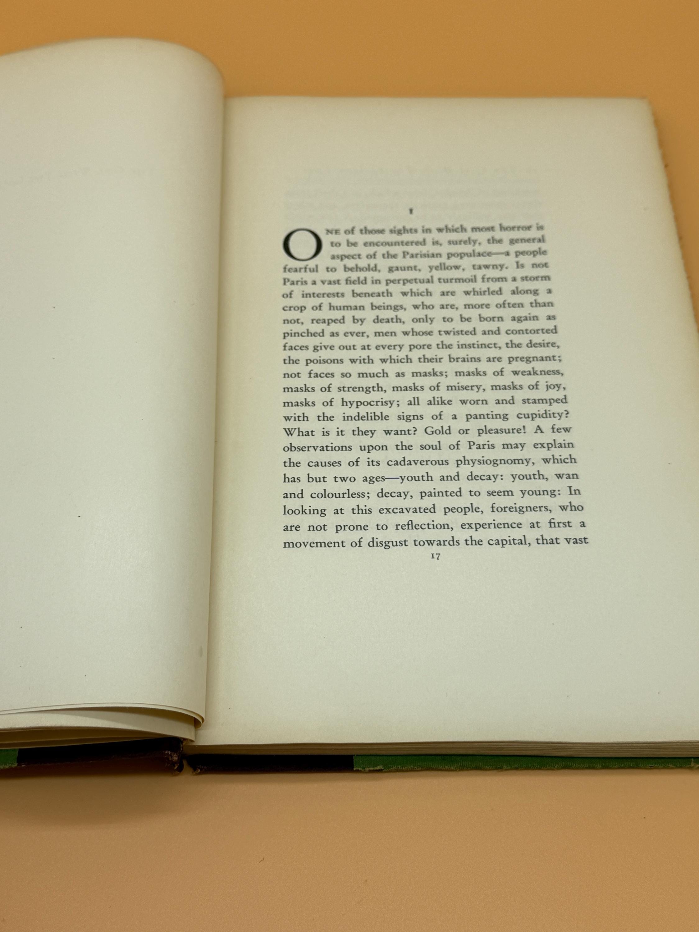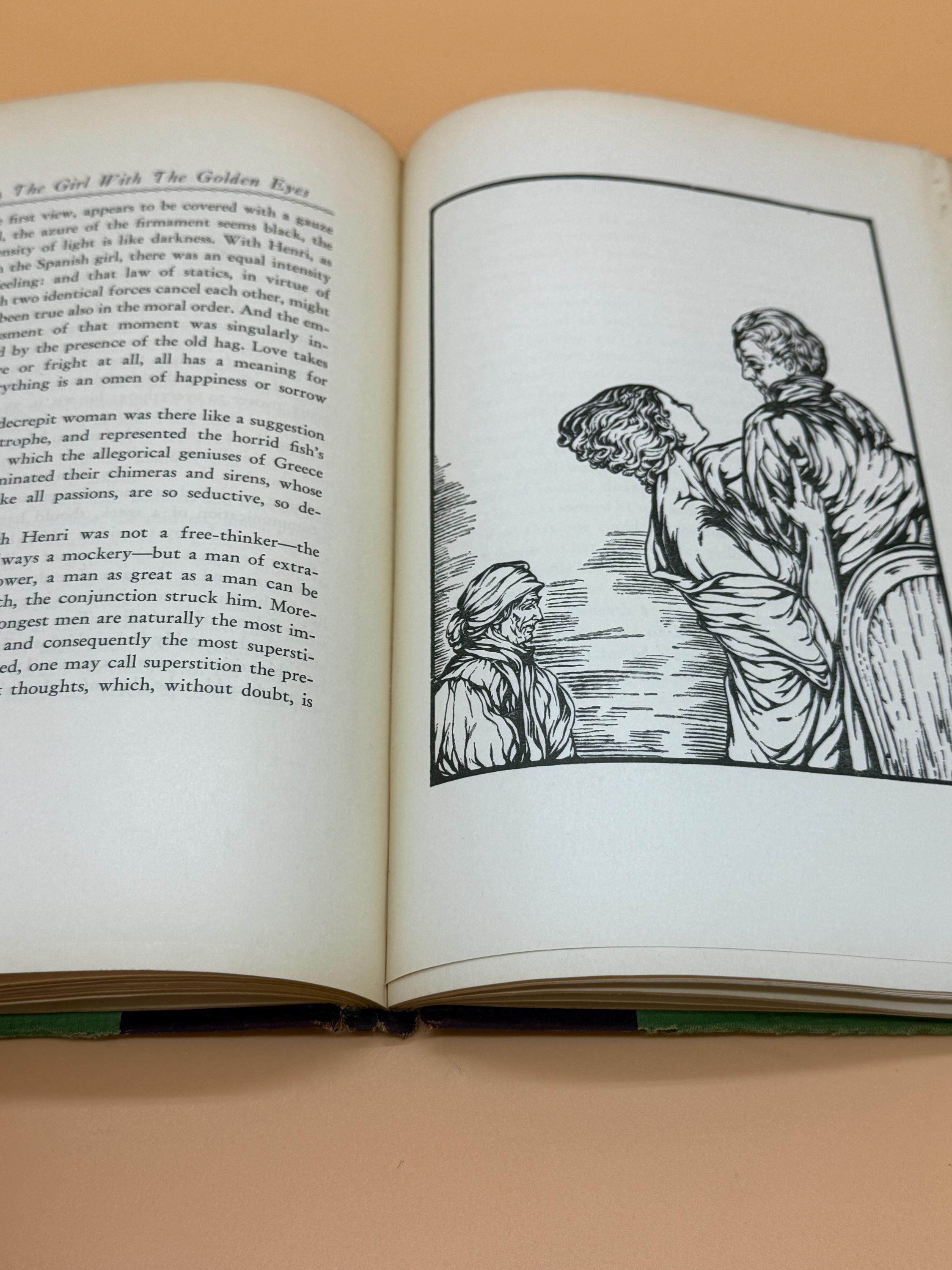 This is a good hardcover, NO slipcase as originally published. 1931 Illustrations Edition De Luxe. this copy is good inside and out. There is light natural tanning to pages from age but they are clean. NOTE: previous owners bookplate neatly placed inside front cover. The binding is tight and straight with the only hint of separation being inside back cover, see photo, and affects only the inside back page and binding. Rest of pages tight to binding throughout. Green hardcover boards are good and solid and feature purple quarter trim. The hardcover boards are clean with light shelf wear mostly corners/edges. NOTE: the title/author lettering along spine is faded off. Medium octavo book size or 6.5" x 9.5" with 154 pages.