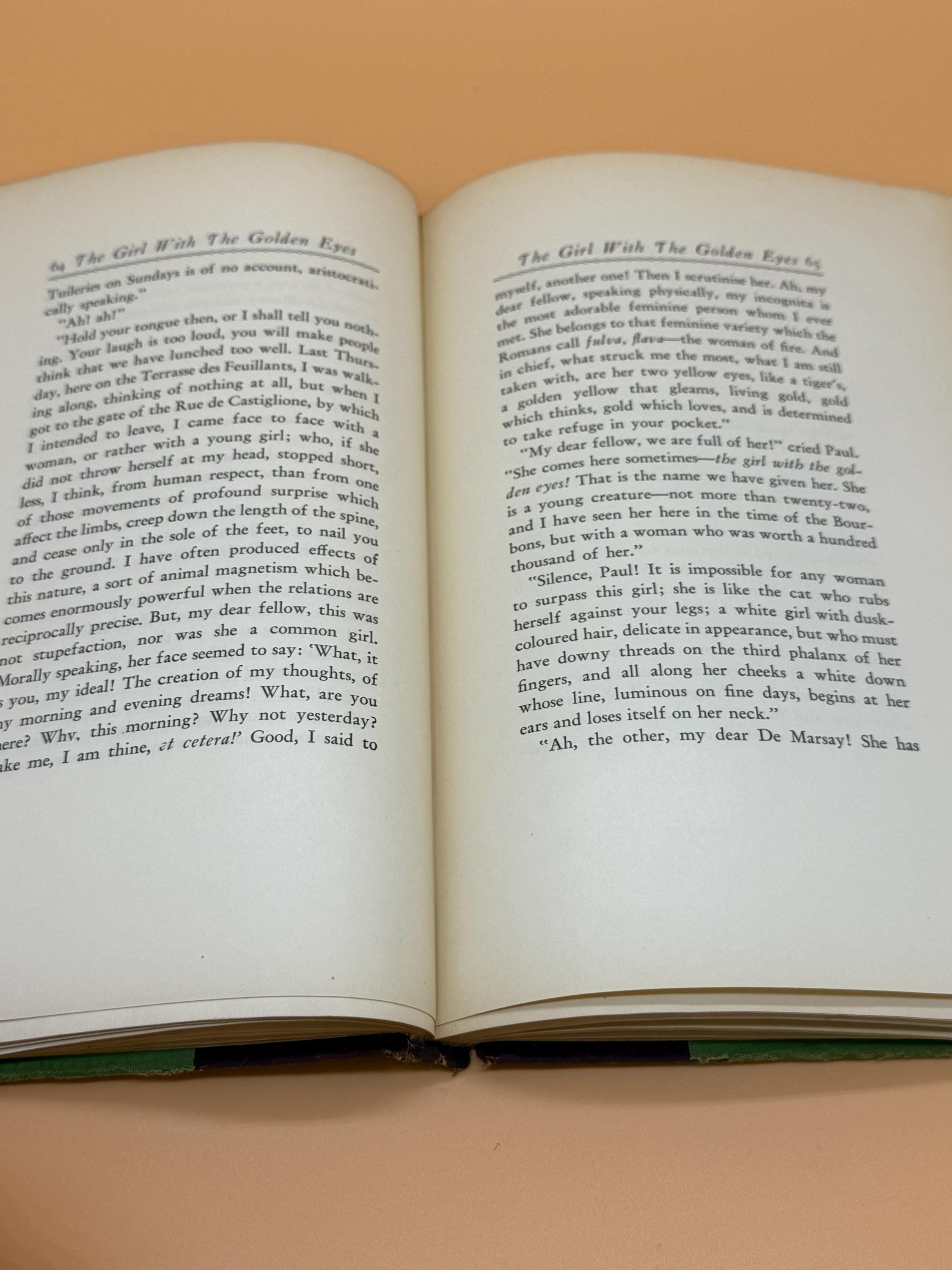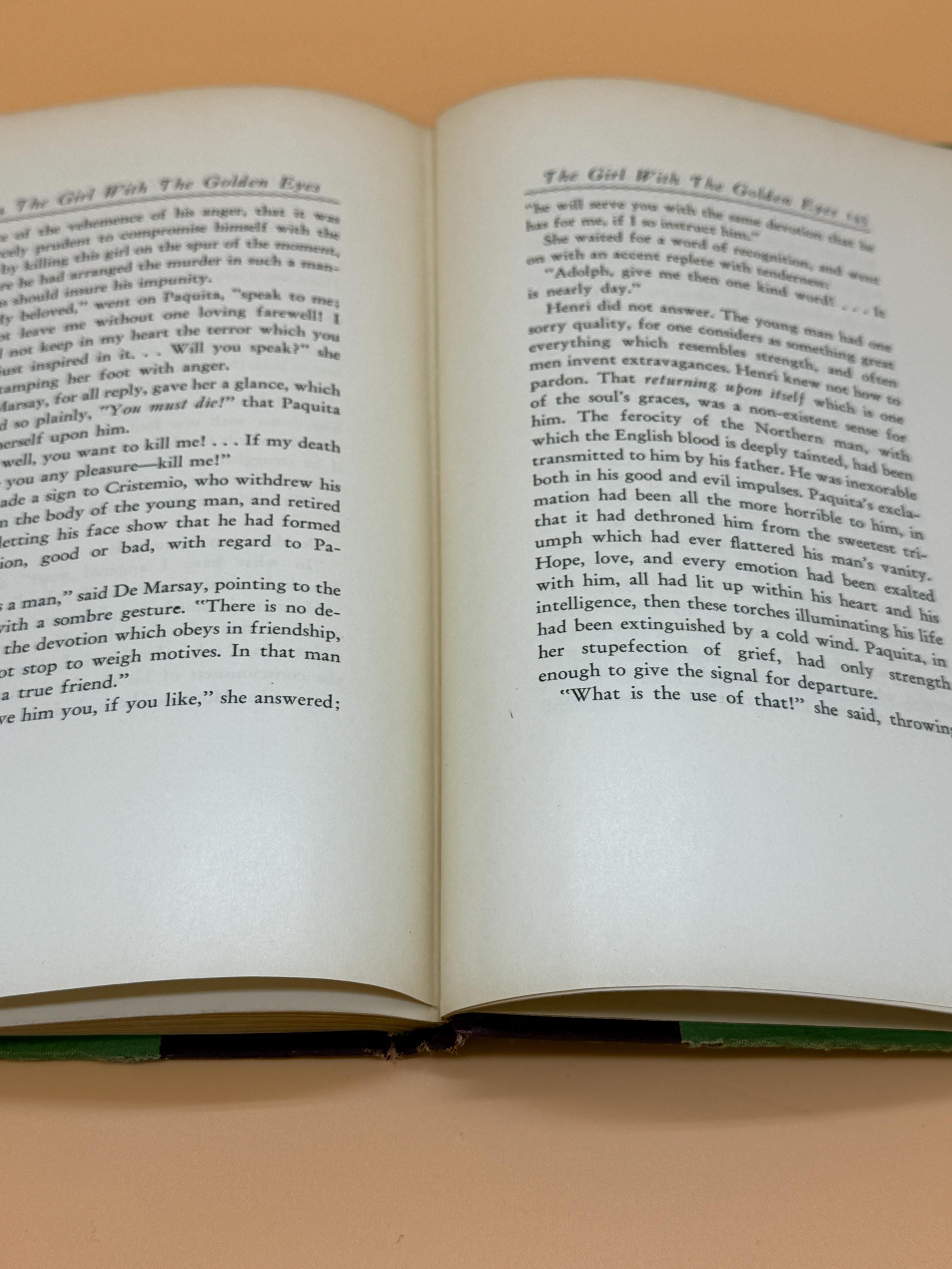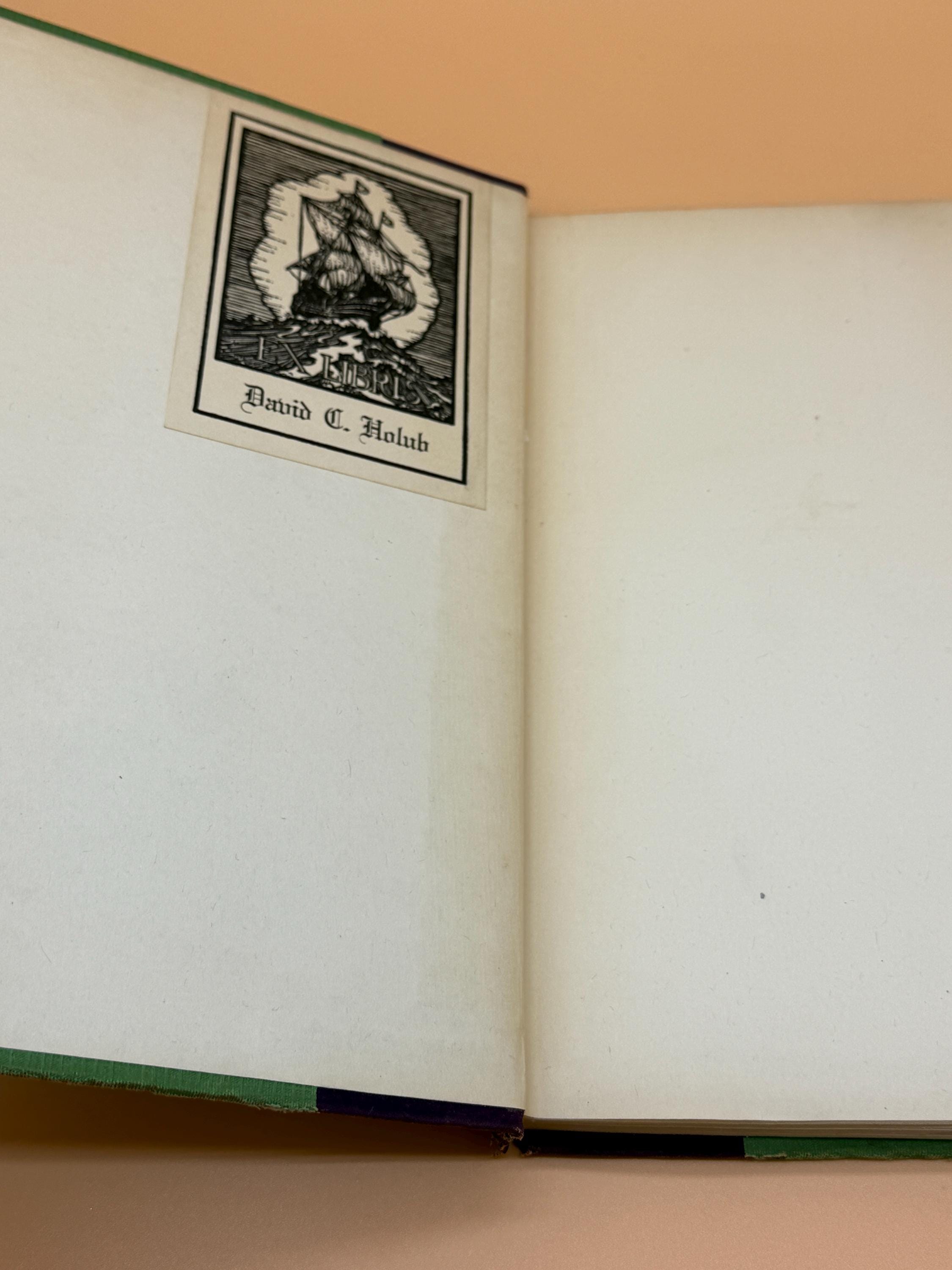 This is a good hardcover, NO slipcase as originally published. 1931 Illustrations Edition De Luxe. this copy is good inside and out. There is light natural tanning to pages from age but they are clean. NOTE: previous owners bookplate neatly placed inside front cover. The binding is tight and straight with the only hint of separation being inside back cover, see photo, and affects only the inside back page and binding. Rest of pages tight to binding throughout. Green hardcover boards are good and solid and feature purple quarter trim. The hardcover boards are clean with light shelf wear mostly corners/edges. NOTE: the title/author lettering along spine is faded off. Medium octavo book size or 6.5" x 9.5" with 154 pages.