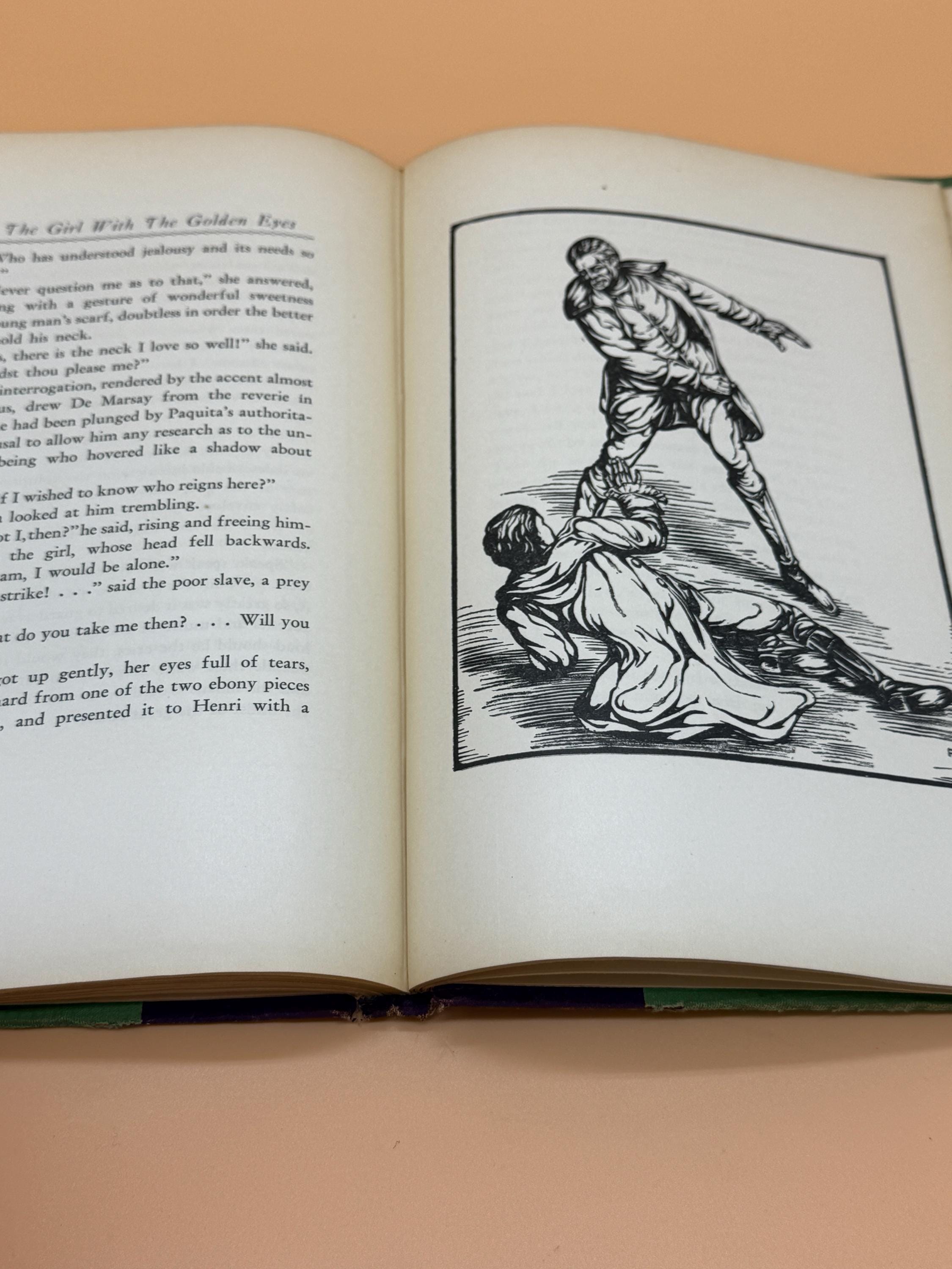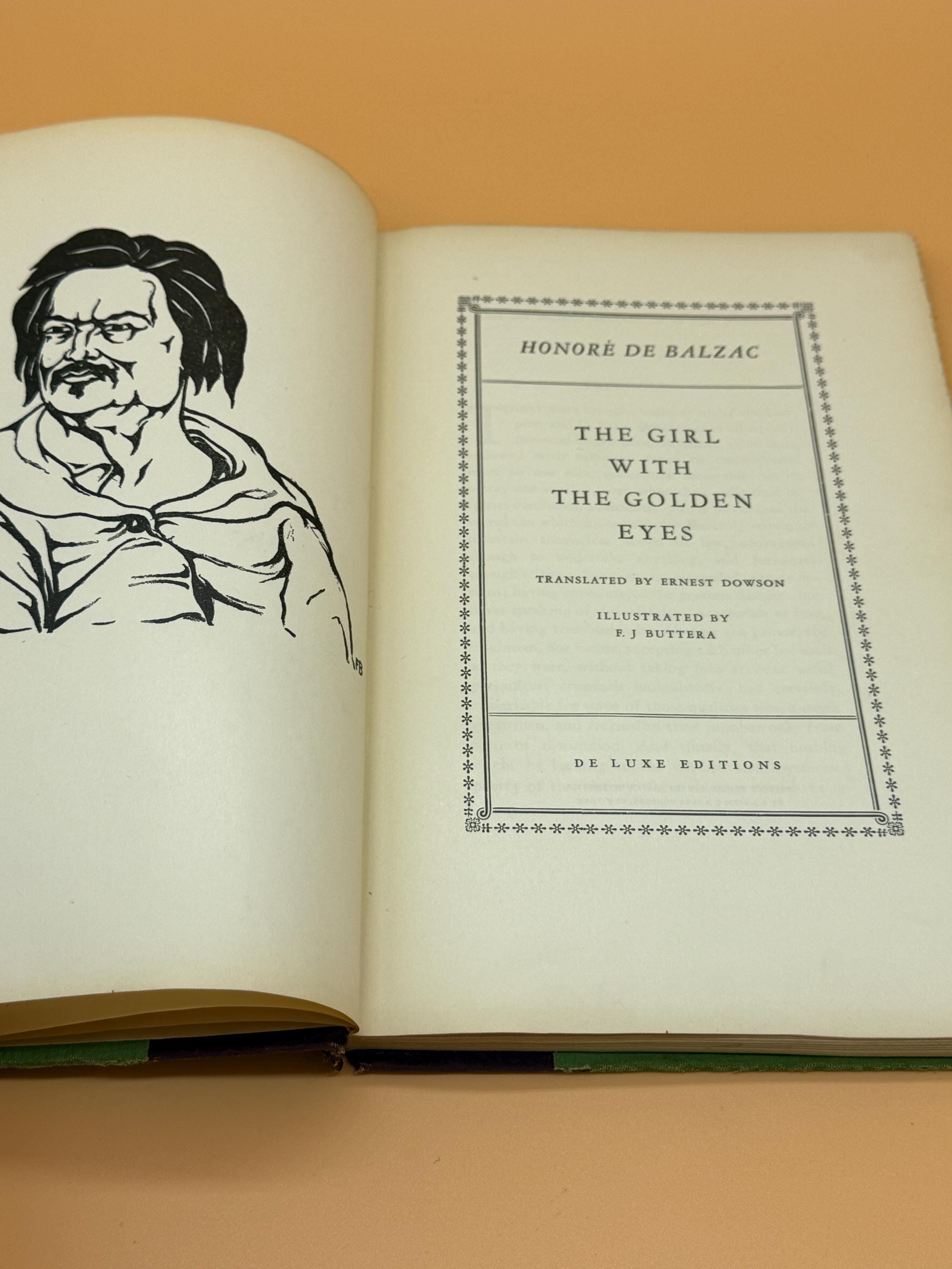 The Girl With The Golden Eyes by Honoré De Balzac is a novella originally published in 1835. The short novella is about a young Parisian named Henri de Marsay. He becomes infatuated with a mysterious woman known only as the girl with the golden eyes. It is considered one of Balzac's finest works. In the story, Henri is obsessed and intent on breaking into a formidable fortress to pursue the girl. Once he attains his goal he learns something ominous and bloodshed ensues. This edition is finely illustrated by F.J. Buttera