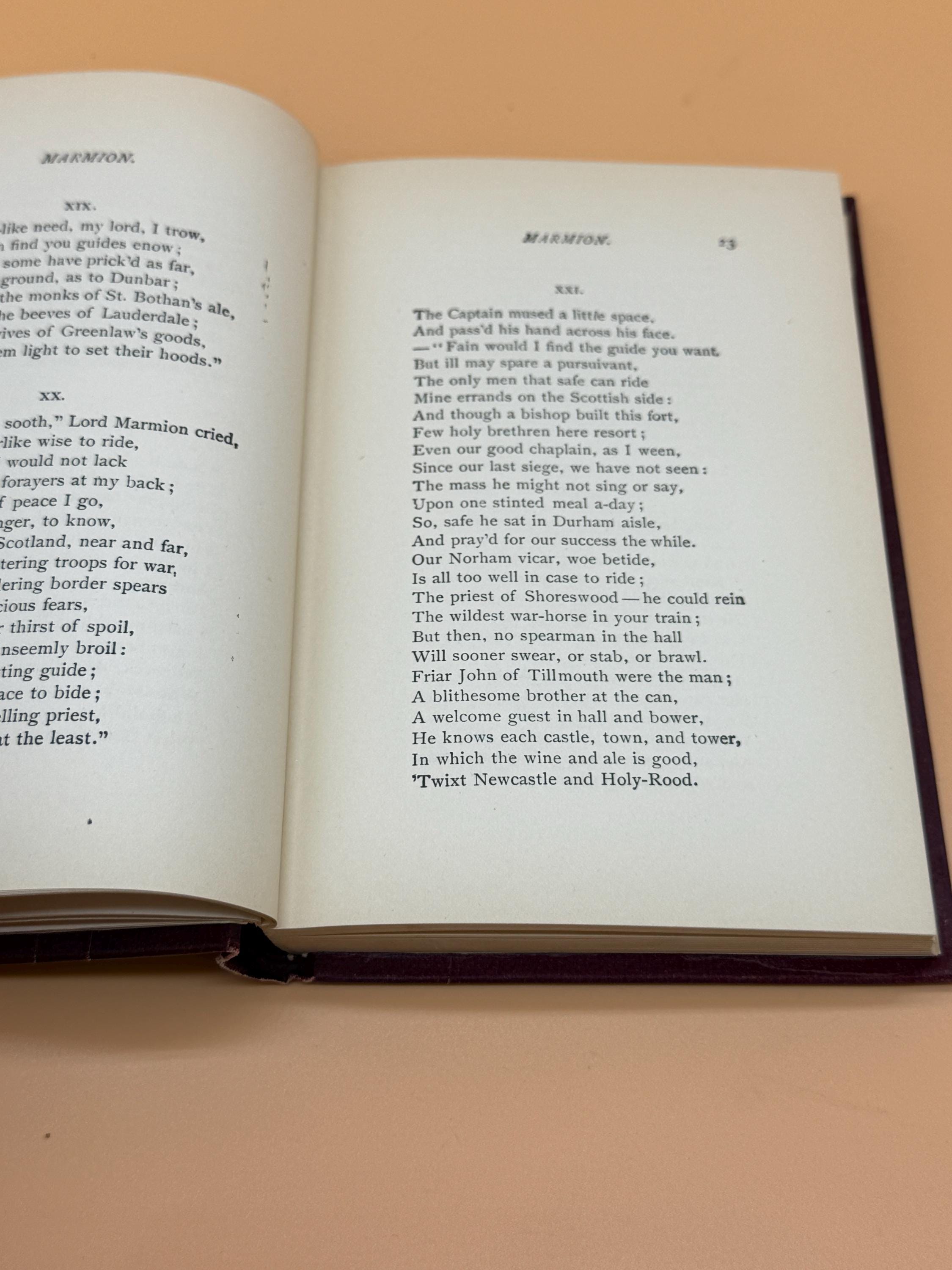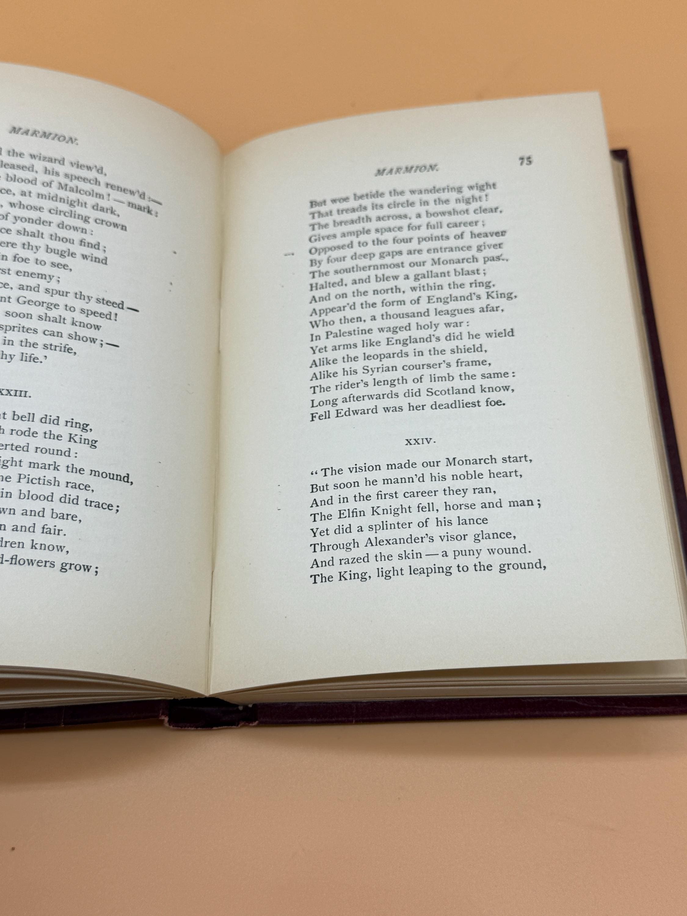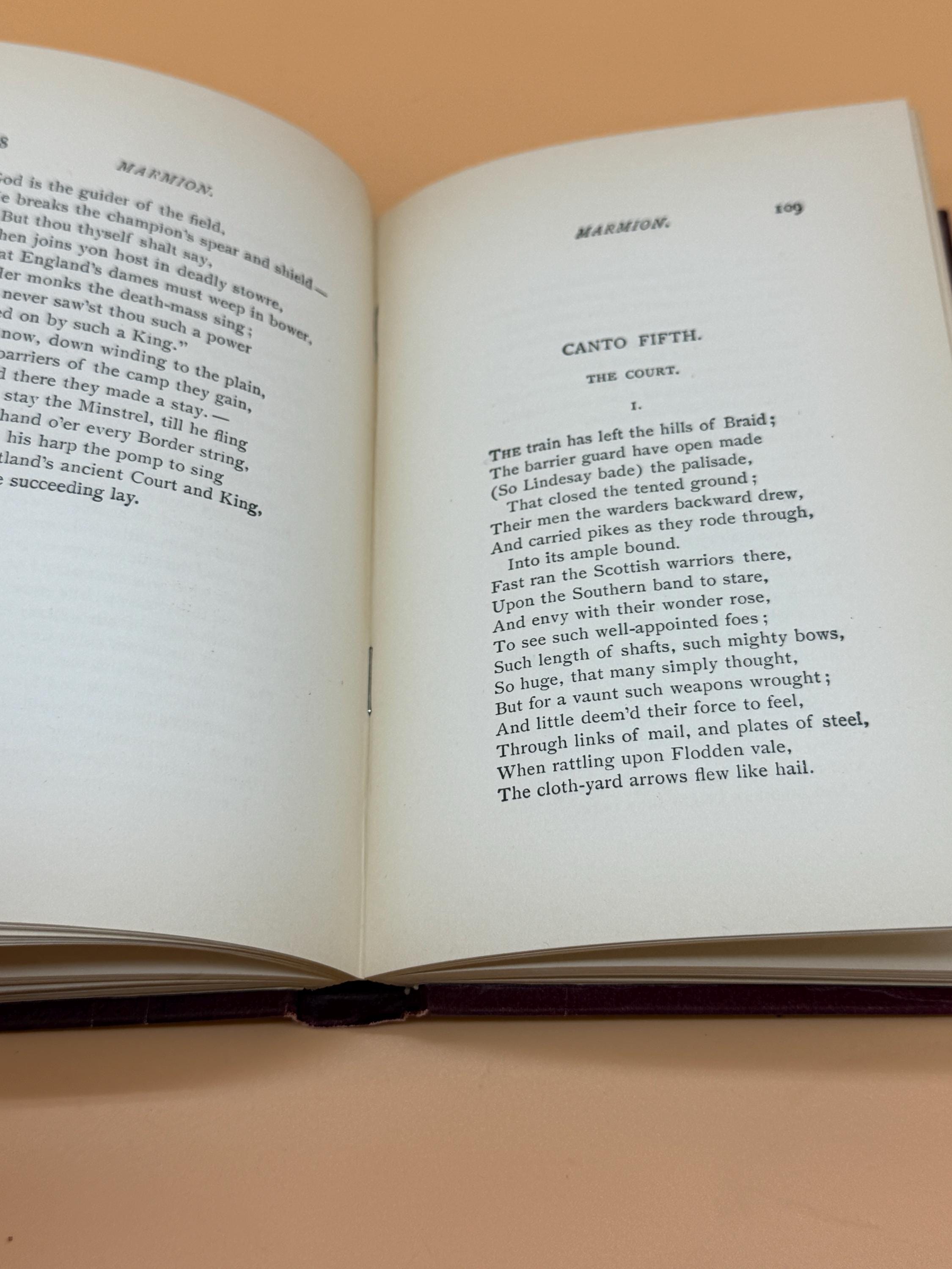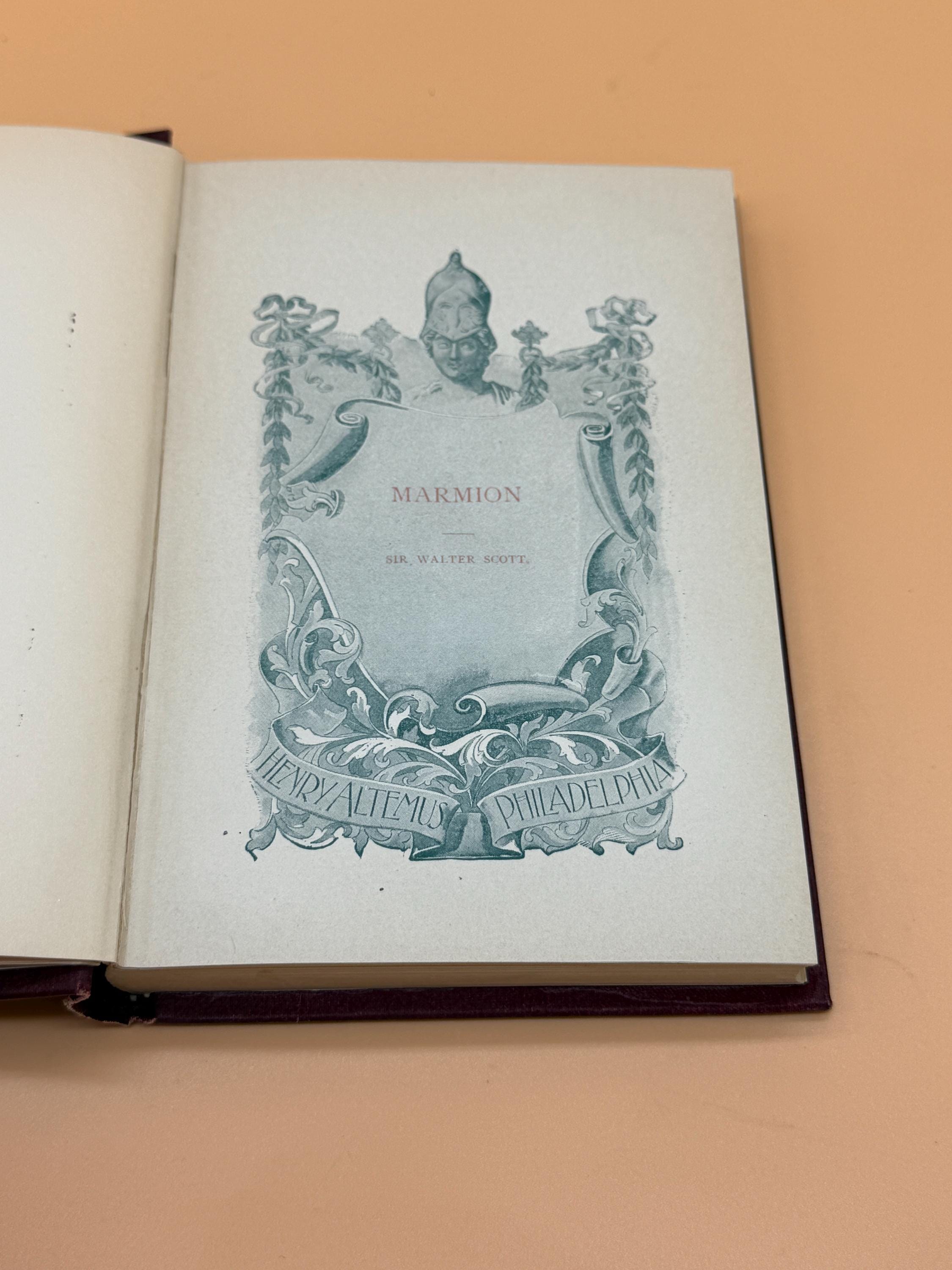 This is a very good small hardcover. No specific publishing date but believed circa 1900-1910 Henry Altemus Publishing. Decorated Edition. This copy is very good inside and out. The inside pages are very good and clean. Previous owners name neatly written in script on first blank page. The binding is tight and straight. Hardcover boards are also very good with only very light shelf wear and feature gold filigree design front, back and spine. Small hardcover, 16mo book size or 4" x 6.5" with 194 pages. These Henry Altemus decorative binding edition of classic literature were designed to be small handsome "pocket" editions meant to be carried around in purse or pocket for reading anywhere. Illustrated frontispiece of Sir Walter Scott.