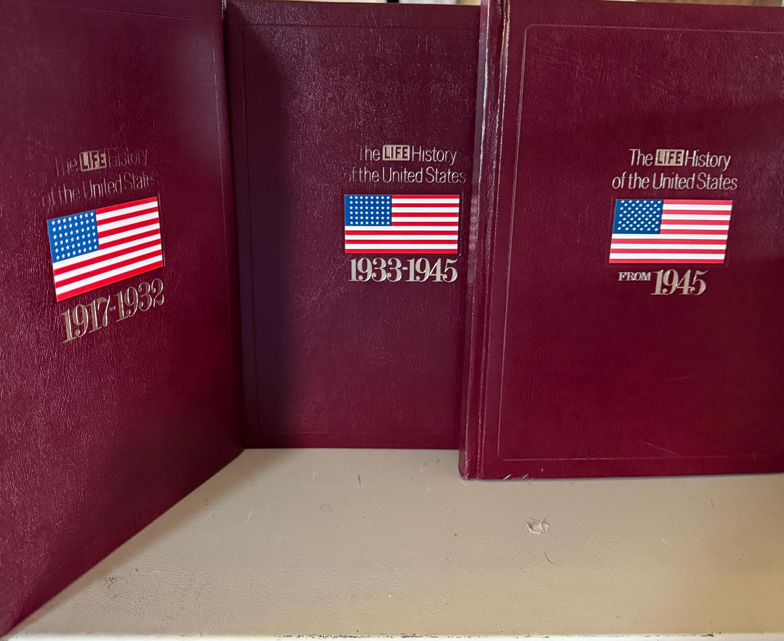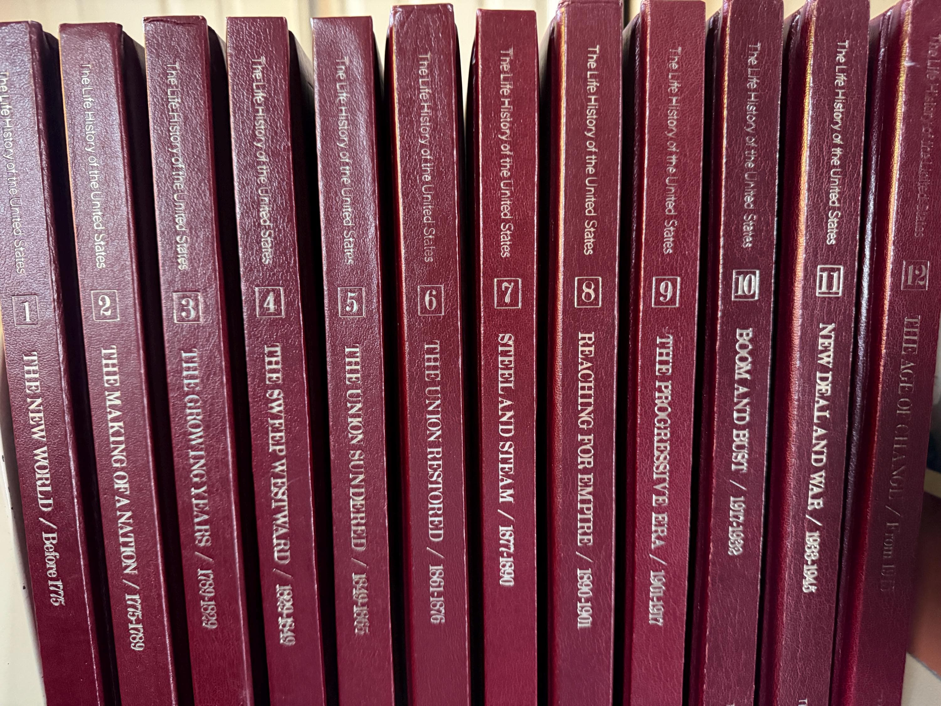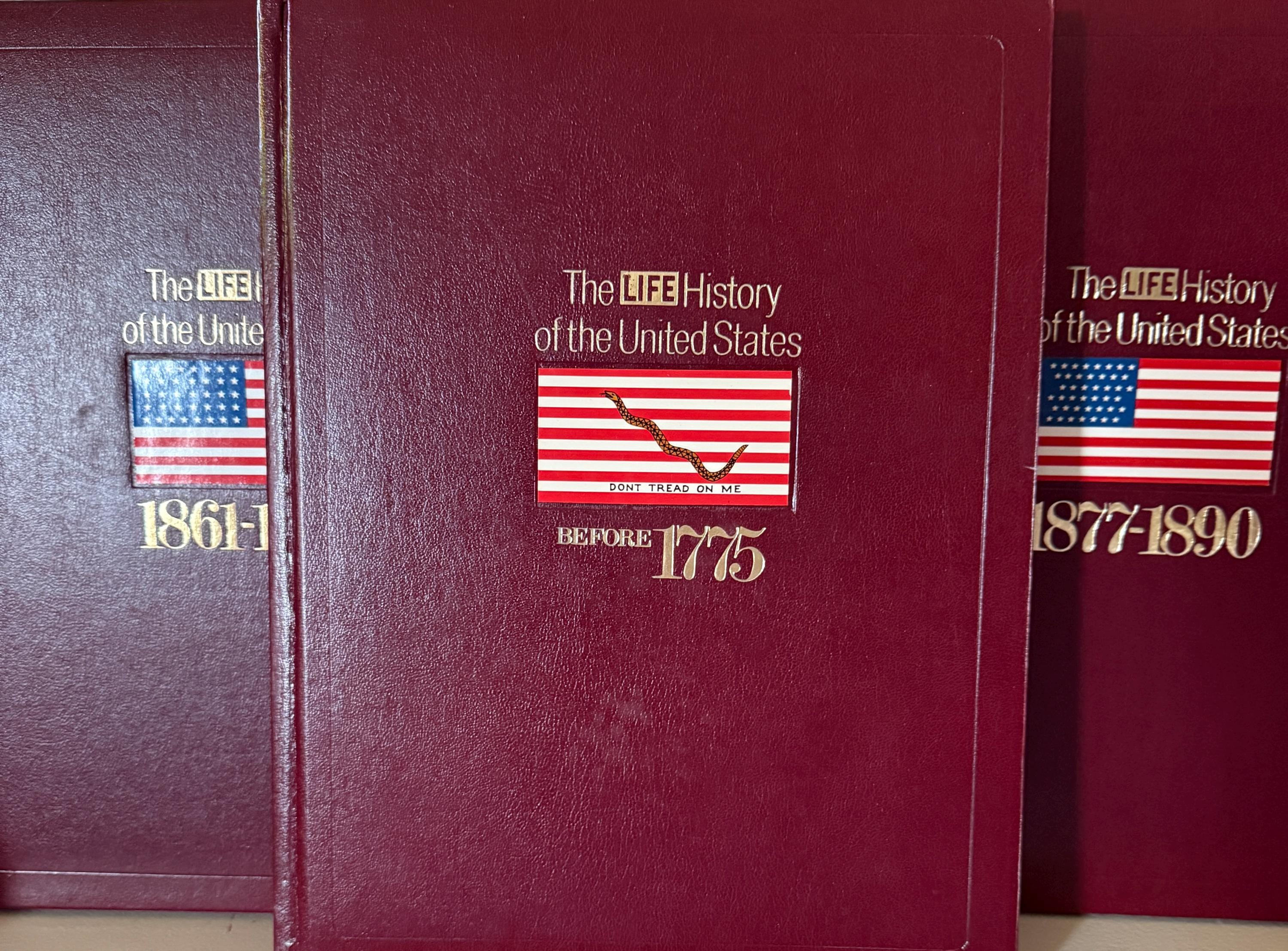 The Life History of the United States was originally published by Time Life Books in 1963. This set is the 1975 reprint. It consists of 12 volumes all bound in maroon leather-like padded covers for a fine binding look. The title list of the 12 volumes is as follows; Volume One The New World Before 1775, Volume Two The Making of a Nation 1775-1789, Volume Three The Growing Years 1789-1829, Volume Four The Sweep Westward 1829-1849, Volume Five The Union Sundered 1849-1865, Volume Six The Union Restored 1861-1876, Volume Seven Steel and Steam 1877-1890, Volume Eight Reaching For Empire 1890-1901, Volume Nine The Progressive Era 1901-1917, Volume Ten Boom and Bust 1917-1932, Volume Eleven New Deal and War 1933-1945 and Volume Twelve The Age of Change From 1945.