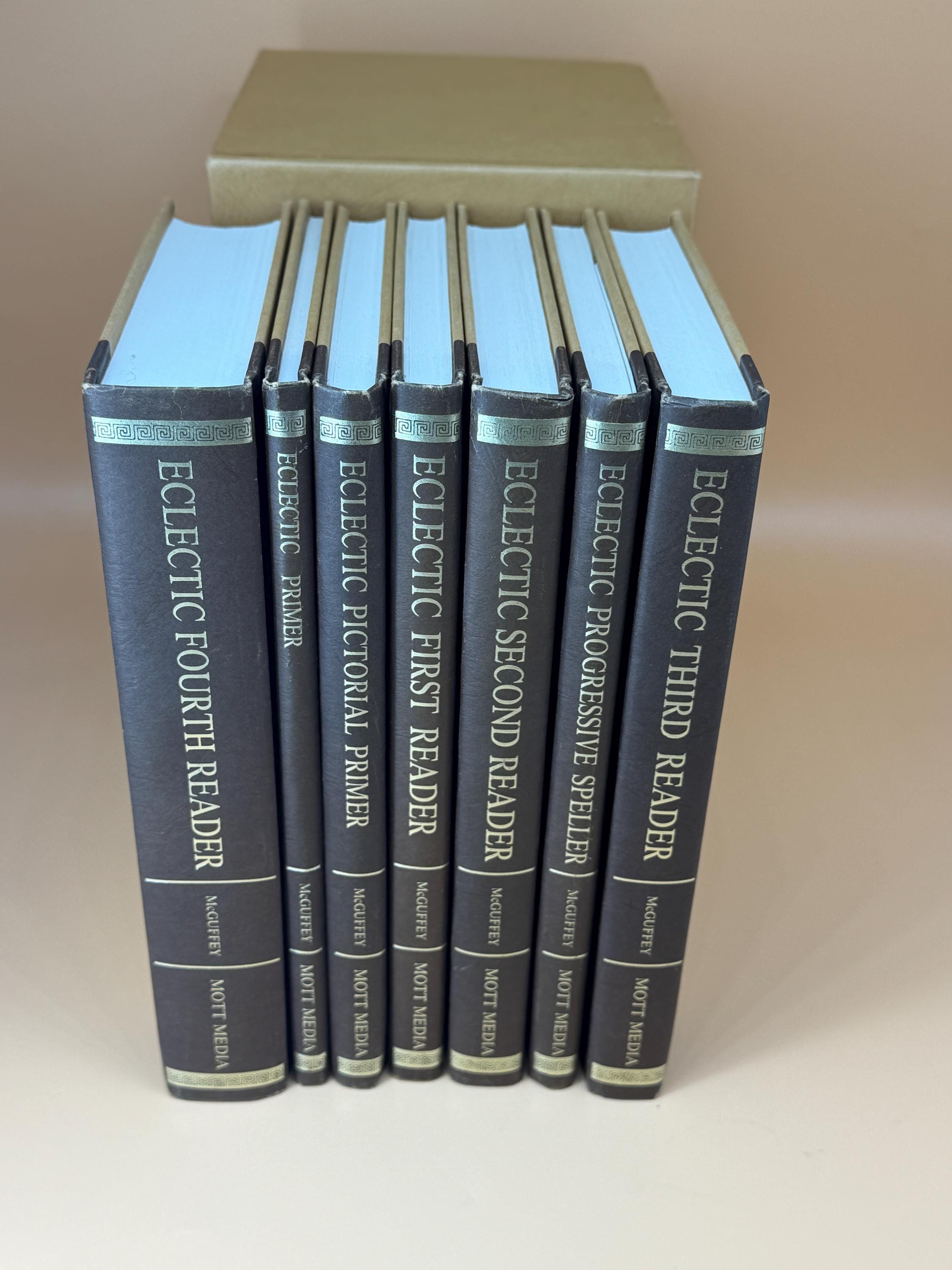 The set contains the following volumes; Eclectic Primer, Eclectic Pictorial Primer, Eclectic First Reader, Eclectic Second Reader, Eclectic Third Reader and Eclectic Fourth Reader.