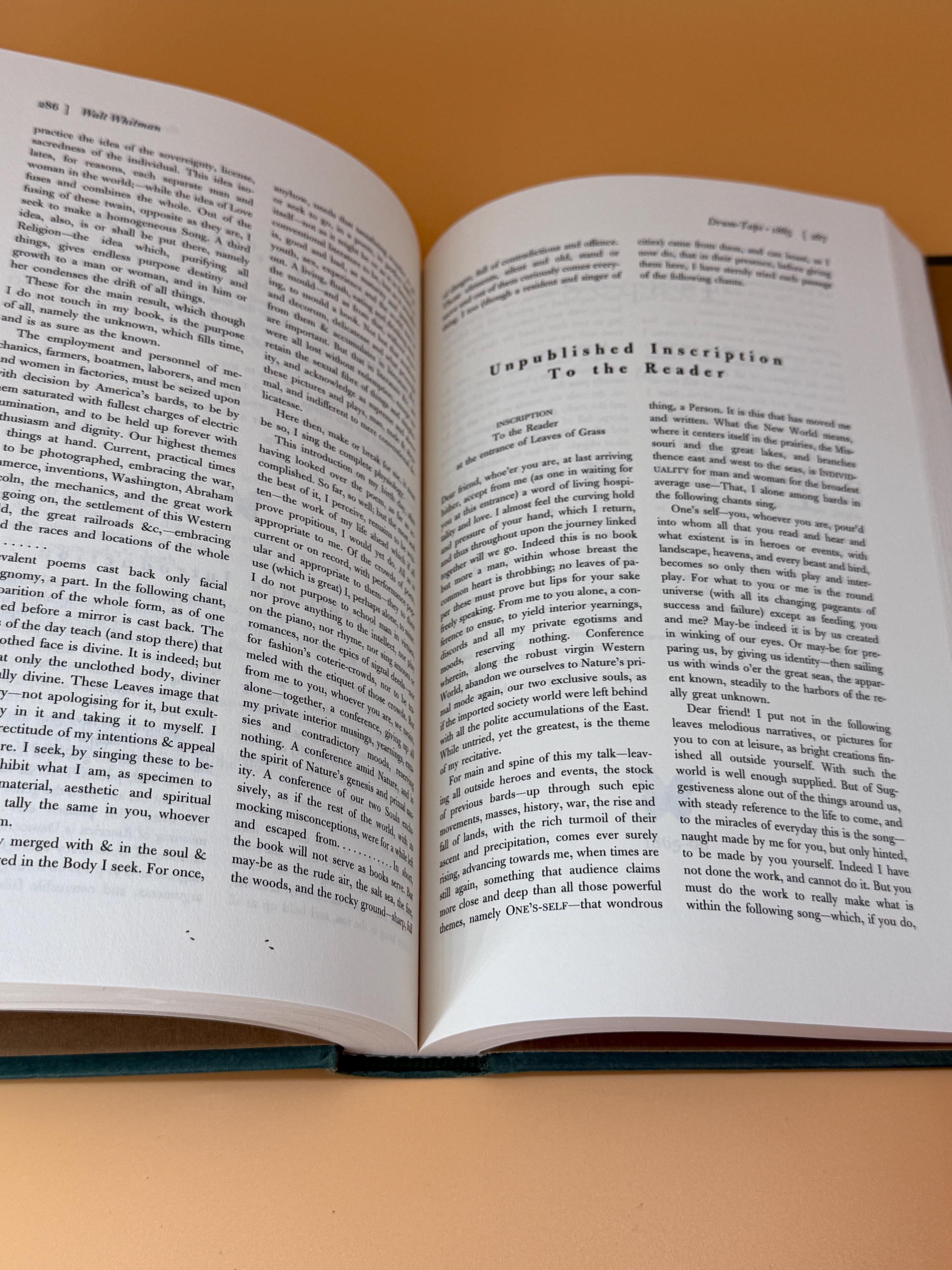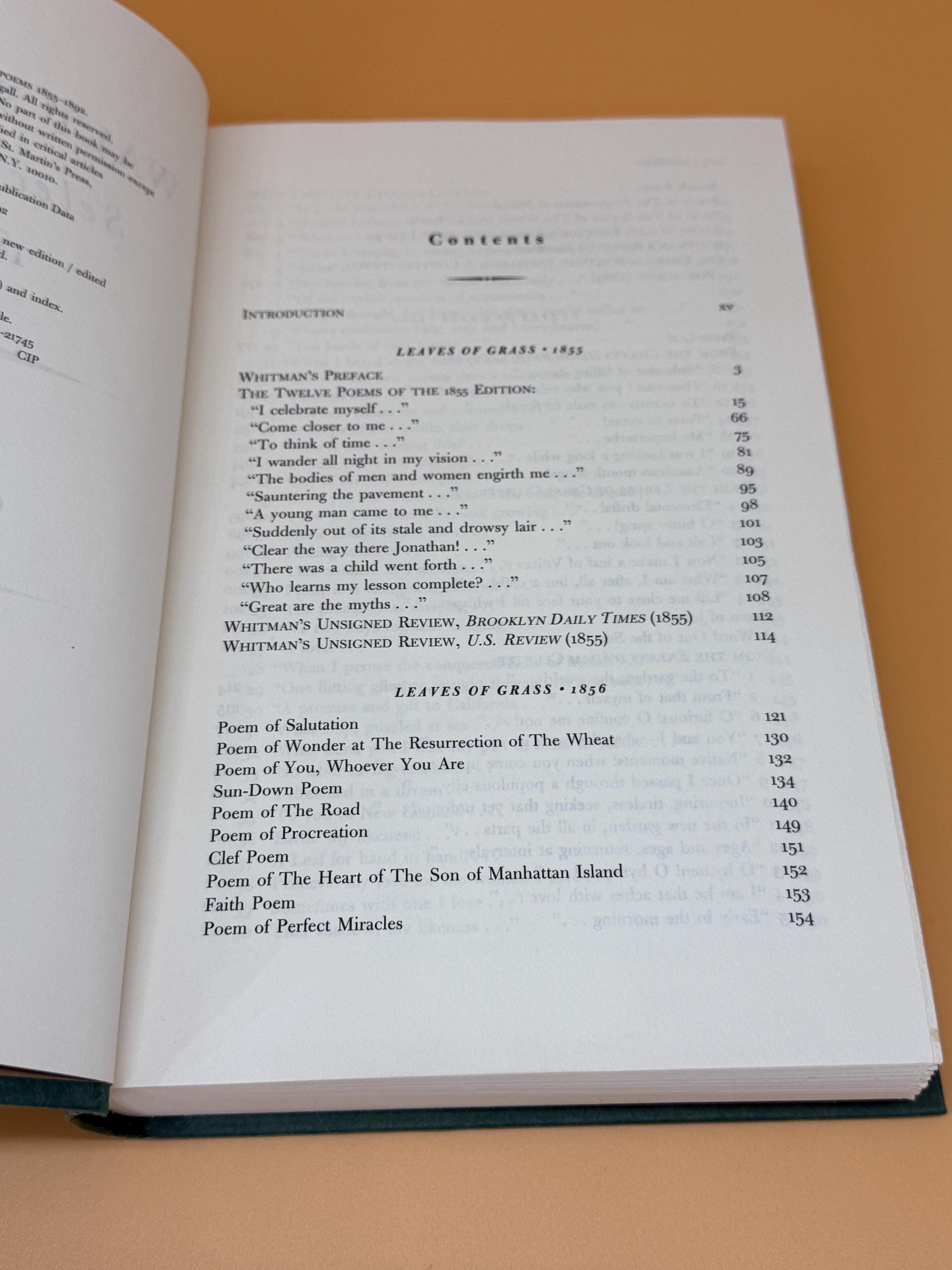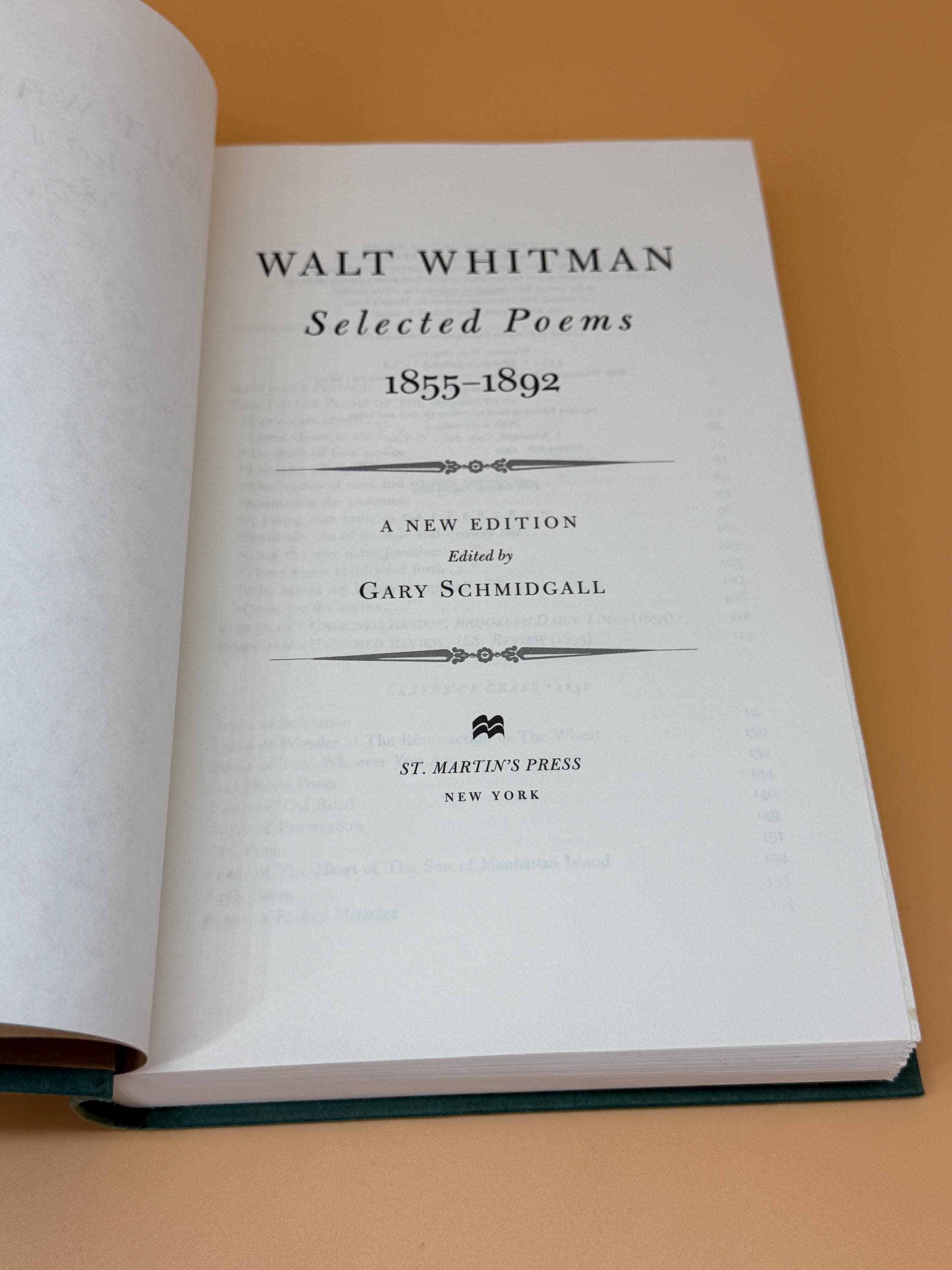 Walt Whitman Selected Poems 1855-1892 is a new edition edited by Gary Schmidgall. It contains a large collection of poems along with many extras including; Appendices of Poems Published Before "Leaves" or posthumously, Significant Passages from Whitman Manuscripts, Whitman's Observations on Leaves of Grass 1888-1892, Contemporary Review of Leaves of Grass, A Whitman Chronology, Notes on the Poems, A Select Whitman Bibliography, and Index of Titles.