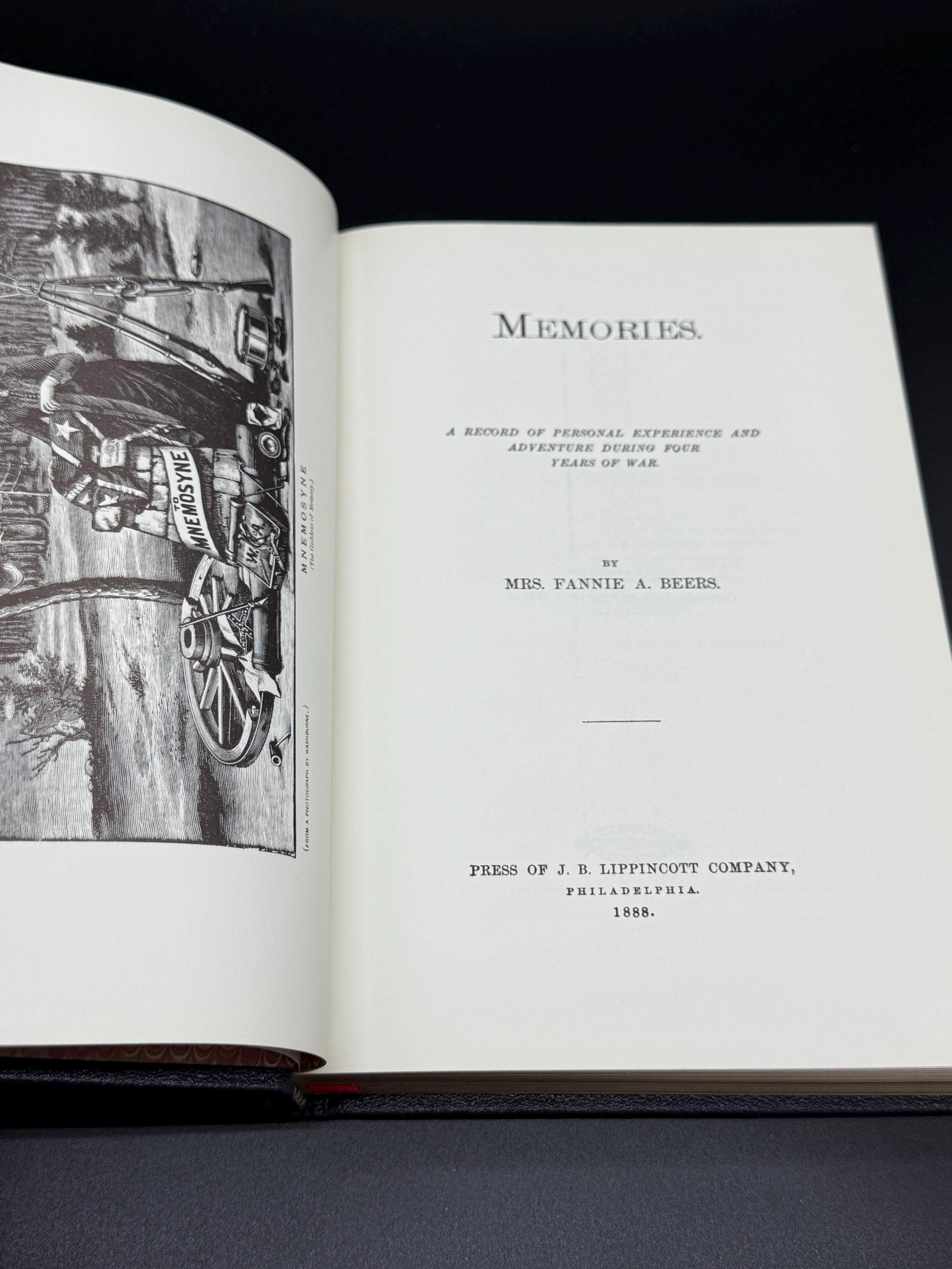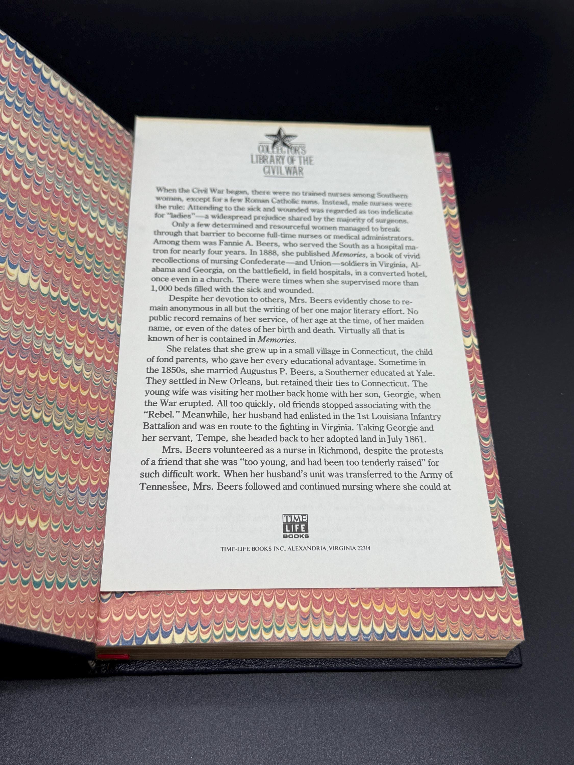 This edition from Time Life Collectors Library of the Civil War series is Memories by Fannie A Beers. It is subtitled A Record of Personal Experience and Adventure During Four Years of War. When the Civil War began there were no trained nurses among Southern women. A few determined women managed to break through the men-only nurse corp. Among them was Fannie A. Beers. In 1888 she published Memories. It was a recollection of treating Union and Confederate soldiers during the war. At one time she supervised over 1000 beds filled with sick and wounded.