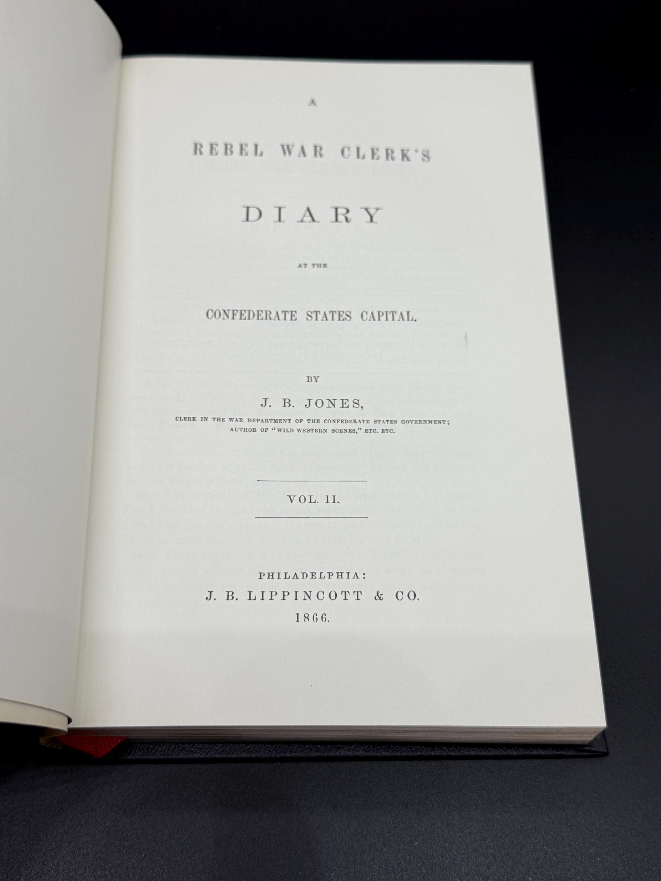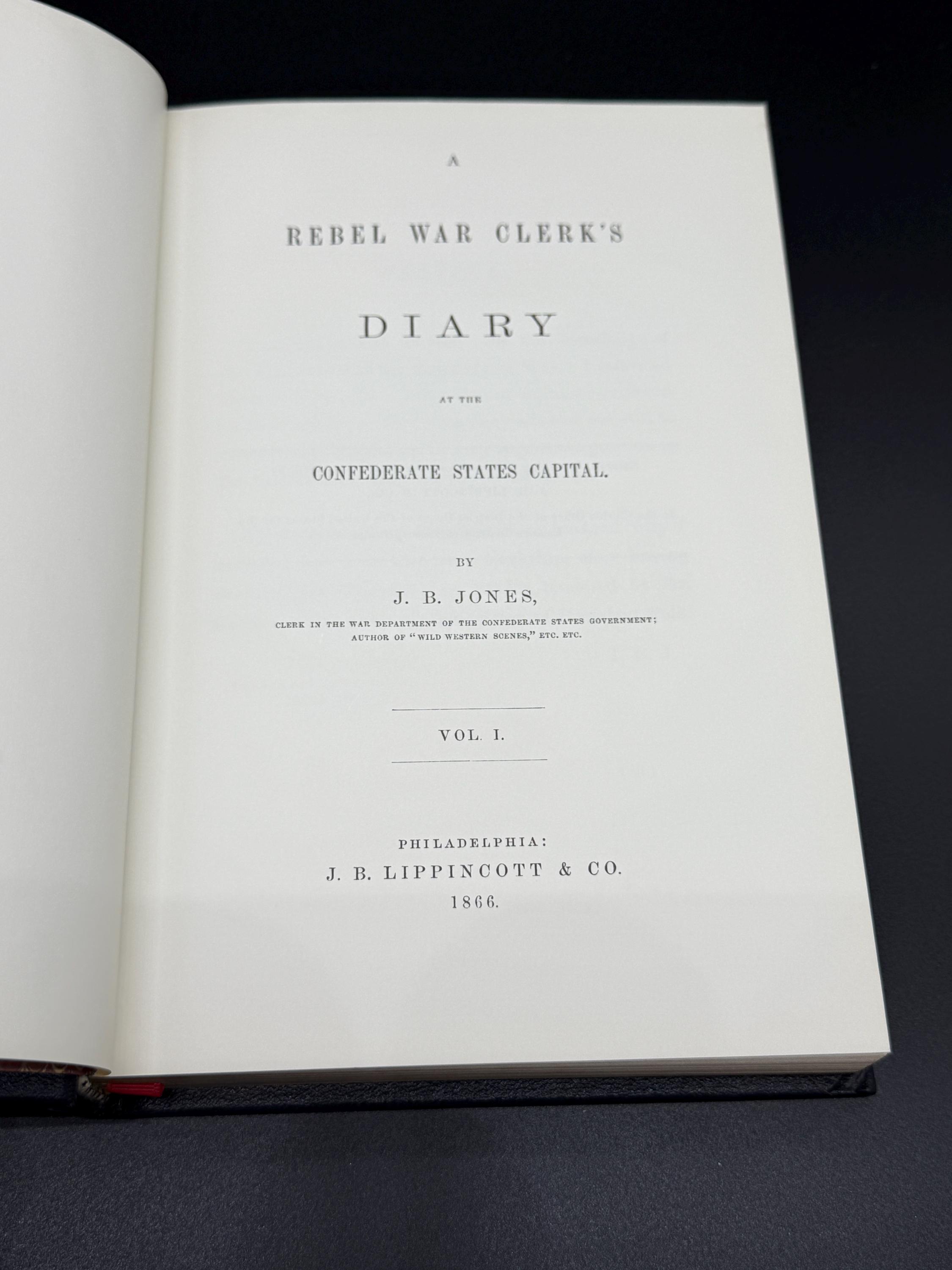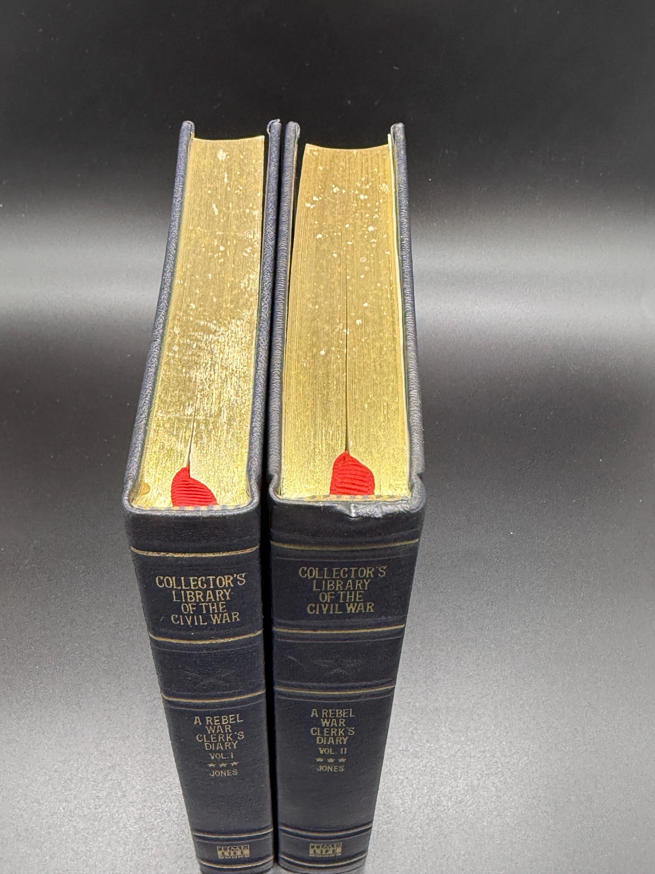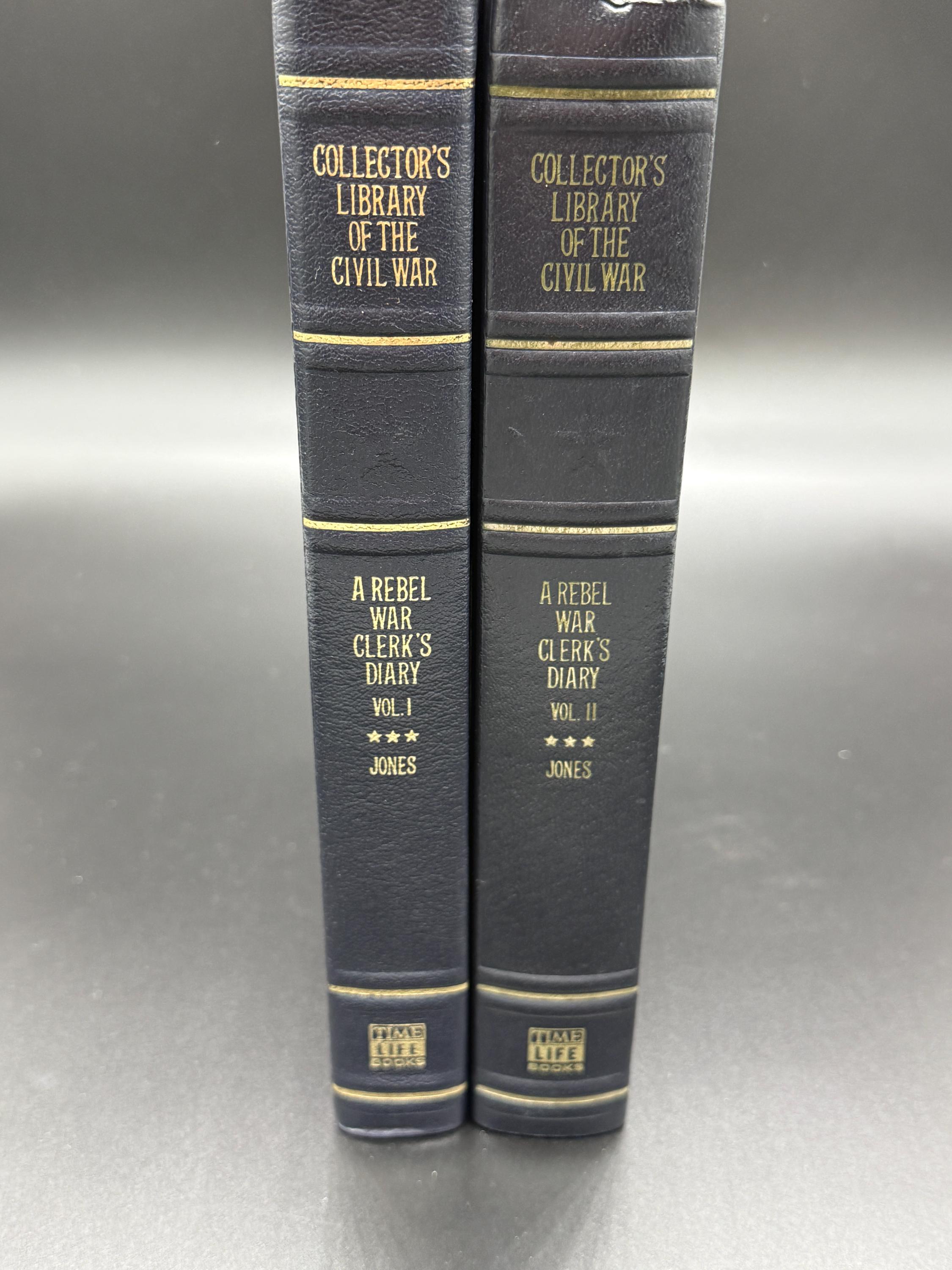 This edition of The Collectors Library of the Civil War is a 2 volume set, A Rebel War Clerks Diary Vol 1 & 2. The author, John Beauchamp Jones spent much of his life striving for literary fame but only gained it after his death. He wrote novels prior to becoming a clerk in the Confederate War Dept. in 1861. The diary was a record of Confederate activities and battles. Post war, Jones re-worked the diary but added assertions became a weakness. Certain passages were rewritten without proper regard for chronology. Regardless, the diary has become one of the definitive works and established his literary career.
