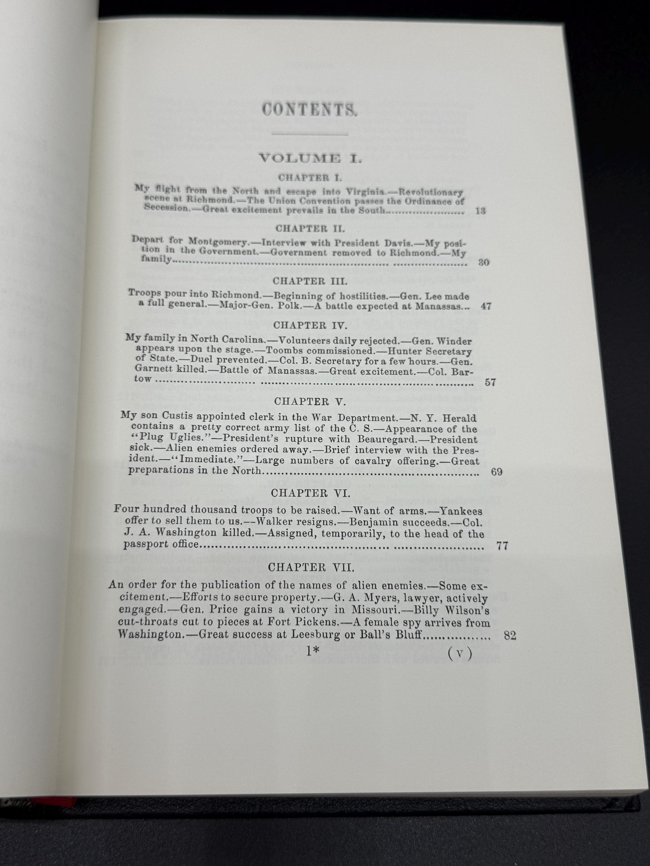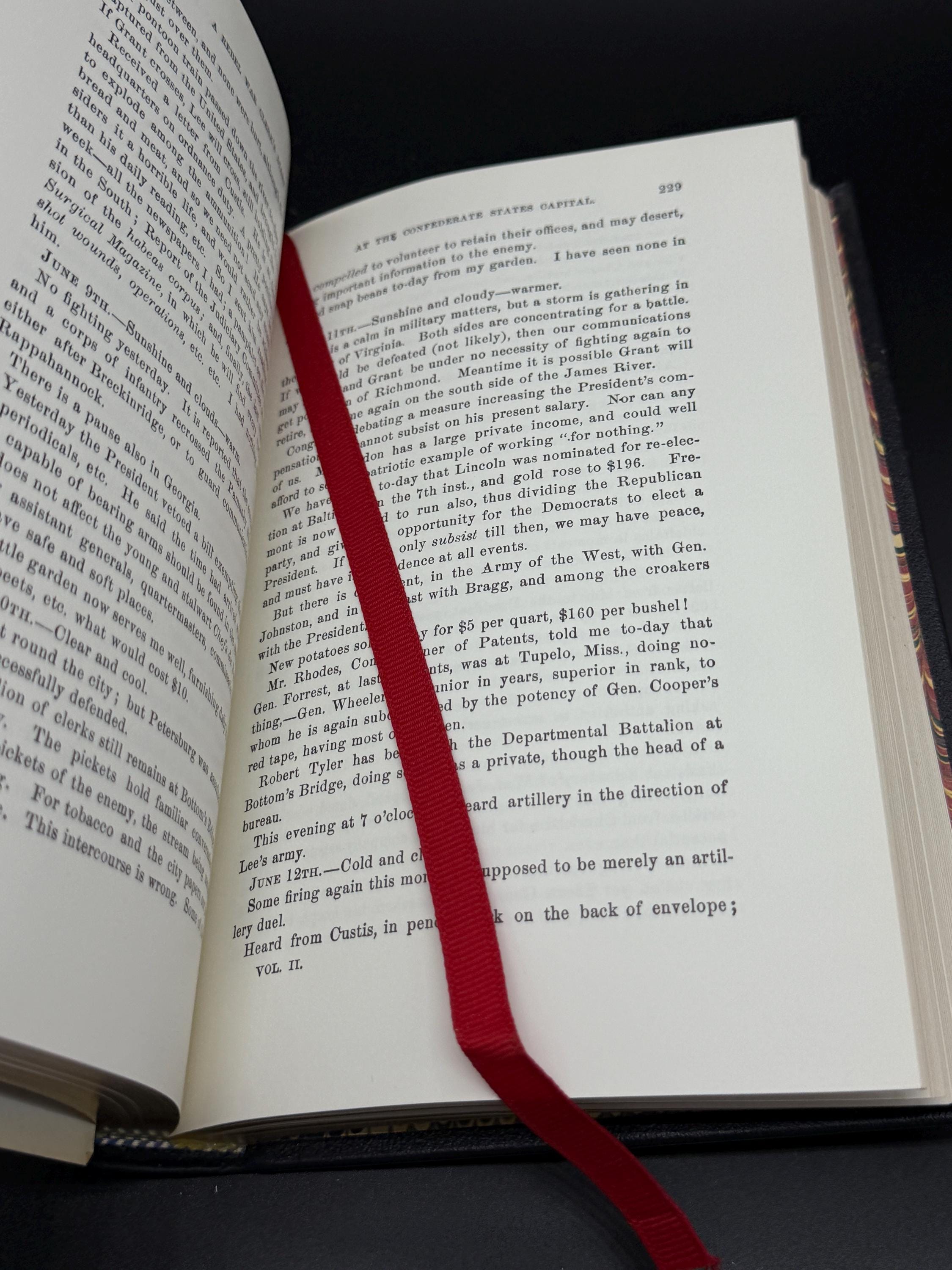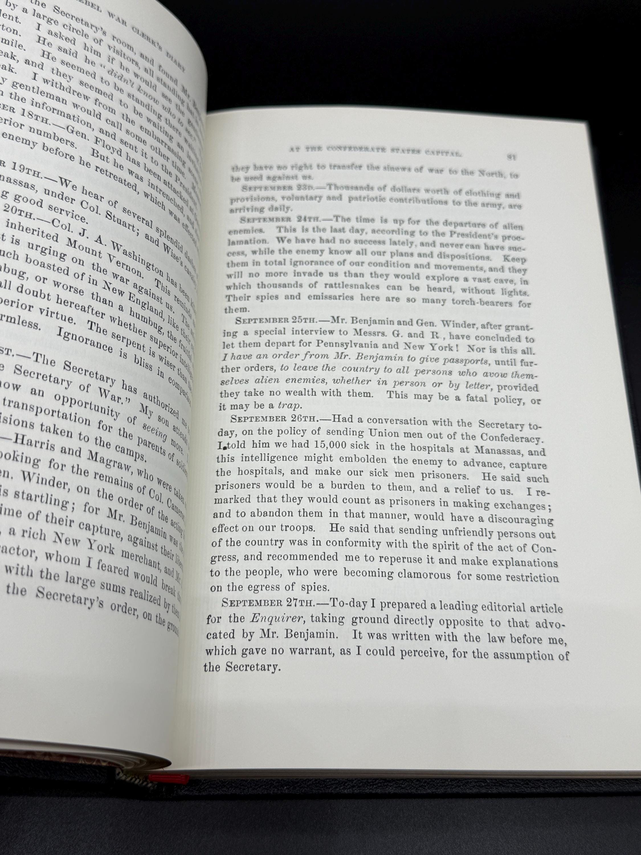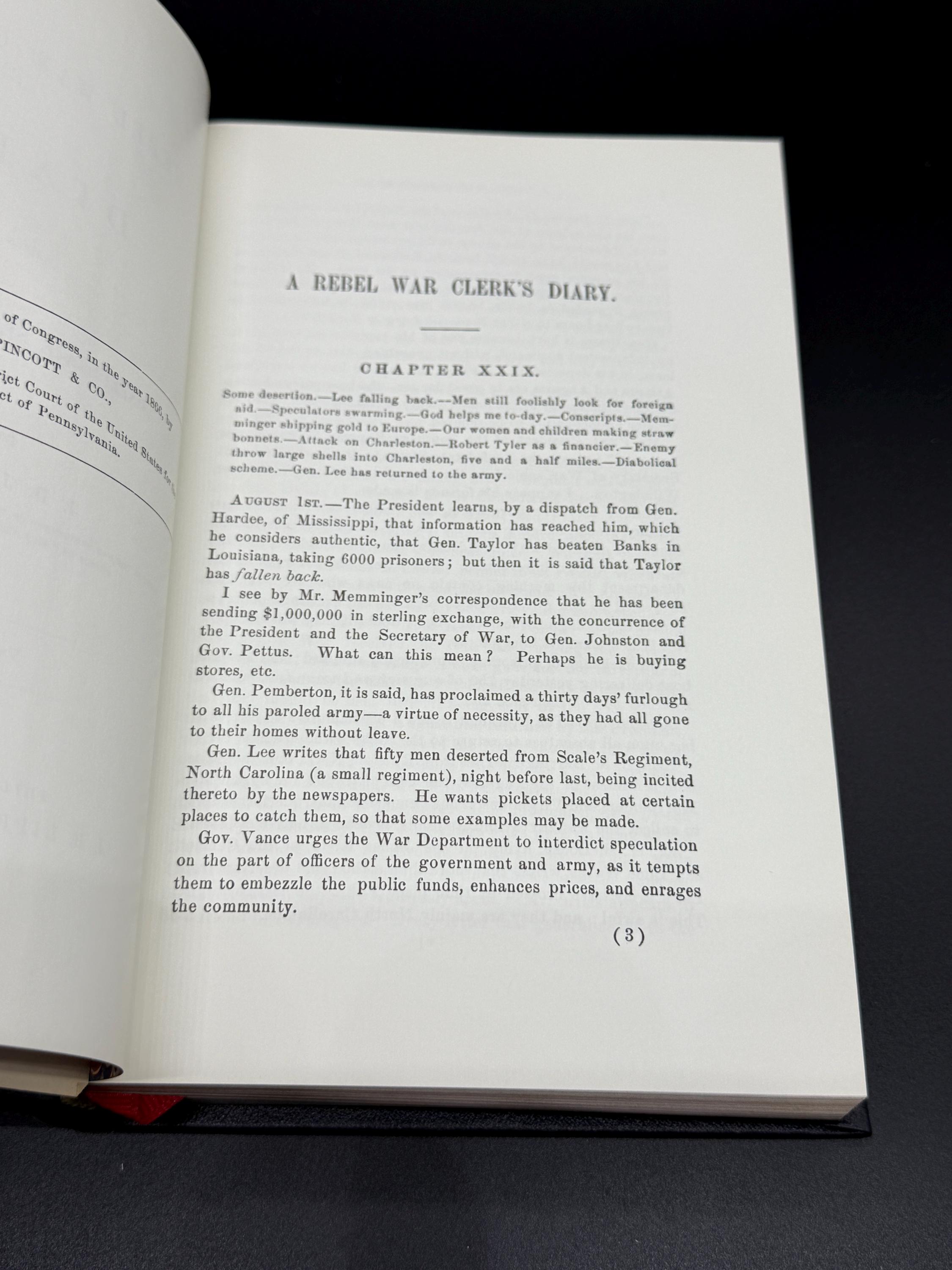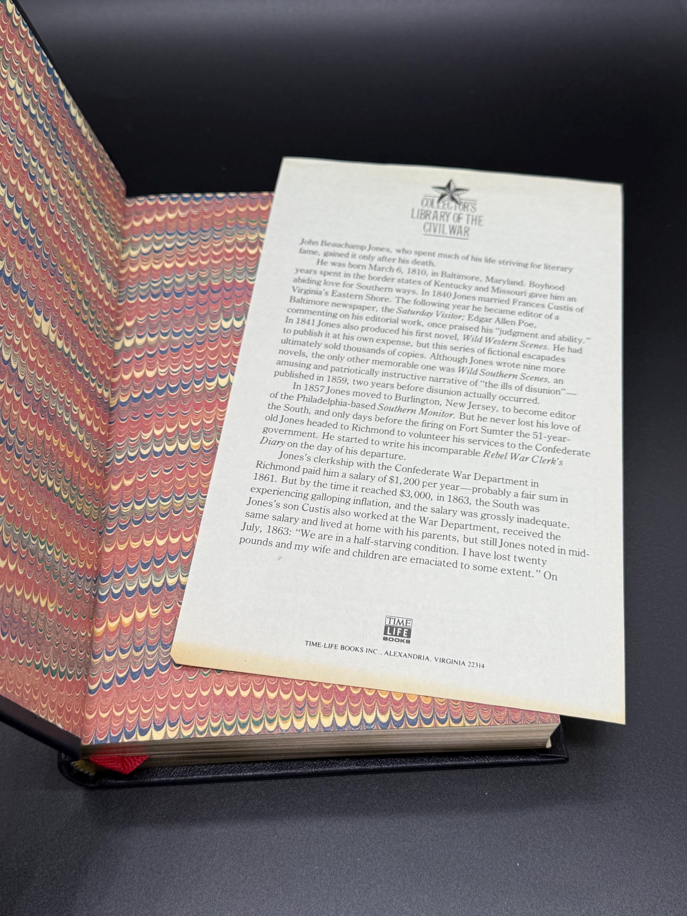 This edition of The Collectors Library of the Civil War is a 2 volume set, A Rebel War Clerks Diary Vol 1 & 2. The author, John Beauchamp Jones spent much of his life striving for literary fame but only gained it after his death. He wrote novels prior to becoming a clerk in the Confederate War Dept. in 1861. The diary was a record of Confederate activities and battles. Post war, Jones re-worked the diary but added assertions became a weakness. Certain passages were rewritten without proper regard for chronology. Regardless, the diary has become one of the definitive works and established his literary career.