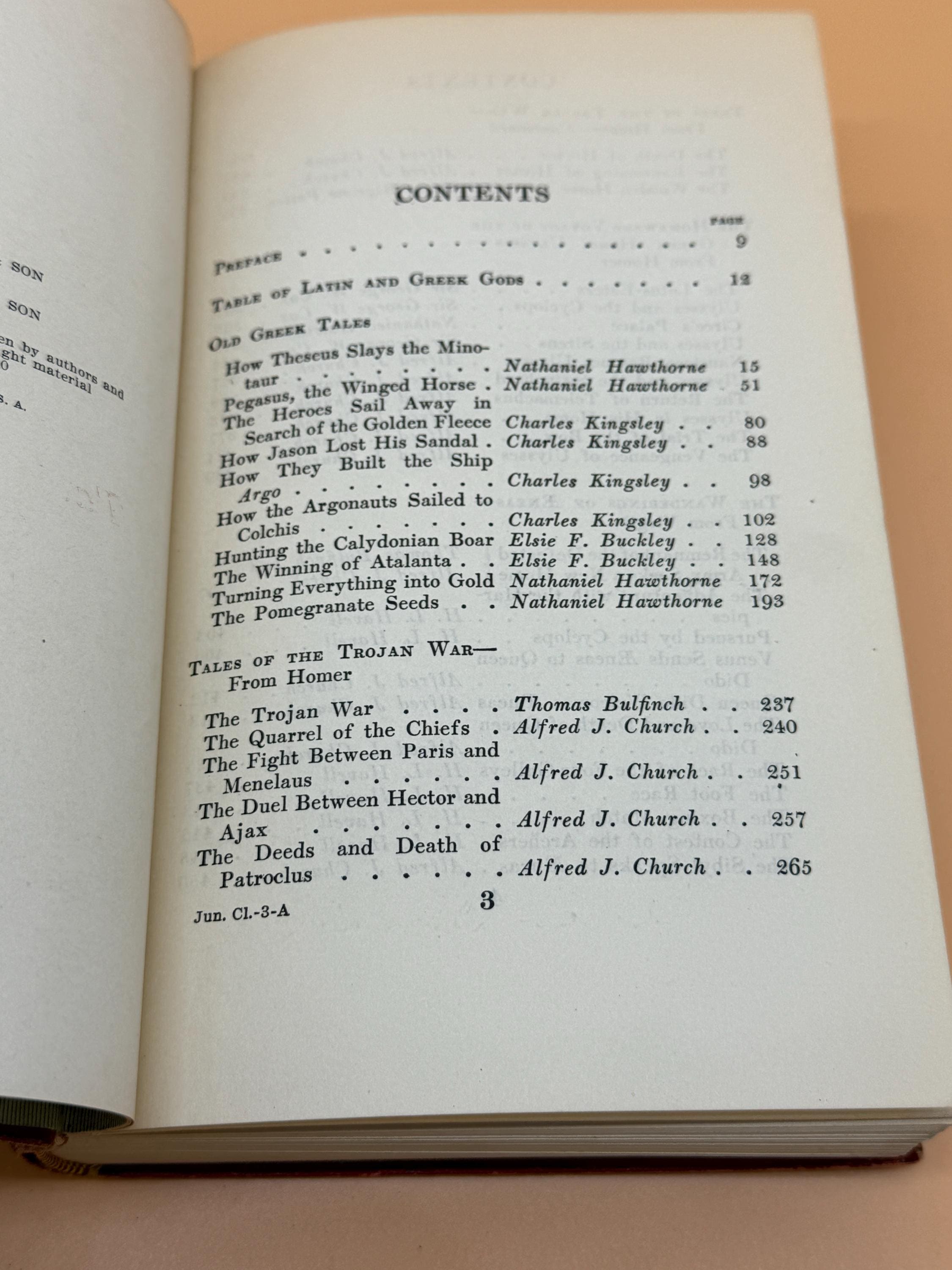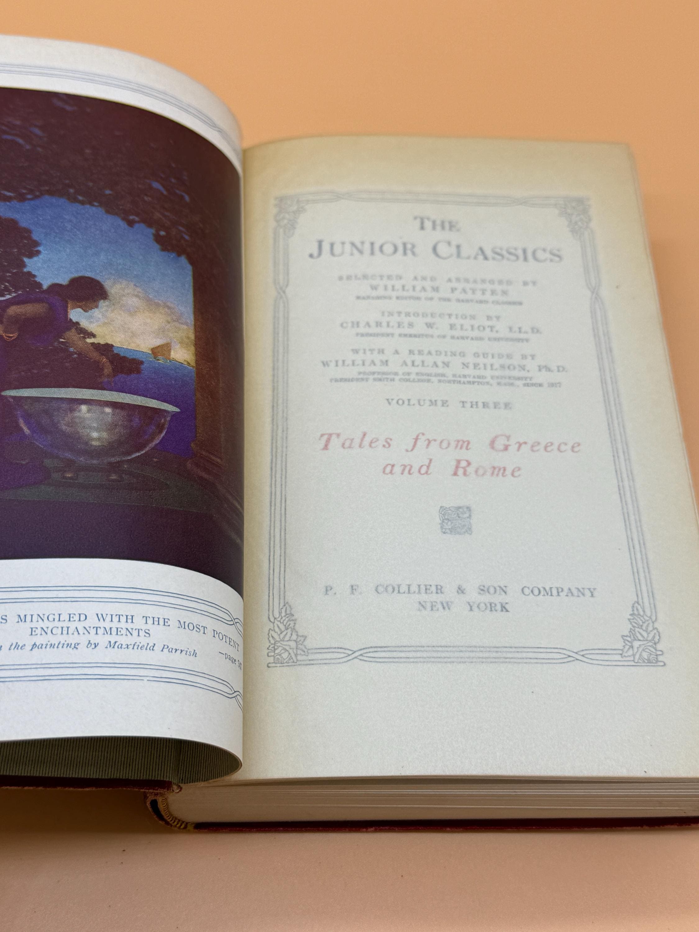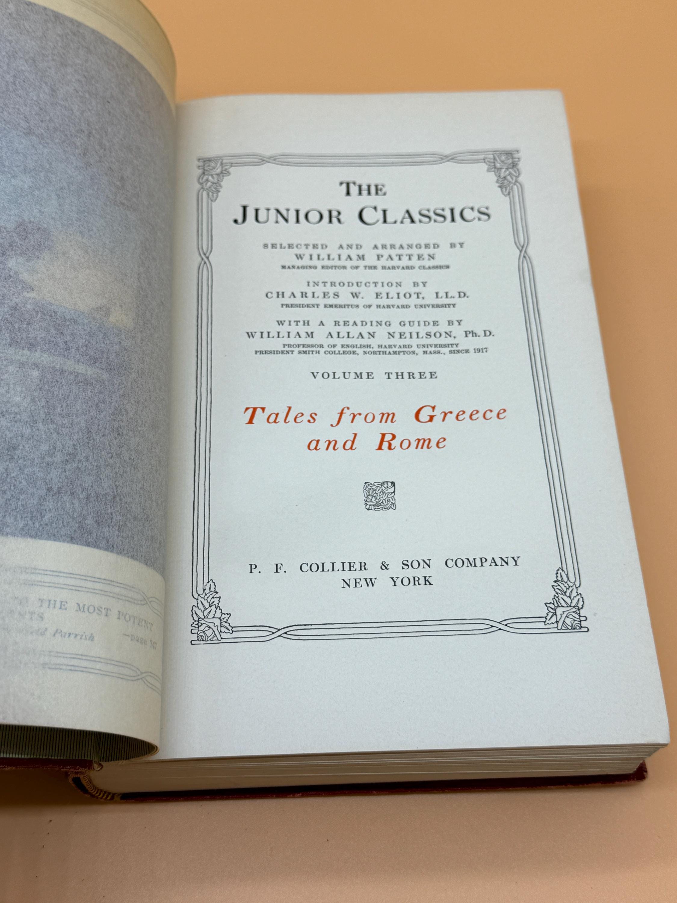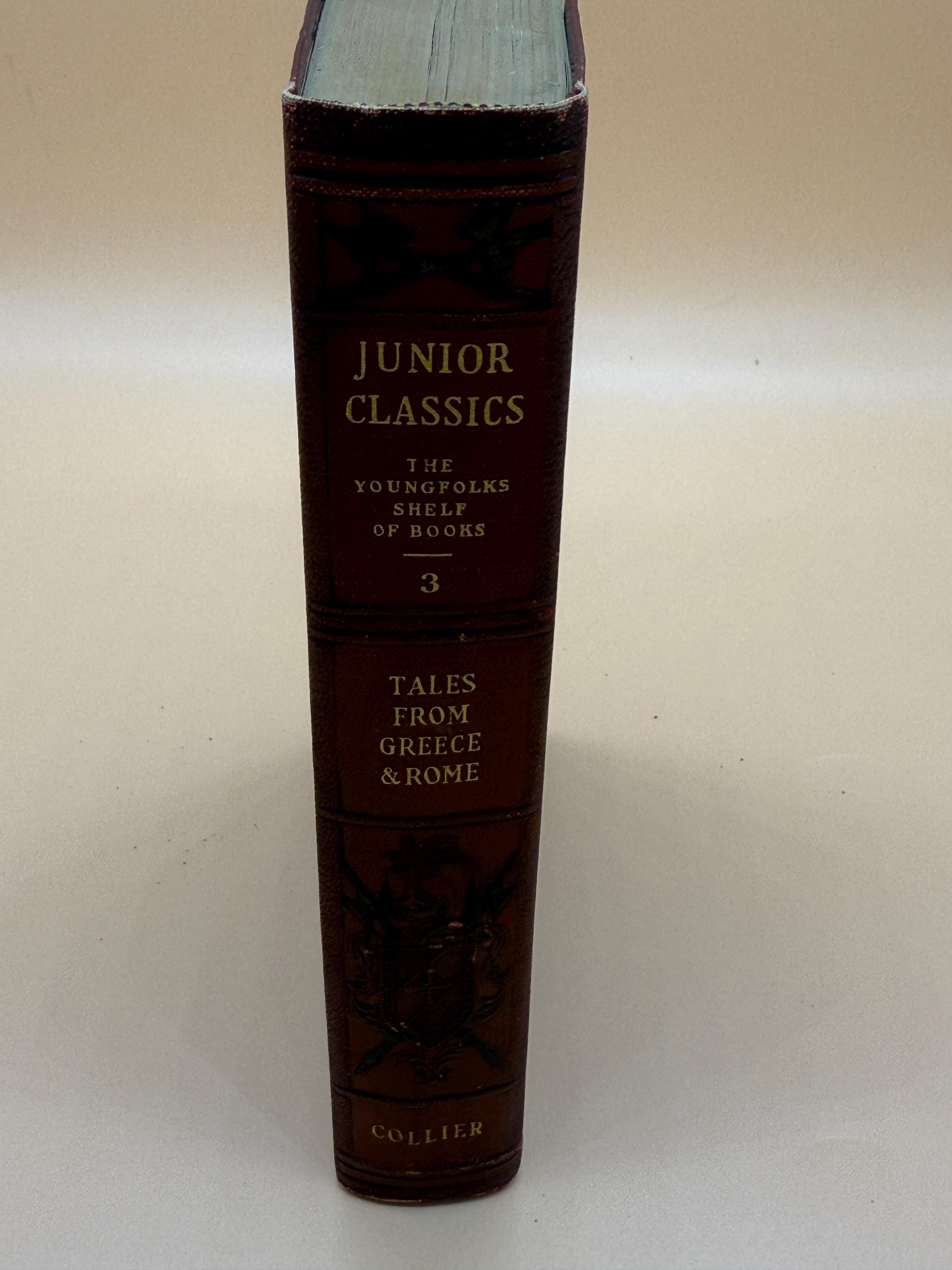 This copy from the Junior Classics series, Youngfolks Shelf of Books, 1918 Collier edition is Tales From Greece and Rome. It includes and Intro by Charles Eliot and reading guide by William Allan Neilson. Stories include; Old Greek Tales, Tales From the Trojan War From Homer, The Wanderings of Aeneas from Virgil, Stories From Roman History from Livy and more. Color frontispiece along with additional black and white illustrations.