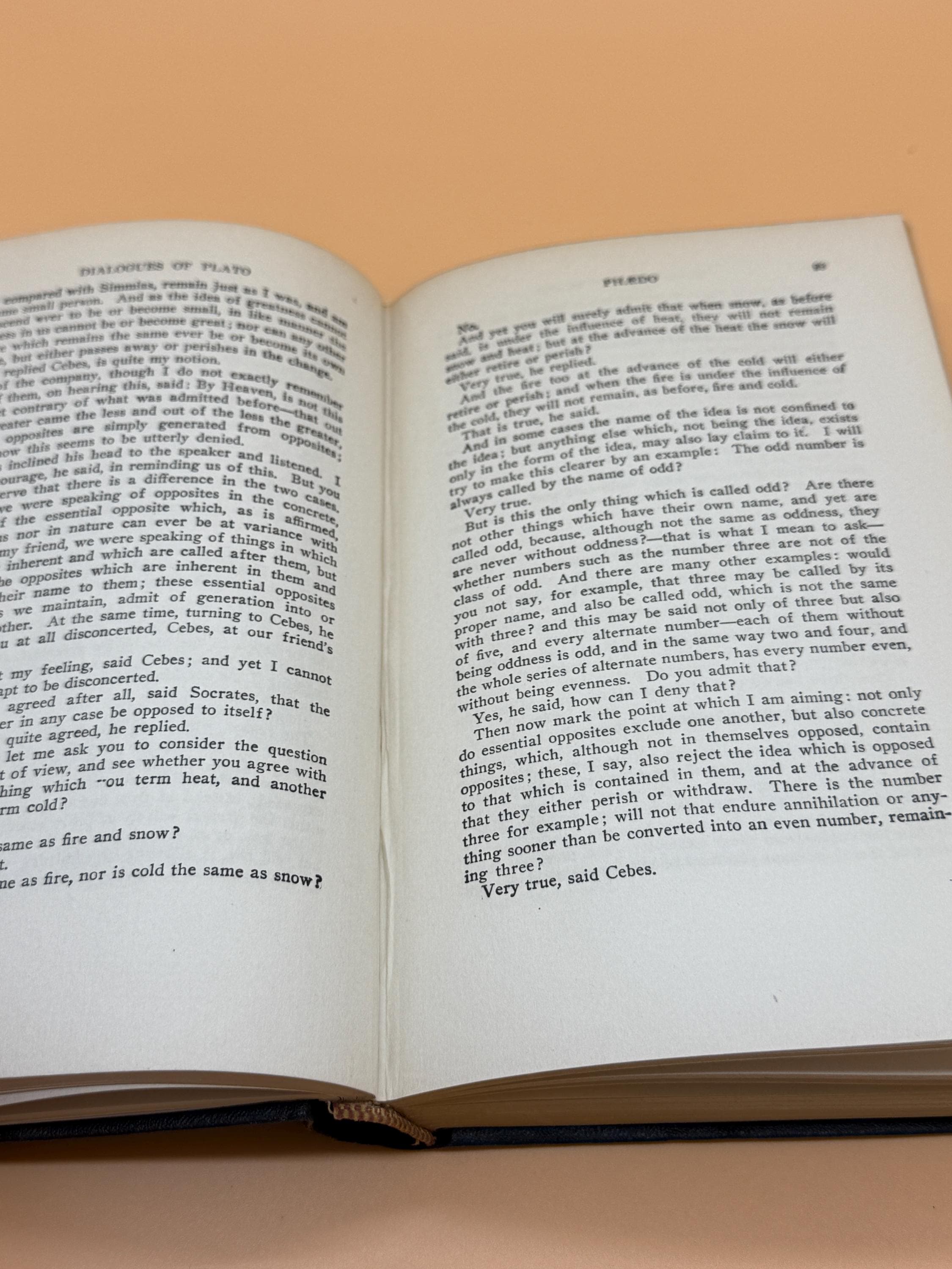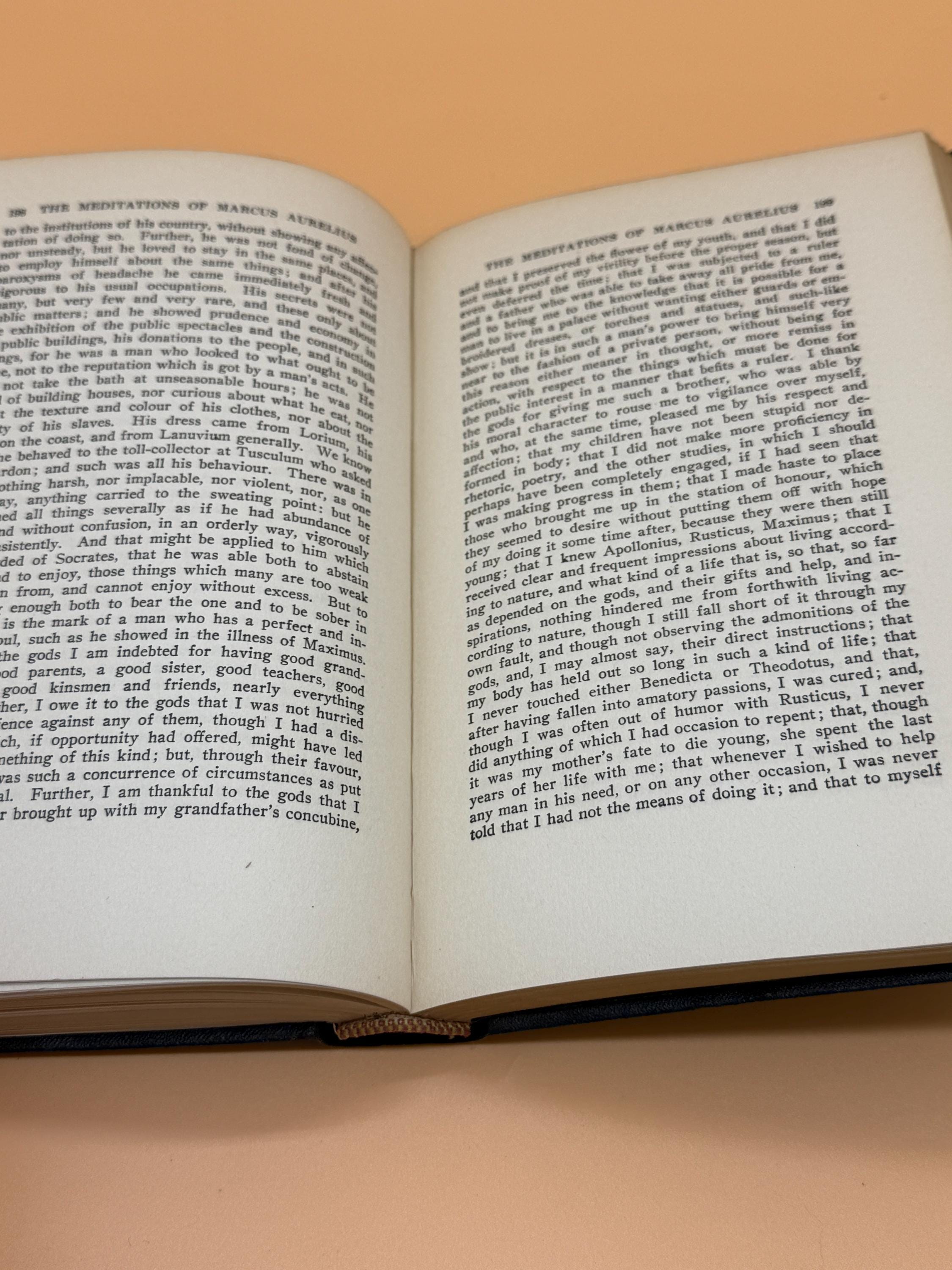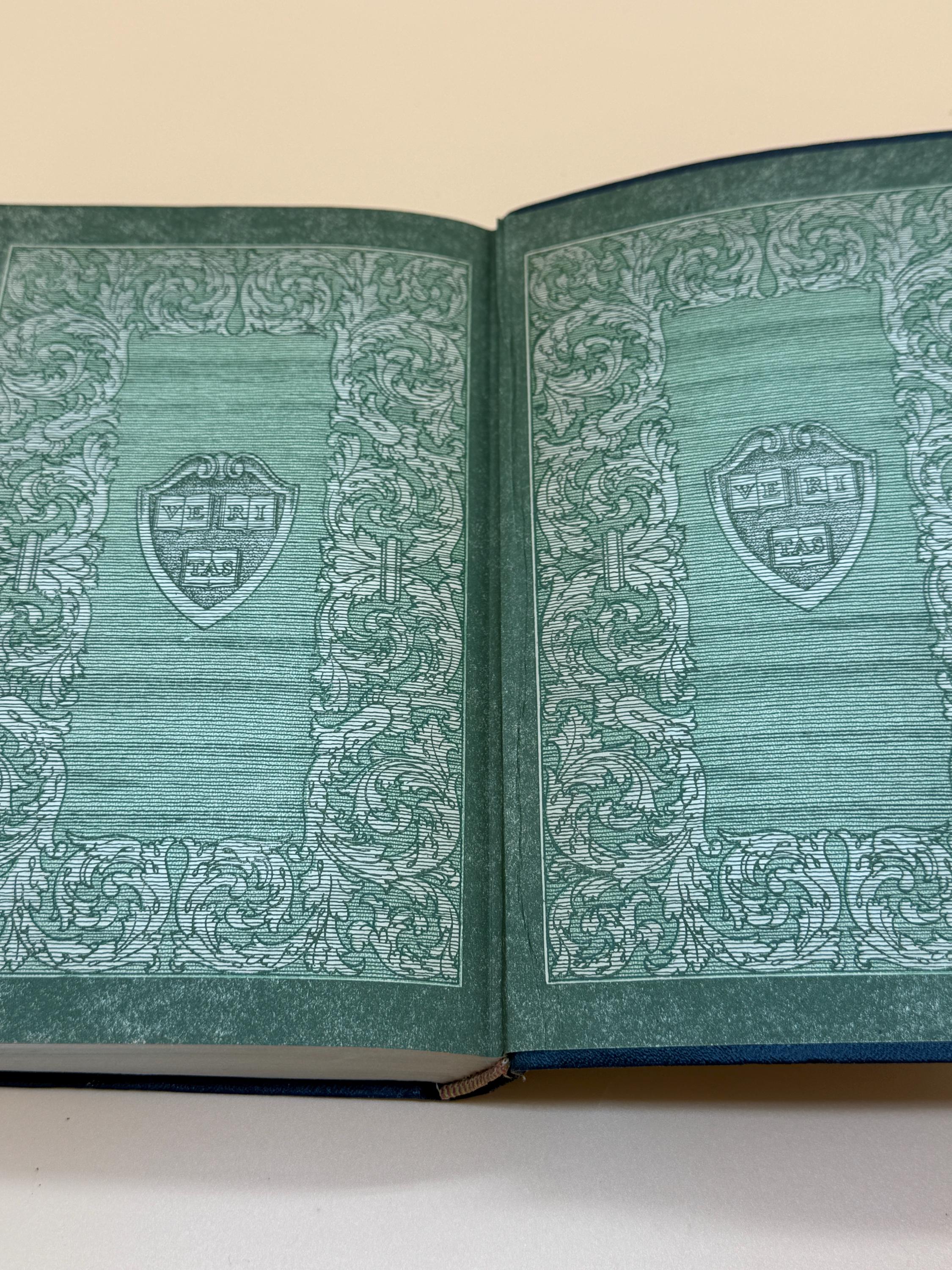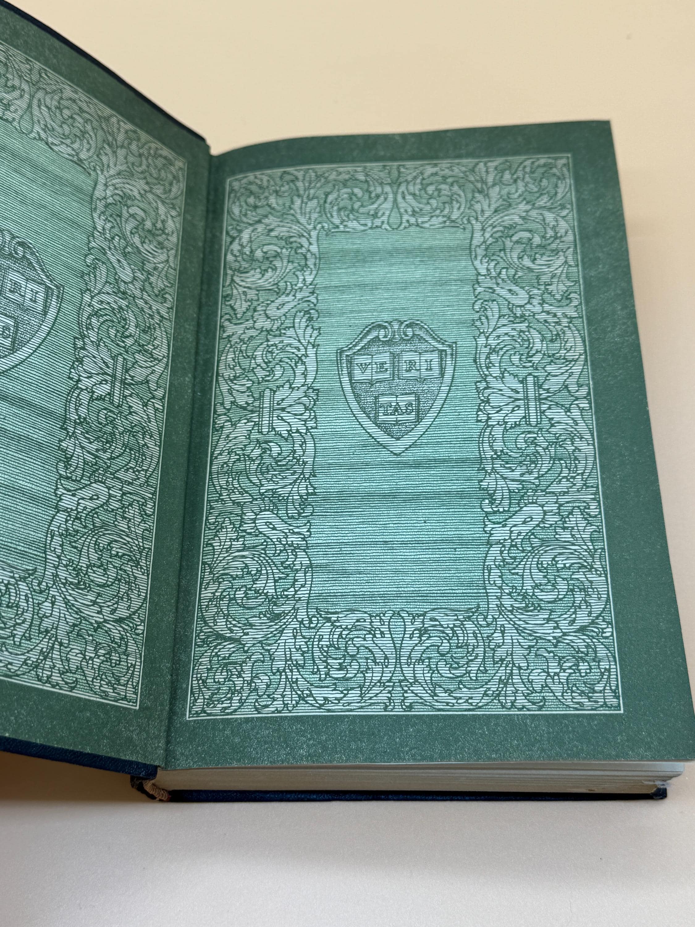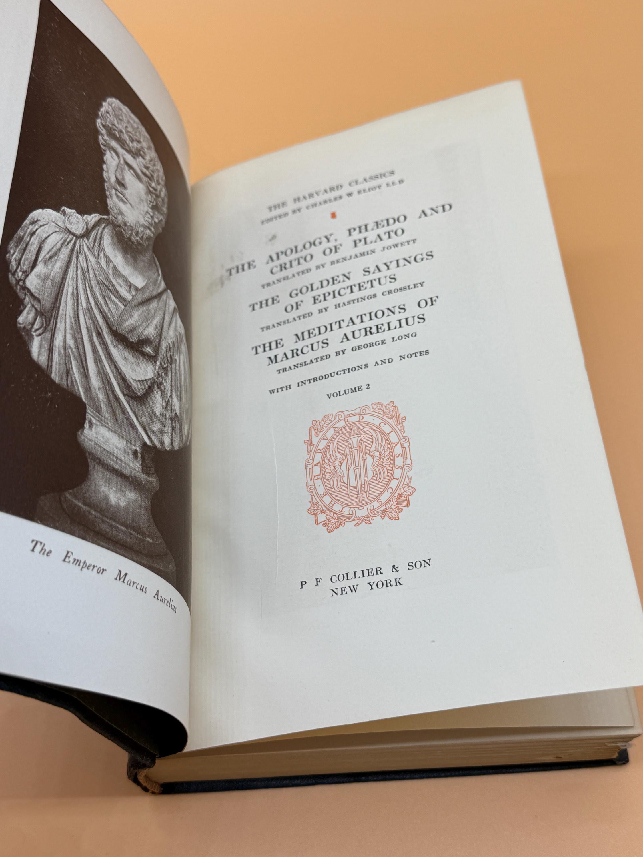 This is a very good hardcover bound in Fabrikoid. 1909 Collier Publishing The Harvard Classics special fabrikoid binding. Fabrikoid binding was used for a special edition of The Harvard Classics 1909-1910. Fabrikoid Co. was one of the predominant American manufactures of artificial leather, incorporated in 1902 and purchased by Du Pont in 1910. Du Pont managed to get Henry Ford to use it as the covering on his Model T in 1914, putting it on over 130,00 cars. In essence, fabrikoid is imitation leather. This set was bound in black (although it appears dark green in some light) fabrikoid. Given the binding, there is to be expected some mild "bubbling" of the binding and that is apparent on this copy and can be seen in photos. BUT but binding is supple, flexible and the bubble effect is from the imitation leather slightly lifting off the under covering. Many Harvard Classics editions are known to crack along the spine binding but these in fabrikoid are solid and showing only the "bubble" effect. The bindings are sewn, not glued, a factor that improves durability and style. Each has the "Veritas" design inside front and back endpapers. All volumes feature an illustrated frontispiece across from title page. All volumes of this edition have gold tipped top outer page edges. Each is standard crown octavo book size or 5" x 8". This copy only has light natural tanning to pages from age with no foxing or markings seen. The edition presents itself as a special binding copy from The Harvard Classics. This copy is very good inside and out given age. the binding is tight and straight. Between pages 2-3 there is slight page separation BUT the pages are tight to binding, not separating from binding, see photo. The inside pages are very good and clean.