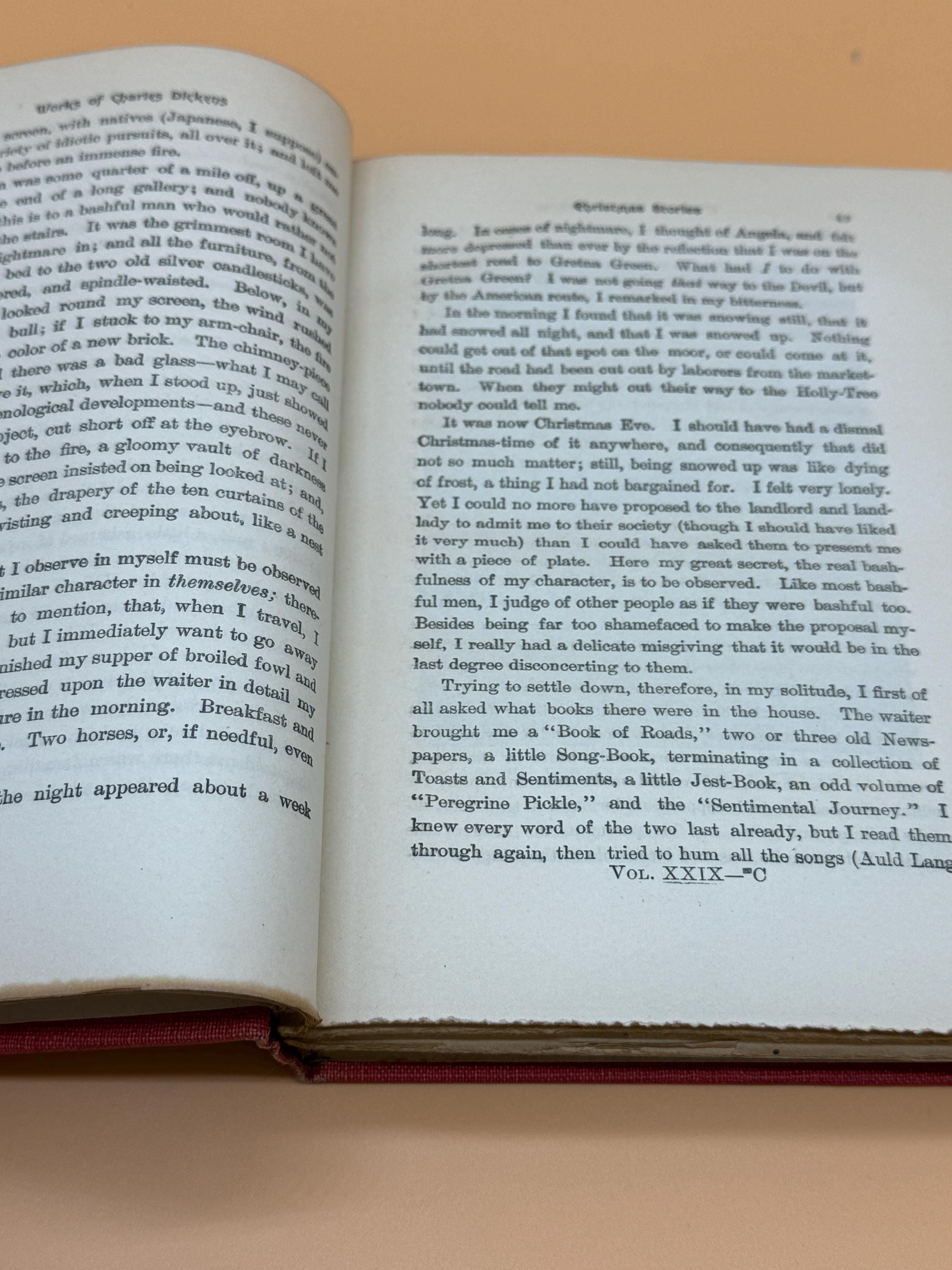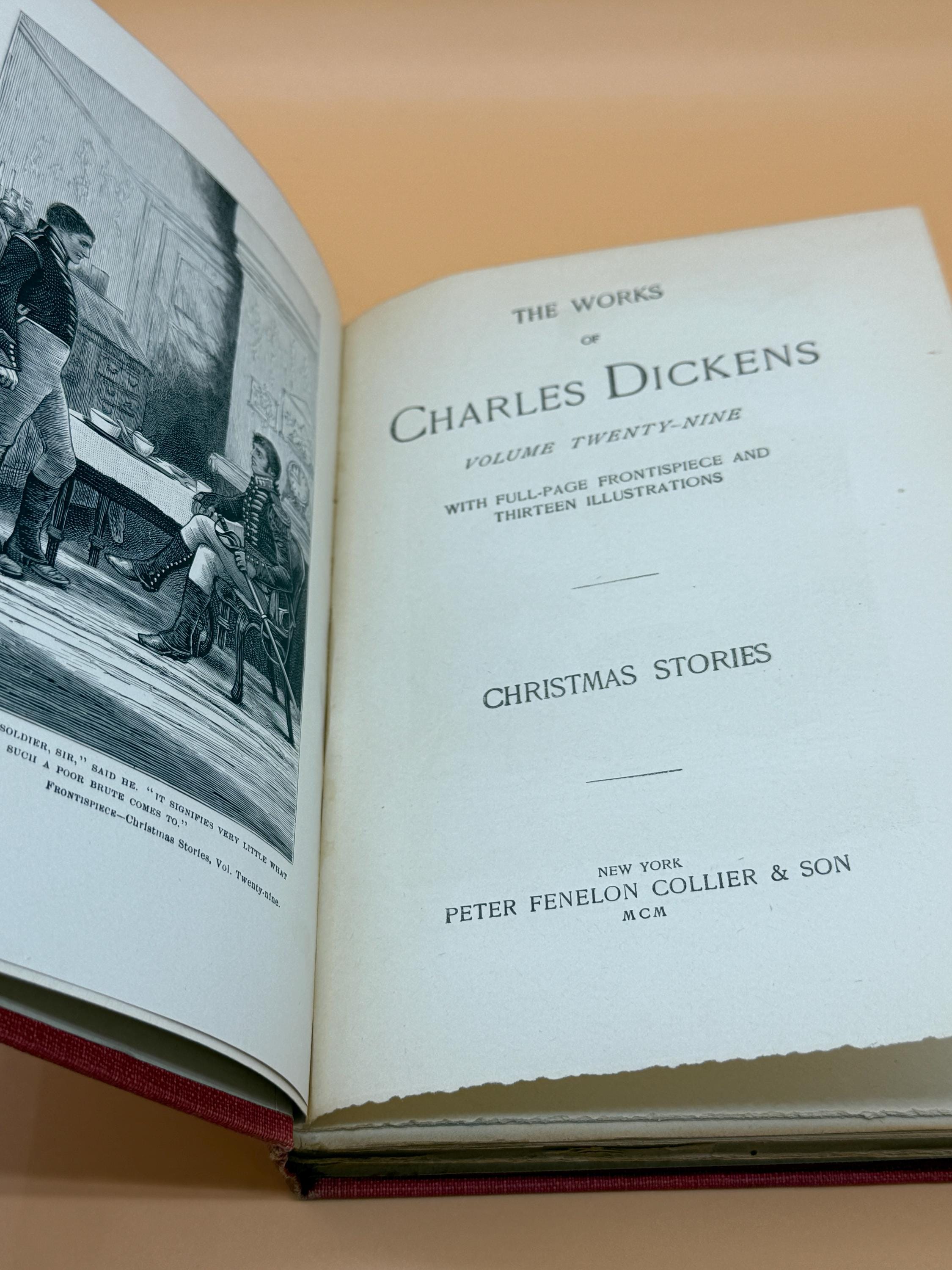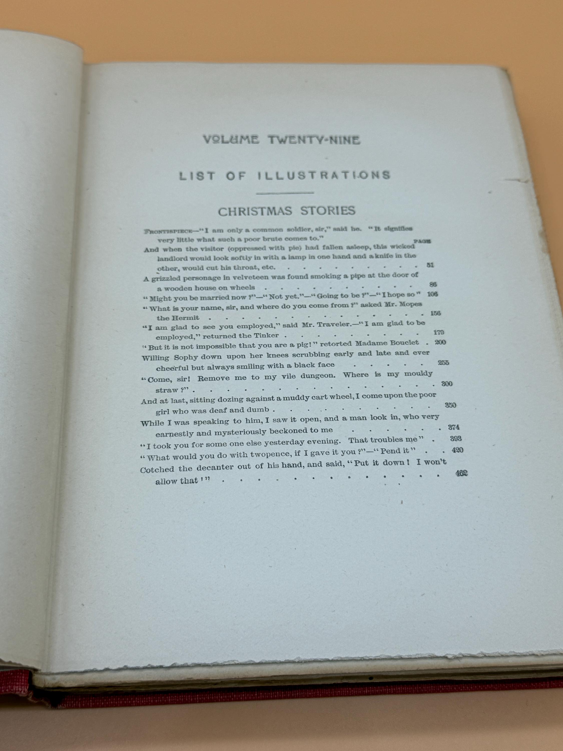This is a good hardcover. PLEASE NOTE DESCRIPTION AS THE BOOK IS 125 YRS OLD This copy is good inside and out. This was originally published as a 30 volume set and this offering is Volume 29 only, Christmas Stories by Charles Dickens. The pages inside are good, and when published to save costs, the paper used appears uncut, rough uneven edges. Some of the pages are actually slightly smaller than others leaving a rough cut leafed appearance, see photos. PLEASE NOTE You will find some pages "uncut" which means the publisher used one sheet, printed both sides front and back, and then founded in half and bound as uncut leaving the inside or back of the printed page "uncut" which can be opened with a simple cut to the uncut edge. This is very common in books of this type and age. It is a unique occurrence but not harmful. We have chosen to preserve the book is bound and not open the uncut pages. The pages are clean, the paper used is somewhat stiff, fairly decent quality for the time period. Top page edges tipped in gold gilt. The binding is tight and all pages tight to binding. Black and white illustrated frontispiece. Multiple additional black and white illustrations. The volume is bound in red hardcover boards which are good condition with light shelf wear. The title lettering along spine is worn, legible but worn. Medium octavo book size or 6.5" x 9.5" each