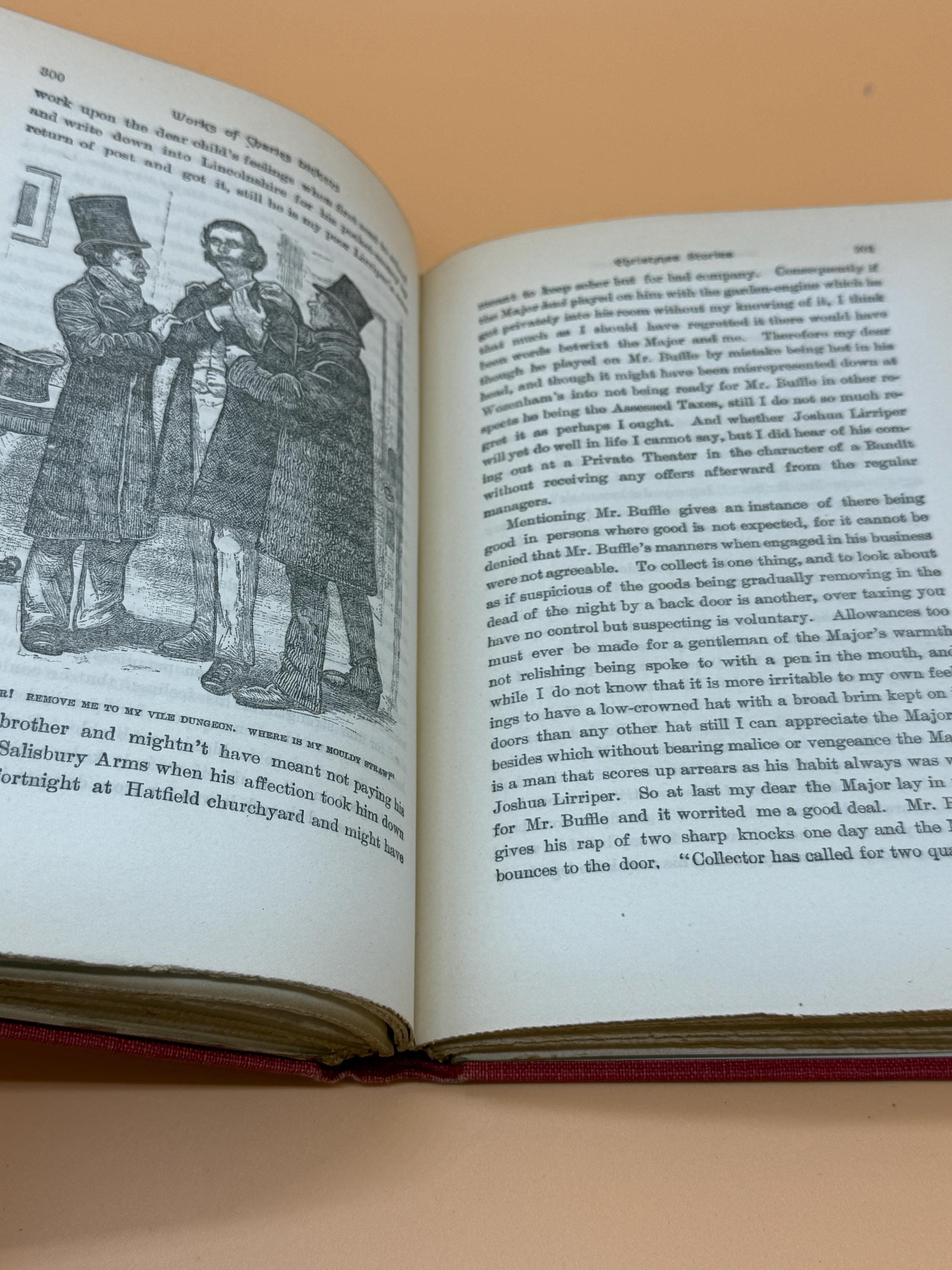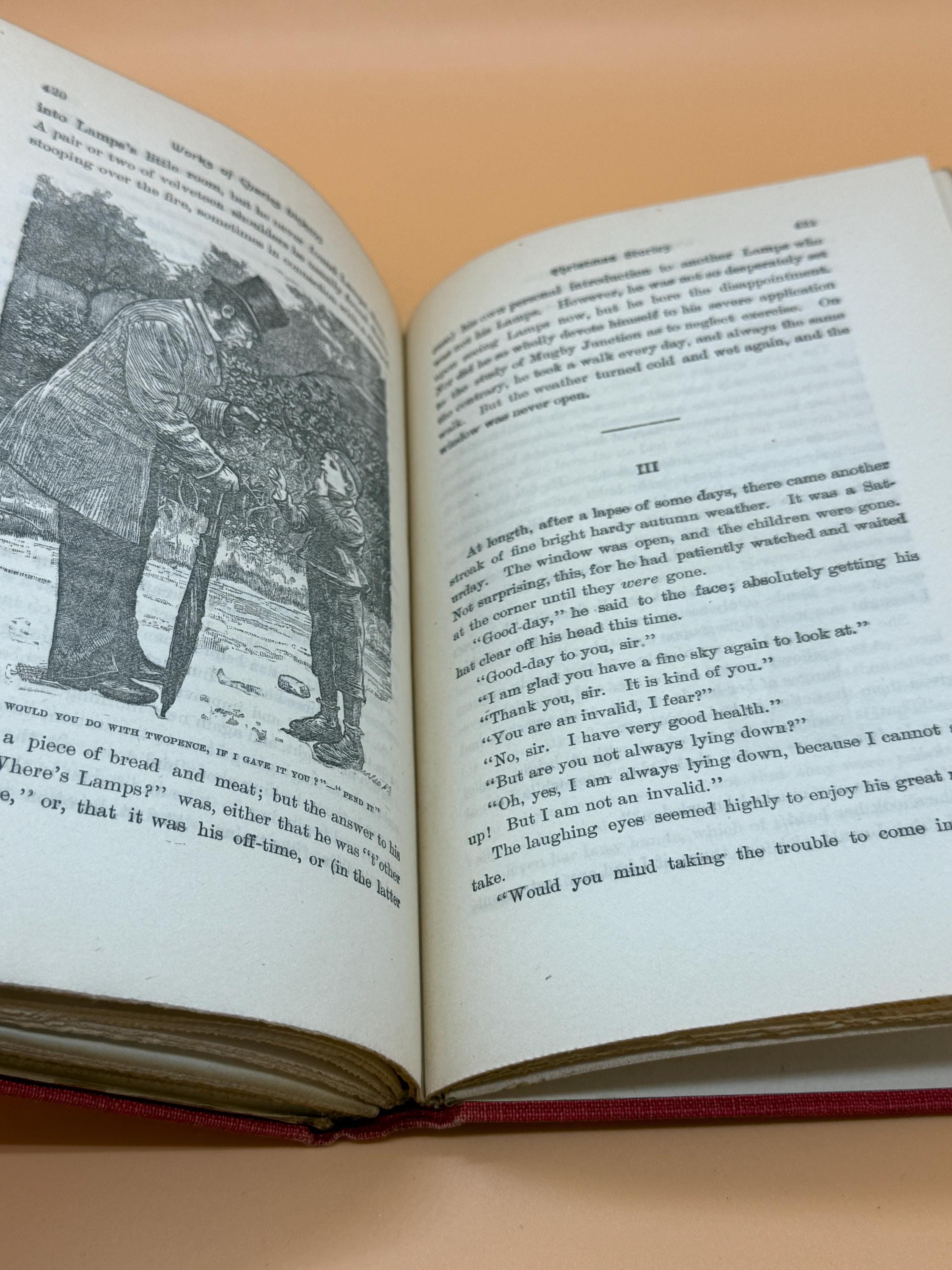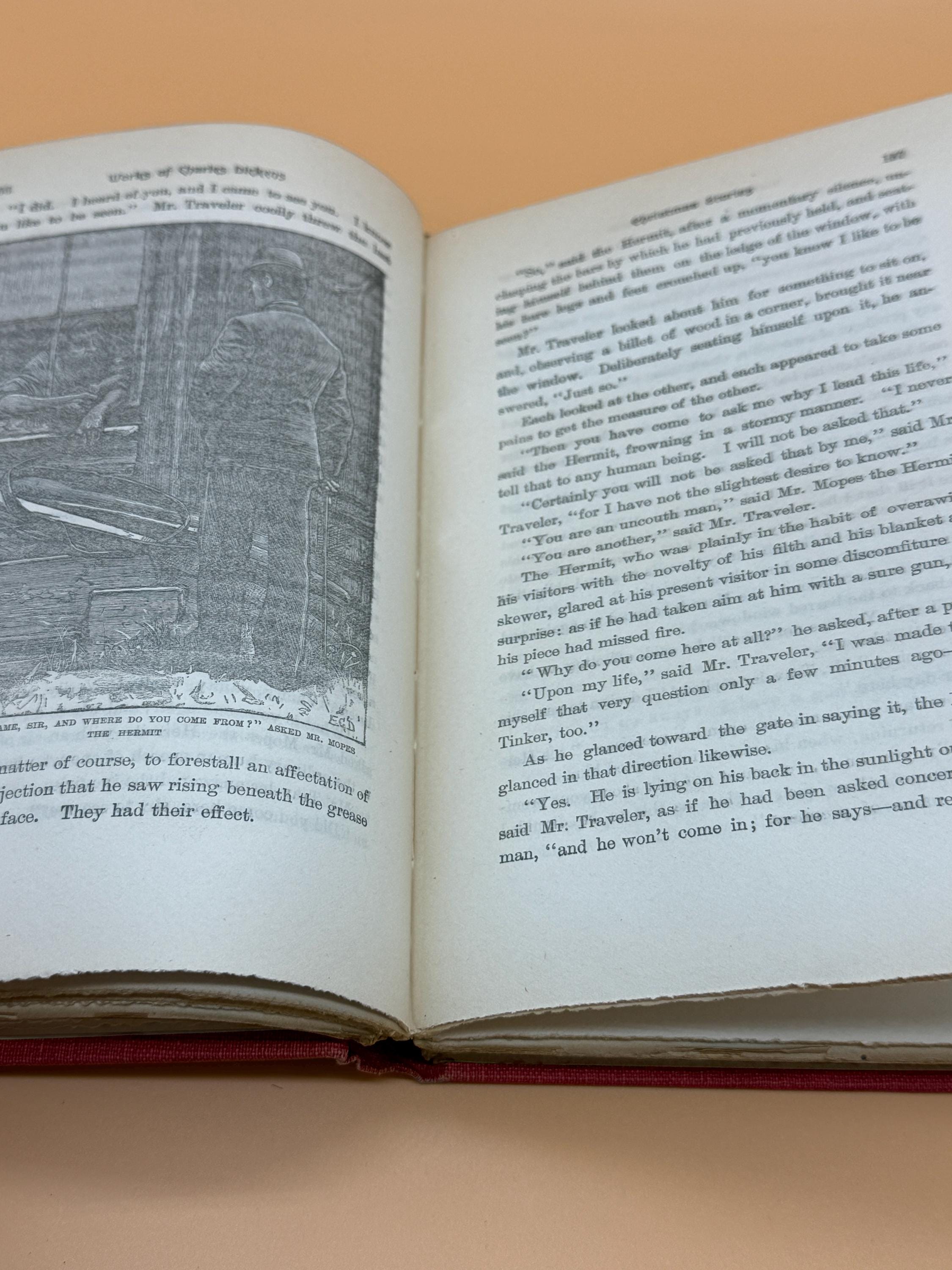 This is a good hardcover. PLEASE NOTE DESCRIPTION AS THE BOOK IS 125 YRS OLD This copy is good inside and out. This was originally published as a 30 volume set and this offering is Volume 29 only, Christmas Stories by Charles Dickens. The pages inside are good, and when published to save costs, the paper used appears uncut, rough uneven edges. Some of the pages are actually slightly smaller than others leaving a rough cut leafed appearance, see photos. PLEASE NOTE You will find some pages "uncut" which means the publisher used one sheet, printed both sides front and back, and then founded in half and bound as uncut leaving the inside or back of the printed page "uncut" which can be opened with a simple cut to the uncut edge. This is very common in books of this type and age. It is a unique occurrence but not harmful. We have chosen to preserve the book is bound and not open the uncut pages. The pages are clean, the paper used is somewhat stiff, fairly decent quality for the time period. Top page edges tipped in gold gilt. The binding is tight and all pages tight to binding. Black and white illustrated frontispiece. Multiple additional black and white illustrations. The volume is bound in red hardcover boards which are good condition with light shelf wear. The title lettering along spine is worn, legible but worn. Medium octavo book size or 6.5" x 9.5" each