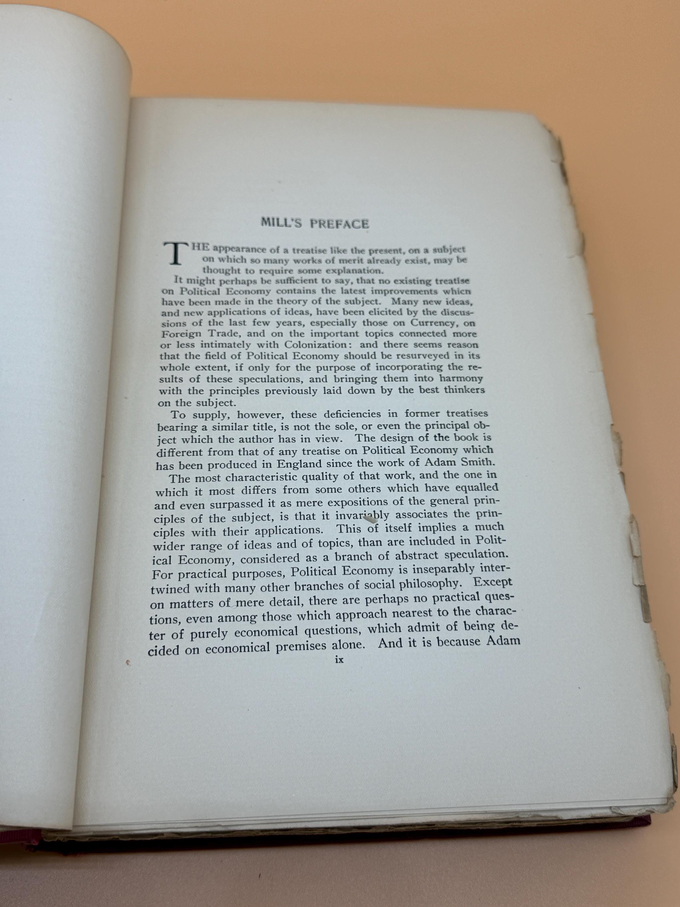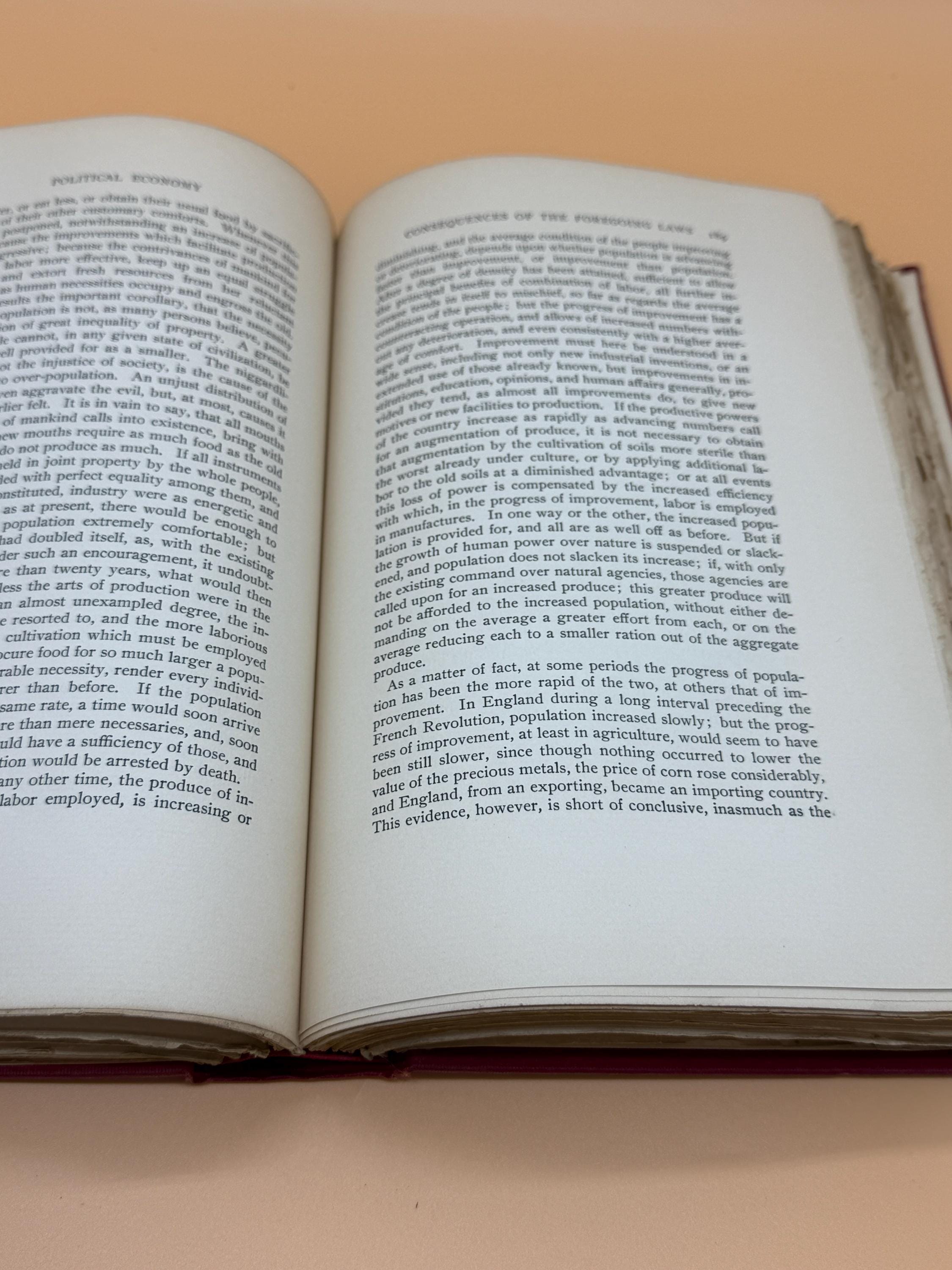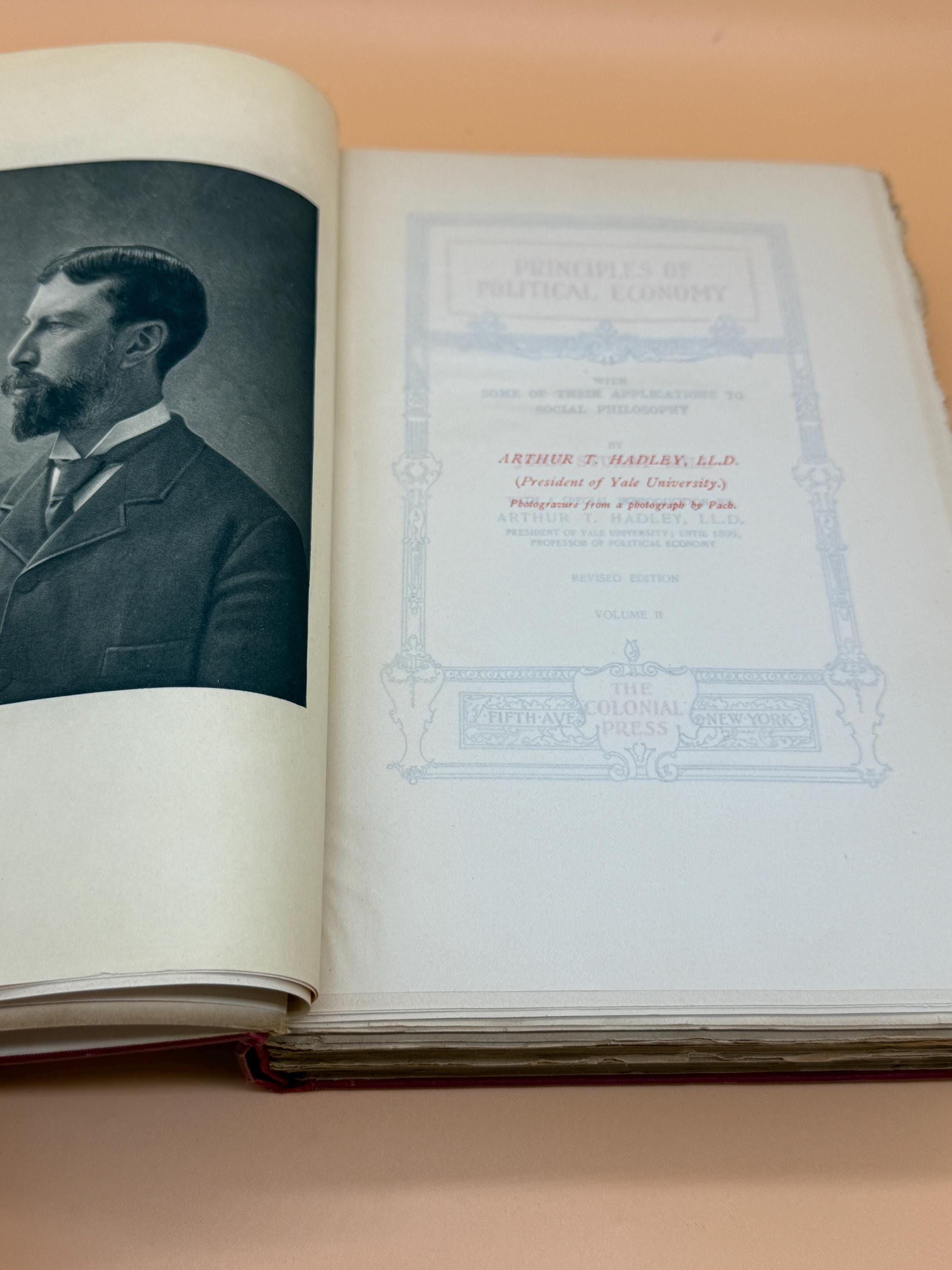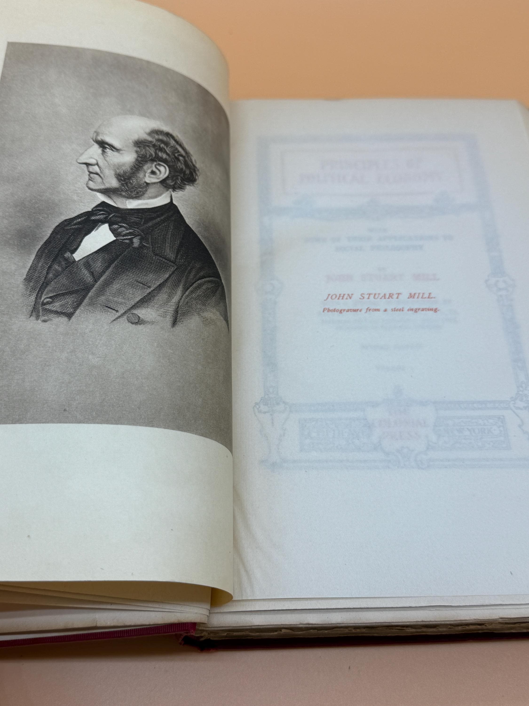 This two volume set is Principles of Political Economy by John Stuart Mill. It is subtitled With Some of Their Applications to Social Philosophy. It contains a special Intro by Arthur T. Hadley, President of Yale University until 1899. Both volume feature an illustrated frontispiece with original tissue guard still in place.